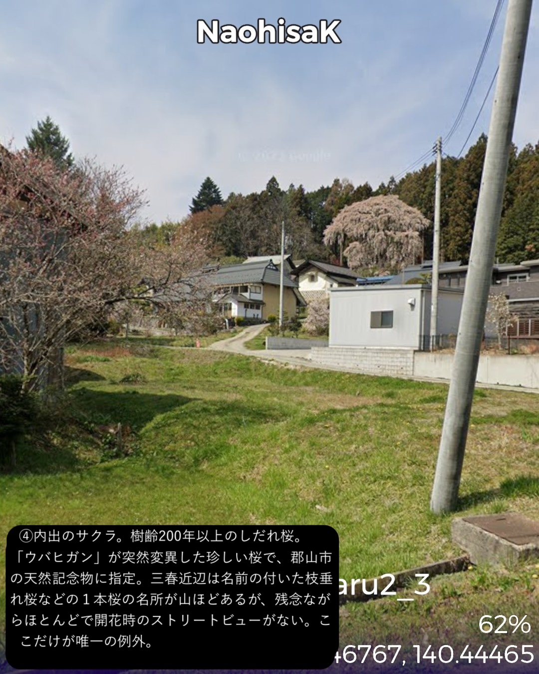 VRサイクリング 岩城街道で磐城国(福島県)中通り南部から中部へぐるっと東側を迂回して北上し、そこから二本松街道で西へ向かって猪苗代湖まで進むややこしいルートを進む回。ウルトラマンの町須賀川の外れを出発し、概ね岩城街道を辿って北東へ進んで花の城下町三春、そこから西へ進路を転じて奥州街道の宿場本宮宿へ進む。本宮宿からは二本松街道に乗り換えて西へ進み中山宿、中山峠を越えて猪苗代湖の湖畔、関脇宿に至る69kmの行程。須賀川から本宮宿は奥州街道なら一直線だが、既に昨年7月に通った道なので迂回路として三春経由の岩城街道の一部を利用した次第。三春と言えばまず有名なのは日本三大桜の一つに数えられる三春滝桜という巨大な枝垂れ桜の木であるが、三春近辺にはこれ以外にも名前の付いた一本桜の巨樹が有に数十本も点在している。残念ながら誰かの意図か知らぬがそうした名の付いた一本桜についてはほぼ100%開花時期のストリートビューがない!よってVRサイクリング的にも巨大な満開の桜の樹の下の図は得られなかったが、1箇所だけ内出のサクラという樹齢200年の枝垂れ桜の巨樹だけ遠望の図ではあるが拝することができた。桜の名所というとソメイヨシノが数千本とか面で展開するイメージが強いが、山里の丘の上にすっくと立つ一本の満開の枝垂れ桜の巨樹というのは日本映画でもよく日本的な美しいシーンとして出てくるようにソメイヨシノ千本よりも魅力的に感じる。叶うなら満開の時期に三春近辺の滝桜を含めた一本桜巡りドライブをしてみたいと思った。今回は桜の話で終始してしまったが、さていよいよ「みちのく」も最終コーナー会津路である。