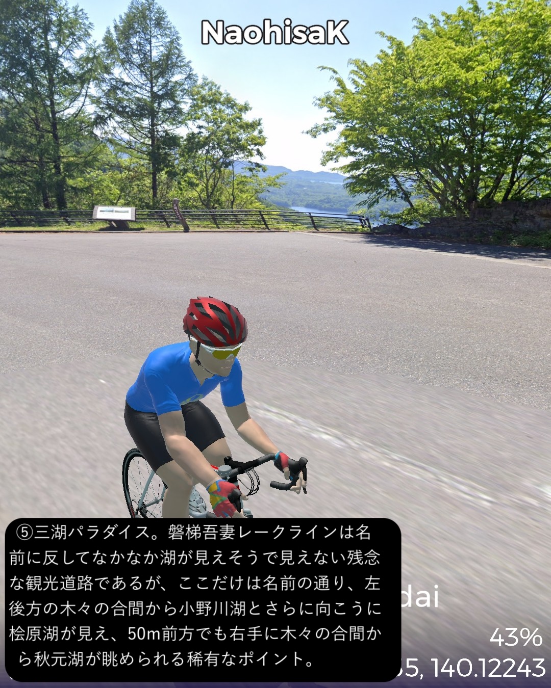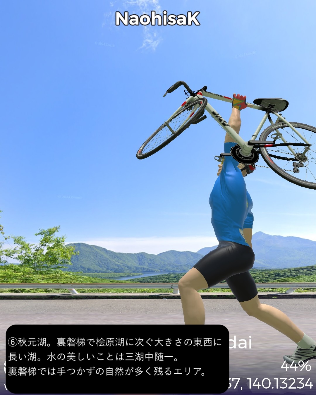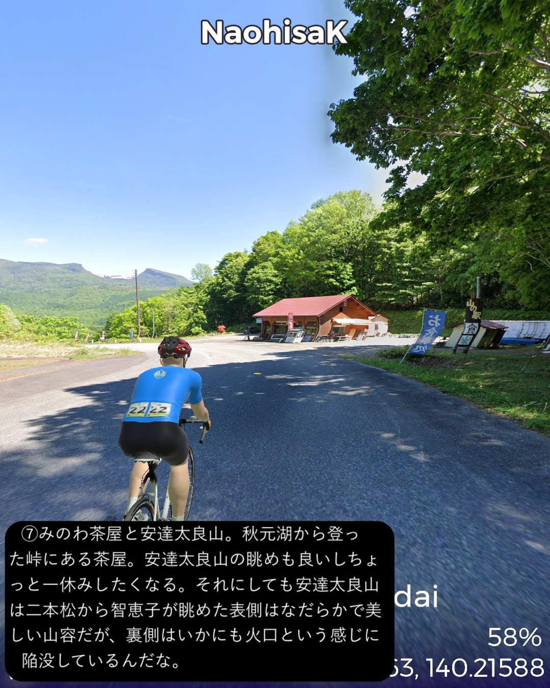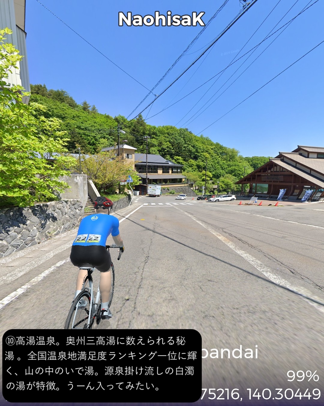 VRサイクリング またしても番外編。裏磐梯から磐梯吾妻スカイラインへ進む観光ルート。前回の二本松街道の猪苗代宿の先からスタートし、磐梯ゴールドラインで磐梯山の西側の峠を越え裏磐梯へ。裏磐梯で少し湖沼巡りをした後、小野川湖の南側、秋元湖の北側をすり抜けて安達太良山の西側の山麓へ出る。そこから磐梯吾妻スカイラインで吾妻連峰へ駆け上がり、浄土平を経て一気に下って秘湯高湯温泉をゴールとする92kmの長丁場。裏磐梯は何回か訪れているが、最大の見どころ五色沼の散策路にルートを敷けず、また湖沼は林に隠されていることが多く、ある程度予想はしていたものの期待外れではあった。その分、磐梯吾妻スカイラインは日本の道百選に指定されているだけあって眺望が素晴らしいドライブウェイであった。ずんずんどこまでも登って森林地帯を越えると、磐梯山、安達太良山、その間に猪苗代湖という福島県ゴールデンセットを一望する道。標高1600mを超えると前方に吾妻連峰が見えてきてまもなく茶褐色の火山地帯の真っ只中、浄土平。ここに訪れた人は皆吾妻小富士に登るが、その登山道のルートはないので登るのは諦めてそこから一気に下る。福島市を含む平野がまるで航空機からの眺めのように遥か下方に広がっていてその眺めも素晴らしい。ゴールの高湯温泉は名前の通りまだ標高の高いところに位置する秘湯で、斎藤茂吉などの文人がこの静謐な環境を好んでいたようだ。白濁した源泉掛け流しの湯も魅力だ。磐梯吾妻スカイラインを走って高湯温泉に泊まるというルートでいつかリアルにも訪れてみたい。(ああ、行きたい場所がどんどん増える)