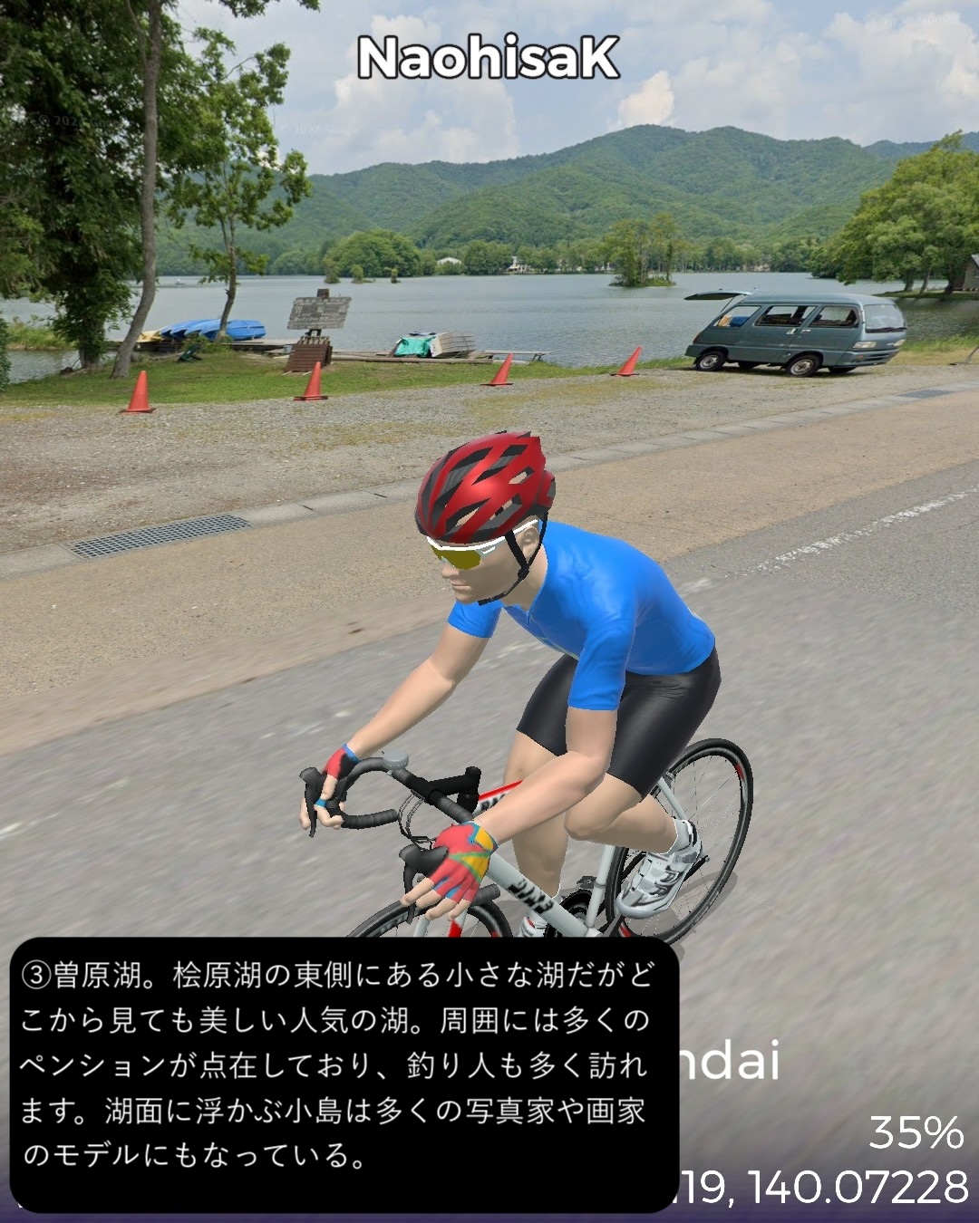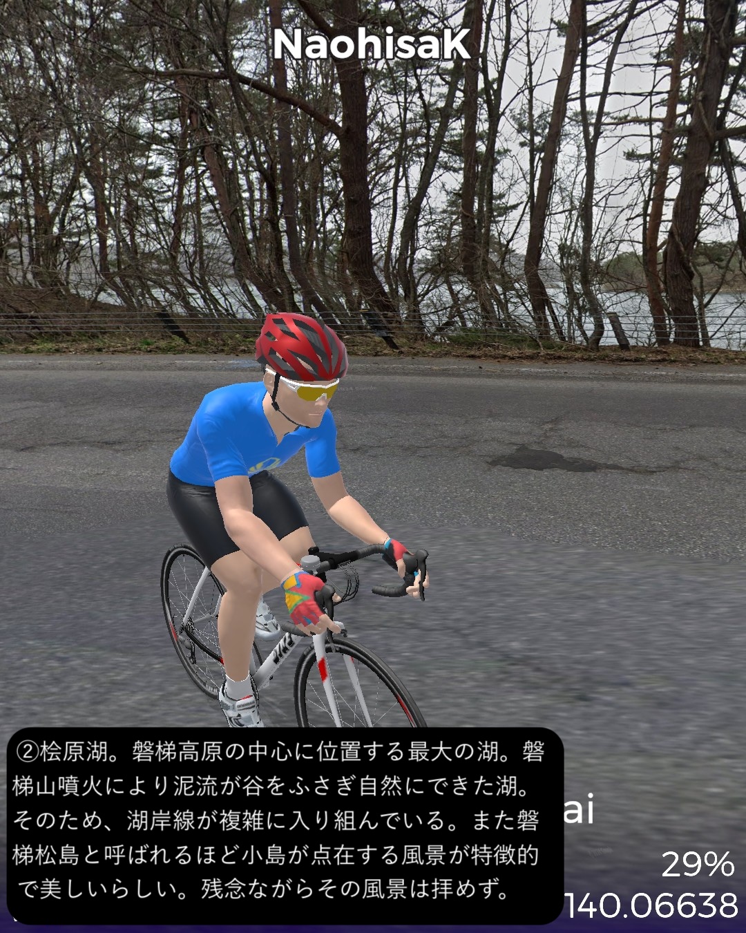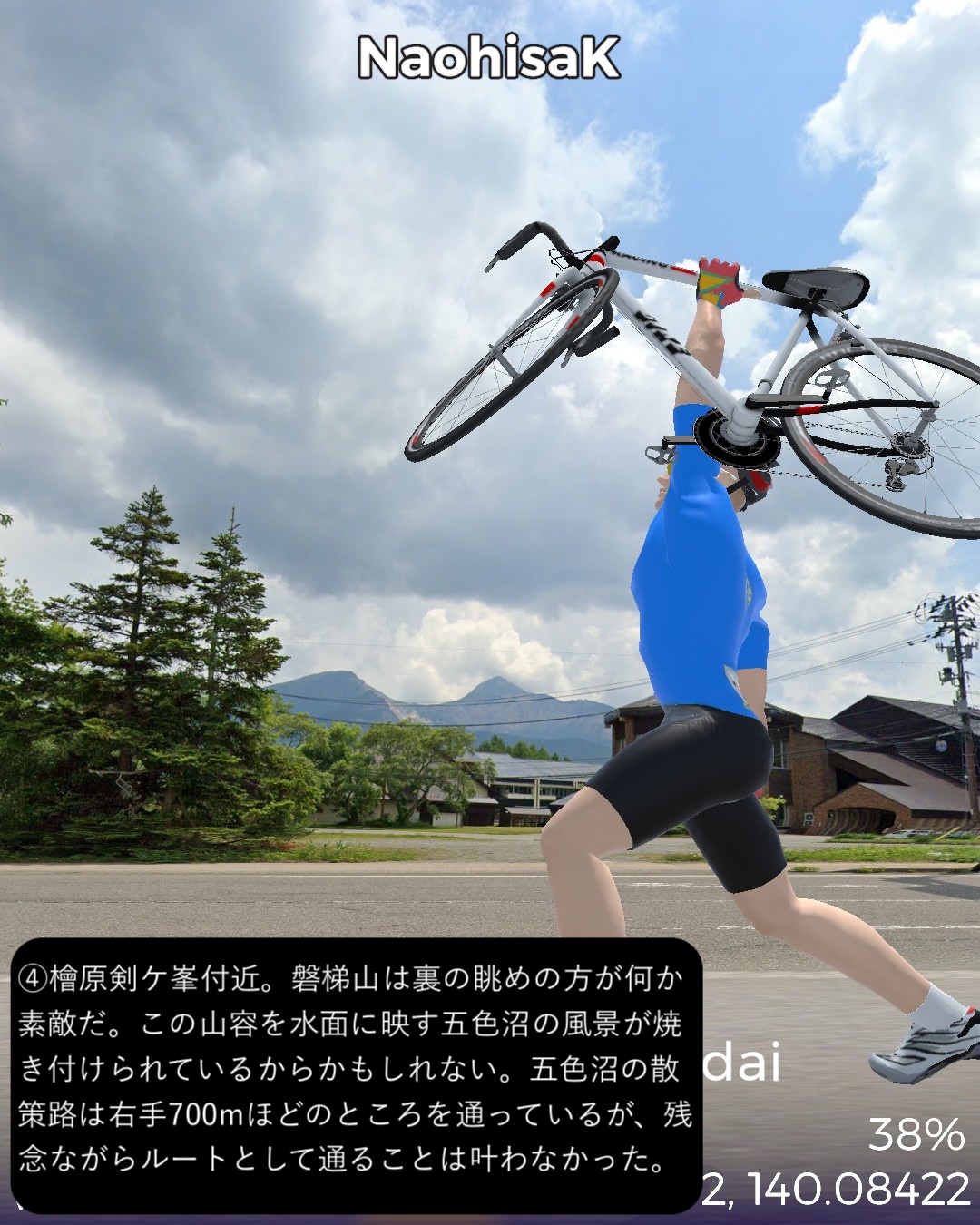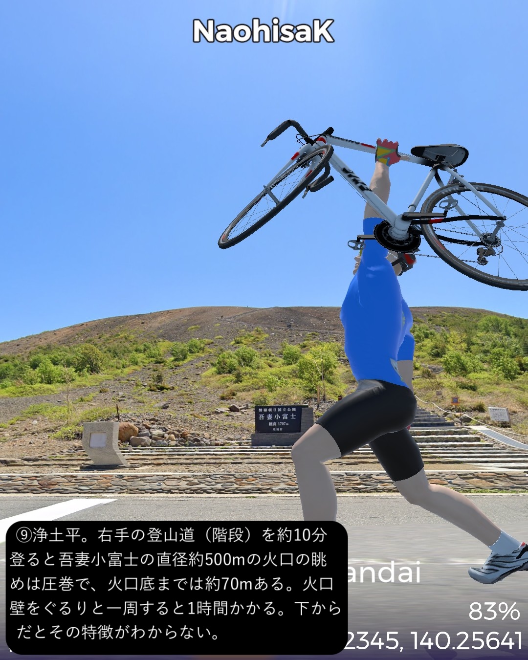 VRサイクリング またしても番外編。裏磐梯から磐梯吾妻スカイラインへ進む観光ルート。前回の二本松街道の猪苗代宿の先からスタートし、磐梯ゴールドラインで磐梯山の西側の峠を越え裏磐梯へ。裏磐梯で少し湖沼巡りをした後、小野川湖の南側、秋元湖の北側をすり抜けて安達太良山の西側の山麓へ出る。そこから磐梯吾妻スカイラインで吾妻連峰へ駆け上がり、浄土平を経て一気に下って秘湯高湯温泉をゴールとする92kmの長丁場。裏磐梯は何回か訪れているが、最大の見どころ五色沼の散策路にルートを敷けず、また湖沼は林に隠されていることが多く、ある程度予想はしていたものの期待外れではあった。その分、磐梯吾妻スカイラインは日本の道百選に指定されているだけあって眺望が素晴らしいドライブウェイであった。ずんずんどこまでも登って森林地帯を越えると、磐梯山、安達太良山、その間に猪苗代湖という福島県ゴールデンセットを一望する道。標高1600mを超えると前方に吾妻連峰が見えてきてまもなく茶褐色の火山地帯の真っ只中、浄土平。ここに訪れた人は皆吾妻小富士に登るが、その登山道のルートはないので登るのは諦めてそこから一気に下る。福島市を含む平野がまるで航空機からの眺めのように遥か下方に広がっていてその眺めも素晴らしい。ゴールの高湯温泉は名前の通りまだ標高の高いところに位置する秘湯で、斎藤茂吉などの文人がこの静謐な環境を好んでいたようだ。白濁した源泉掛け流しの湯も魅力だ。磐梯吾妻スカイラインを走って高湯温泉に泊まるというルートでいつかリアルにも訪れてみたい。(ああ、行きたい場所がどんどん増える)