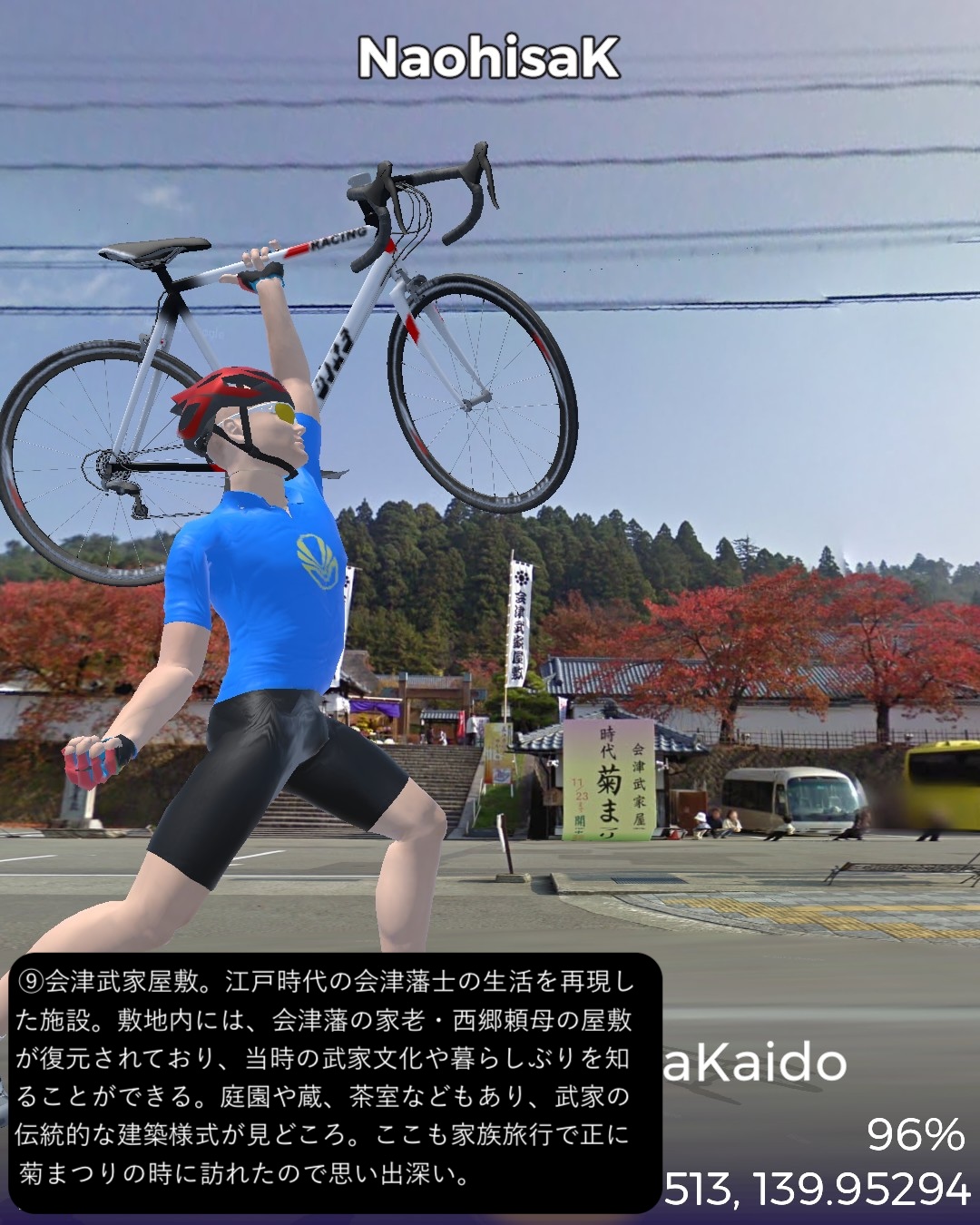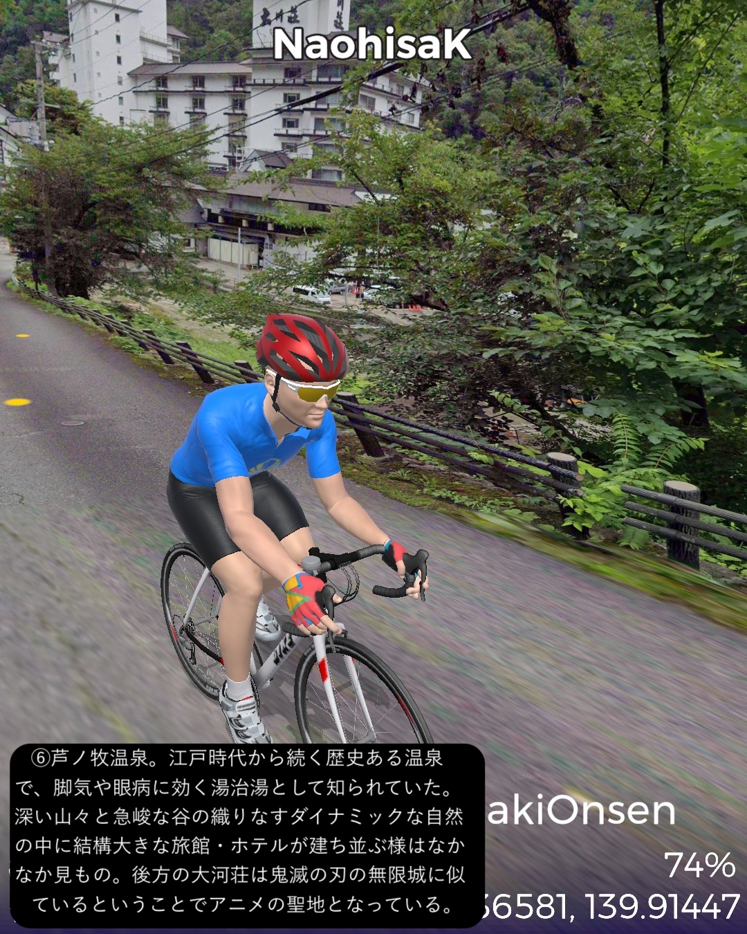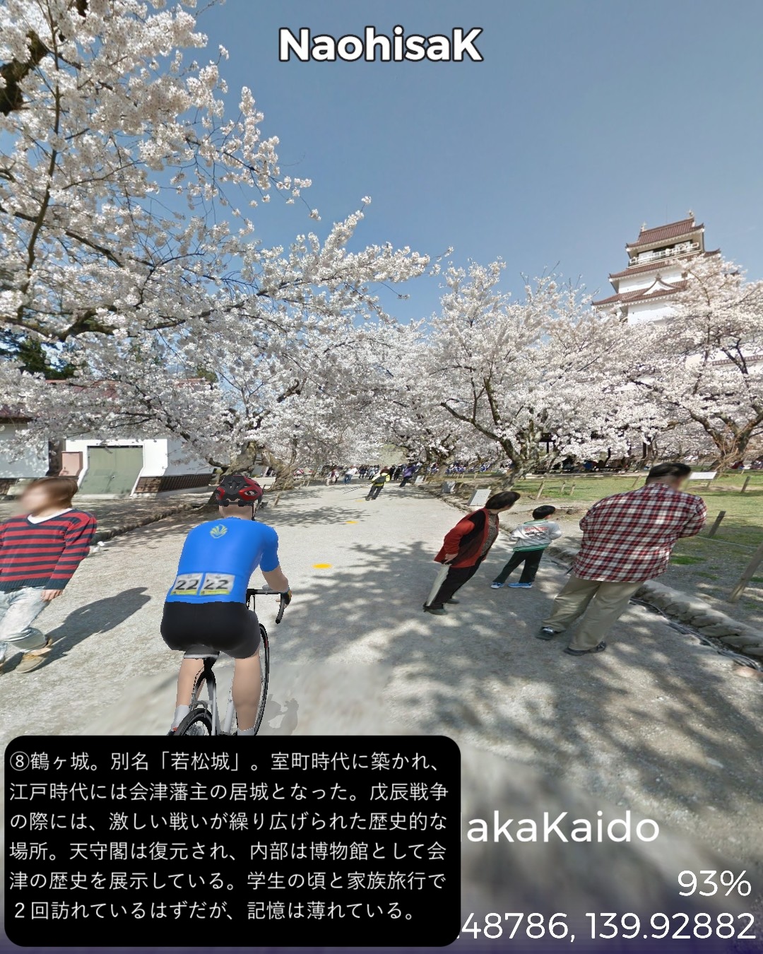 VRサイクリング 会津中街道を通って会津若松へ戻る。何故か温泉三昧の旅。と言っても温泉地のビジュアルを味わうだけであるが。前回の終点に近い那須元湯の先から分岐する道へ入り那須連山東側の山道を縫って北へ向かう。福島県へ入り白河高原から阿武隈川上流の深い谷に沿って国道289号にて今度は西北西へ向かう。新甲子温泉、甲子温泉付近を長いトンネル数本で通り過ぎると会津西街道で通った下郷付近の阿賀川の広めの谷間に出る。そこからは会津鉄道会津線に沿った会津中街道を辿って弥五郎宿、湯野上温泉、小出宿、芦ノ牧温泉と深い山谷を越えてゆくとようやく会津盆地の広がりに出て香塩宿、面川宿を通って会津若松市街へ。鶴ヶ城を巡ってから市街地の南東の山間の東山温泉まで進むという82kmの行程。会津中街道の旧道は那須連山の西側を突っ切る険しい登山道となるので前半は迂回ルート。甲子温泉の先あたりでほぼ旧道と寄り添うが、会津中街道を通ると言えるのは下郷付近から会津若松までの区間。会津中街道は自然災害で一時期通行不能となった会津西街道の代替ルートとして開かれたが、会津から関東へのメインルートであったのは17世紀頃の百年にも満たない期間だったようだ。今回のルートのハイライトはたまたまルート上に乗ったいくつもの心踊るいい雰囲気の温泉郷。新甲子温泉、甲子温泉、湯野上温泉、芦ノ牧温泉、東山温泉。共通項は深い山間の渓流沿いの情緒溢れる温泉場であり、古くから知られる名湯である点。会津中街道上にあるのは湯野上温泉と芦ノ牧温泉だけであるが、寄り道も含めて結果的には温泉場巡りの旅となった。しばらく会津ベースキャンプ状態となってしまったが、次回はようやく会津を離れて越後方面へ進む。