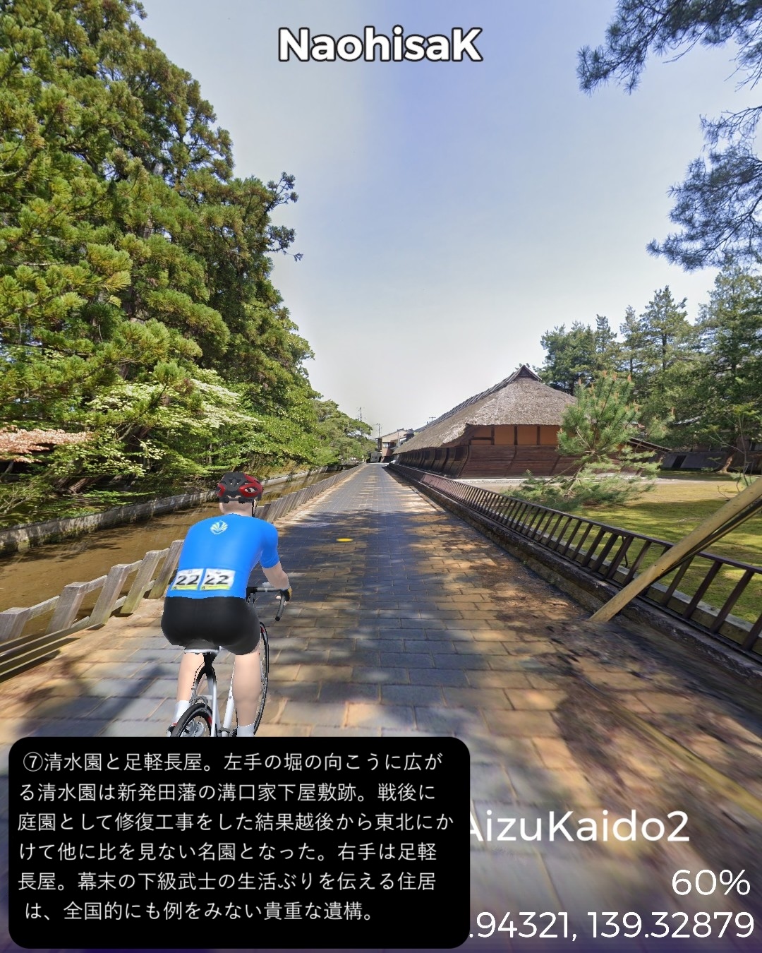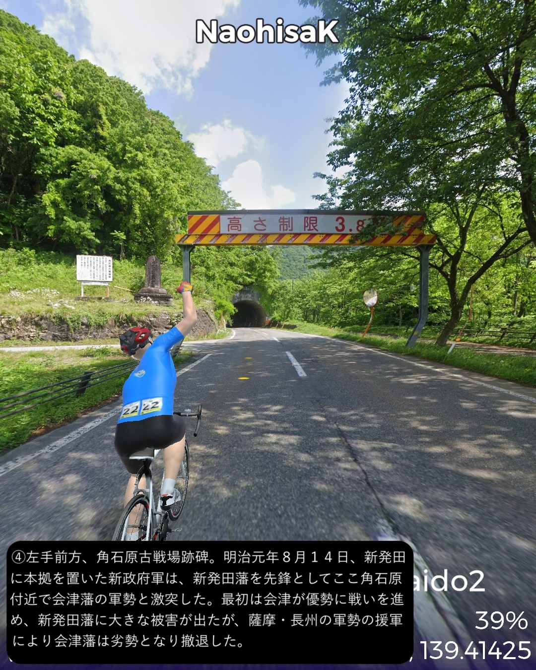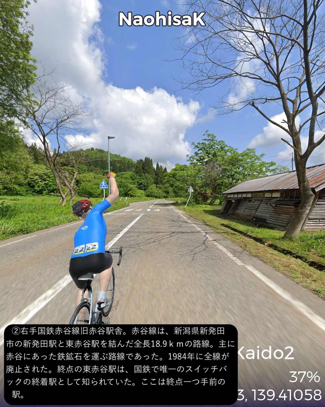 VRサイクリング 越後会津街道 2日目さらに米沢街道で越後国(新潟県)北東部を北へ進む。阿賀野川の辺の街、津川宿の外れ「きりん橋」の袂を出発し三川まで阿賀野川に沿って走り、その先で阿賀野川の支流新谷川の谷筋を登ってゆく。綱木宿の先で小さな峠を越えると赤谷宿、さらに加治川の谷に沿って下ると急に開けて越後平野に出る。五十公野宿を通り過ぎるとすぐに城下町新発田。ぐるっと新発田市街を巡った後は、米沢街道に入り日本海の海岸線の5-6km内側を北へ向かい中条宿を通り、4/23に通った越後十三峠街道(米沢街道)の花立宿付近荒川の辺をゴールとする72kmの行程。出発点津川宿からは本来の街道では最大の難所諏訪峠越えがあるのだが、ルートに組み込めないので三川経由の迂回路とした。そのせいか津川から新発田まではかなりのボリュームの山間ルートではあるがそんなに深い山間に入り込んだ感はなく比較的穏やかな谷筋の道であった。新発田は百名城に数えられる新発田城があり城下町らしい伝統的な街並みが魅力的である。今回走った米沢街道は実は4/17-4/23に米沢から村上にかけて走った越後十三峠街道の支線である。花立宿において村上へ向かう支線と新発田宿へ向かう支線が分岐するのだが、4月に走ったのは前者で、今回は後者を逆から攻めてきたことになる。さて次回からは北国街道という長い街道に入る。