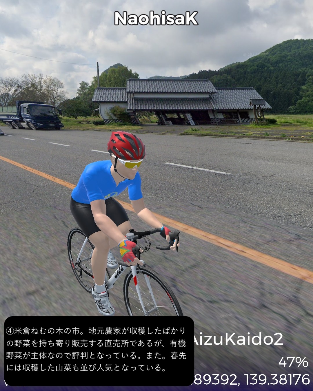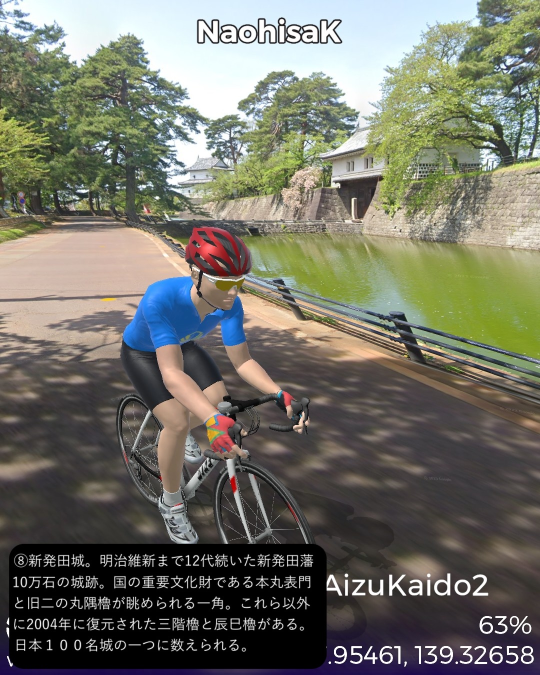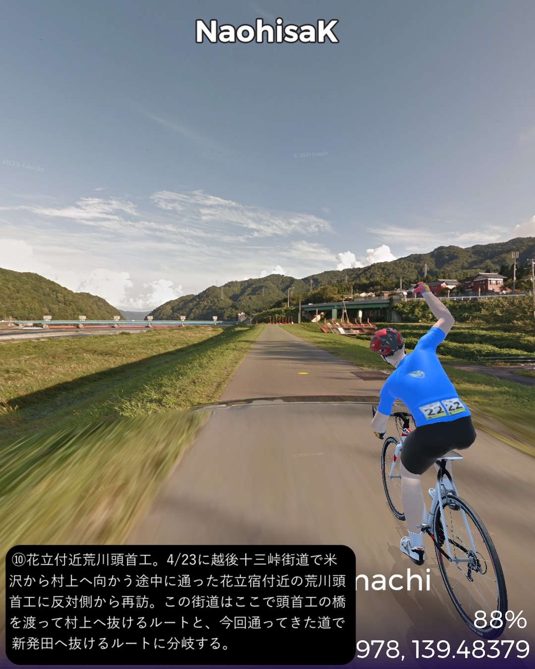 VRサイクリング 越後会津街道 2日目さらに米沢街道で越後国(新潟県)北東部を北へ進む。阿賀野川の辺の街、津川宿の外れ「きりん橋」の袂を出発し三川まで阿賀野川に沿って走り、その先で阿賀野川の支流新谷川の谷筋を登ってゆく。綱木宿の先で小さな峠を越えると赤谷宿、さらに加治川の谷に沿って下ると急に開けて越後平野に出る。五十公野宿を通り過ぎるとすぐに城下町新発田。ぐるっと新発田市街を巡った後は、米沢街道に入り日本海の海岸線の5-6km内側を北へ向かい中条宿を通り、4/23に通った越後十三峠街道(米沢街道)の花立宿付近荒川の辺をゴールとする72kmの行程。出発点津川宿からは本来の街道では最大の難所諏訪峠越えがあるのだが、ルートに組み込めないので三川経由の迂回路とした。そのせいか津川から新発田まではかなりのボリュームの山間ルートではあるがそんなに深い山間に入り込んだ感はなく比較的穏やかな谷筋の道であった。新発田は百名城に数えられる新発田城があり城下町らしい伝統的な街並みが魅力的である。今回走った米沢街道は実は4/17-4/23に米沢から村上にかけて走った越後十三峠街道の支線である。花立宿において村上へ向かう支線と新発田宿へ向かう支線が分岐するのだが、4月に走ったのは前者で、今回は後者を逆から攻めてきたことになる。さて次回からは北国街道という長い街道に入る。