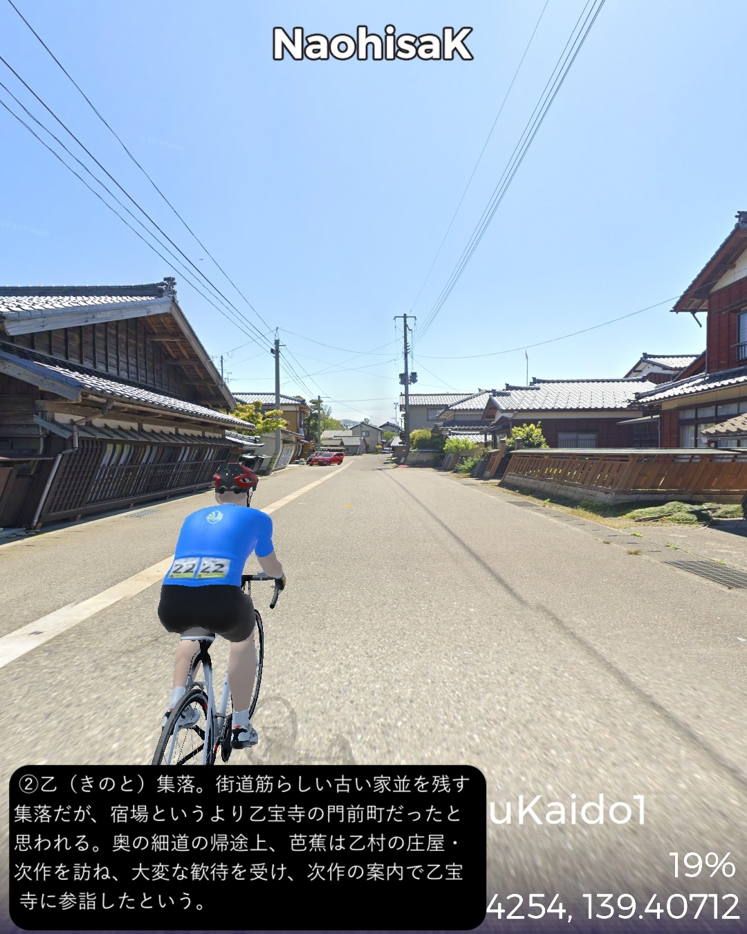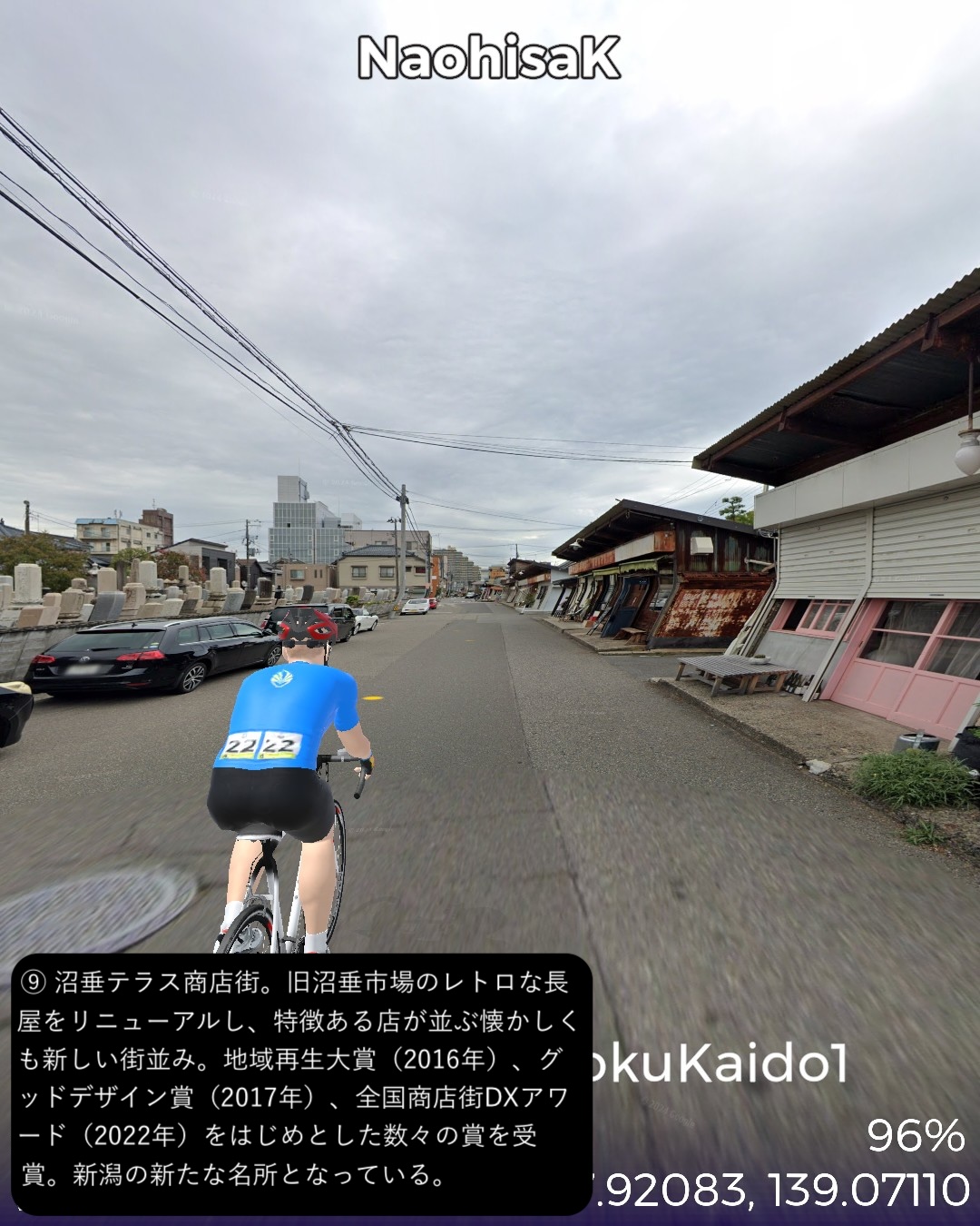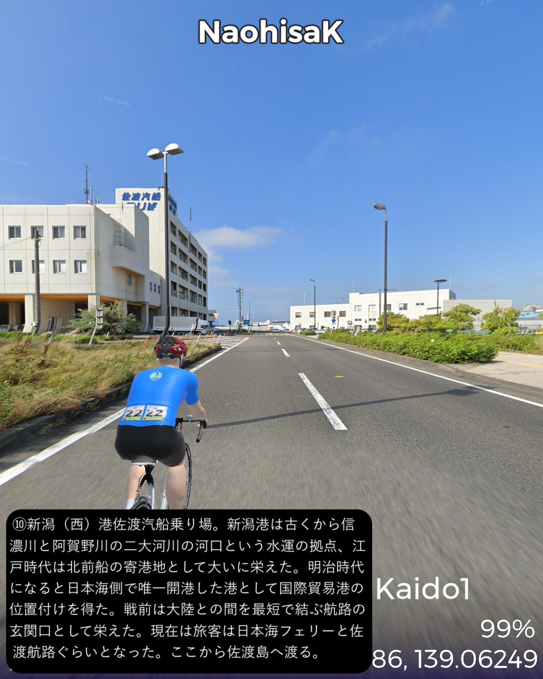 VRサイクリング 北国街道 1日目。日本海の浜沿いに新潟市街へ進む。越後十三峠街道の花立宿を起点にまず荒川沿いに河口まで進み、海岸に程近い小さな集落、乙(きのと)から北国街道に入る。その先しばらくは海岸沿いを進み、荒井浜宿、笹口浜、中村浜、村松浜宿、藤塚浜、網代浜を過ぎたところでちょっと内陸へ入り聖籠町の中心部を経由し新潟東港の南側、新潟競馬場を横目で眺めつつ海岸と並行して西へ進む。泰平橋でひたすら広い阿賀野川を越えると新潟市街。ゴールは信濃川沿いの新潟西港、佐渡汽船ターミナルとした67kmの行程。長い北国街道の中でこの辺は浜伝いの道なので浜通りと呼ばれる。信濃川、阿賀野川という二つの大河の河口があるため砂浜が続く地帯だが、ルートとした海岸道路からは浜が見えるポイントが少ない。浜へ出てみてもストリートビューの映像上は美しいビーチと言えるところはなかった。海水浴場は点在しているので水質は問題ないと思うが、海岸の眺めとしてはちょっと残念。街道としては浜通りという名称からするとその頃の浜辺がそのまま街道になっている部分が多いと察せられるので旧街道らしい痕跡が残るところは限られるが、街道に入った最初の集落、乙は宿場ではないが、乙宝寺という1300年の古刹の門前町でもあり古い家並が残っていて、ここが今回のルートで一番街道の香りがする場所であった。奥の細道ツアーからの帰途の松尾芭蕉もここに立ち寄ったとの記録もある。網代浜の先は新潟東港や新潟空港があったり浜辺の道が切れているので街道から外れるが内陸を通った。ゴールは新潟港の佐渡汽船のターミナルとしたというのは当然次回から佐渡島編になるということで、久々に海を渡る。VRサイクリングで新潟を訪れたのも2022年11月30日以来なので約2年ぶりの再訪となる。
