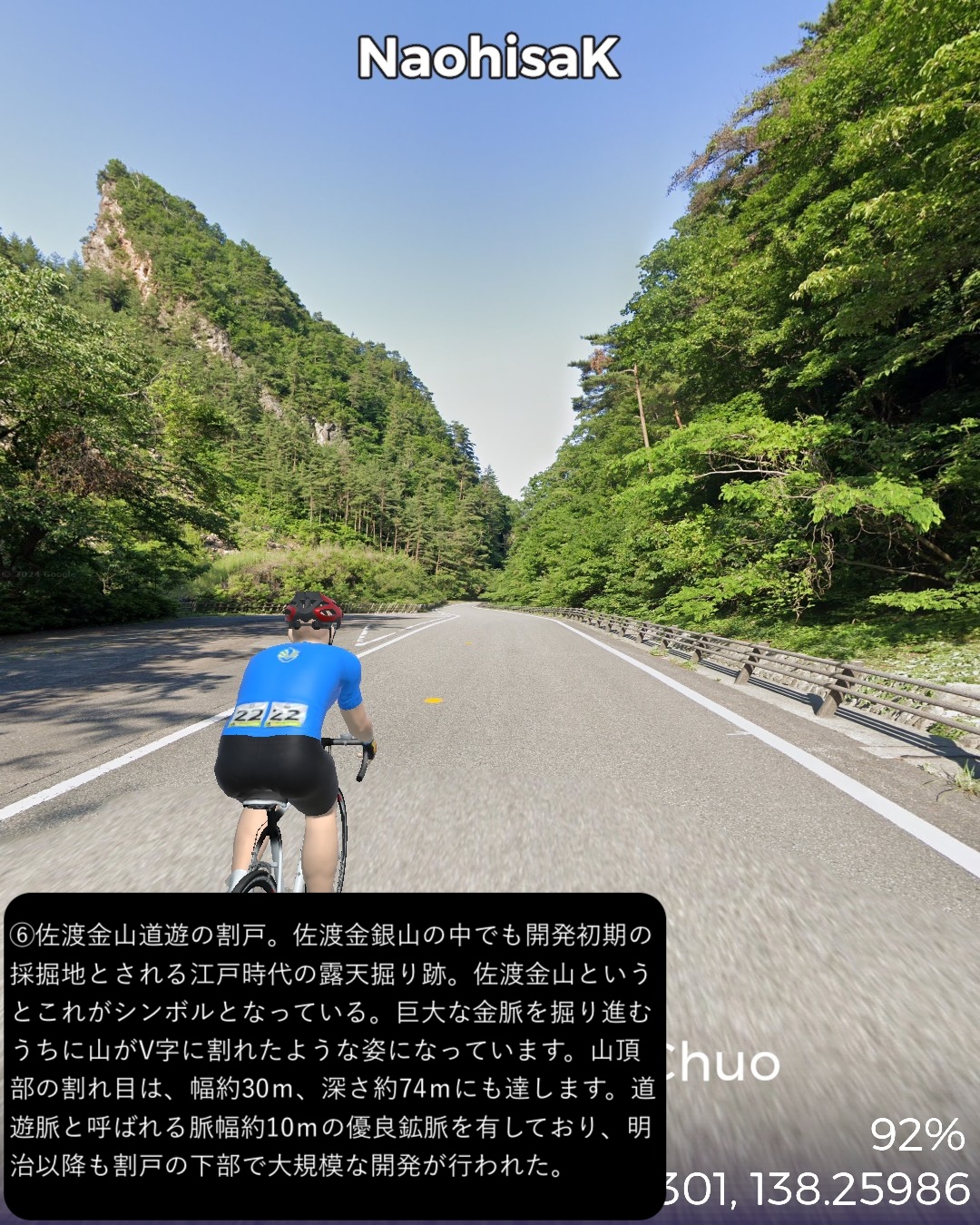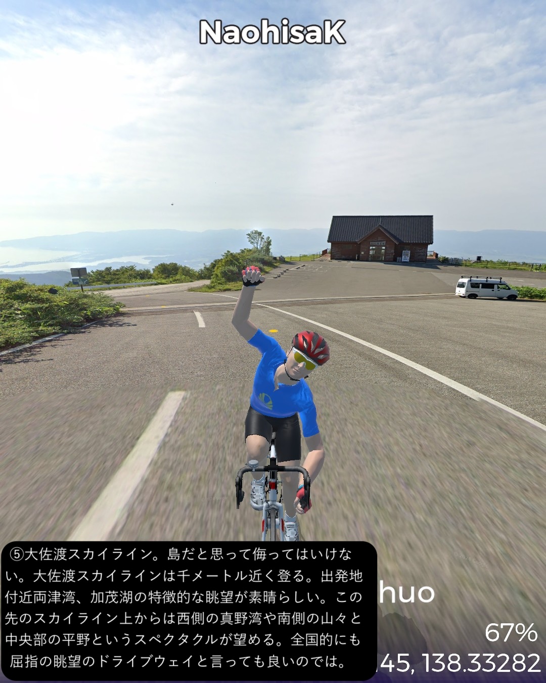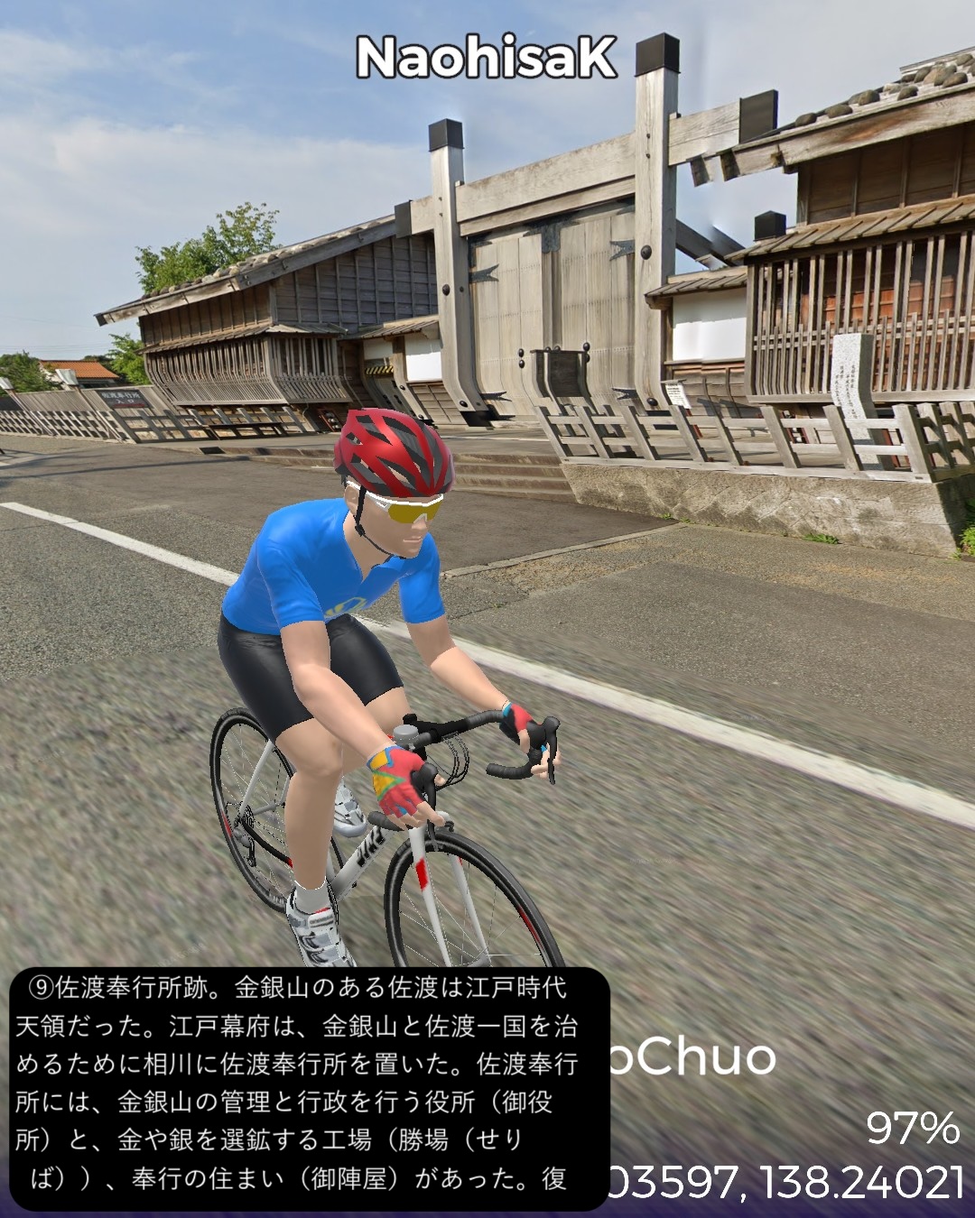 VRサイクリング 佐渡編の始まり。一日目は佐渡中央突破ルートと称して佐渡島中央部横断の巻。新潟から佐渡汽船にてたどり着いた両津湊を出発し、まず牡蠣小屋群などを眺めつつ加茂湖を巡り、次に佐渡島中央部の平原部をドンドン進み、トキの森公園、トキの道を往くと佐渡市庁舎がある島の行政の中心部に出る。そこから北の山岳方面へ進み、島流しされた順徳上皇が暮らした黒木御所跡、北條家住宅、多聞寺を通り過ぎ大佐渡スカイラインに入ると本格的な山岳ドライブウェイ。1000m近くからの絶景を楽しんだ後南西方向へ下って、世界遺産佐渡金山跡を通り、海岸べりの歴史ある町相川の古い湊、大間港跡をゴールとする53kmの行程。最近の行程としては短いが、映える箇所続出で充実した楽しい旅となった。佐渡については余りメディアにも取り上げられないこともありイメージが薄かったが、走ってみて非常に特異な風土を持った地であると感じた次第。街並みで言うと出だしの両津にしてもゴールの相川にしても焦茶色の古い木造家屋がずぃっと繋がり非常に独特で魅惑的な街並みが印象的。加茂湖湖畔の牡蠣小屋はボートが格納された小さな木造の小屋が湖畔に連なっていて、フォトスポットとして素晴らしい構図となっている。広い島だが島だけに佐渡スカイラインからの四方に海が見え山と平野も見えるパノラマビューが見応えある。それから世界遺産の佐渡金山跡も古くからの採掘の歴史が表だけのストリートビューの映像にも垣間見える独特の雰囲気。中に入ったらもっと感じるものがあるだろう。こりゃ佐渡は行かなきゃ、と思いました。次回の佐渡編は、金山で採掘した金を本土へ運搬するために島を縦断する相川街道へ行ってみる。