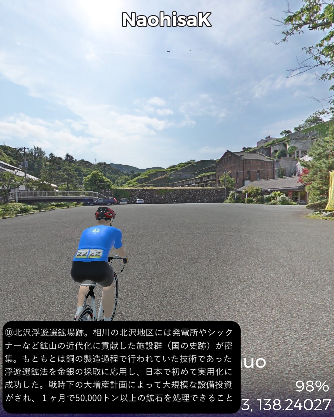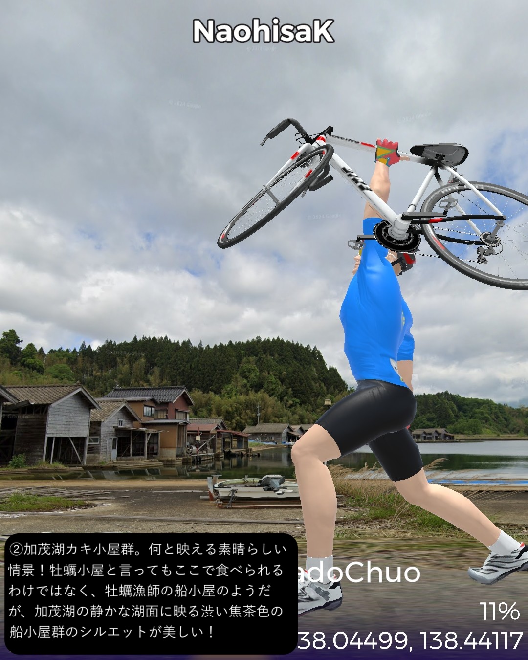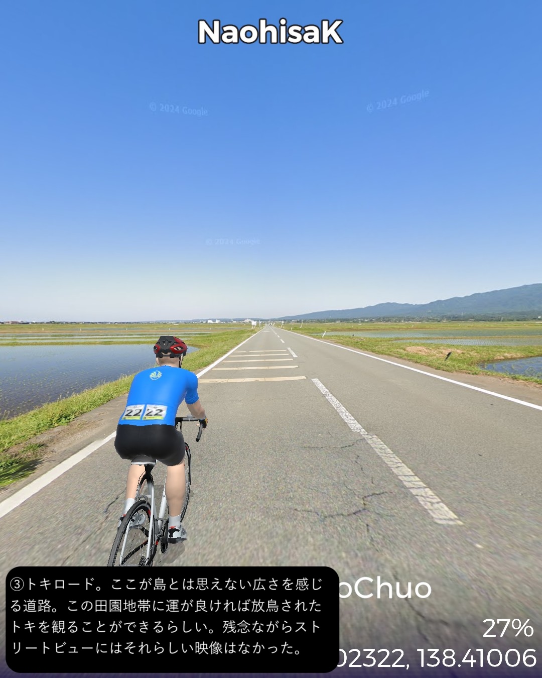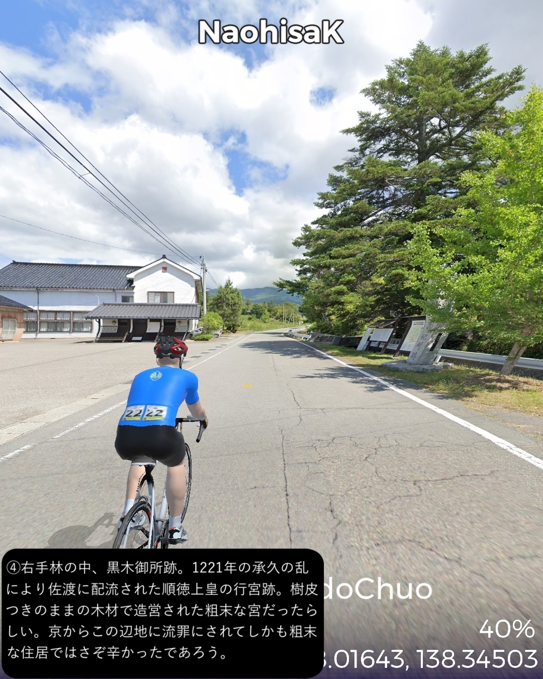VRサイクリング 佐渡編の始まり。一日目は佐渡中央突破ルートと称して佐渡島中央部横断の巻。新潟から佐渡汽船にてたどり着いた両津湊を出発し、まず牡蠣小屋群などを眺めつつ加茂湖を巡り、次に佐渡島中央部の平原部をドンドン進み、トキの森公園、トキの道を往くと佐渡市庁舎がある島の行政の中心部に出る。そこから北の山岳方面へ進み、島流しされた順徳上皇が暮らした黒木御所跡、北條家住宅、多聞寺を通り過ぎ大佐渡スカイラインに入ると本格的な山岳ドライブウェイ。1000m近くからの絶景を楽しんだ後南西方向へ下って、世界遺産佐渡金山跡を通り、海岸べりの歴史ある町相川の古い湊、大間港跡をゴールとする53kmの行程。最近の行程としては短いが、映える箇所続出で充実した楽しい旅となった。佐渡については余りメディアにも取り上げられないこともありイメージが薄かったが、走ってみて非常に特異な風土を持った地であると感じた次第。街並みで言うと出だしの両津にしてもゴールの相川にしても焦茶色の古い木造家屋がずぃっと繋がり非常に独特で魅惑的な街並みが印象的。加茂湖湖畔の牡蠣小屋はボートが格納された小さな木造の小屋が湖畔に連なっていて、フォトスポットとして素晴らしい構図となっている。広い島だが島だけに佐渡スカイラインからの四方に海が見え山と平野も見えるパノラマビューが見応えある。それから世界遺産の佐渡金山跡も古くからの採掘の歴史が表だけのストリートビューの映像にも垣間見える独特の雰囲気。中に入ったらもっと感じるものがあるだろう。こりゃ佐渡は行かなきゃ、と思いました。次回の佐渡編は、金山で採掘した金を本土へ運搬するために島を縦断する相川街道へ行ってみる。