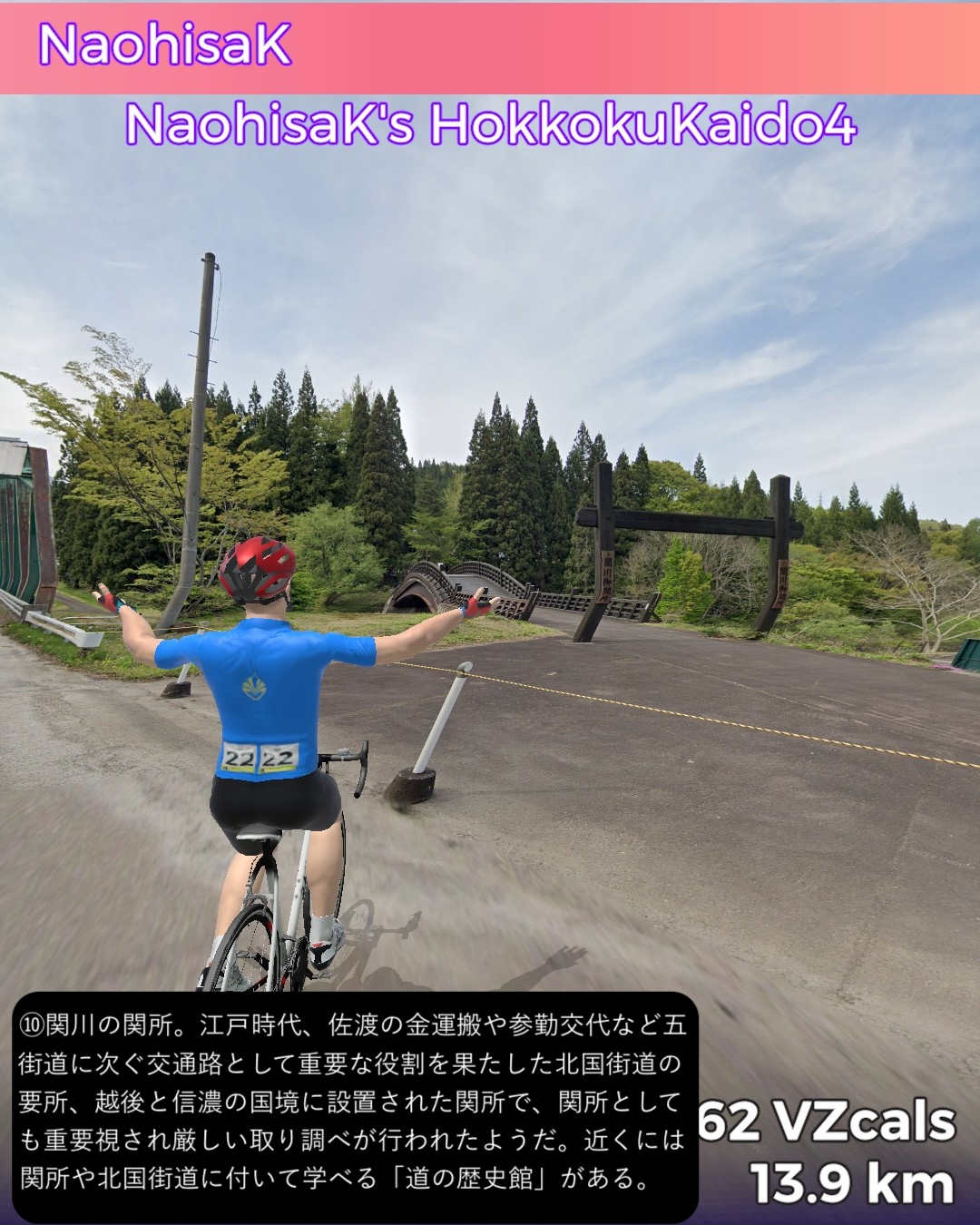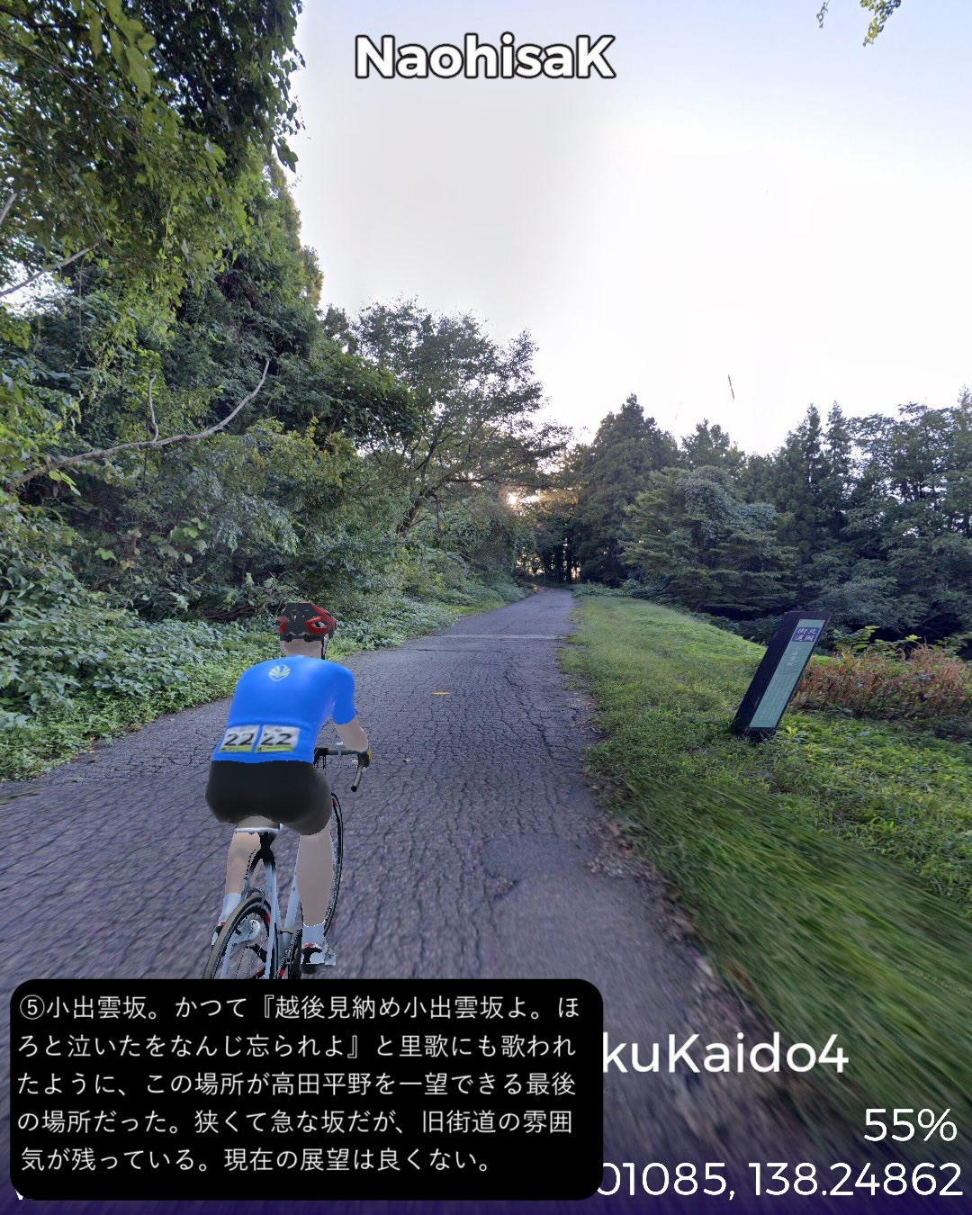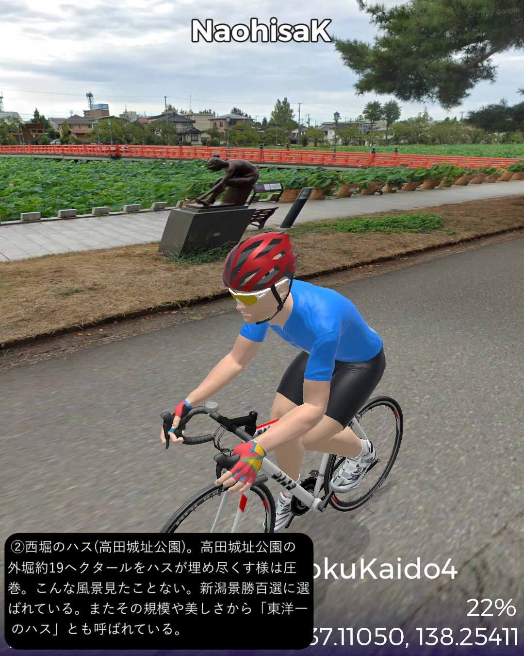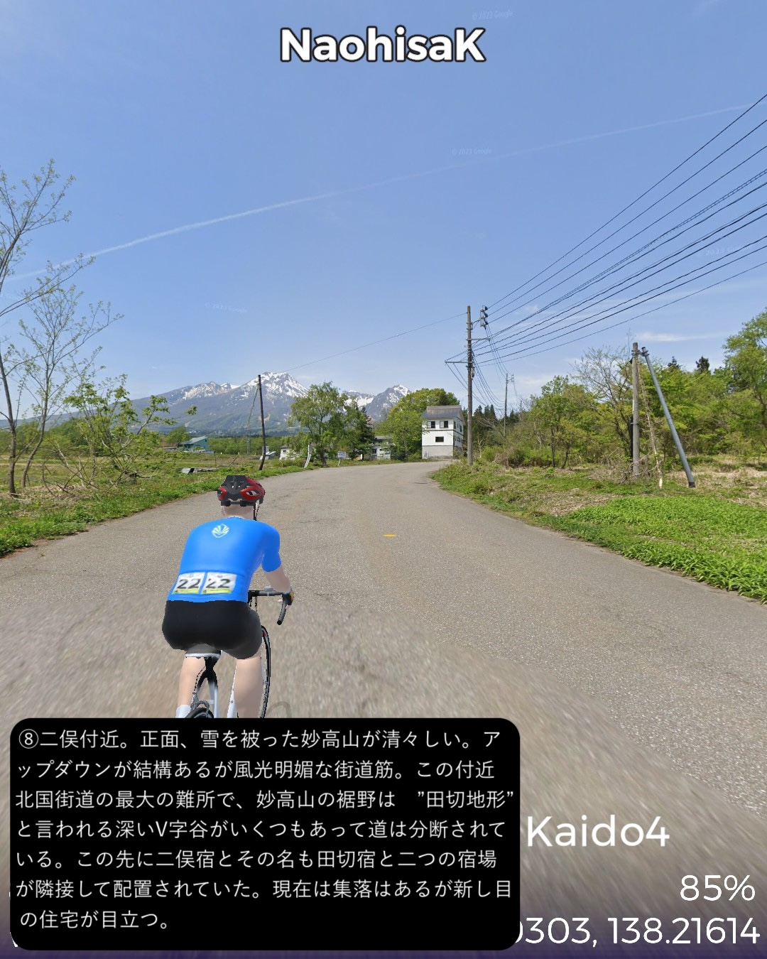 VRサイクリング 北国街道4日目。日本海沿岸から離れて信濃国(長野県)に向けて南下する。北前船の湊町直江津付近を出発し北国街道に沿って山間へ向かって南下。直江津からの家並が途切れないうちに城下町高田に到着。ここで一回り目ぼしいスポットを巡った後、さらに街道にそって南下し、妙高山麓の縁を進んでゆく。新井宿、二本木宿、関山宿、二俣宿を通り過ぎ、越後国(新潟県)と信濃国(長野県)との国境(県境)の関川宿に付随する関川の関所をゴールとする47kmの行程。今回のハイライトは2箇所。一つは城下町高田。よく思い返すと私にとっては訪れたこともないばかりか、高田という町がここにあることをはっきり認識していなかった。日本のほぼ全ての町の位置を認識しているという自負があったが、何故か高田だけは新潟県のどこかにある町という認識しかなかった。昔からスキーなどで馴染みのあった妙高のちょっと先にこのような大きな城下町として位置していたとは今回行って初めて認識した次第。にも関わらずVRで訪れてみて非常に魅力的な町であることも知った。日本有数の積雪地域で雁木の多い町であるということだけは社会科の教科書で知っていたが、街道沿いが延々と雁木付きの町並みとなっているのは他に類を見ない特徴的な町並みだ。江戸時代から変わらないような古い町並みもあり、昭和レトロな町並みも、より現代的な町並みもあるのだが雁木だけはボーダーレスにどこまでも続く町が高田なのだ。高田城址の広い外堀をハスが埋め尽くす景色も他に見たことのないインパクトがあった。高田は西側の寺町も特色があって良さ気だったがルート作成の事情があり残念ながら割愛した。もう一つのハイライトはほぼ完全に残る旧街道。宿場町として情緒が感じられる集落は新井宿ぐらいで他の宿場町には伝統的な建築物は少なかったが、妙高山や黒姫山を望む山麓の道は美しい山野や田園の中を旧道らしい絶妙のうねうね具合で続くロング&ワインディングロード。これぞ旧街道の醍醐味。さて次回は早くも長野の先へ進む。