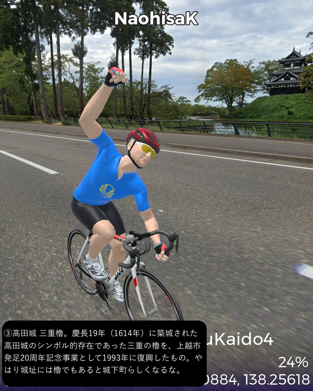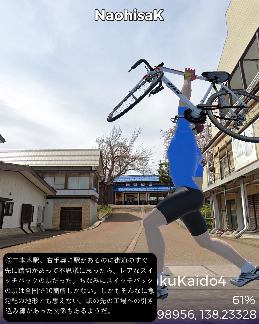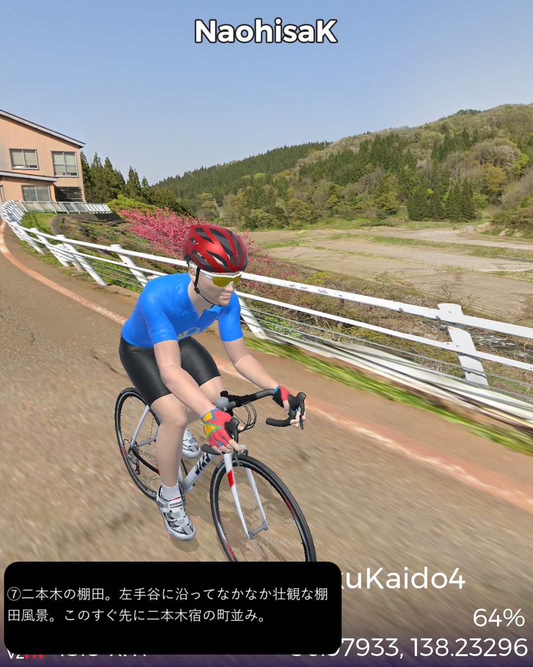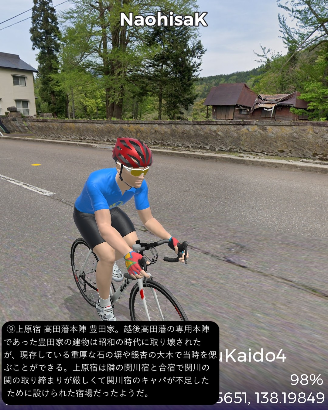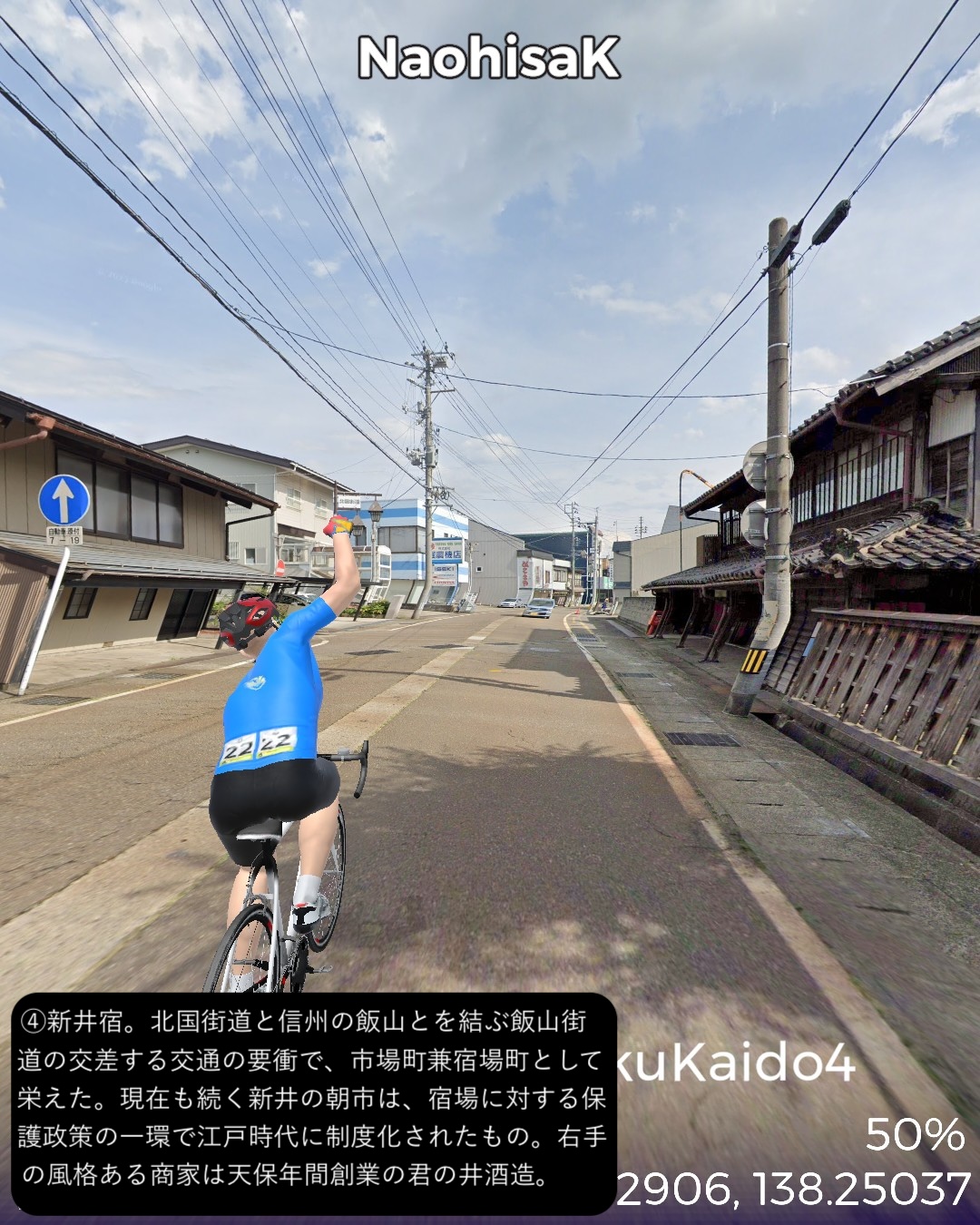 VRサイクリング 北国街道4日目。日本海沿岸から離れて信濃国(長野県)に向けて南下する。北前船の湊町直江津付近を出発し北国街道に沿って山間へ向かって南下。直江津からの家並が途切れないうちに城下町高田に到着。ここで一回り目ぼしいスポットを巡った後、さらに街道にそって南下し、妙高山麓の縁を進んでゆく。新井宿、二本木宿、関山宿、二俣宿を通り過ぎ、越後国(新潟県)と信濃国(長野県)との国境(県境)の関川宿に付随する関川の関所をゴールとする47kmの行程。今回のハイライトは2箇所。一つは城下町高田。よく思い返すと私にとっては訪れたこともないばかりか、高田という町がここにあることをはっきり認識していなかった。日本のほぼ全ての町の位置を認識しているという自負があったが、何故か高田だけは新潟県のどこかにある町という認識しかなかった。昔からスキーなどで馴染みのあった妙高のちょっと先にこのような大きな城下町として位置していたとは今回行って初めて認識した次第。にも関わらずVRで訪れてみて非常に魅力的な町であることも知った。日本有数の積雪地域で雁木の多い町であるということだけは社会科の教科書で知っていたが、街道沿いが延々と雁木付きの町並みとなっているのは他に類を見ない特徴的な町並みだ。江戸時代から変わらないような古い町並みもあり、昭和レトロな町並みも、より現代的な町並みもあるのだが雁木だけはボーダーレスにどこまでも続く町が高田なのだ。高田城址の広い外堀をハスが埋め尽くす景色も他に見たことのないインパクトがあった。高田は西側の寺町も特色があって良さ気だったがルート作成の事情があり残念ながら割愛した。もう一つのハイライトはほぼ完全に残る旧街道。宿場町として情緒が感じられる集落は新井宿ぐらいで他の宿場町には伝統的な建築物は少なかったが、妙高山や黒姫山を望む山麓の道は美しい山野や田園の中を旧道らしい絶妙のうねうね具合で続くロング&ワインディングロード。これぞ旧街道の醍醐味。さて次回は早くも長野の先へ進む。