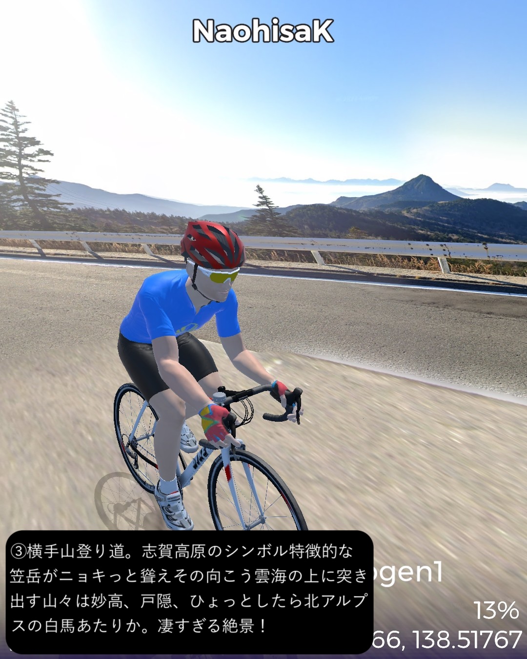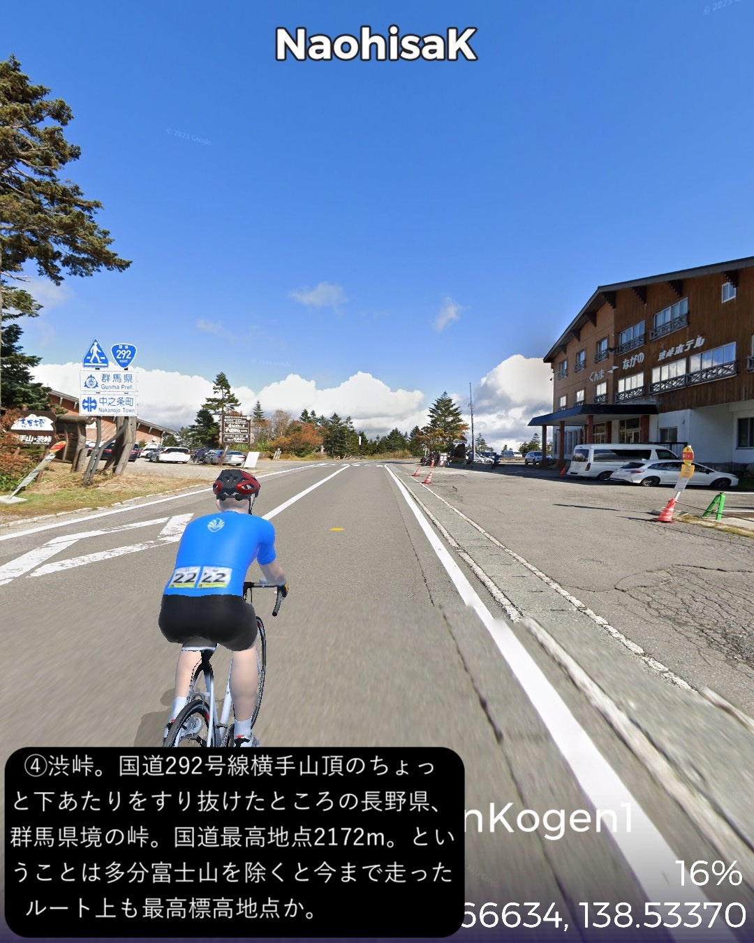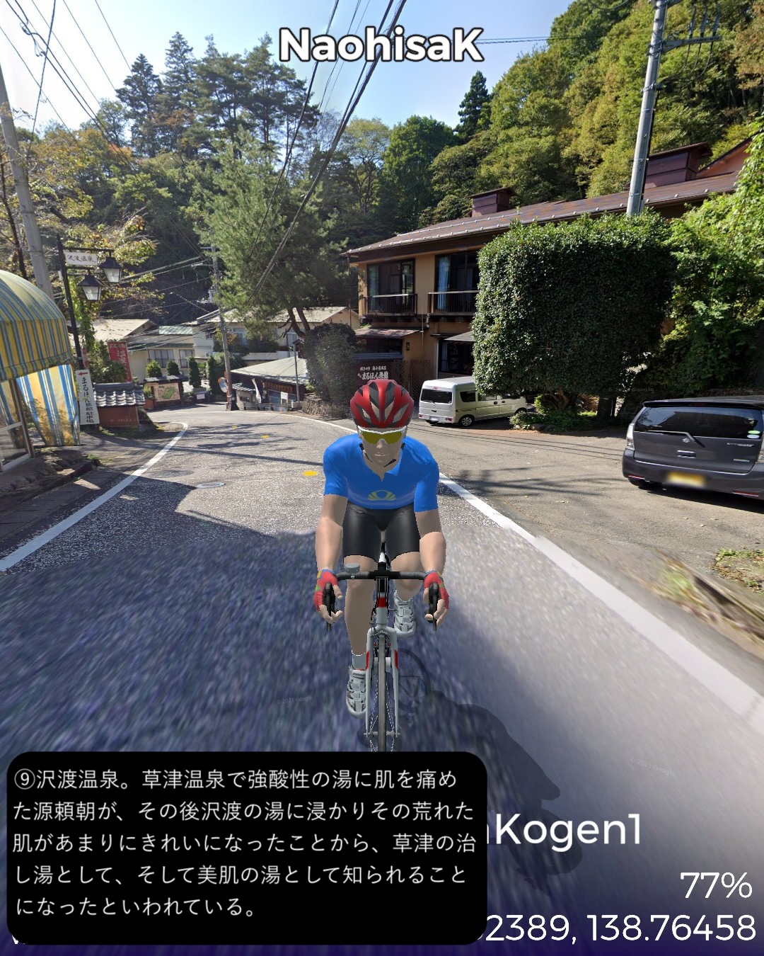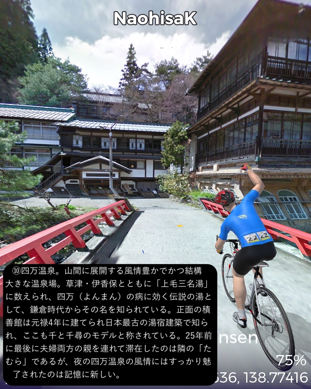 VRサイクリング 題して日本ロマンチック街道 1日目。近年観光の客寄せの為にルート設定されて付けられた名称を一部ルートが被っている程度で頂くことにする。志賀高原から有名な観光ルートで国道日本最高地点まで登り、横手山、白根山の脇を掠めて群馬県へ入り、国内有数の温泉郷草津温泉へ下る。その先はまさに日本ロマンチック街道のルートに則り群馬の山間を登り下りしつつ美肌の湯として知る人ぞ知る沢渡温泉へ至る。この辺まではほぼ東へ進んできたがその先で北へ針路を変えて渓谷沿いを登ってゆくと山間の温泉地四万温泉。その先の四万川ダムをゴールとする75kmの行程。前半は絶景の連続。標高2172mの国道最高地点まで登る横手山と白根山と遥かな下界を望むドライブウェイは今までの同種の絶景道と比べても段違いの迫力だ。横手山は一度だけ会社の別の職場の連中とスキーで訪れたことがあった。馴染みの薄かった連中と打ち解けて非常に楽しかった記憶がある。ただ横手山に延々と登る超長いリフトは寒くて参った。今回夏ではあるがドライブウェイを登って行ったが、国道最高地点まで登るので登りの道も結構長かった。寒空のリフトでこの標高差を登ったんだと再確認した次第。草津温泉は以前から訪れたかったがなかなか足が向かず縁のなかった温泉場。長いドライブを強いられることになるのがねえ。でも来年あたり渋温泉、と志賀高原、白根山を巡るドライブと草津温泉セットで訪れてみようと思った。ゴールとした四万温泉は15年ほど前、夫婦の両方の親を最後に連れて行った温泉場として思い出深い。夜散策した温泉街の情緒も忘れ難い。今回VRで再訪して温泉場の雰囲気もそのままで懐かしかった。