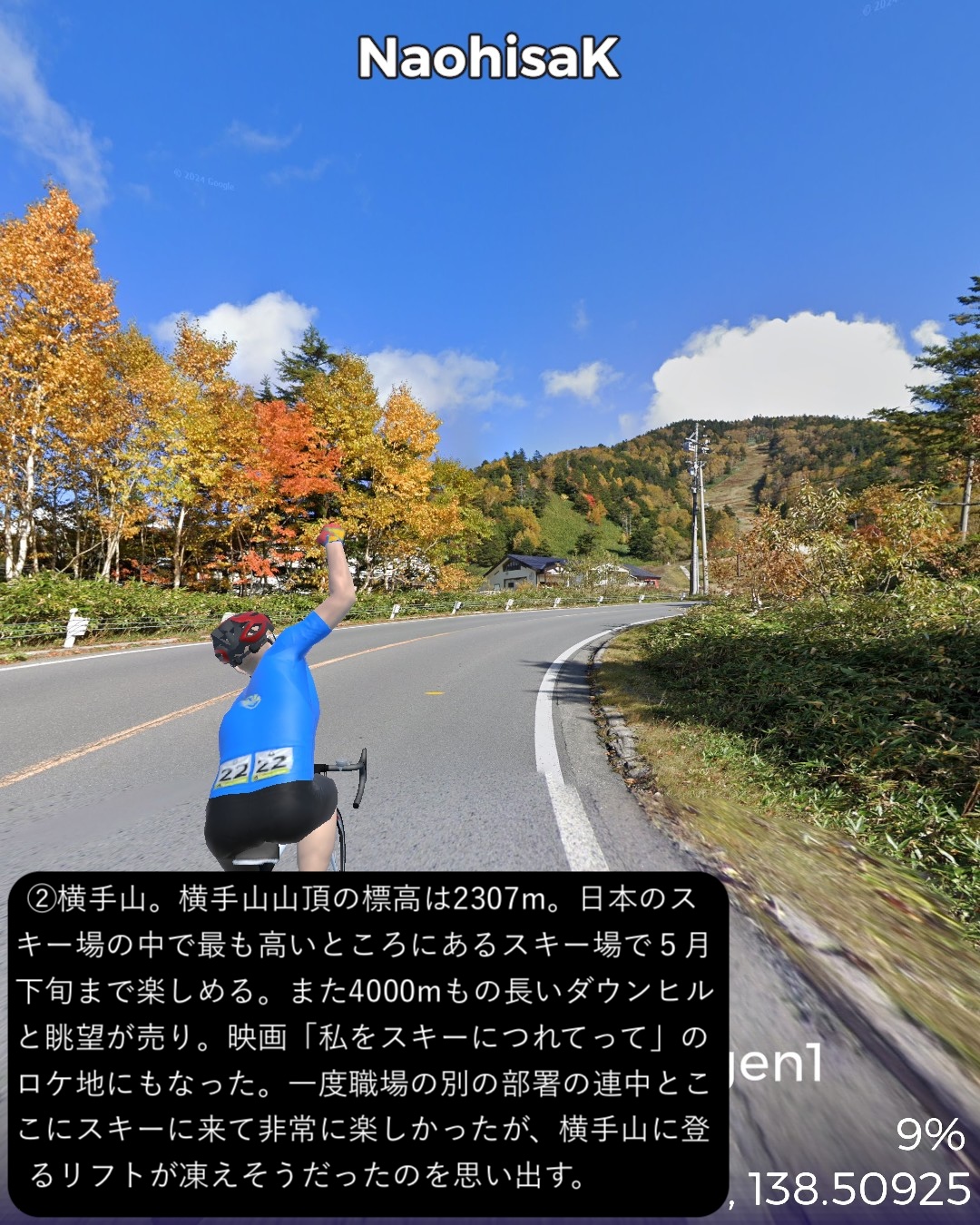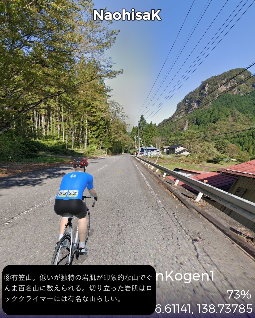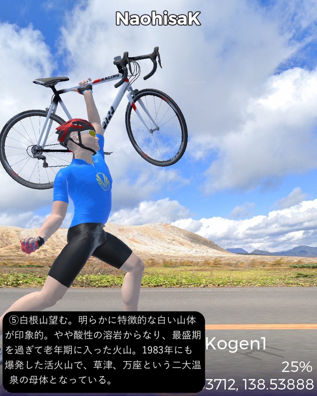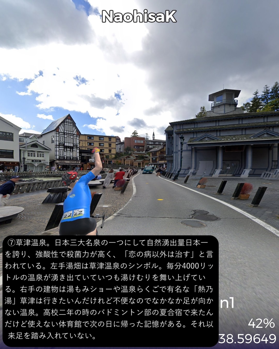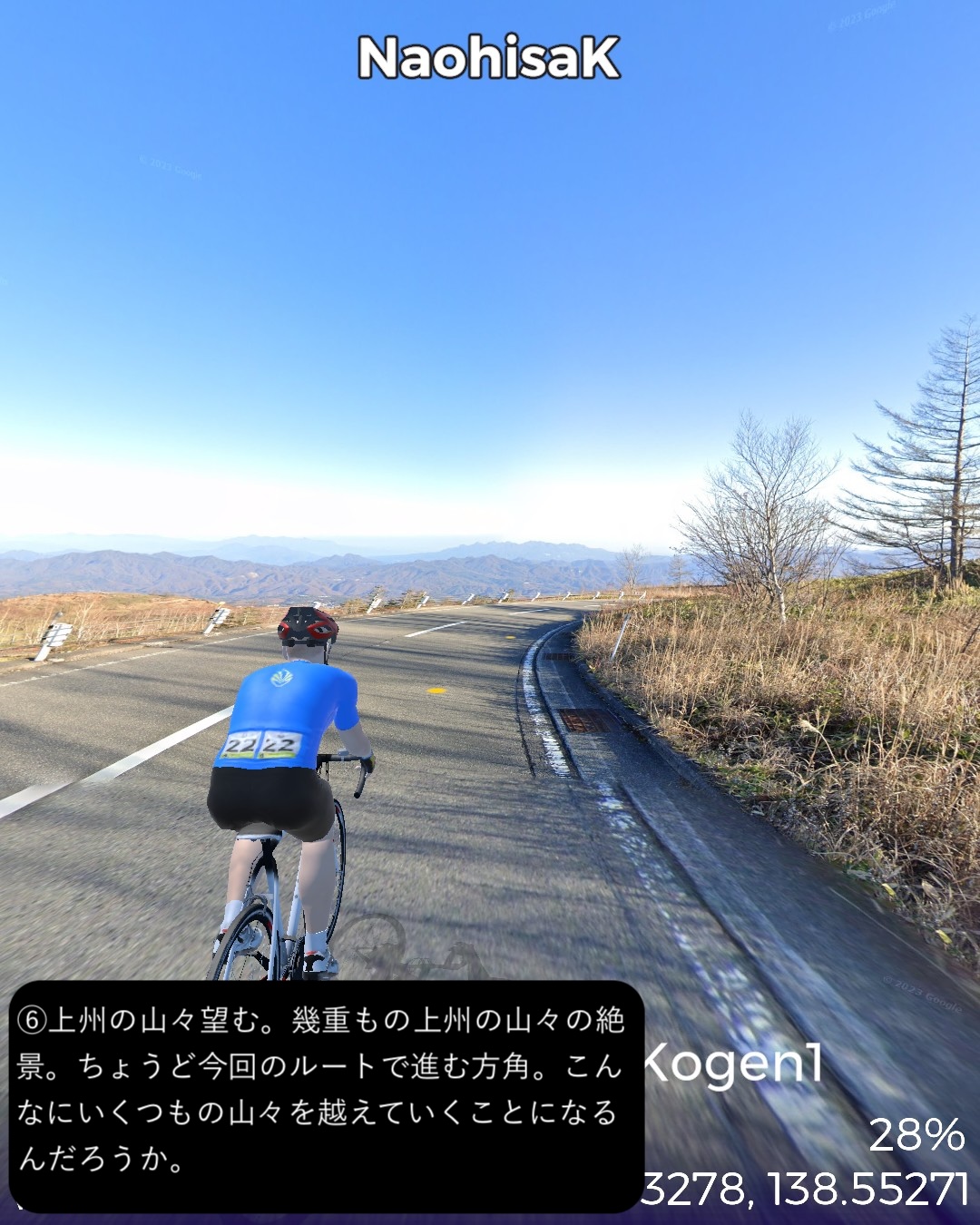 VRサイクリング 題して日本ロマンチック街道 1日目。近年観光の客寄せの為にルート設定されて付けられた名称を一部ルートが被っている程度で頂くことにする。志賀高原から有名な観光ルートで国道日本最高地点まで登り、横手山、白根山の脇を掠めて群馬県へ入り、国内有数の温泉郷草津温泉へ下る。その先はまさに日本ロマンチック街道のルートに則り群馬の山間を登り下りしつつ美肌の湯として知る人ぞ知る沢渡温泉へ至る。この辺まではほぼ東へ進んできたがその先で北へ針路を変えて渓谷沿いを登ってゆくと山間の温泉地四万温泉。その先の四万川ダムをゴールとする75kmの行程。前半は絶景の連続。標高2172mの国道最高地点まで登る横手山と白根山と遥かな下界を望むドライブウェイは今までの同種の絶景道と比べても段違いの迫力だ。横手山は一度だけ会社の別の職場の連中とスキーで訪れたことがあった。馴染みの薄かった連中と打ち解けて非常に楽しかった記憶がある。ただ横手山に延々と登る超長いリフトは寒くて参った。今回夏ではあるがドライブウェイを登って行ったが、国道最高地点まで登るので登りの道も結構長かった。寒空のリフトでこの標高差を登ったんだと再確認した次第。草津温泉は以前から訪れたかったがなかなか足が向かず縁のなかった温泉場。長いドライブを強いられることになるのがねえ。でも来年あたり渋温泉、と志賀高原、白根山を巡るドライブと草津温泉セットで訪れてみようと思った。ゴールとした四万温泉は15年ほど前、夫婦の両方の親を最後に連れて行った温泉場として思い出深い。夜散策した温泉街の情緒も忘れ難い。今回VRで再訪して温泉場の雰囲気もそのままで懐かしかった。
