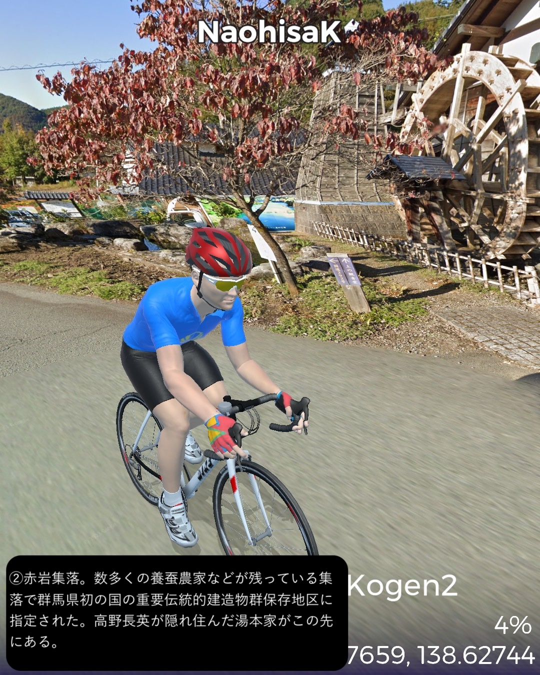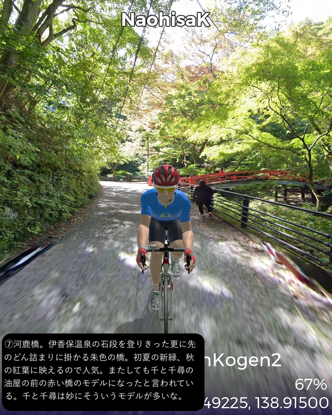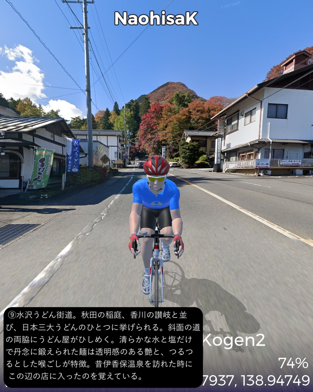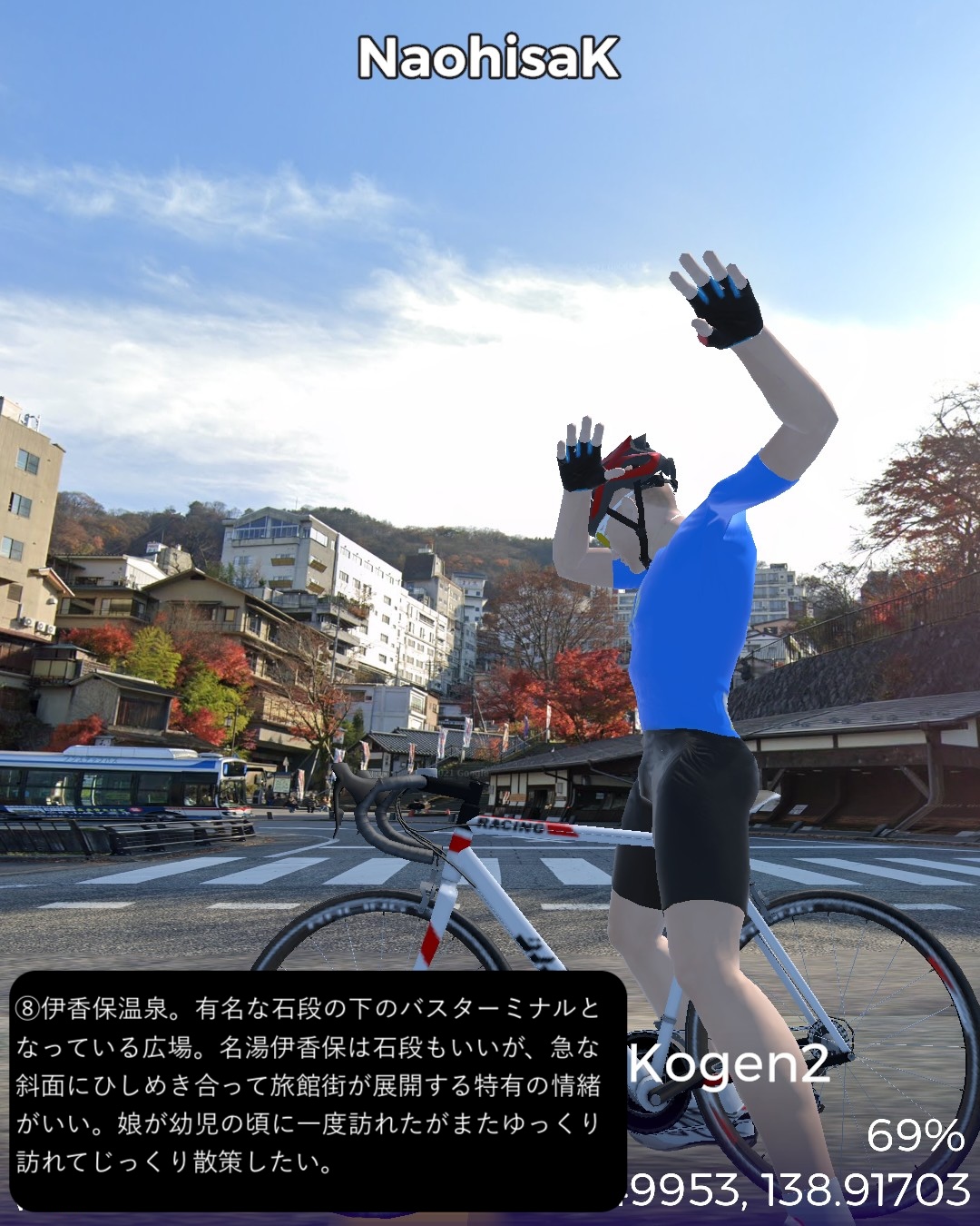 VRサイクリング 日本ロマンチック街道2日目と題したが、業者が設定した街道ルートから完全に外れて榛名湖と伊香保温泉を巡るルート。前回のルートの途中、草津温泉から下りた谷間の集落六合をスタート地点として谷を更に下り重要伝統的建造物群保存地区の赤岩集落を経て、吾妻川のより広い谷に出ると草津温泉への玄関口となっている長野原。吾妻川沿いに少し下り、民主党政権時代に一旦建設中止となってその後完成したいわく付きの八ツ場ダムの人造湖を渡り、以前走った大笹街道の上州寄りのパートに入って関所のある大戸宿を通り高崎へ向かって南下、倉渕付近で街道から抜けて北東へ榛名山を登る。パワースポットとして有名な榛名神社を掠め通り登り詰めると紅葉の榛名湖。湖を少し回って北東方面へ下ると山麓に広がる名湯伊香保温泉。温泉街を一巡りし、山麓を南に少し行った水澤観音と水澤うどん街道を冷やかしてから北の吾妻川の谷へ再度下る。吾妻川の谷を今度は上り小野上温泉を経て中之条に至る87kmの行程。今回は榛名湖と伊香保温泉を経由したいが為に無理やりルートを捻じ曲げた感はあるが、上州の立ち寄るべきスポットとしてこの辺を外す訳にはいかない。25年ほど前に数少ない3世代の家族旅行で訪れた思い出の地でもある。今回のVRの旅では榛名湖と榛名山は紅葉のベストシーズンで迎えてくれて、目の保養となった。伊香保温泉は石段で有名だが、山麓の斜面にひしめき合って展開する温泉旅館街は特有の情緒があって再訪したくなった。それにこの付近、榛名山麓からの眺望が開放的で素晴らしい。榛名山麓は利根川や吾妻川の谷に向かってゆったりと斜面が広がっているが、その谷の向こう側も赤城山麓が同様にゆったりとした斜面となって広がり、他にない上州だけの開放的な絶景となっているのだ。次回は本来の日本ロマンチック街道を経由して向こう側の赤城山へ回ってみる。