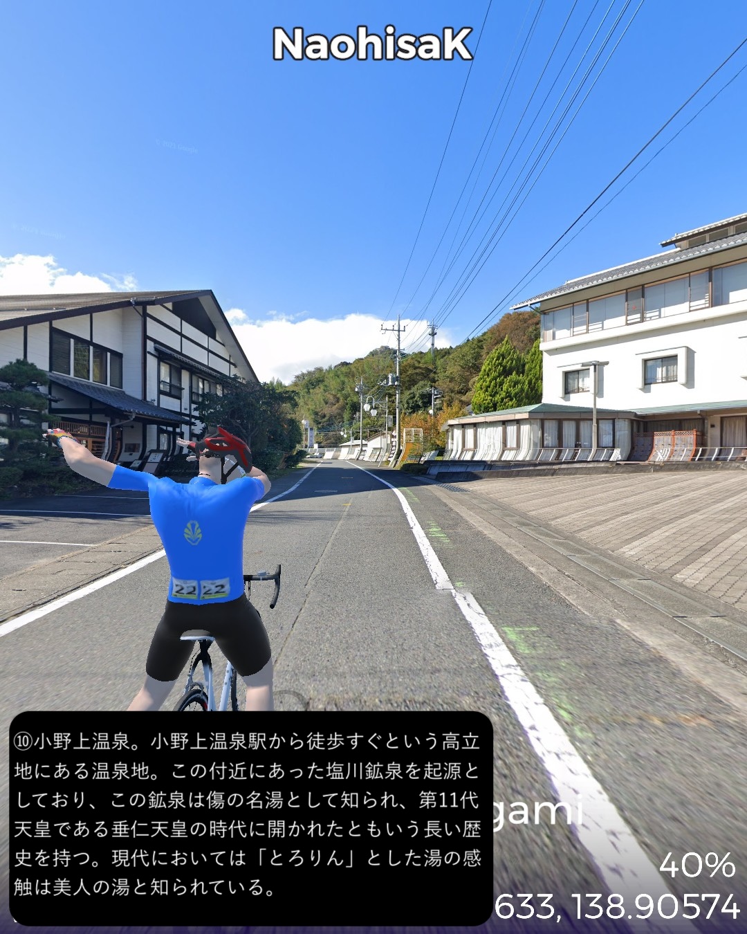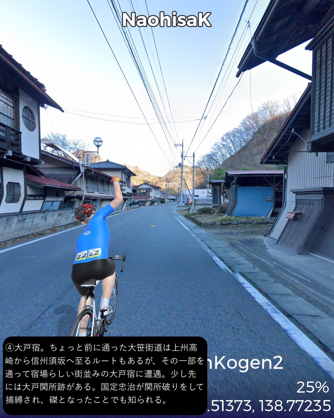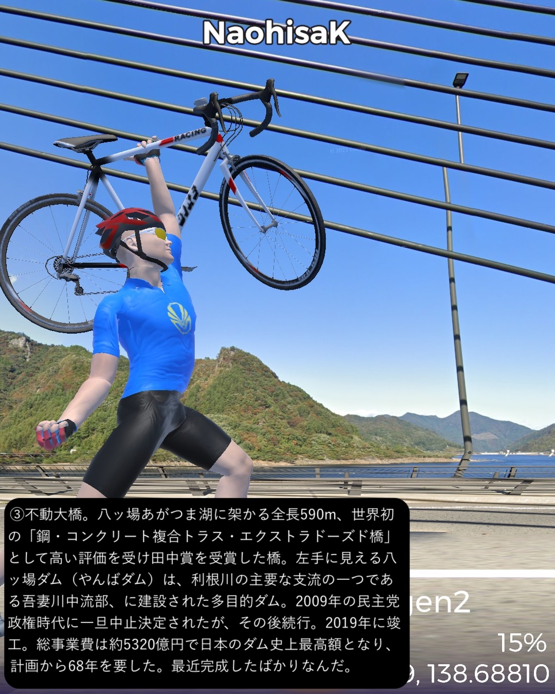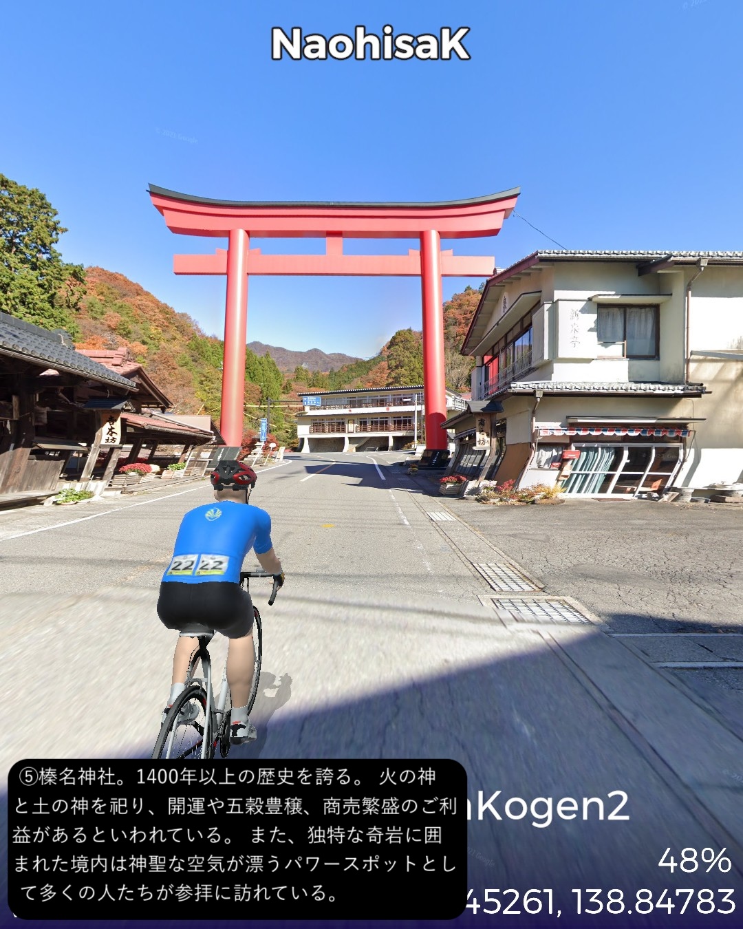 VRサイクリング 日本ロマンチック街道2日目と題したが、業者が設定した街道ルートから完全に外れて榛名湖と伊香保温泉を巡るルート。前回のルートの途中、草津温泉から下りた谷間の集落六合をスタート地点として谷を更に下り重要伝統的建造物群保存地区の赤岩集落を経て、吾妻川のより広い谷に出ると草津温泉への玄関口となっている長野原。吾妻川沿いに少し下り、民主党政権時代に一旦建設中止となってその後完成したいわく付きの八ツ場ダムの人造湖を渡り、以前走った大笹街道の上州寄りのパートに入って関所のある大戸宿を通り高崎へ向かって南下、倉渕付近で街道から抜けて北東へ榛名山を登る。パワースポットとして有名な榛名神社を掠め通り登り詰めると紅葉の榛名湖。湖を少し回って北東方面へ下ると山麓に広がる名湯伊香保温泉。温泉街を一巡りし、山麓を南に少し行った水澤観音と水澤うどん街道を冷やかしてから北の吾妻川の谷へ再度下る。吾妻川の谷を今度は上り小野上温泉を経て中之条に至る87kmの行程。今回は榛名湖と伊香保温泉を経由したいが為に無理やりルートを捻じ曲げた感はあるが、上州の立ち寄るべきスポットとしてこの辺を外す訳にはいかない。25年ほど前に数少ない3世代の家族旅行で訪れた思い出の地でもある。今回のVRの旅では榛名湖と榛名山は紅葉のベストシーズンで迎えてくれて、目の保養となった。伊香保温泉は石段で有名だが、山麓の斜面にひしめき合って展開する温泉旅館街は特有の情緒があって再訪したくなった。それにこの付近、榛名山麓からの眺望が開放的で素晴らしい。榛名山麓は利根川や吾妻川の谷に向かってゆったりと斜面が広がっているが、その谷の向こう側も赤城山麓が同様にゆったりとした斜面となって広がり、他にない上州だけの開放的な絶景となっているのだ。次回は本来の日本ロマンチック街道を経由して向こう側の赤城山へ回ってみる。