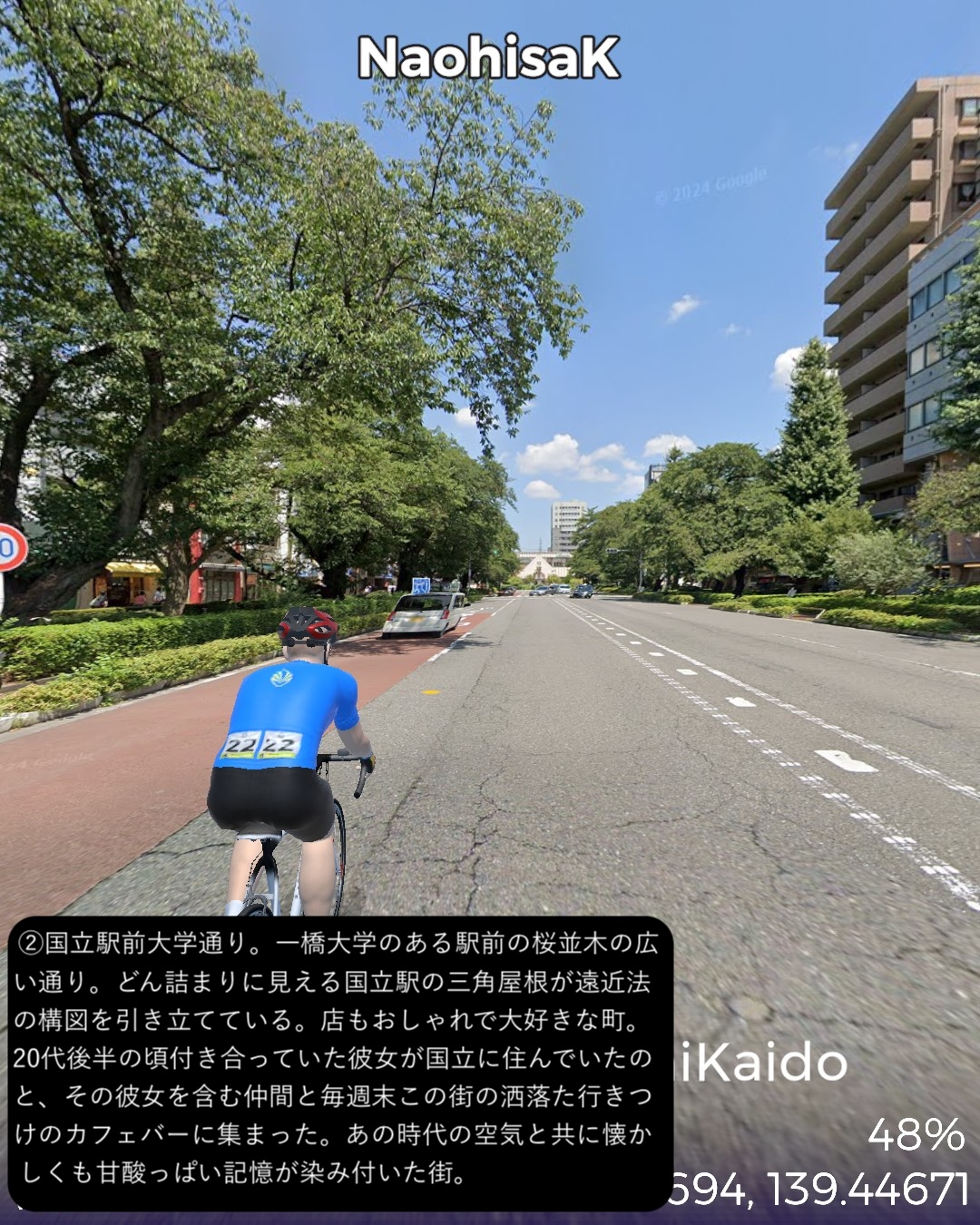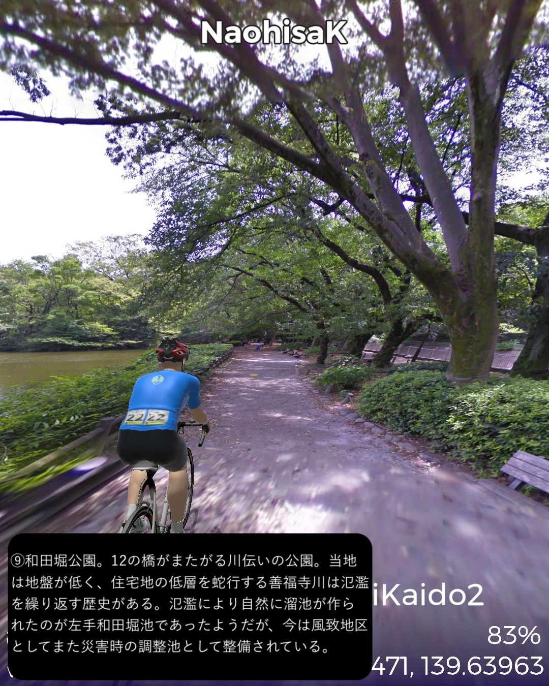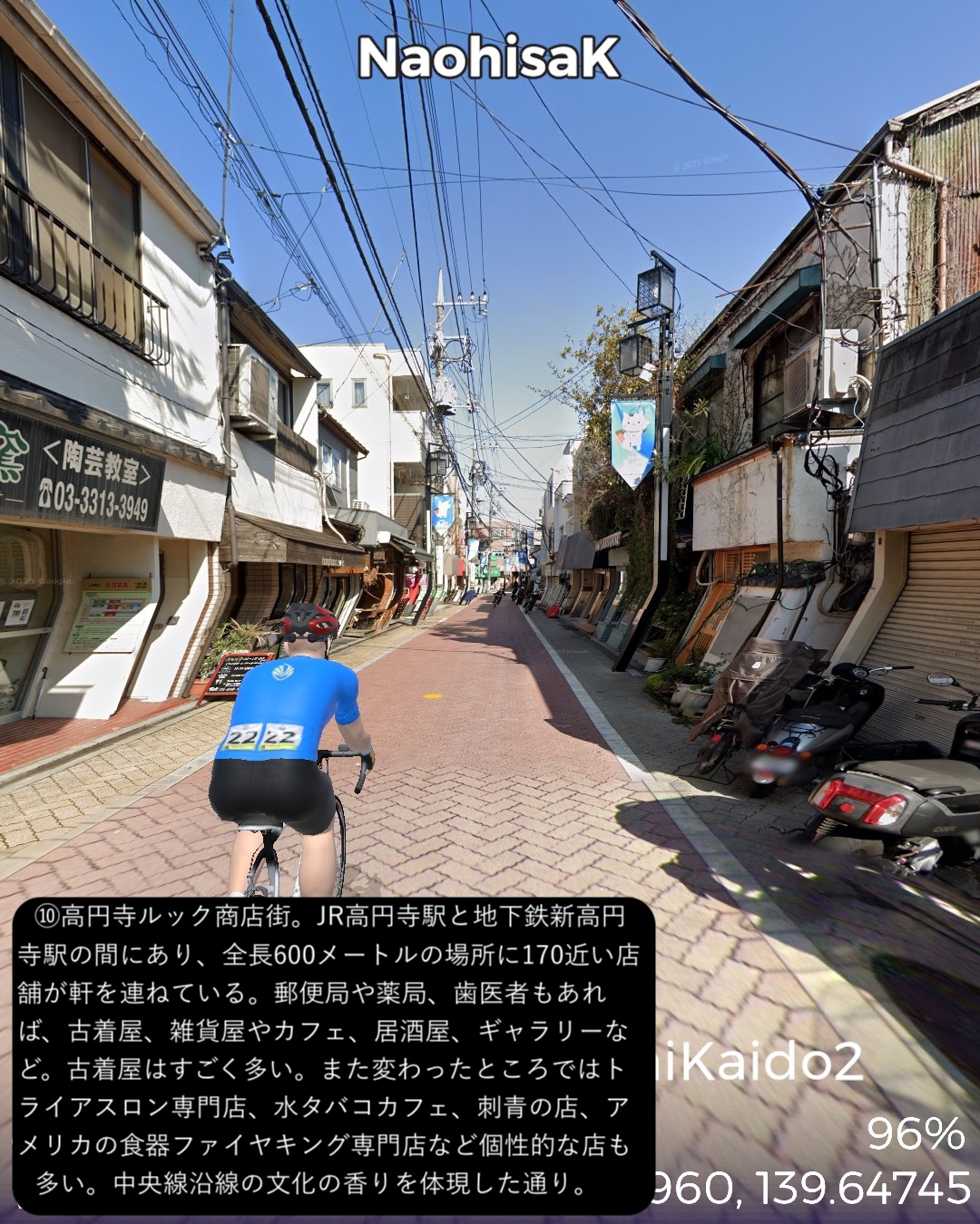 VRサイクリング 一応五日市街道沿い、寄り道が多いルートで結果的には中央線沿いのめぼしいロケーションをつまみ食いしながら移動だけ街道を使って都心手前の高円寺まで進むの巻。多摩の中心タウン立川の立川駅北口をスタートし、まずは中央線沿いに隣町国立へ。国立をぐるっと巡ってから五日市街道へ戻り東へ。玉川上水沿いの道を進み小金井公園では中へ入り江戸東京たてもの園までちら見してまた街道へ。吉祥寺では井の頭公園にちょっと寄り道。さらに街道を進んで善福寺川ではちょっと川沿いの善福寺緑地と和田堀公園を通って五日市街道の終点新高円寺駅付近の青梅街道との接点まで到達した後、高円寺ルック商店街を通って高円寺駅をゴールとする41kmの行程。国立は20代後半の頃毎週のように仲間と集まっていた青春の1ページを飾る町。桜並木が続きどん詰まりに三角屋根の国立駅が見える広い大学通りの景観が好きだった。五日市街道は狭めの道だし渋滞しているイメージがあるので、馴染みの道ではあったが車で通して走ることはなかった。小金井公園付近の玉川上水沿いは緑が濃くて癒される道筋で気に入っていた。吉祥寺と井の頭公園は私の中ではカップリングされていて吉祥寺という町があるから井の頭公園はいい公園だし、井の頭公園があるから吉祥寺はいい町なのだ。ホントは住みたいぐらいの場所だが意外と縁が薄かった。練馬からは距離は近いけどちょっと不便だしね。ゴールとした高円寺も吉祥寺と同様中央線沿線特有の文化の香りがして好きだなあ。もっとここら辺頻繁に通いたい街なんだけど、車で行くところじゃないし、電車では不便だし。リアルの自転車で行くのが良さそうだけど今のところ手頃に乗れる自転車がないし。ということで好きな沿線だけどそこそこの馴染み具合の中央線沿線もとい五日市街道沿いを都心間近の高円寺までアプローチしたところで、次回は特別番外編で久々の里帰りで我がまち練馬を練り歩いてみよう。