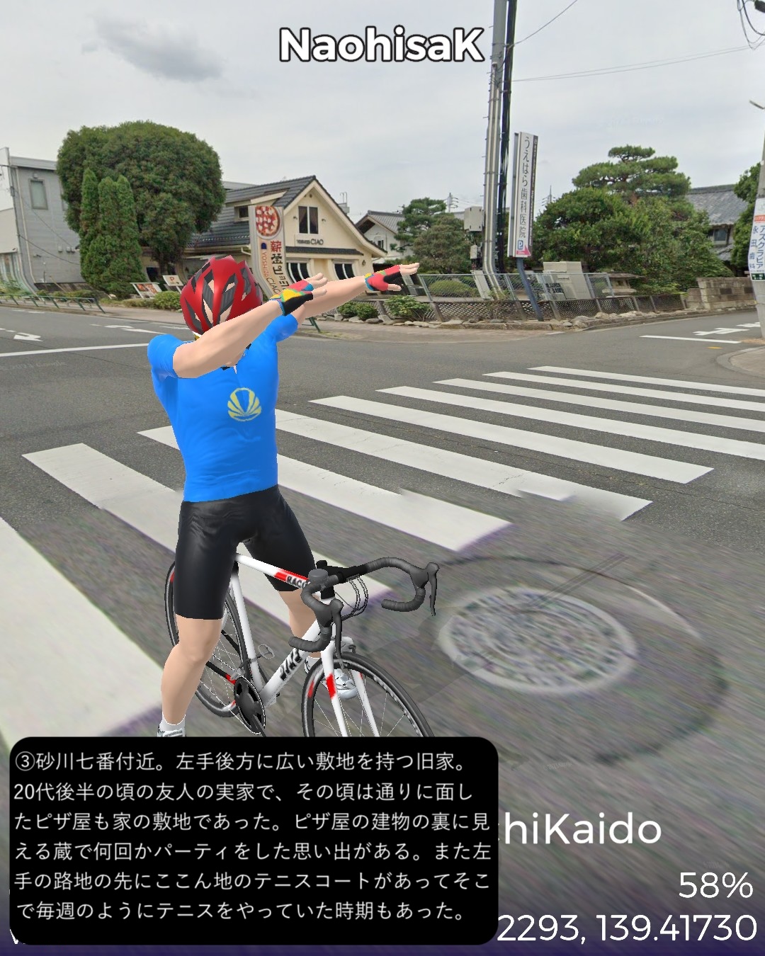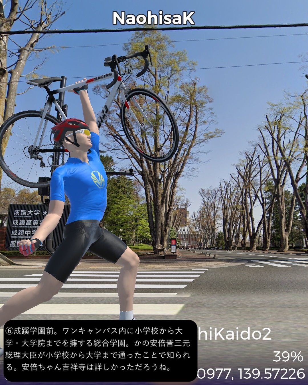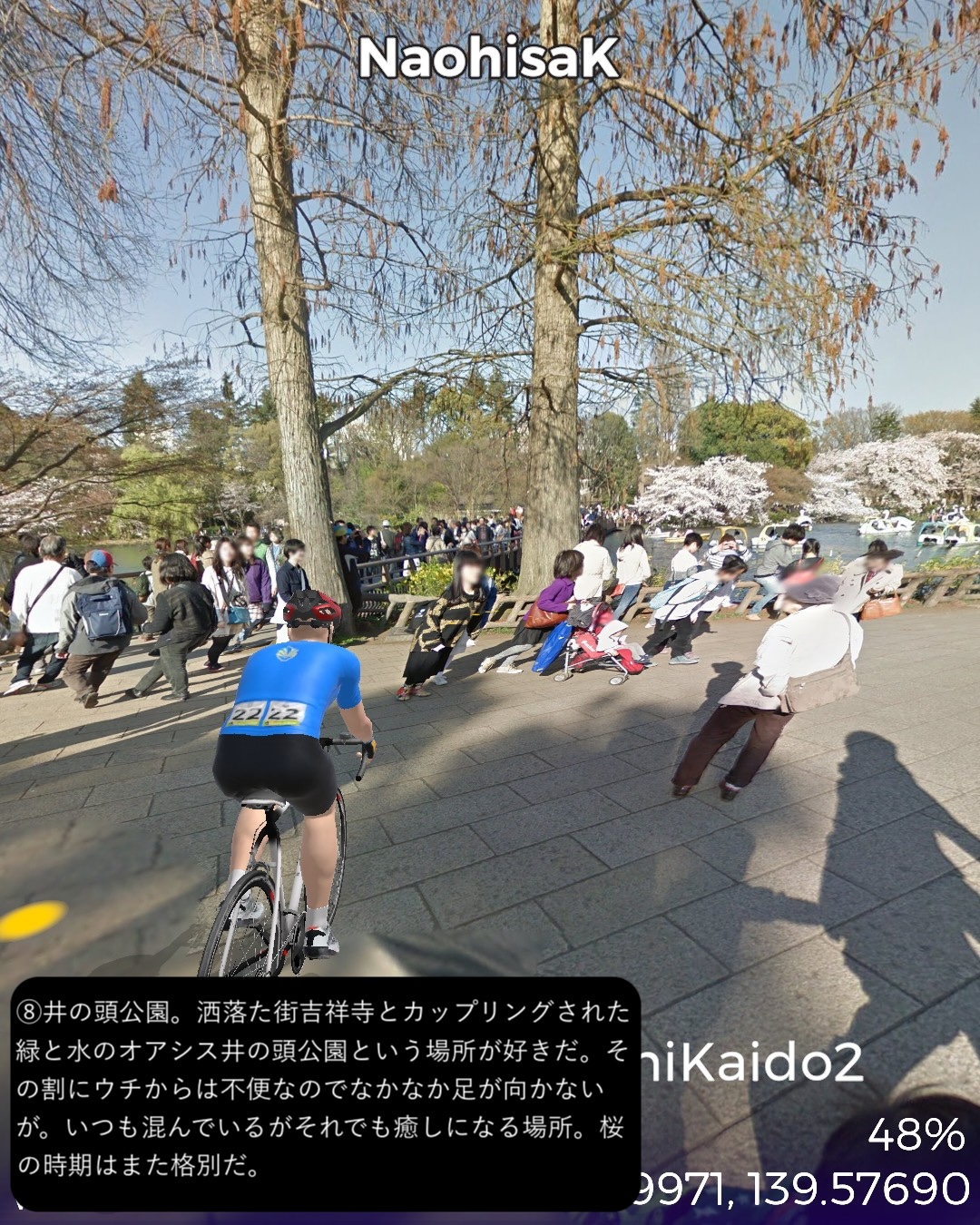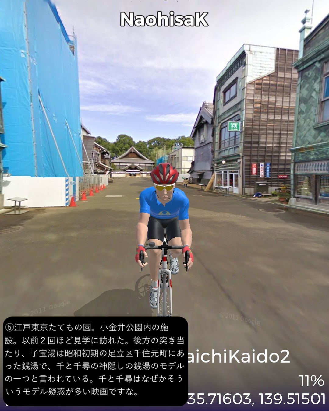 VRサイクリング 一応五日市街道沿い、寄り道が多いルートで結果的には中央線沿いのめぼしいロケーションをつまみ食いしながら移動だけ街道を使って都心手前の高円寺まで進むの巻。多摩の中心タウン立川の立川駅北口をスタートし、まずは中央線沿いに隣町国立へ。国立をぐるっと巡ってから五日市街道へ戻り東へ。玉川上水沿いの道を進み小金井公園では中へ入り江戸東京たてもの園までちら見してまた街道へ。吉祥寺では井の頭公園にちょっと寄り道。さらに街道を進んで善福寺川ではちょっと川沿いの善福寺緑地と和田堀公園を通って五日市街道の終点新高円寺駅付近の青梅街道との接点まで到達した後、高円寺ルック商店街を通って高円寺駅をゴールとする41kmの行程。国立は20代後半の頃毎週のように仲間と集まっていた青春の1ページを飾る町。桜並木が続きどん詰まりに三角屋根の国立駅が見える広い大学通りの景観が好きだった。五日市街道は狭めの道だし渋滞しているイメージがあるので、馴染みの道ではあったが車で通して走ることはなかった。小金井公園付近の玉川上水沿いは緑が濃くて癒される道筋で気に入っていた。吉祥寺と井の頭公園は私の中ではカップリングされていて吉祥寺という町があるから井の頭公園はいい公園だし、井の頭公園があるから吉祥寺はいい町なのだ。ホントは住みたいぐらいの場所だが意外と縁が薄かった。練馬からは距離は近いけどちょっと不便だしね。ゴールとした高円寺も吉祥寺と同様中央線沿線特有の文化の香りがして好きだなあ。もっとここら辺頻繁に通いたい街なんだけど、車で行くところじゃないし、電車では不便だし。リアルの自転車で行くのが良さそうだけど今のところ手頃に乗れる自転車がないし。ということで好きな沿線だけどそこそこの馴染み具合の中央線沿線もとい五日市街道沿いを都心間近の高円寺までアプローチしたところで、次回は特別番外編で久々の里帰りで我がまち練馬を練り歩いてみよう。