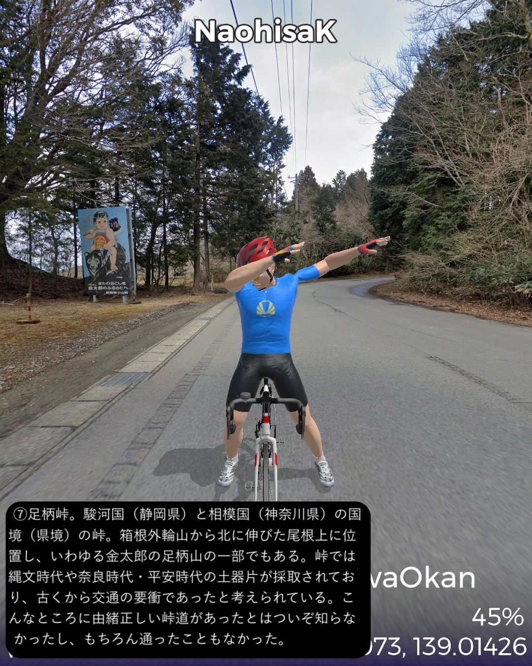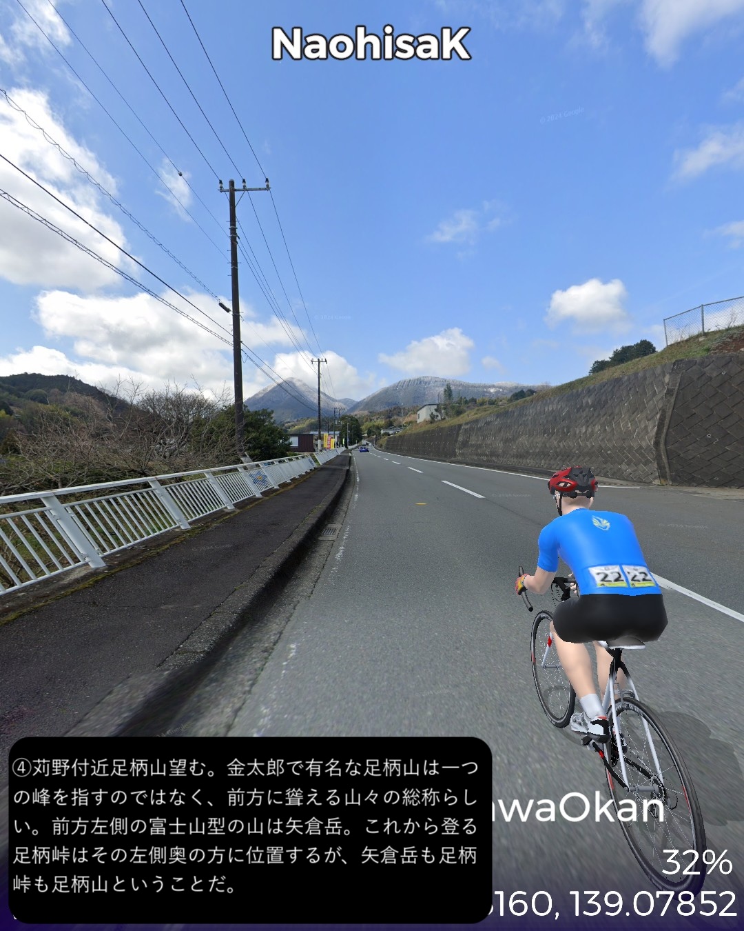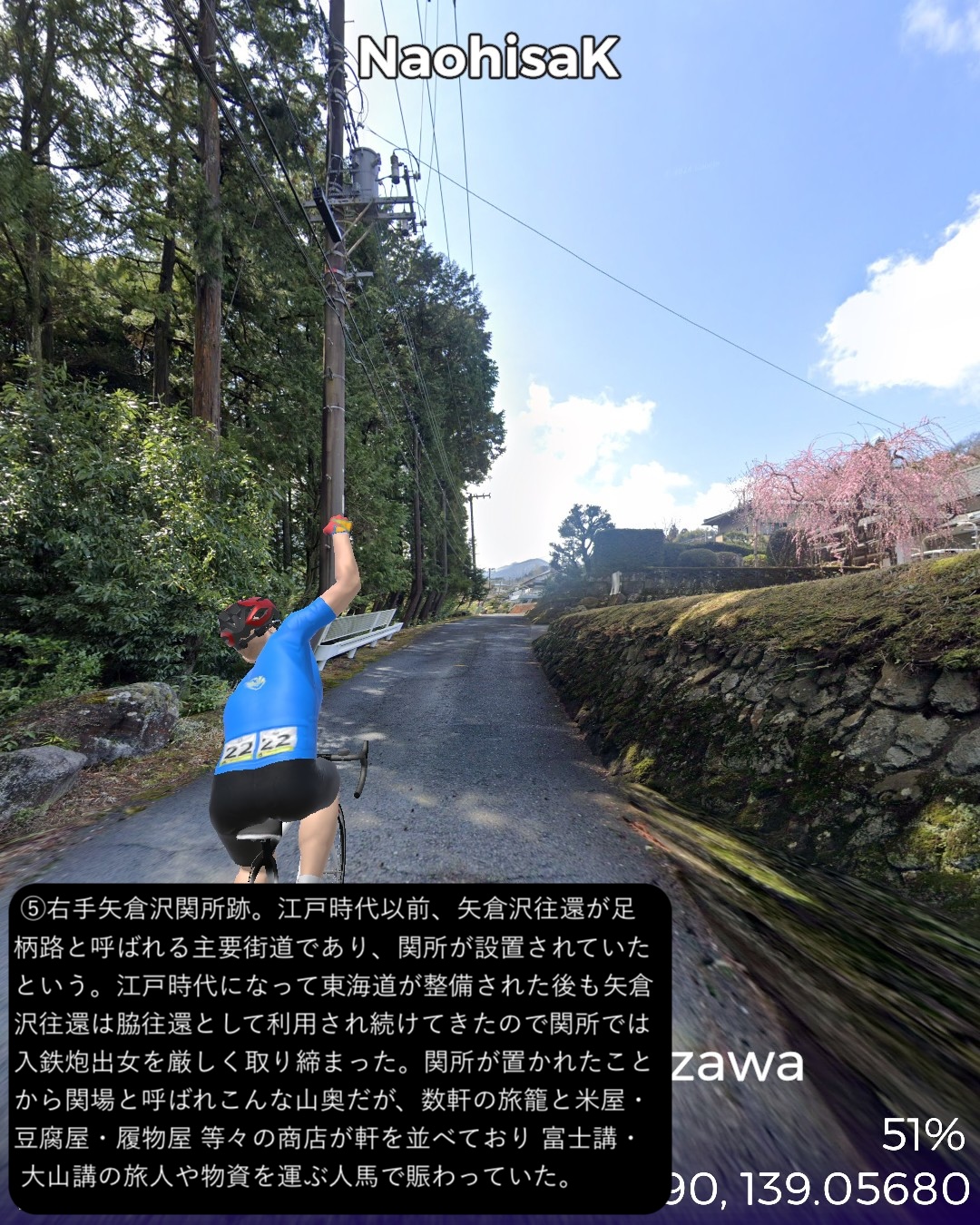 VRサイクリング 矢倉沢往還2日目。相模国から一気に裏箱根の足柄峠を越えて駿河国へ入るの巻。丹沢山麓の大きな町秦野を出発し、ほぼ小田急線に沿って渋沢、松田と進む。その先酒匂川を越えた後南足柄で名刹大雄山最乗寺の麓に立つ仁王門まで寄ってから西へ足柄峠への登りに入ってゆく。関所のあった矢倉沢を過ぎると道は険しくなり登り詰めて足柄峠。そこから目の前に大きな富士山を望みつつ下ると足柄、そして針路を次第に南に変えながら御殿場を過ぎて、右手に愛鷹山後方に富士山を望みつつ平野を進み、裾野付近から街道を外れて三島へ向かい、東海道沿道の三嶋大社をゴールとする67kmの行程。今回のハイライトは南足柄から足柄峠にかけての街道筋。酒匂川を越えたあたりから富士山を隠すように箱根の外輪山を形成する結構高い山々の連なりが前方を覆ってくる。この山中に分け入ってゆくルートになる。この辺今まで全く通ったこともなければ、そんな道筋があることも知らなかった。その地域がどのような風土、史跡があるかも知らなかった、という地域であるがなかなか渋いインパクトがあった。一つは一応ウチの宗派である曹洞宗で福井県の永平寺、鶴見の総持寺に次ぐ格式を有する名刹という大雄山最乗寺というお寺が、山の奥にあった。その仁王門まで行ってみたわけだが霊場としての荘厳さが見てとれた。そういう立派なお寺の存在すら知らなかった。二つ目は足柄山の金太郎。足柄山とは通過した足柄峠を含むこの辺の箱根外輪山を指すことも知ったが、金太郎は寓話ではなく実在の人物で、源氏の始祖とされる源頼光が足柄峠を通りかかった時にリクルートした怪童で頼光の四天王の一人となった坂田公時がモデルとされることを知った。そして峠道の山中に金太郎の生家跡や動物と戯れた金太郎の遊び石なる史跡が残されているのだ。そして現代では忘れ去られて私も存在すら知らなかったこの足柄峠の峠道を含む矢倉沢往還が実は古代から江戸時代に東海道が整備されるまで都と東国を結ぶメインルートであったらしいことは驚きだ。だから金太郎伝説は生まれたわけだし、最乗寺も建立されたのだろう。さて三島まで来たところでこれからはしばらく伊豆を周遊する旅に出る。