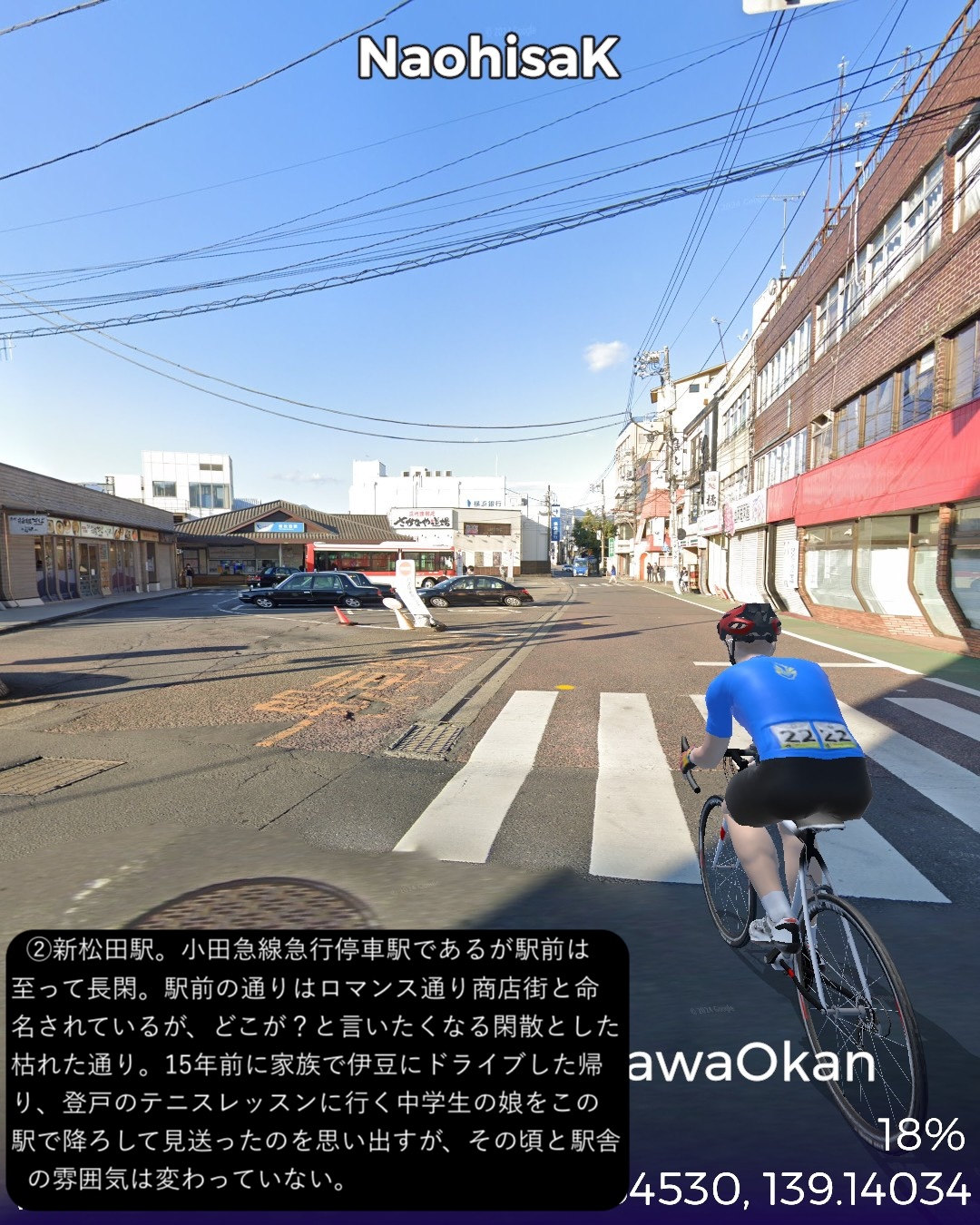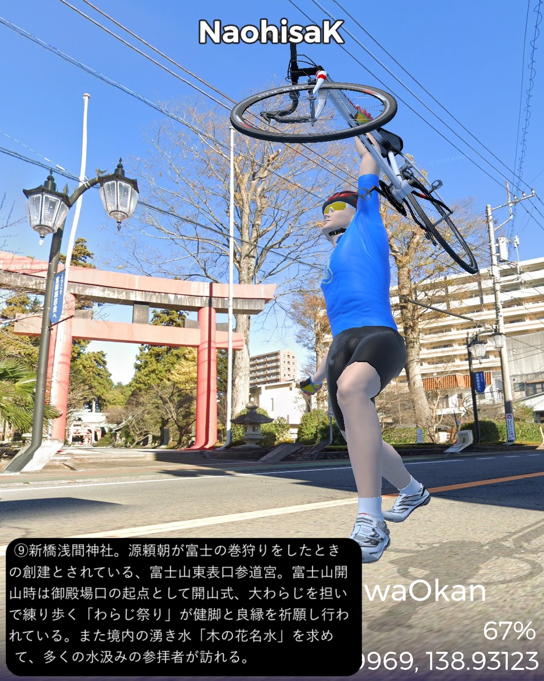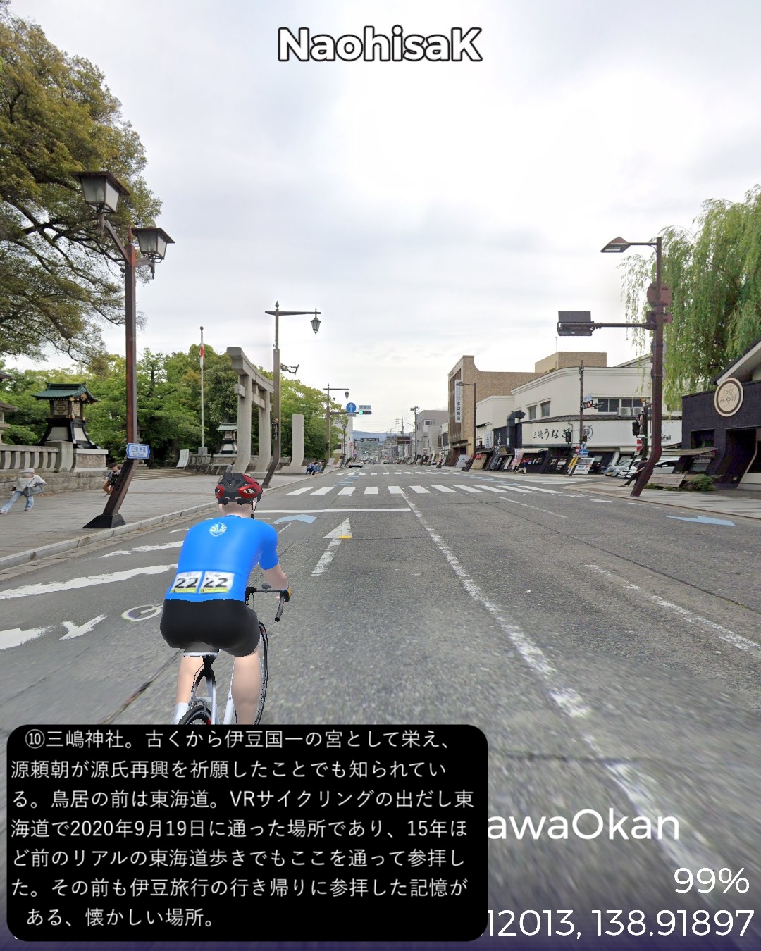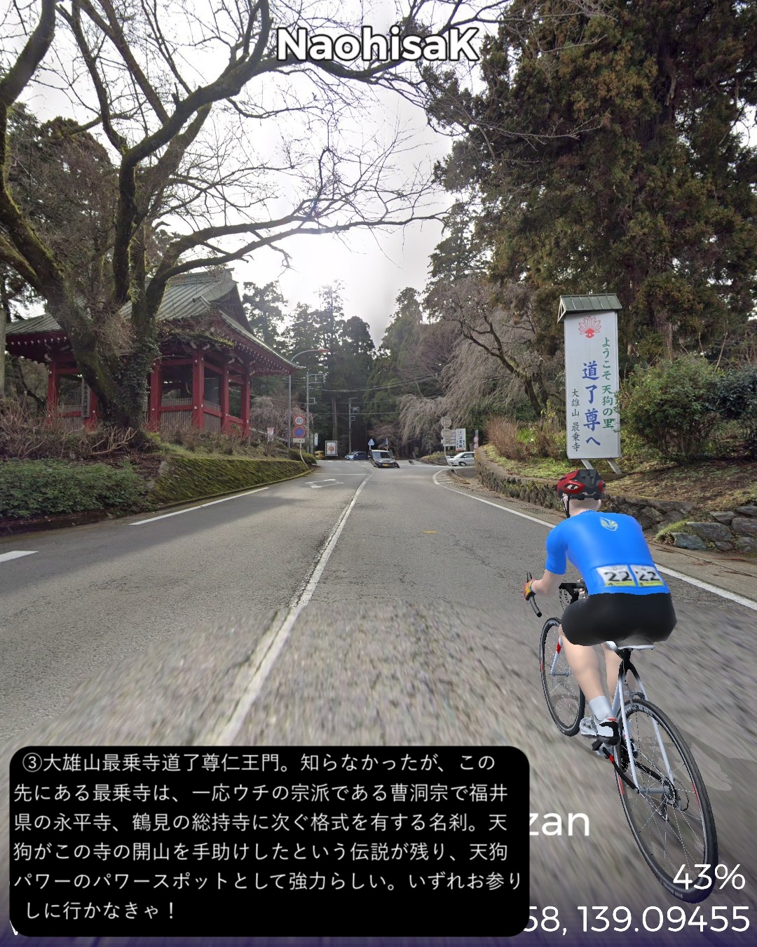 VRサイクリング 矢倉沢往還2日目。相模国から一気に裏箱根の足柄峠を越えて駿河国へ入るの巻。丹沢山麓の大きな町秦野を出発し、ほぼ小田急線に沿って渋沢、松田と進む。その先酒匂川を越えた後南足柄で名刹大雄山最乗寺の麓に立つ仁王門まで寄ってから西へ足柄峠への登りに入ってゆく。関所のあった矢倉沢を過ぎると道は険しくなり登り詰めて足柄峠。そこから目の前に大きな富士山を望みつつ下ると足柄、そして針路を次第に南に変えながら御殿場を過ぎて、右手に愛鷹山後方に富士山を望みつつ平野を進み、裾野付近から街道を外れて三島へ向かい、東海道沿道の三嶋大社をゴールとする67kmの行程。今回のハイライトは南足柄から足柄峠にかけての街道筋。酒匂川を越えたあたりから富士山を隠すように箱根の外輪山を形成する結構高い山々の連なりが前方を覆ってくる。この山中に分け入ってゆくルートになる。この辺今まで全く通ったこともなければ、そんな道筋があることも知らなかった。その地域がどのような風土、史跡があるかも知らなかった、という地域であるがなかなか渋いインパクトがあった。一つは一応ウチの宗派である曹洞宗で福井県の永平寺、鶴見の総持寺に次ぐ格式を有する名刹という大雄山最乗寺というお寺が、山の奥にあった。その仁王門まで行ってみたわけだが霊場としての荘厳さが見てとれた。そういう立派なお寺の存在すら知らなかった。二つ目は足柄山の金太郎。足柄山とは通過した足柄峠を含むこの辺の箱根外輪山を指すことも知ったが、金太郎は寓話ではなく実在の人物で、源氏の始祖とされる源頼光が足柄峠を通りかかった時にリクルートした怪童で頼光の四天王の一人となった坂田公時がモデルとされることを知った。そして峠道の山中に金太郎の生家跡や動物と戯れた金太郎の遊び石なる史跡が残されているのだ。そして現代では忘れ去られて私も存在すら知らなかったこの足柄峠の峠道を含む矢倉沢往還が実は古代から江戸時代に東海道が整備されるまで都と東国を結ぶメインルートであったらしいことは驚きだ。だから金太郎伝説は生まれたわけだし、最乗寺も建立されたのだろう。さて三島まで来たところでこれからはしばらく伊豆を周遊する旅に出る。