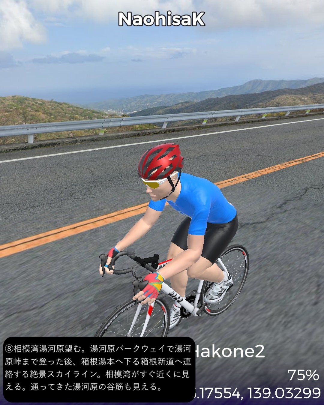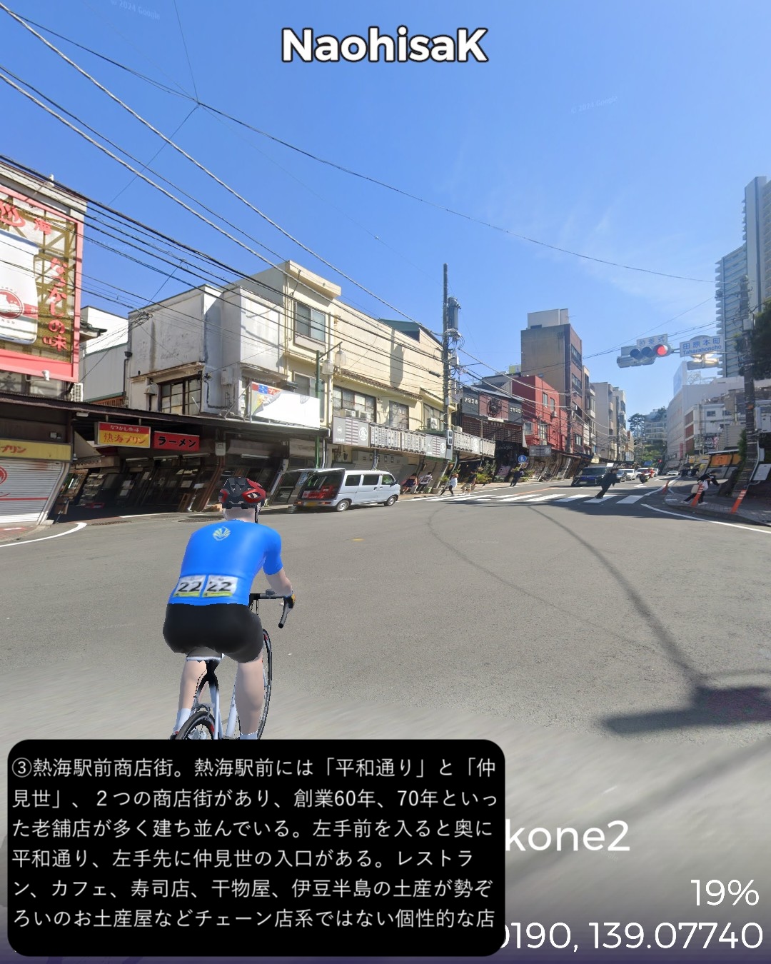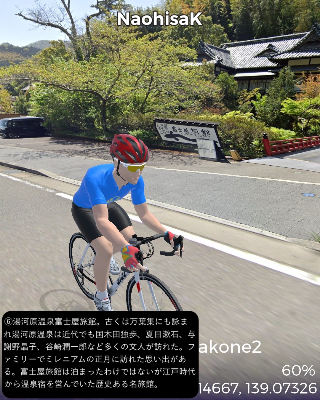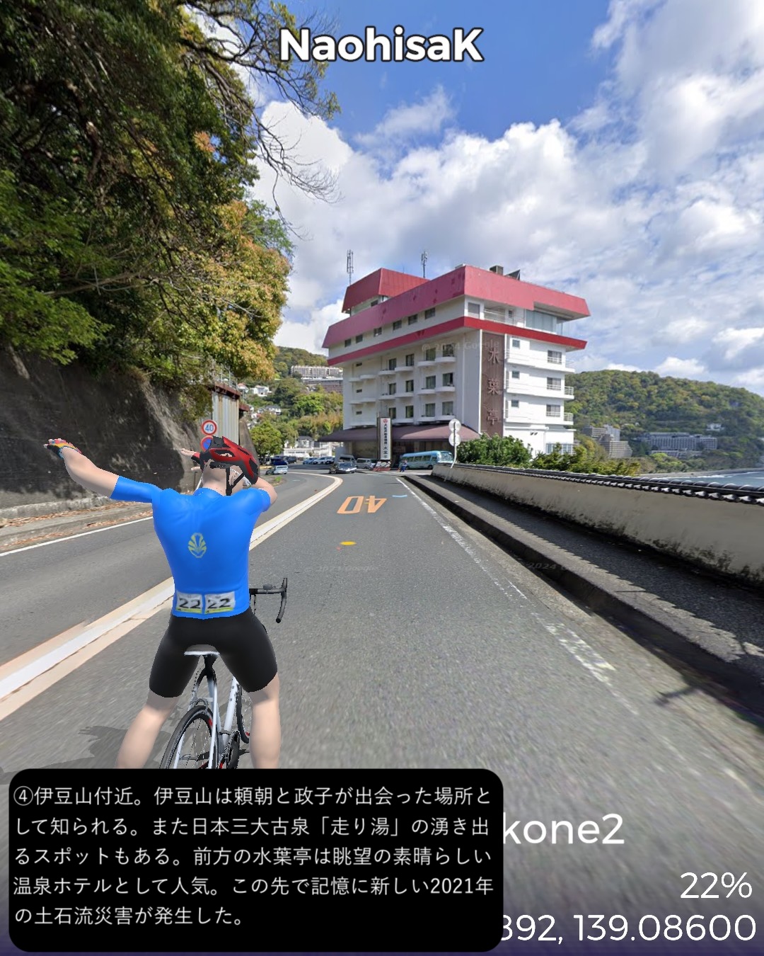 VRサイクリング 伊豆東海岸北部から箱根へ向かう。干物の町網代を出発ししばらく海岸線を北上するとまもなく天下の一大温泉地熱海へ着く。市街の名所をぐるっと一巡りした後さらに海岸沿いに東へ進み湯河原海岸を通りすぎて真鶴半島をぐるっと一周。そのまま若干戻って湯河原温泉街を山へ向かって進み湯河原パークウェイで箱根外輪山に登り箱根新道で下って箱根湯本へ至る。箱根湯本は滝通りへ入って少し行ったところをゴールとする66kmの行程。今回は温泉三昧!あくまでVRで通り過ぎるだけだけど。熱海、湯河原、箱根湯本。どこをとっても日本でも指折りの温泉地。今まで幾度となく訪れたところばかり。そういう意味では前回以上に馴染みのルート。と言いつつ今まで気づかなかった新たな魅力を感じたところもあった。熱海はレトロな商店街がパワーアップした感がある。それからリニューアルしたホテルニューアカオには熱海の進化した新たなリゾートの風が感じられた。真鶴はいつも通り抜けるだけの場所だったが、こじんまりした半島の箱庭ぽさが愛おしく感じられた。湯河原温泉の奥の山奥の渓流そいに展開する奥湯河原温泉は、洗練された情緒溢れる宿が多い。箱根湯本もいつも駅前付近で終始してしまうが、橋を渡って滝通りの方へ進むとしっぽりした温泉場情緒に溢れていた。次回は箱根をじっくり巡ってこちらも新たな魅力を見つけてみたい。
