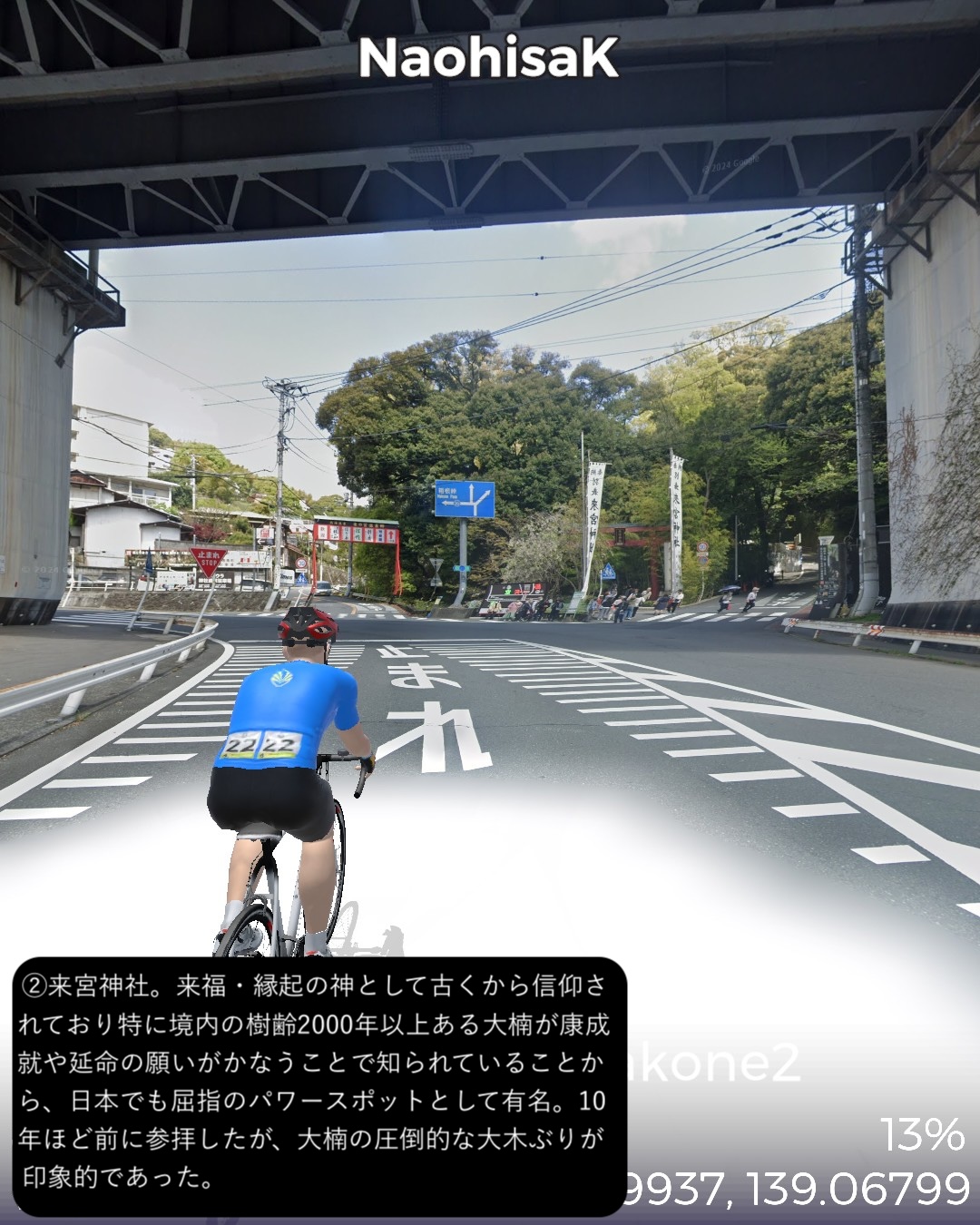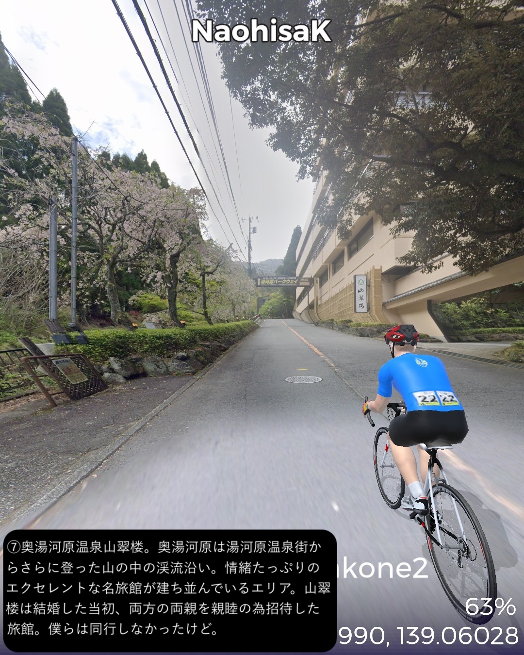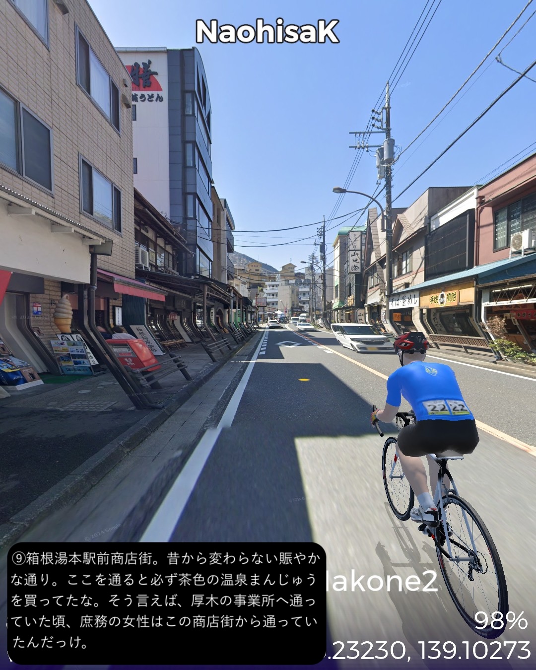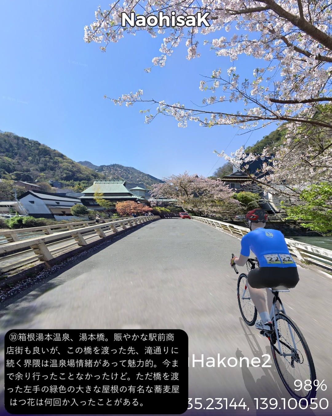 VRサイクリング 伊豆東海岸北部から箱根へ向かう。干物の町網代を出発ししばらく海岸線を北上するとまもなく天下の一大温泉地熱海へ着く。市街の名所をぐるっと一巡りした後さらに海岸沿いに東へ進み湯河原海岸を通りすぎて真鶴半島をぐるっと一周。そのまま若干戻って湯河原温泉街を山へ向かって進み湯河原パークウェイで箱根外輪山に登り箱根新道で下って箱根湯本へ至る。箱根湯本は滝通りへ入って少し行ったところをゴールとする66kmの行程。今回は温泉三昧!あくまでVRで通り過ぎるだけだけど。熱海、湯河原、箱根湯本。どこをとっても日本でも指折りの温泉地。今まで幾度となく訪れたところばかり。そういう意味では前回以上に馴染みのルート。と言いつつ今まで気づかなかった新たな魅力を感じたところもあった。熱海はレトロな商店街がパワーアップした感がある。それからリニューアルしたホテルニューアカオには熱海の進化した新たなリゾートの風が感じられた。真鶴はいつも通り抜けるだけの場所だったが、こじんまりした半島の箱庭ぽさが愛おしく感じられた。湯河原温泉の奥の山奥の渓流そいに展開する奥湯河原温泉は、洗練された情緒溢れる宿が多い。箱根湯本もいつも駅前付近で終始してしまうが、橋を渡って滝通りの方へ進むとしっぽりした温泉場情緒に溢れていた。次回は箱根をじっくり巡ってこちらも新たな魅力を見つけてみたい。