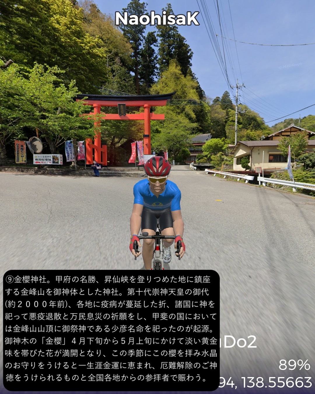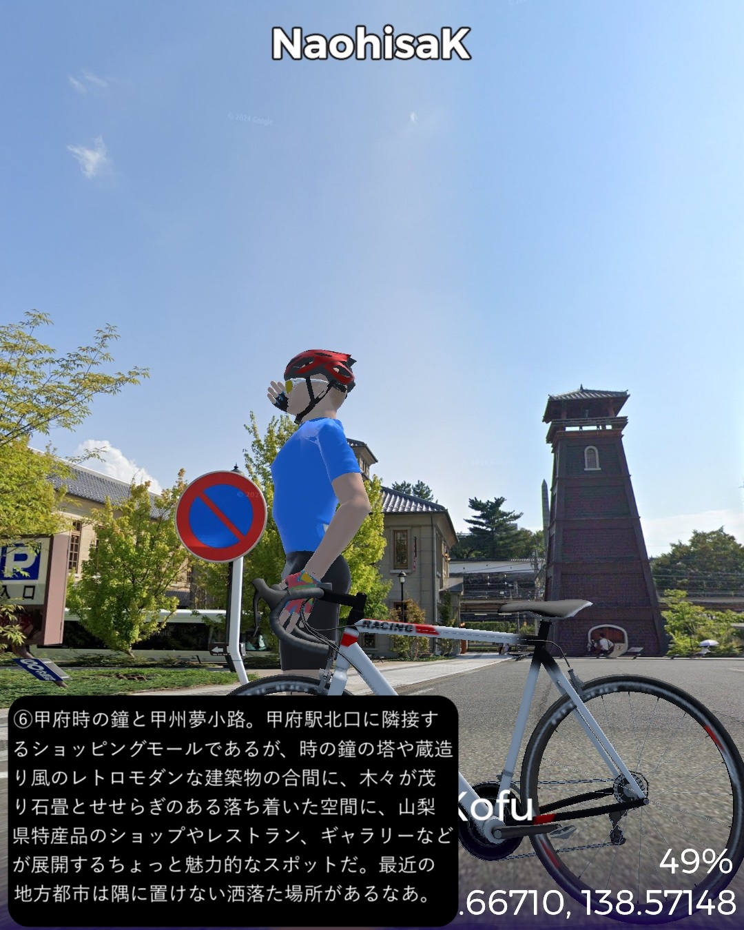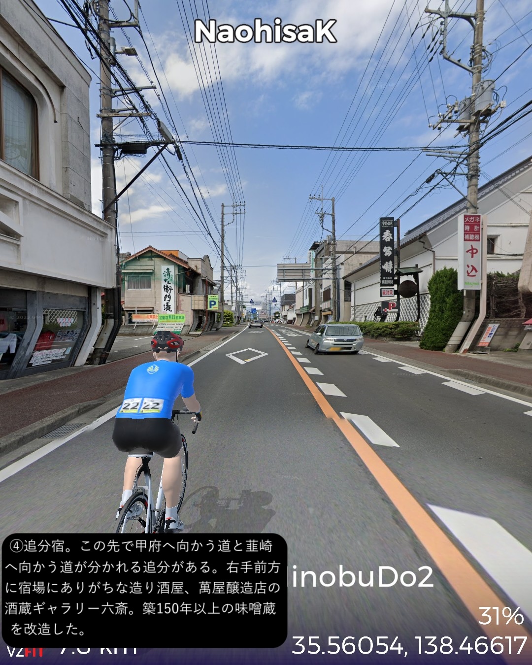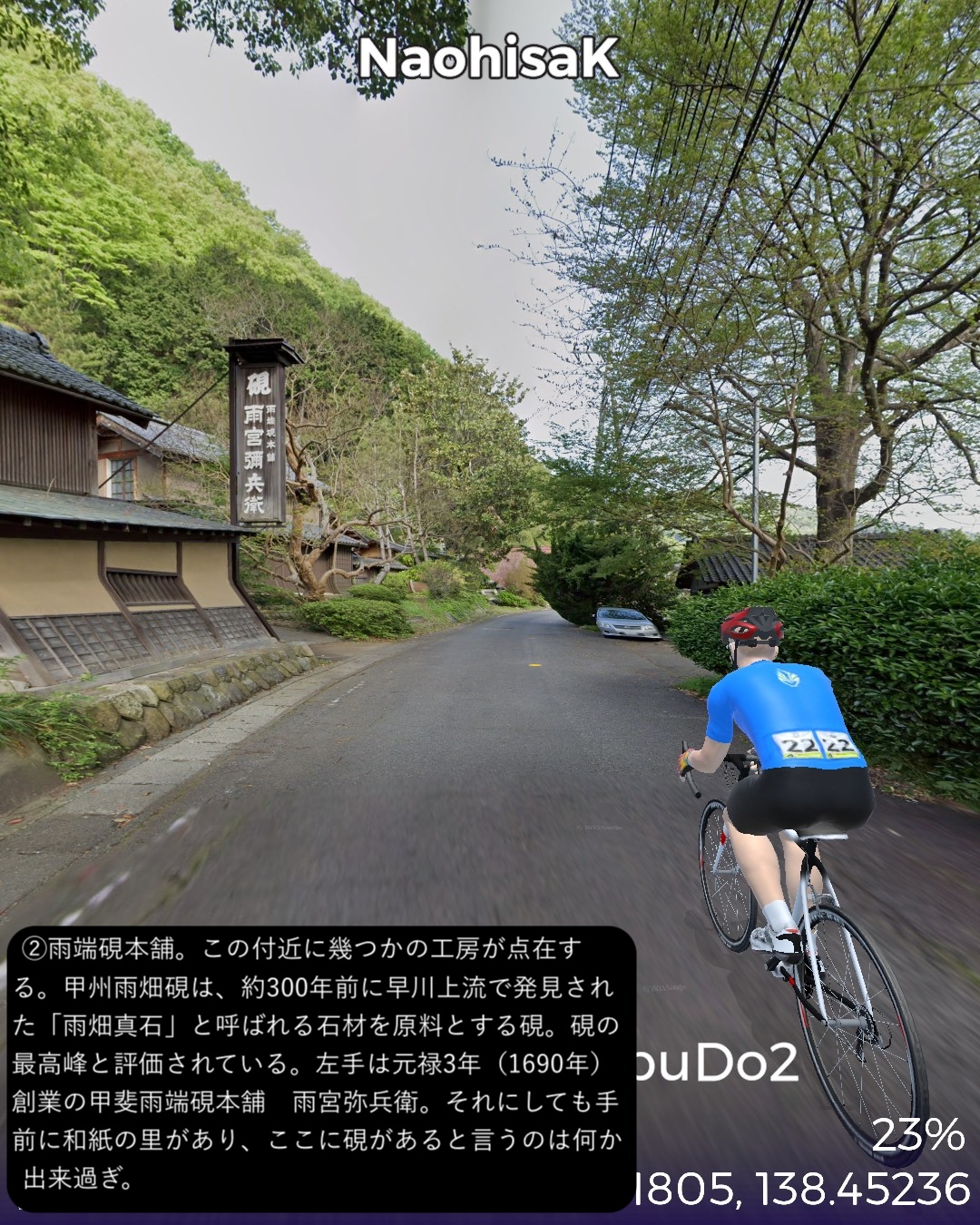 VRサイクリング 身延道 2日目。富士川沿いを遡って甲府周辺を巡る。前回ルートの途中、大工の町下山宿をスタートし身延道を先へ進む。しばらくは富士川沿いの狭い谷を遡る道。西嶋宿を過ぎ、甲府盆地が広がる扇状地に出たところに鰍沢宿。その先は盆地の開けた道を進みまもなく甲府市街へ入る。身延道の終点からさらに寄り道モードで甲府市街のスポット、甲府城址、甲府駅北口の甲州夢小路、市街の北のどん詰まり武田信玄の城跡に建つ武田神社、西へ向かって湯村温泉などを巡った後、山へ入り金櫻神社そして昇仙峡をゴールとする69kmの行程。身延道の後半、狭い谷間の集落西嶋宿は書道家に愛用される手漉き画仙紙で知られる西嶋和紙の産地、そのちょっと先のさらに寂しい集落は硯の最高峰とされる甲州雨畑硯の工房が集まる。出来過ぎな気もするがきっとこの辺は全国の書道家の憧れの地域なのだろう。上記扇状地とは考えてみると逆扇状地で富士川に吸い込まれる支流が集まる排水口のような扇状の土地なのであるが、そこに展開する鰍沢宿はレトロな商家が散見される結構いい感じの街並みであった。甲府は通り過ぎるだけの都市だったが、甲州夢小路や武田神社の付近、今度は通り過ぎないで寄ってみたい。そういう意味ではゴールの昇仙峡も二回ほど訪れた記憶があるもちょっと立ち寄っただけ感が合ってあまり印象に残ってないが、どうやらもっと散策路へ入ってゆかないと真価が見れなかったようだ。今度はじっくり訪れてみたい。