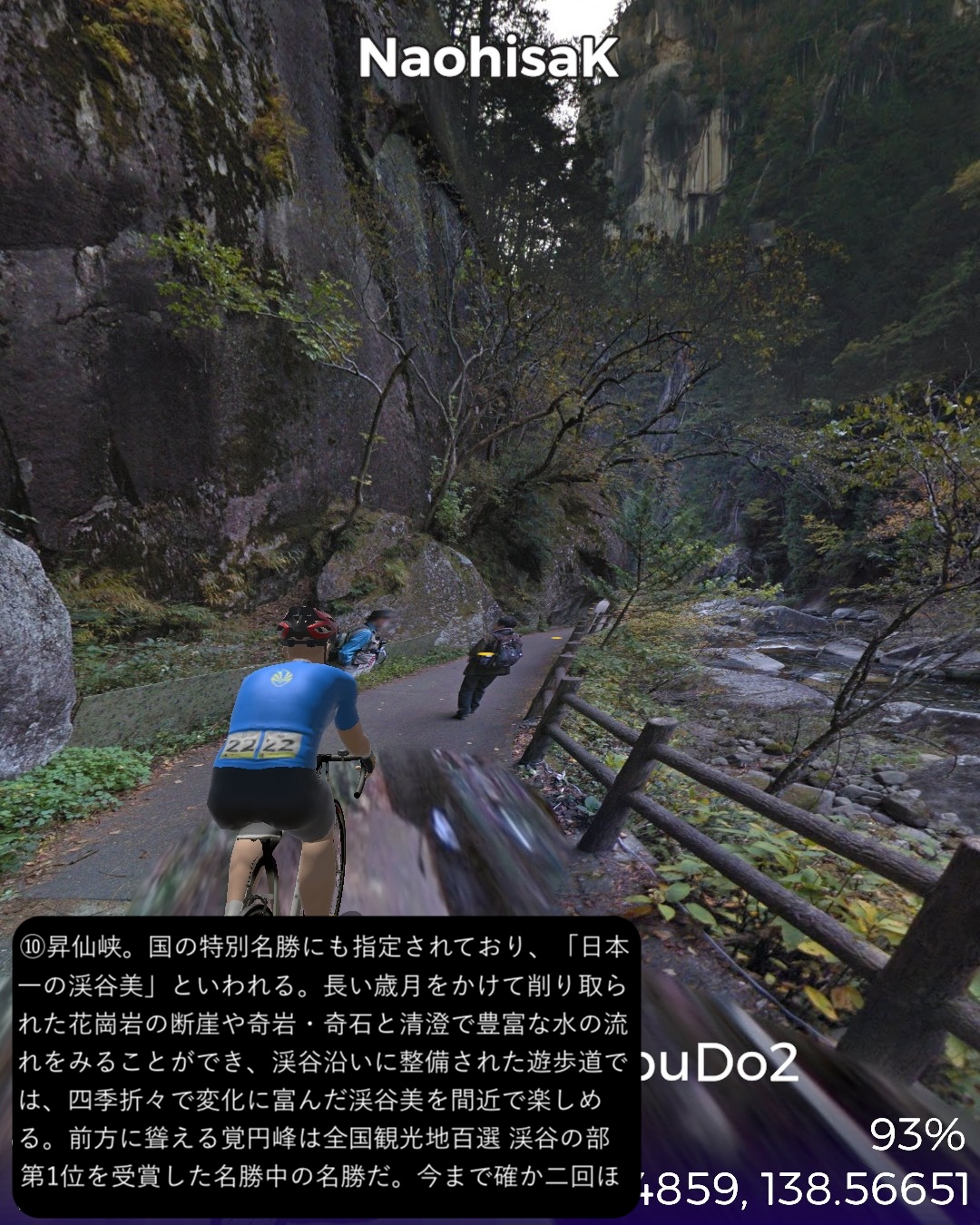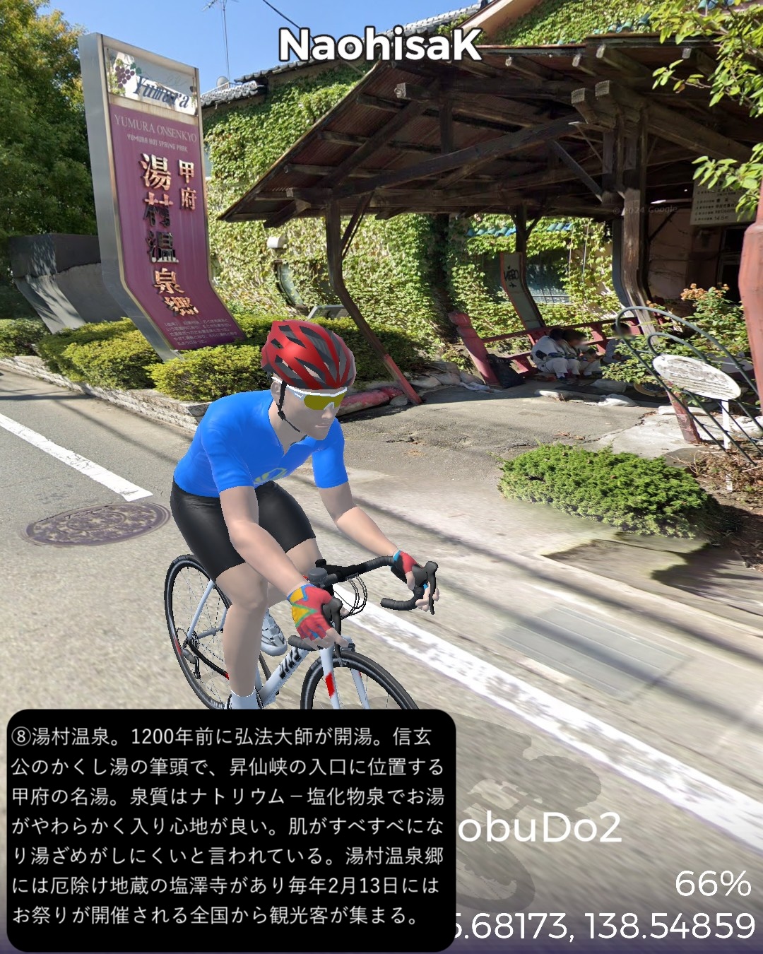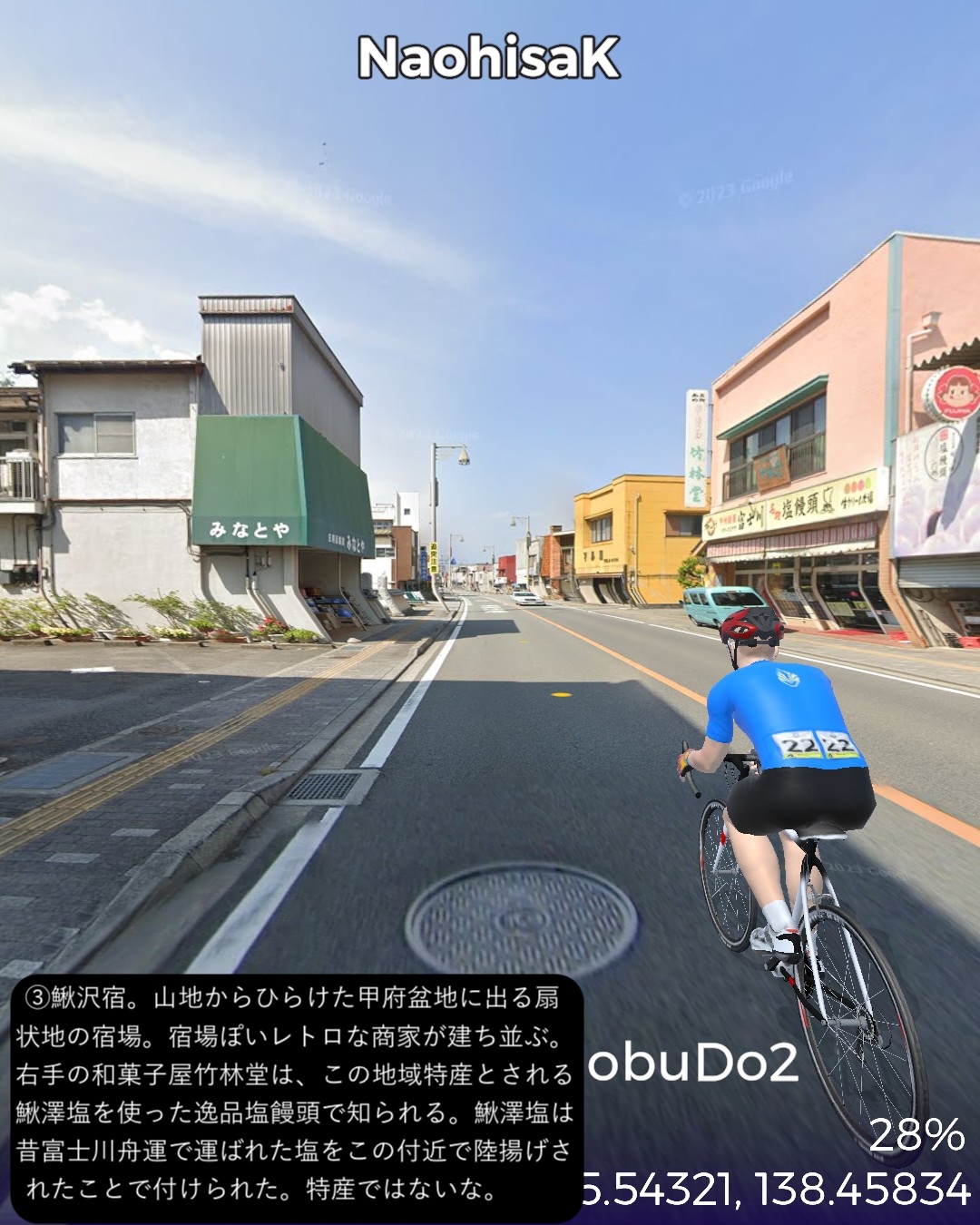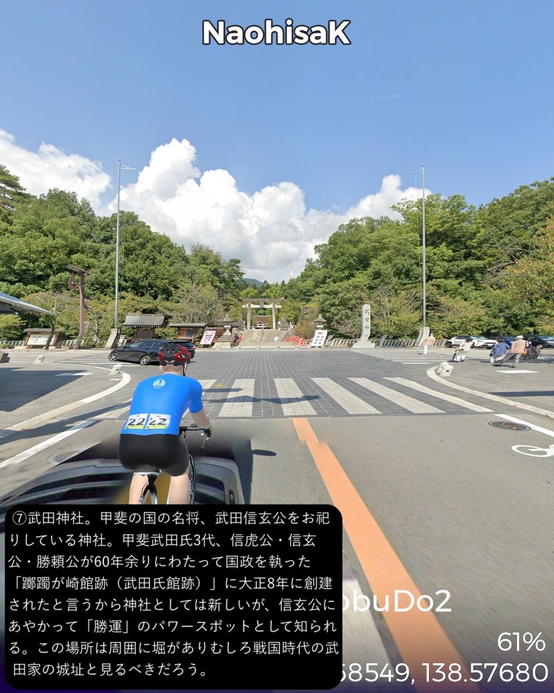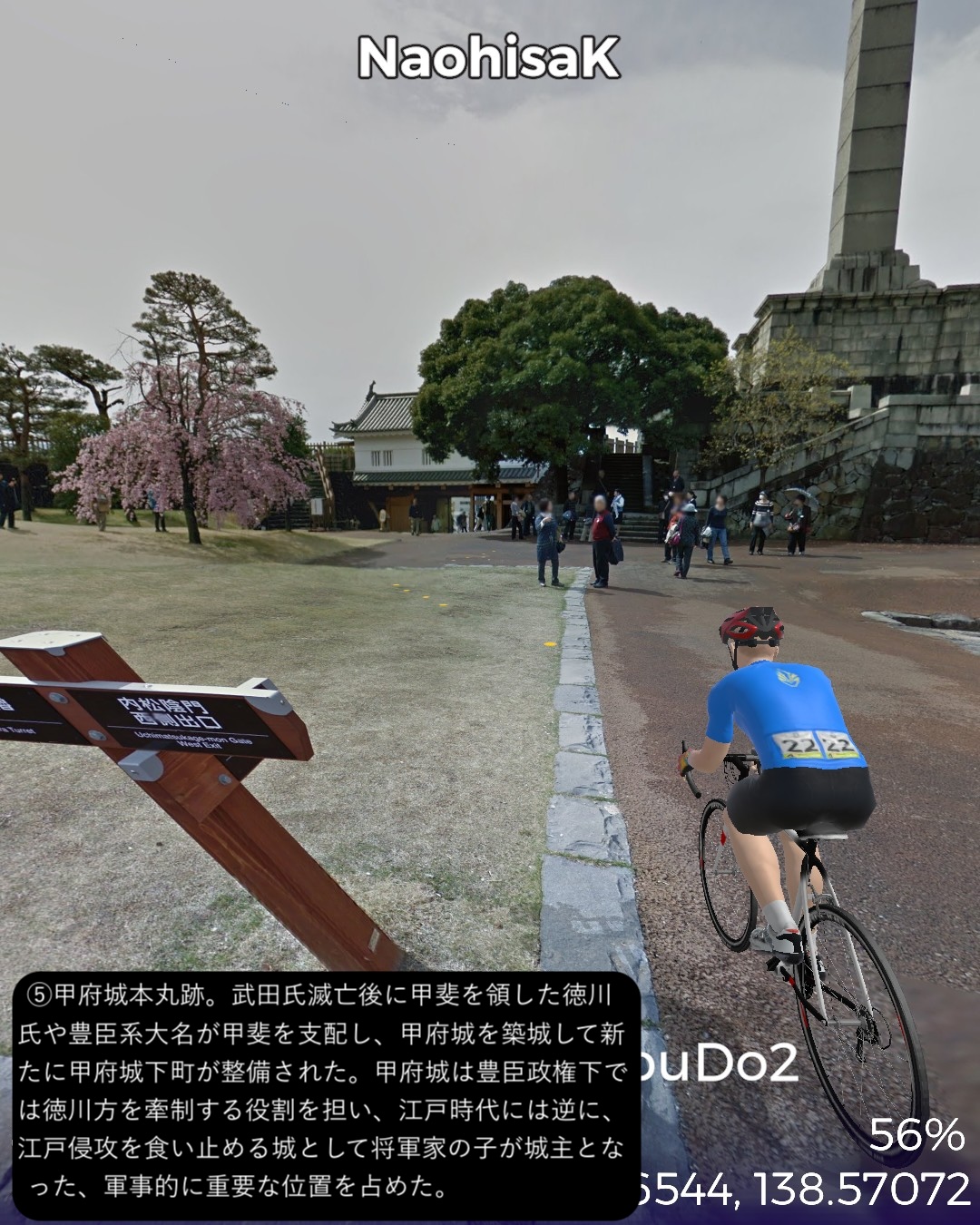 VRサイクリング 身延道 2日目。富士川沿いを遡って甲府周辺を巡る。前回ルートの途中、大工の町下山宿をスタートし身延道を先へ進む。しばらくは富士川沿いの狭い谷を遡る道。西嶋宿を過ぎ、甲府盆地が広がる扇状地に出たところに鰍沢宿。その先は盆地の開けた道を進みまもなく甲府市街へ入る。身延道の終点からさらに寄り道モードで甲府市街のスポット、甲府城址、甲府駅北口の甲州夢小路、市街の北のどん詰まり武田信玄の城跡に建つ武田神社、西へ向かって湯村温泉などを巡った後、山へ入り金櫻神社そして昇仙峡をゴールとする69kmの行程。身延道の後半、狭い谷間の集落西嶋宿は書道家に愛用される手漉き画仙紙で知られる西嶋和紙の産地、そのちょっと先のさらに寂しい集落は硯の最高峰とされる甲州雨畑硯の工房が集まる。出来過ぎな気もするがきっとこの辺は全国の書道家の憧れの地域なのだろう。上記扇状地とは考えてみると逆扇状地で富士川に吸い込まれる支流が集まる排水口のような扇状の土地なのであるが、そこに展開する鰍沢宿はレトロな商家が散見される結構いい感じの街並みであった。甲府は通り過ぎるだけの都市だったが、甲州夢小路や武田神社の付近、今度は通り過ぎないで寄ってみたい。そういう意味ではゴールの昇仙峡も二回ほど訪れた記憶があるもちょっと立ち寄っただけ感が合ってあまり印象に残ってないが、どうやらもっと散策路へ入ってゆかないと真価が見れなかったようだ。今度はじっくり訪れてみたい。