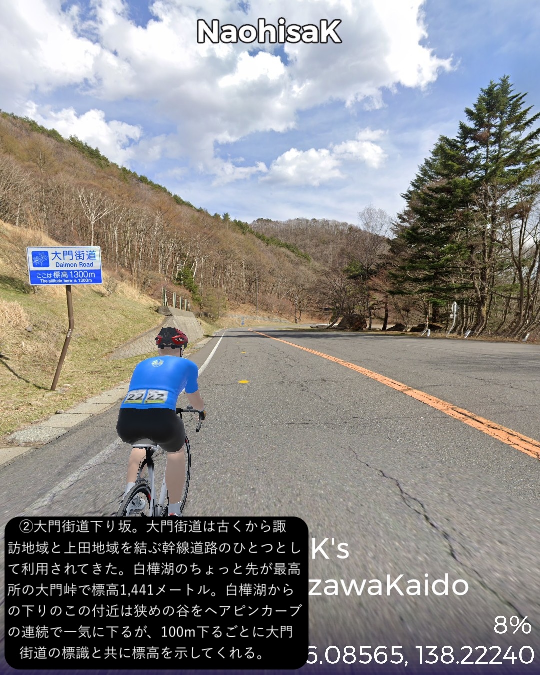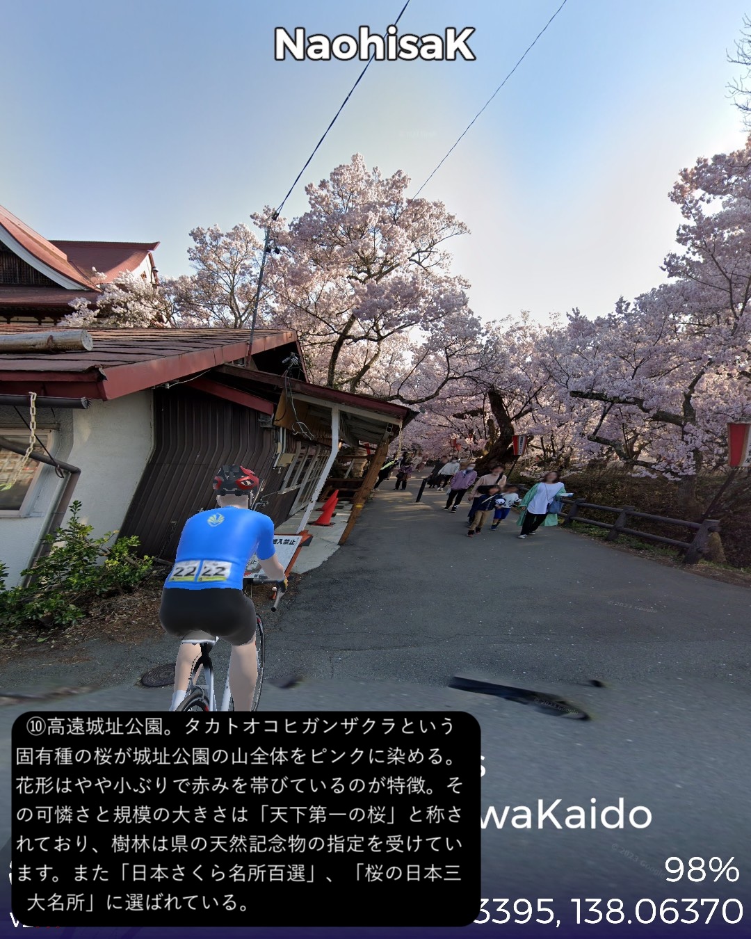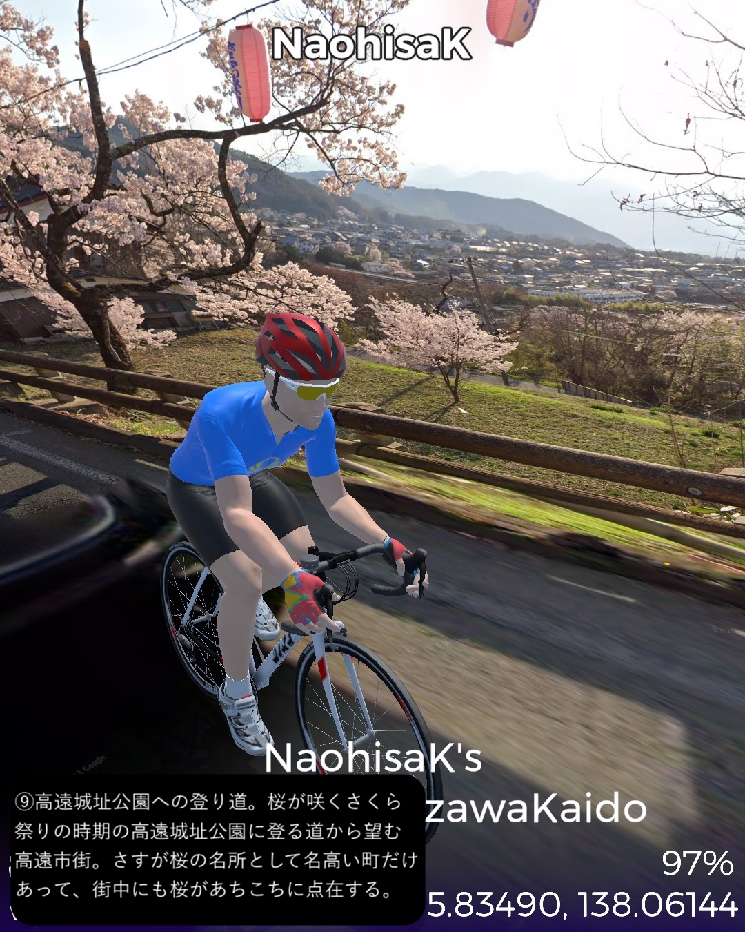 VRサイクリング 大門街道から金沢街道と街道を継いで南アルプスの西側の山懐を南下する。高原のリゾート地白樺湖をスタートし、ちょうど湖畔を通る大門街道を走って一気に山を下り中央線が通る茅野で金沢街道に乗り継ぐ。いきなりの街道の難所杖突峠を一気に登りその先は山桜の咲くのどかな山里の道を進んで桜の里として名高い高遠に辿り着く。町を一巡りし桜で有名な高遠城址公園を抜けた高遠湖の辺りをゴールとする52kmの行程。前半の大門街道は古くから上田地域と諏訪地域を結ぶ幹線道路の1つとして利用されてきた。今回走ったのはその最高所大門峠に近い白樺湖から甲州街道の茅野宿までの部分であるが特に印象に残るものはなかった。後半、茅野から高遠までの金沢街道はなかなか街道らしいいいルートだった。金沢街道は近世では諏訪地域と伊那地域を結ぶ主要道として利用されていたが、実は古代から近畿と東国を結ぶ主要街道であった東山道の一部でもあったようだ。最初の杖突峠の登りはその名が示す通りリアルのサイクリングや徒歩はかなり難儀する急坂で昔から難所として知られていた。峠を越えた後の高遠までの道筋は長閑な山里に山桜が彩りを添え、集落は蔵や切妻造りの伝統的な木造家屋が多く見られる旧街道らしい長閑で美しいルート。ところどころに高遠石工が残した大きな庚申塚が見られるのも特徴的だ。しかしやはり今回のハイライトは高遠の町。ストリートビューは惜しげなくベストシーズンの桜の満開時期を見せてくれて嬉しい限り。特に桜の日本三大名所の1つと言われる高遠城址公園の桜は圧巻。それだけでなく城址公園の高台から望む市街にもあちこちで桜が点在する眺望も素晴らしい。昔から行ってみたい場所なのだが、遠いのとベストシーズンに合わせるのが難しくて叶わない憧れの場所。山のあなたの空遠く・・・高遠という地名にそんな行きたくても行けない理想郷のような響きを感じるのだ。