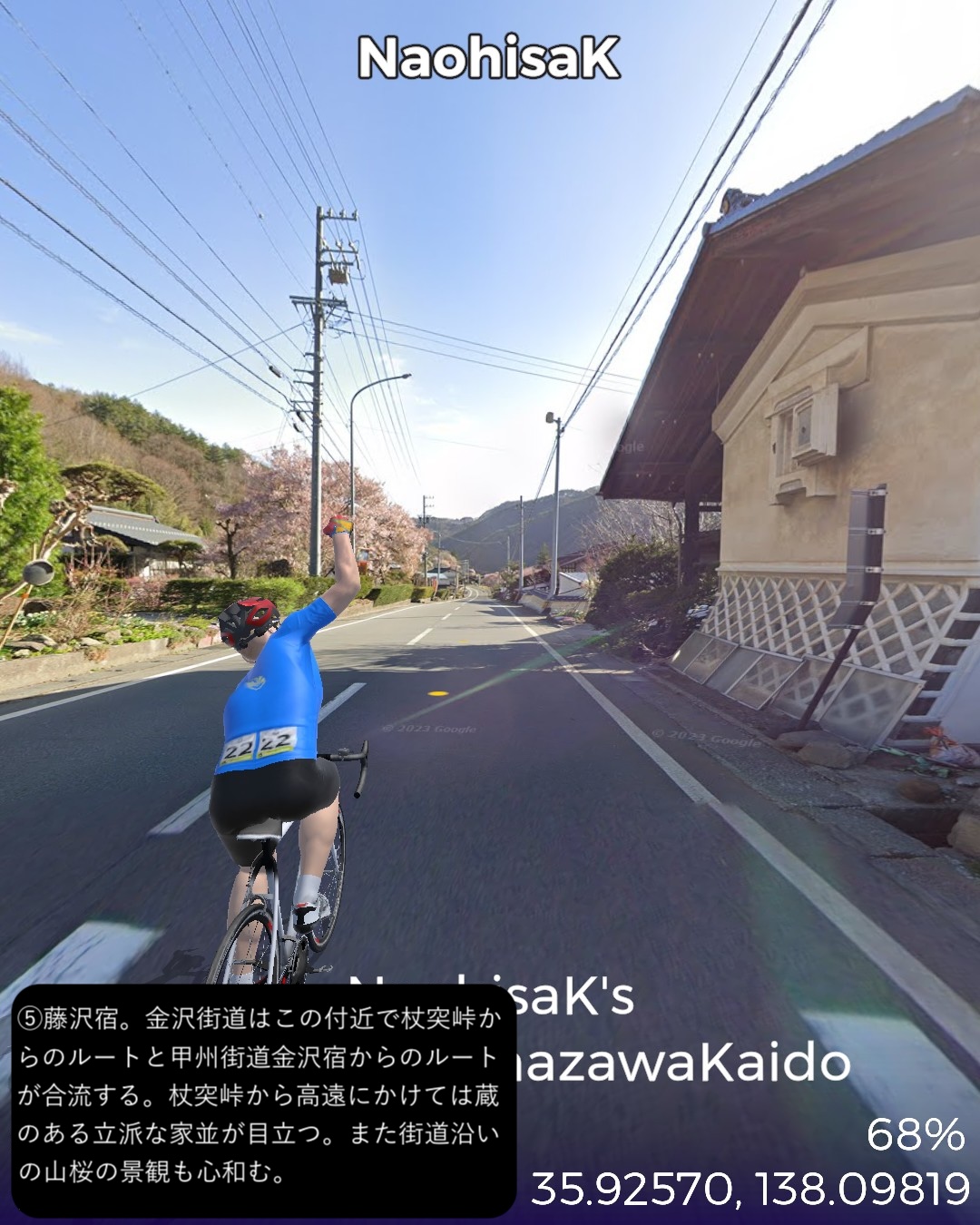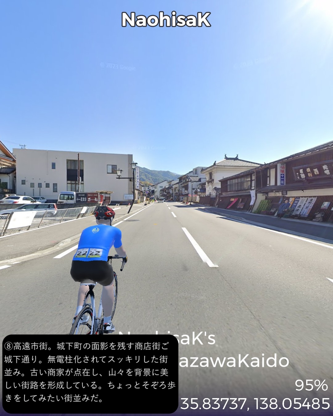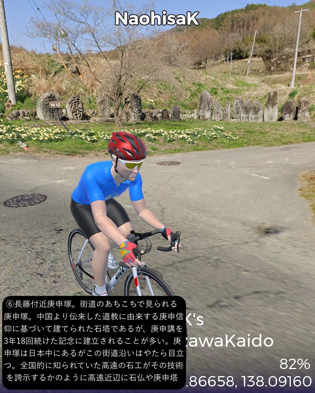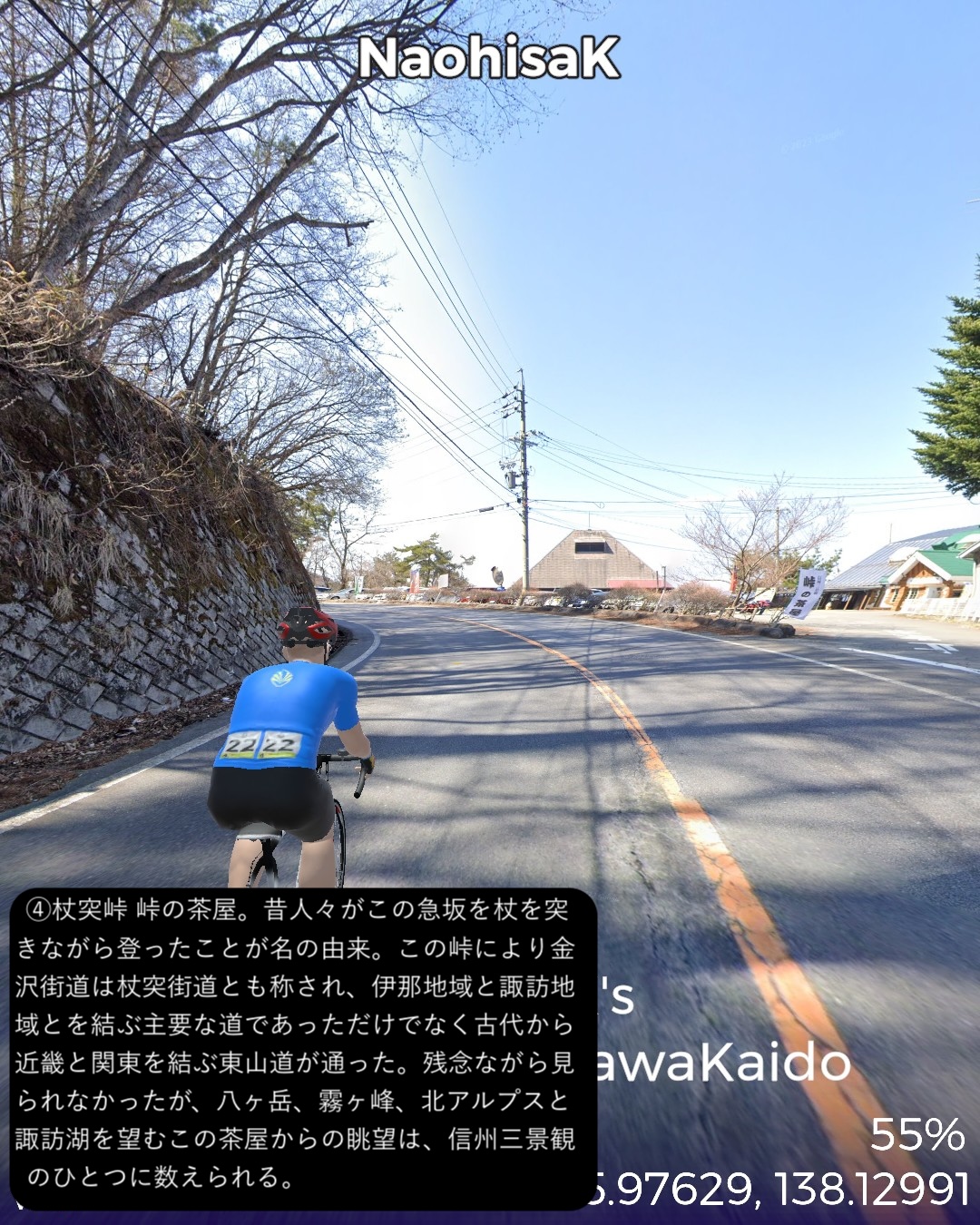 VRサイクリング 大門街道から金沢街道と街道を継いで南アルプスの西側の山懐を南下する。高原のリゾート地白樺湖をスタートし、ちょうど湖畔を通る大門街道を走って一気に山を下り中央線が通る茅野で金沢街道に乗り継ぐ。いきなりの街道の難所杖突峠を一気に登りその先は山桜の咲くのどかな山里の道を進んで桜の里として名高い高遠に辿り着く。町を一巡りし桜で有名な高遠城址公園を抜けた高遠湖の辺りをゴールとする52kmの行程。前半の大門街道は古くから上田地域と諏訪地域を結ぶ幹線道路の1つとして利用されてきた。今回走ったのはその最高所大門峠に近い白樺湖から甲州街道の茅野宿までの部分であるが特に印象に残るものはなかった。後半、茅野から高遠までの金沢街道はなかなか街道らしいいいルートだった。金沢街道は近世では諏訪地域と伊那地域を結ぶ主要道として利用されていたが、実は古代から近畿と東国を結ぶ主要街道であった東山道の一部でもあったようだ。最初の杖突峠の登りはその名が示す通りリアルのサイクリングや徒歩はかなり難儀する急坂で昔から難所として知られていた。峠を越えた後の高遠までの道筋は長閑な山里に山桜が彩りを添え、集落は蔵や切妻造りの伝統的な木造家屋が多く見られる旧街道らしい長閑で美しいルート。ところどころに高遠石工が残した大きな庚申塚が見られるのも特徴的だ。しかしやはり今回のハイライトは高遠の町。ストリートビューは惜しげなくベストシーズンの桜の満開時期を見せてくれて嬉しい限り。特に桜の日本三大名所の1つと言われる高遠城址公園の桜は圧巻。それだけでなく城址公園の高台から望む市街にもあちこちで桜が点在する眺望も素晴らしい。昔から行ってみたい場所なのだが、遠いのとベストシーズンに合わせるのが難しくて叶わない憧れの場所。山のあなたの空遠く・・・高遠という地名にそんな行きたくても行けない理想郷のような響きを感じるのだ。