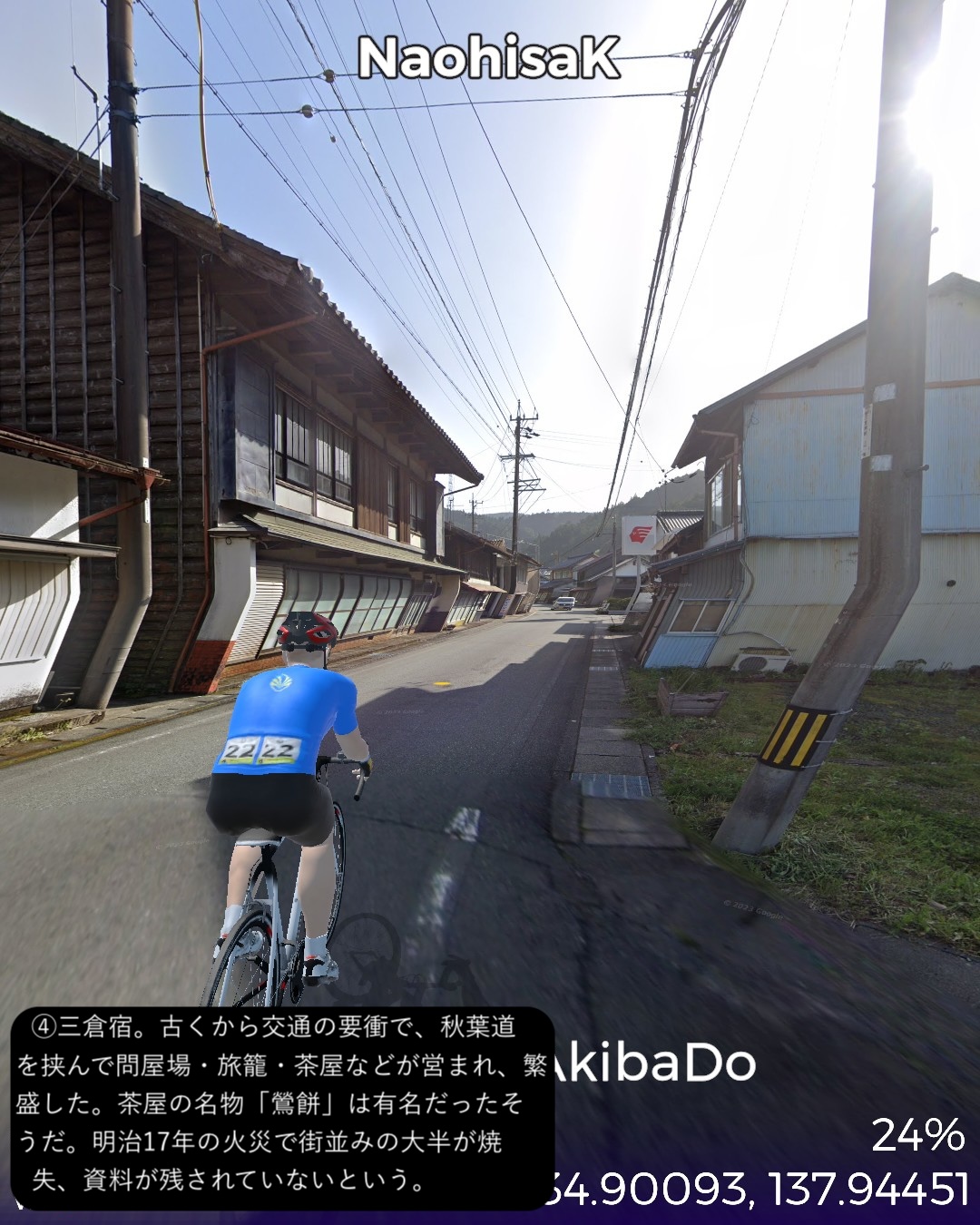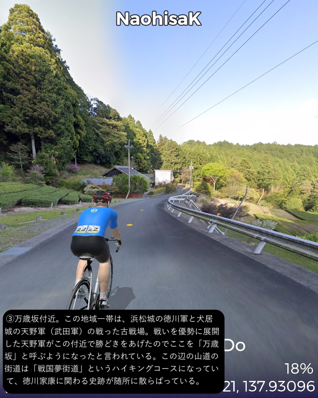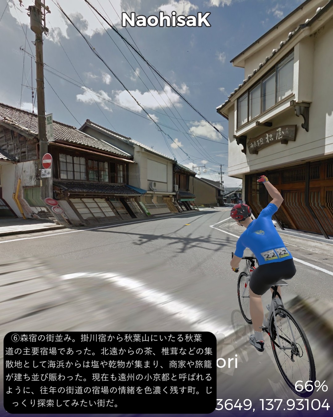VRサイクリング 秋葉神社から古代からの塩の道、江戸時代の秋葉山詣での道を逆に辿り太平洋岸まで一気に到達の巻。山深い信仰の地、秋葉神社下社前をスタートし、少し東へ進んだ後春野街付近から南へ向かう。戦国夢街道と名付けられた丘の上の道を進み、さらに三倉川の谷に沿って三倉宿、その下流の太田川沿いの森宿を経て東海道の宿場であり現代では新幹線の駅もある掛川宿へ至る。掛川からは牧之原台地を南東へ進み太平洋に面した湊町である街道の終点、相良をゴールとする60kmの行程。今回走る秋葉道は前回の秋葉街道の延長で、古代から塩その他の物資の流通の道であり、江戸時代には東海道や海上から秋葉詣でをする人々の参道であった。東海道でもよく見かけた秋葉山常夜灯がこの街道沿いにも散見され、秋葉山詣でが盛んだった頃の名残を見せている。また森宿は見事に街道の宿場の雰囲気を今に残す街並みで、町屋造りの商家や蔵が延々と建ち並び、遠州の小京都と呼ばれるのは妥当と感じられた。終点とした相良は駿河湾沿いの小さな町であるが、相良湊は国内最大級の船を入れられることで、江戸から瀬戸内に到る海運の基地として繁栄した過去を持つ。江戸時代以前からも商業湊として位置付けられここに運び込まれた塩を、ここを起点とする塩の道で内陸へ運び、江戸時代にはさらに秋葉山詣でに海を渡ってきた人々がみここから秋葉道を通って行ったわけだ。秋葉道がここを始点・終点とするのに合点がいった。あと今回のルートで特筆すべき点はずっと日本有数の茶所を通る道筋だったこと。前半、森宿のある森町近辺は上級茶の産地として知られ、後半掛川から先は深蒸し茶で有名な掛川茶の工場や店が街道沿いに並び、終盤牧之原台地に展開する日本有数の茶産地牧之原茶の見渡す限りの茶畑を目の当たりにした。静岡が日本一の茶所とは認識していたが、その奥深さを垣間見た気がする。