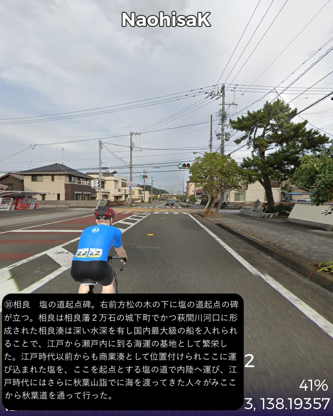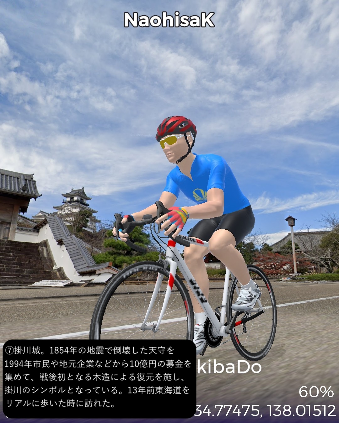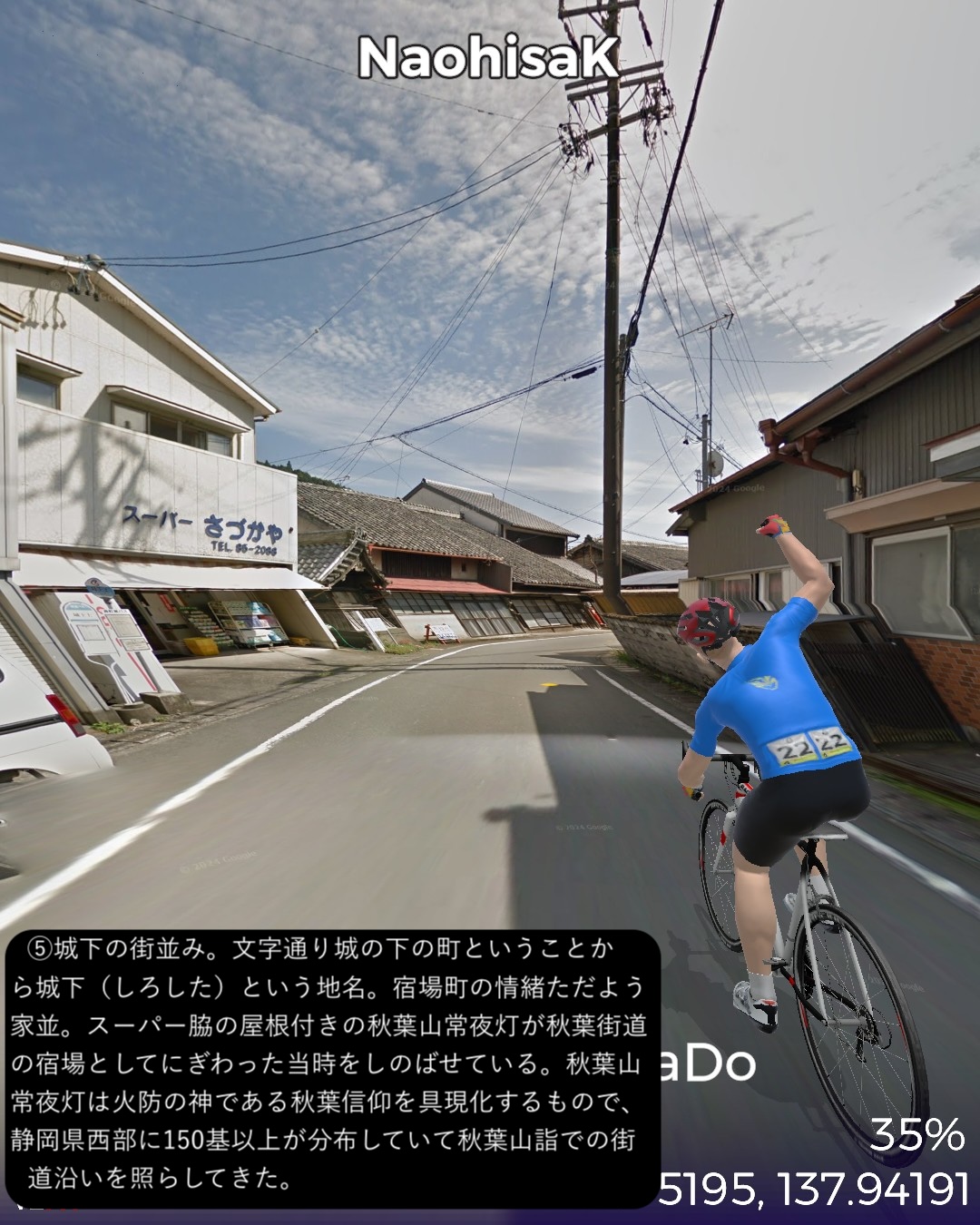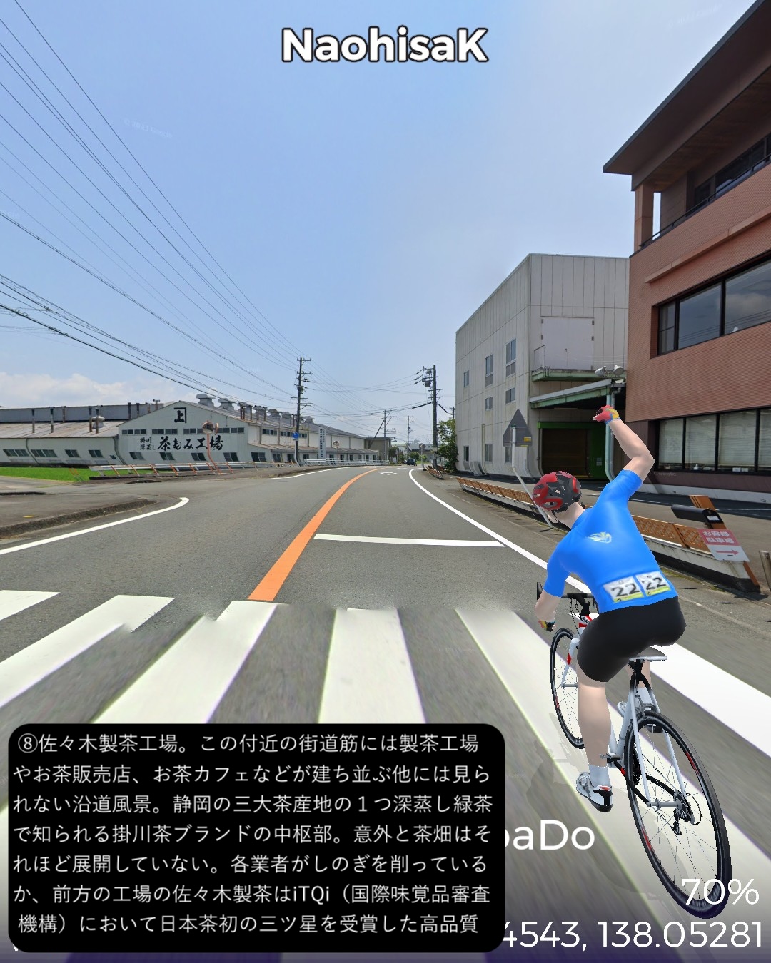 VRサイクリング 秋葉神社から古代からの塩の道、江戸時代の秋葉山詣での道を逆に辿り太平洋岸まで一気に到達の巻。山深い信仰の地、秋葉神社下社前をスタートし、少し東へ進んだ後春野街付近から南へ向かう。戦国夢街道と名付けられた丘の上の道を進み、さらに三倉川の谷に沿って三倉宿、その下流の太田川沿いの森宿を経て東海道の宿場であり現代では新幹線の駅もある掛川宿へ至る。掛川からは牧之原台地を南東へ進み太平洋に面した湊町である街道の終点、相良をゴールとする60kmの行程。今回走る秋葉道は前回の秋葉街道の延長で、古代から塩その他の物資の流通の道であり、江戸時代には東海道や海上から秋葉詣でをする人々の参道であった。東海道でもよく見かけた秋葉山常夜灯がこの街道沿いにも散見され、秋葉山詣でが盛んだった頃の名残を見せている。また森宿は見事に街道の宿場の雰囲気を今に残す街並みで、町屋造りの商家や蔵が延々と建ち並び、遠州の小京都と呼ばれるのは妥当と感じられた。終点とした相良は駿河湾沿いの小さな町であるが、相良湊は国内最大級の船を入れられることで、江戸から瀬戸内に到る海運の基地として繁栄した過去を持つ。江戸時代以前からも商業湊として位置付けられここに運び込まれた塩を、ここを起点とする塩の道で内陸へ運び、江戸時代にはさらに秋葉山詣でに海を渡ってきた人々がみここから秋葉道を通って行ったわけだ。秋葉道がここを始点・終点とするのに合点がいった。あと今回のルートで特筆すべき点はずっと日本有数の茶所を通る道筋だったこと。前半、森宿のある森町近辺は上級茶の産地として知られ、後半掛川から先は深蒸し茶で有名な掛川茶の工場や店が街道沿いに並び、終盤牧之原台地に展開する日本有数の茶産地牧之原茶の見渡す限りの茶畑を目の当たりにした。静岡が日本一の茶所とは認識していたが、その奥深さを垣間見た気がする。