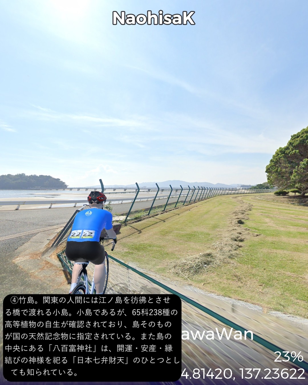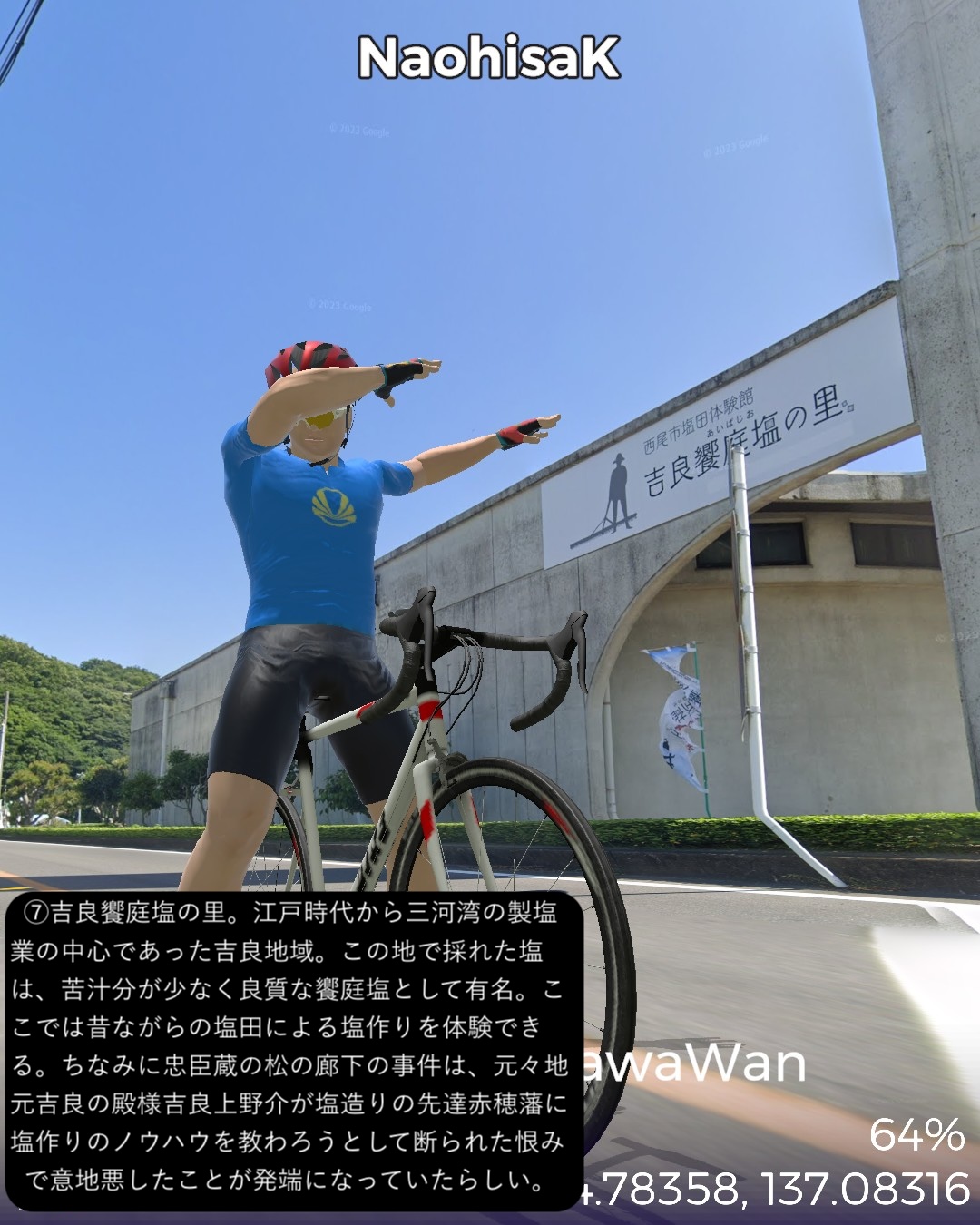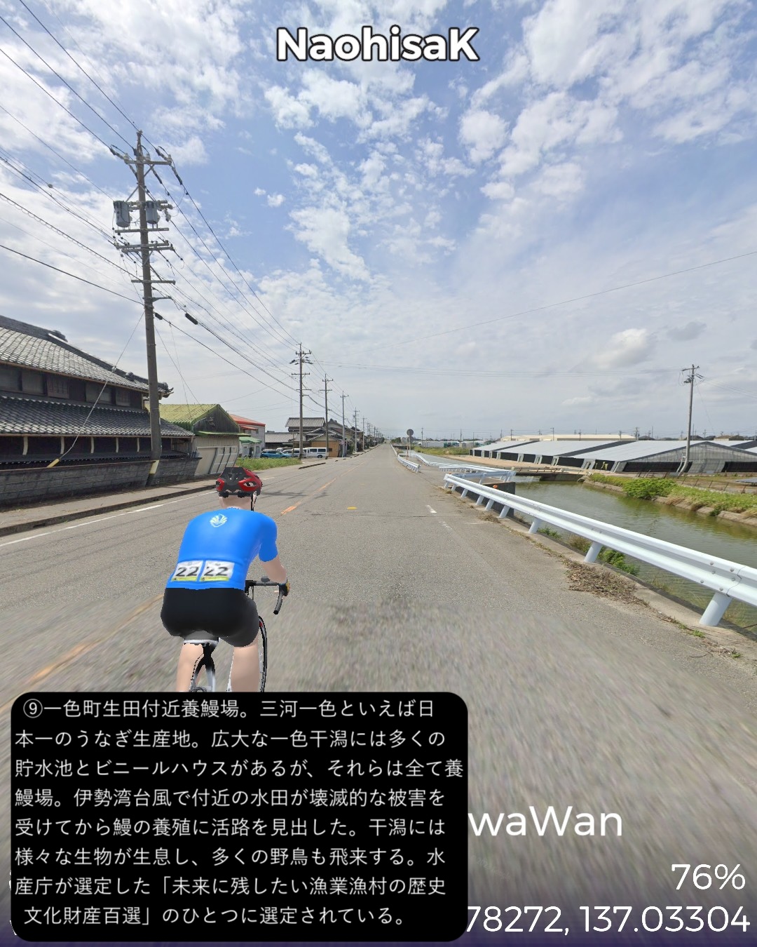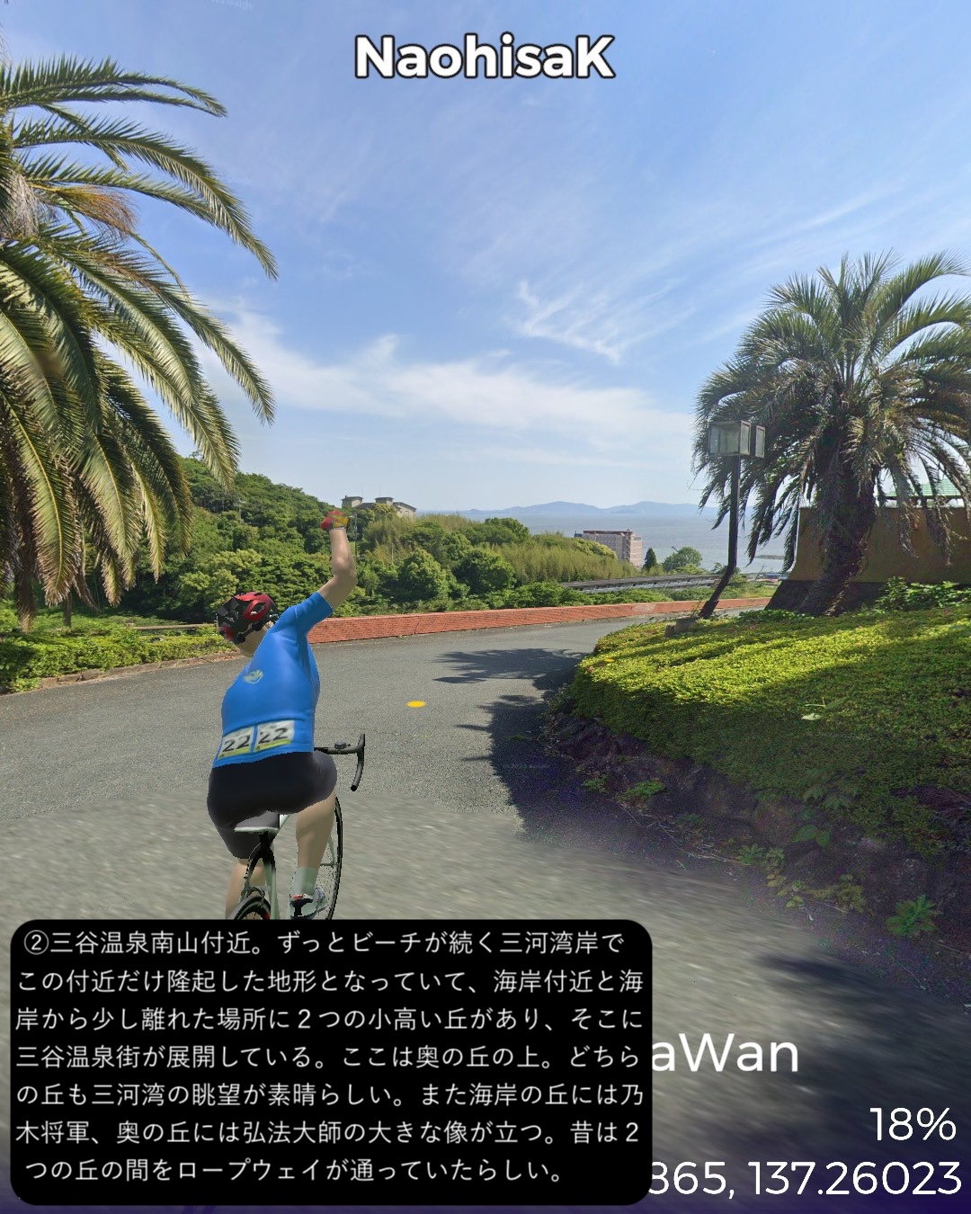 VRサイクリング、三河湾岸を巡るルート。姫街道と東海道の合流点御油追分をスタートし、三河湾岸へ向かう。三河湾国定公園の定番観光スポットを巡る道筋。ラグーナリゾート、三谷温泉、竹島を経て蒲郡市街を抜けて三ヶ根山に登って下り、吉良町を抜けてウナギの町一色町を回ってから内陸の城下町西尾の名鉄西尾駅をゴールとする57kmの行程。前半は古き良き海辺の観光地。特に三谷温泉から竹島の付近は昭和の頃から時が止まっているかのようなレトロな観光地の趣きが心に沁みる。三谷温泉や三ヶ根山からは陽光輝く三河湾の素晴らしい絶景が望めて気分が良い。一方で後半はガラッと変わって吉良町から一色町にかけて(どちらも行政区分上は西尾市であるが)干潟が広がり、干潟の奥に引っ込んでいる街並みは意外と歴史を感じさせる情緒が漂う。干潟の生み出す優れた特産品が数多くあり、海苔、アサリ、アオヤギ、塩、そして今や日本一の生産地となっている一色町の養殖ウナギ。吉良町は忠臣蔵で悪名高い吉良上野介の吉良家の領地で、実は塩田造りに関して先達である赤穂藩に技術的援助を断られてその腹いせに意地悪をしたところがどうやら発端らしい。そうか塩つながりの話だったのね忠臣蔵は。一色町に広がる干潟を少し走ってみたが、あちこちに貯水池とビニールハウスが点在し、これらが養鰻の環境となっているようだ。戦後の伊勢湾台風でこの地区の水田が壊滅的被害を受けたところから養鰻業に舵を切ったのが始まりらしい。さて次回は西尾から知多半島へ向かう。