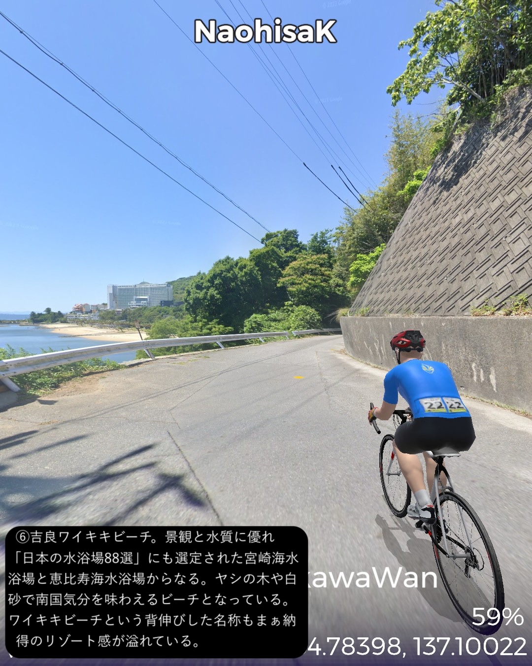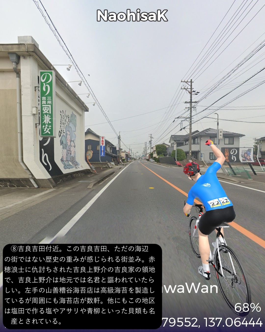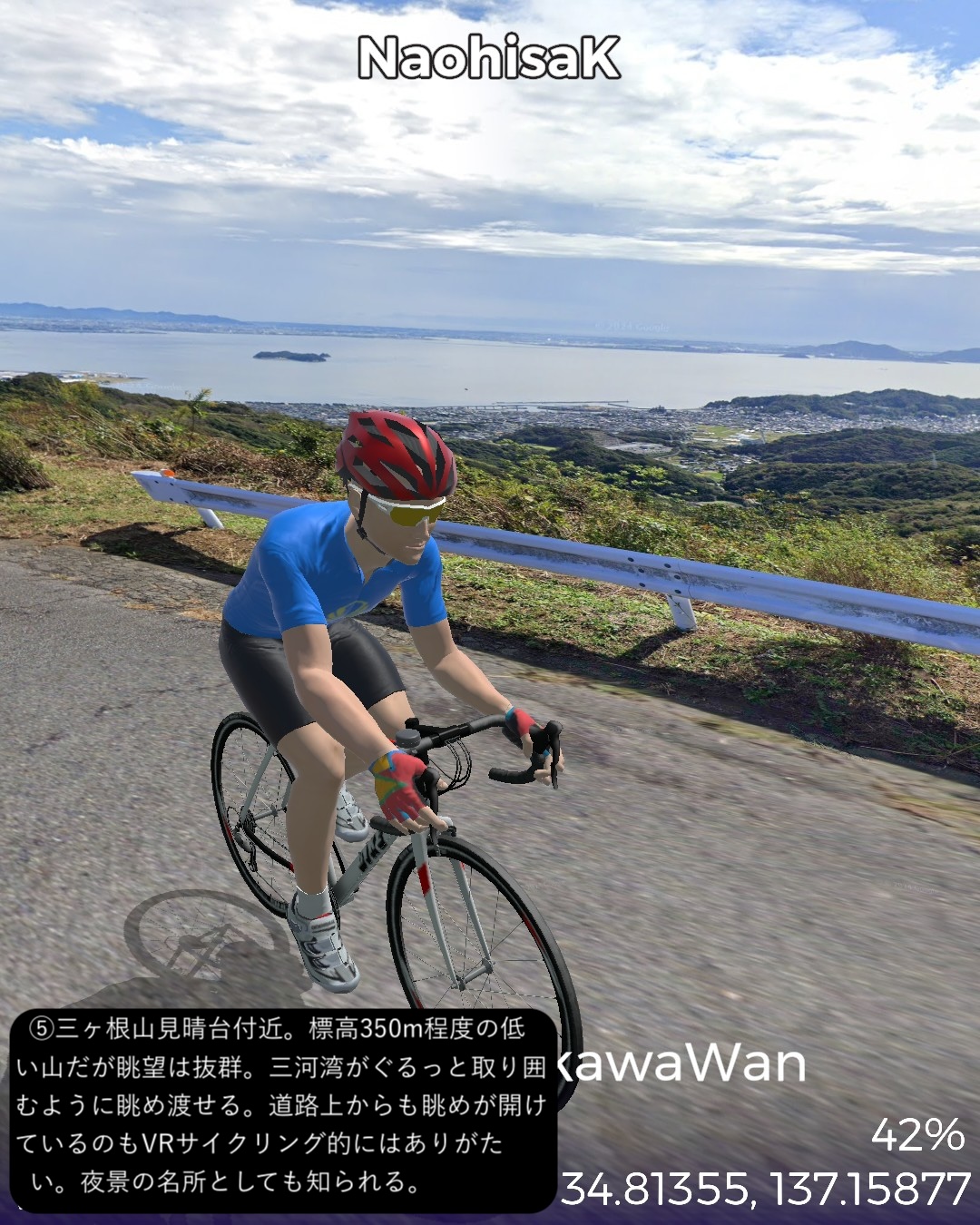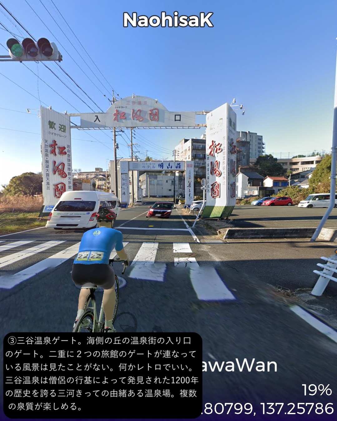 VRサイクリング、三河湾岸を巡るルート。姫街道と東海道の合流点御油追分をスタートし、三河湾岸へ向かう。三河湾国定公園の定番観光スポットを巡る道筋。ラグーナリゾート、三谷温泉、竹島を経て蒲郡市街を抜けて三ヶ根山に登って下り、吉良町を抜けてウナギの町一色町を回ってから内陸の城下町西尾の名鉄西尾駅をゴールとする57kmの行程。前半は古き良き海辺の観光地。特に三谷温泉から竹島の付近は昭和の頃から時が止まっているかのようなレトロな観光地の趣きが心に沁みる。三谷温泉や三ヶ根山からは陽光輝く三河湾の素晴らしい絶景が望めて気分が良い。一方で後半はガラッと変わって吉良町から一色町にかけて(どちらも行政区分上は西尾市であるが)干潟が広がり、干潟の奥に引っ込んでいる街並みは意外と歴史を感じさせる情緒が漂う。干潟の生み出す優れた特産品が数多くあり、海苔、アサリ、アオヤギ、塩、そして今や日本一の生産地となっている一色町の養殖ウナギ。吉良町は忠臣蔵で悪名高い吉良上野介の吉良家の領地で、実は塩田造りに関して先達である赤穂藩に技術的援助を断られてその腹いせに意地悪をしたところがどうやら発端らしい。そうか塩つながりの話だったのね忠臣蔵は。一色町に広がる干潟を少し走ってみたが、あちこちに貯水池とビニールハウスが点在し、これらが養鰻の環境となっているようだ。戦後の伊勢湾台風でこの地区の水田が壊滅的被害を受けたところから養鰻業に舵を切ったのが始まりらしい。さて次回は西尾から知多半島へ向かう。