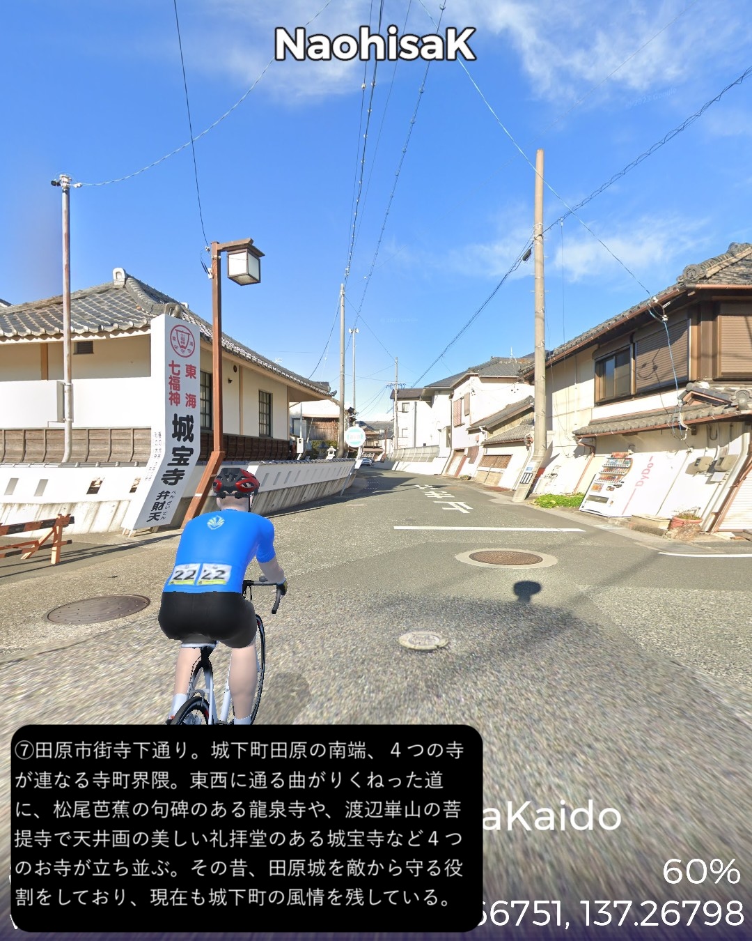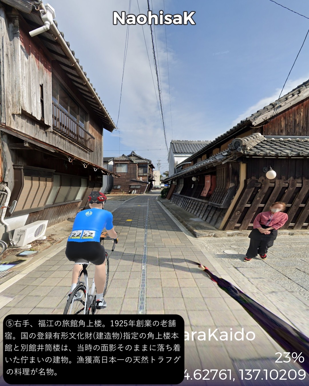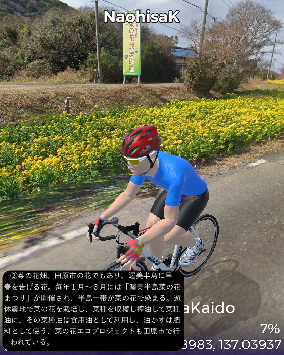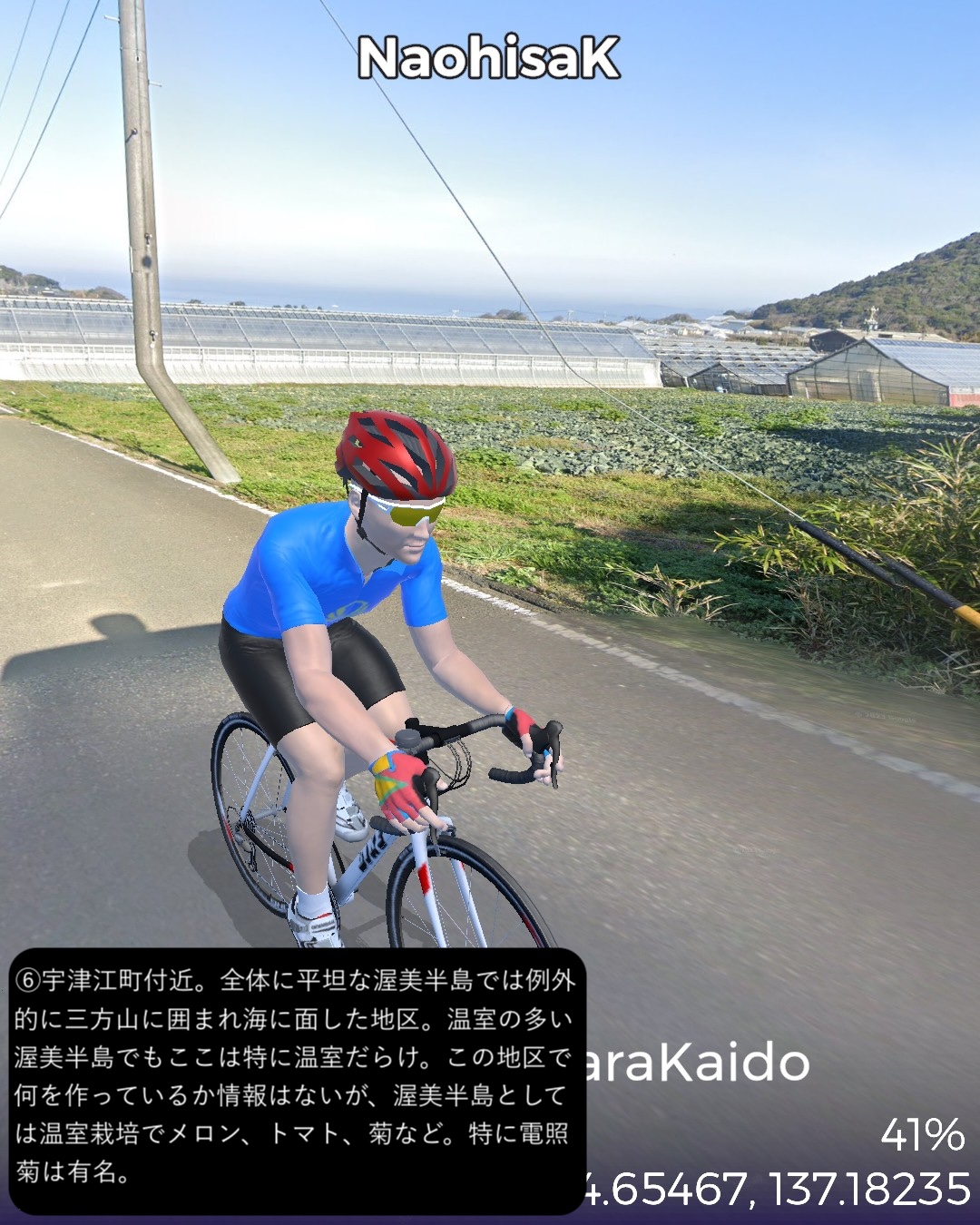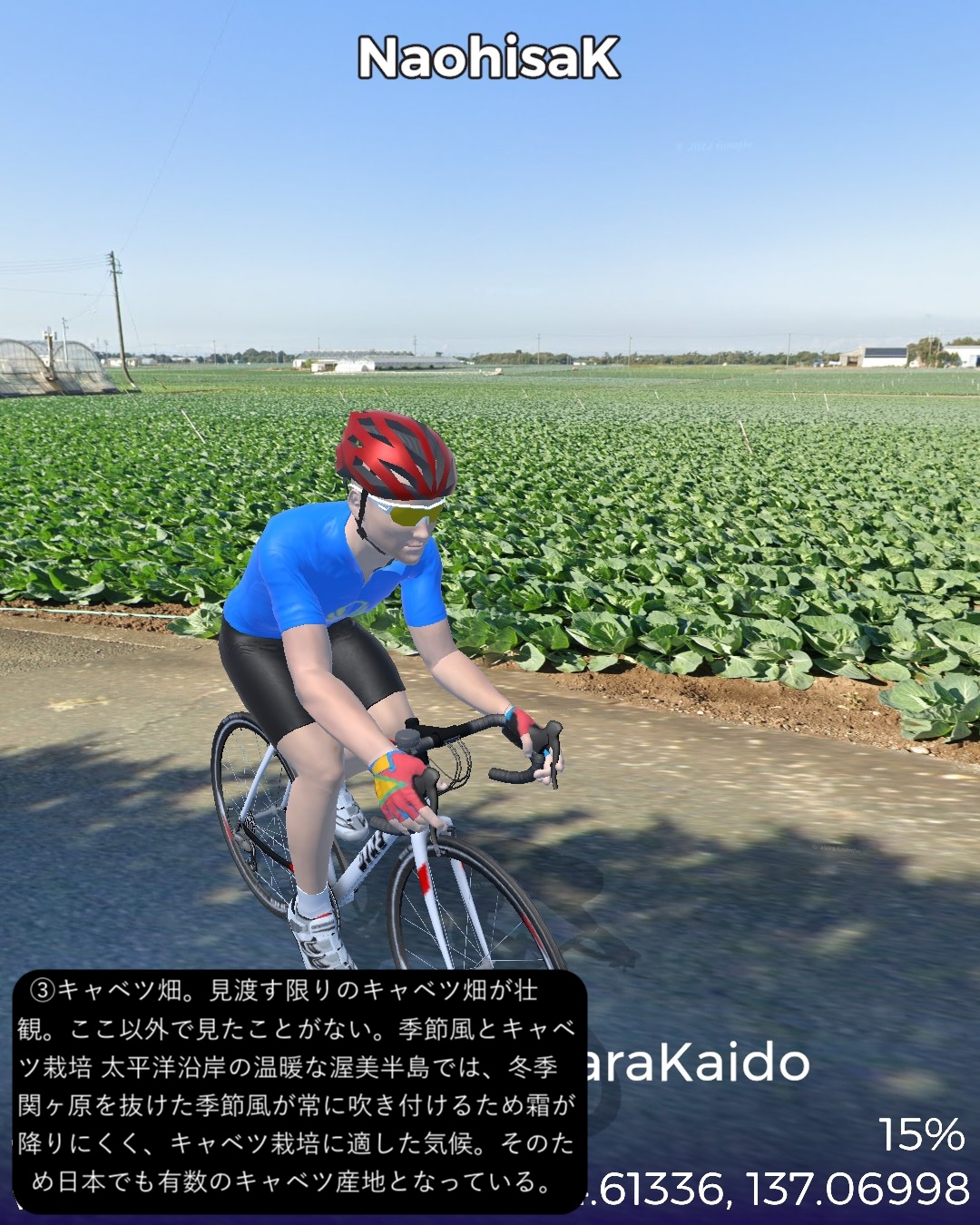 VRサイクリング 渥美半島の先端伊良湖岬から根元豊橋まで田原街道を往くの巻。前回終点の知多半島先端の師崎からフェリーで渡った伊良湖岬港を出発し、基本的に一貫して田原街道を走る。平坦な田園地帯を進み昔の宿場の残り香が濃く残る福江を通りぬけ、宇津江付近で渥美半島ではレアな山道を少しだけ登り下りした後また延々と田園の中を走って城下町田原へ至る。その先も見渡す限りの田園地帯をひたすら走り都市部へ入るとゴールの豊橋。田原街道終点に近い豊橋公園の外縁部に位置する豊橋のランドマーク豊橋ハリストス正教会をゴールとする51kmの行程。出発点の伊良湖岬は25年程前両親、妹家族と共に我が家族の一族郎党で伊勢志摩旅行へ行った時に集合地点とした。鳥羽へ渡るフェリーを待つ間に灯台を通ってその先の椰子の実の童謡で知られる恋路浜まで散策して過ごした。娘もまだ幼児の頃で思い出深い場所である。白亜の灯台は美しかったが今回のVRでは遊歩道まで走れず残念ながらその姿を拝めなかった。渥美半島は昔通った時の印象と変わらず、とにかく平坦な田園地帯。陽光に満ちた暖かく明るい空気感が一貫して感じられる。田園地帯は米というよりもキャベツ畑、そして早春は菜の花畑が広がり、もう1つ特徴的なのは温暖な気候を利用したハウス栽培のガラス温室群が壮観なほど並ぶ風景。温室栽培品としては電照菊が有名だがトマトやメロン、みかんも特産のようだ。夜間、温室に灯を灯す電照菊は日本夜景遺産にも選出されている。知多半島が醸造や焼き物の職人文化及び漁港が多く展開する漁業の地域であるのに対し、渥美半島はとにかく農業王国なのだ。これは一番走っていて肌で感じた次第。それでも街道途中の宿場である福江と田原は古い街並みが残り江戸時代以来の伝統的な街道文化を感じさせる。それも江戸時代、関西や伊勢へのルートとしてひたすら東海道だけでなく、東海道からこの田原街道に入って伊良湖岬から伊勢へ海路を利用するというオプションがあって単なる田舎街道ではなく東海道の脇街道的な位置付けで賑わっていたこともあるかもしれない。予想よりなかなか興味深い道筋であった。