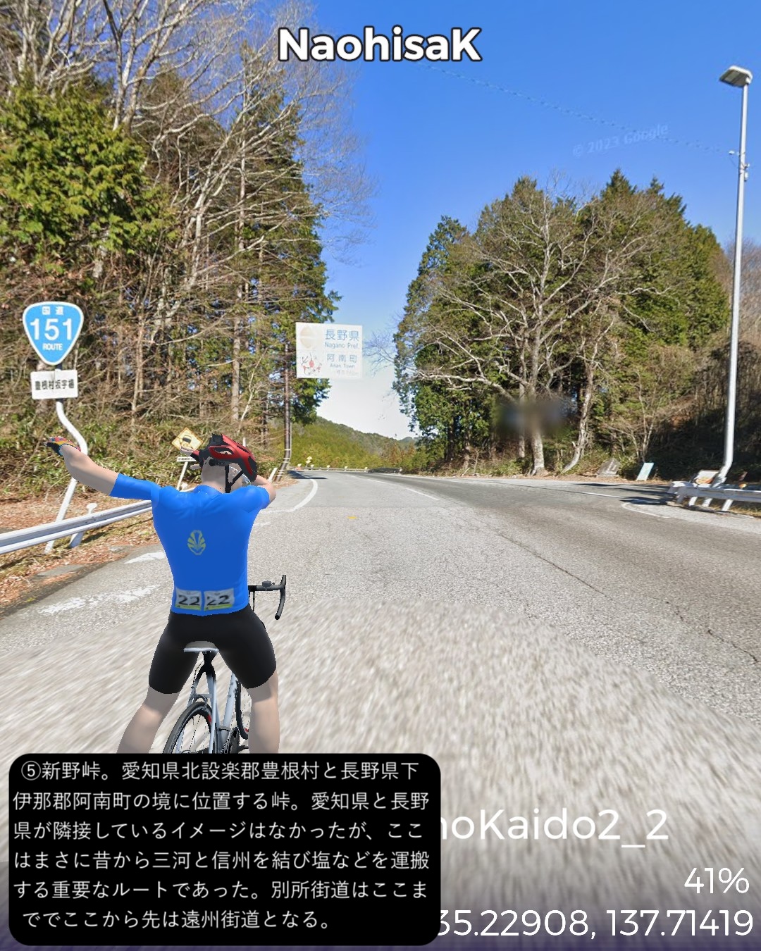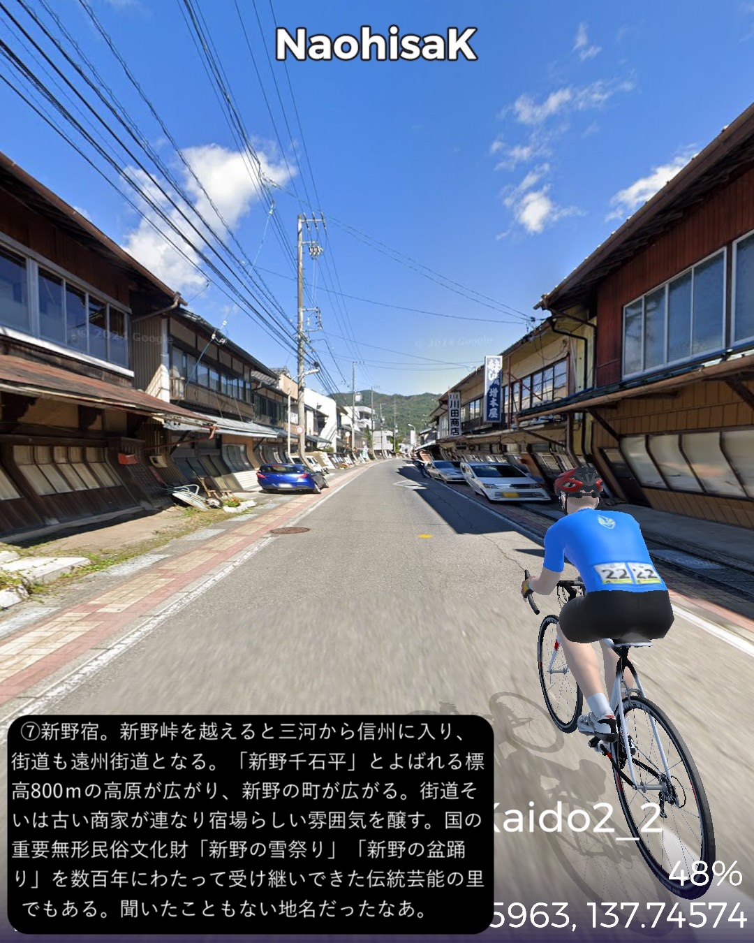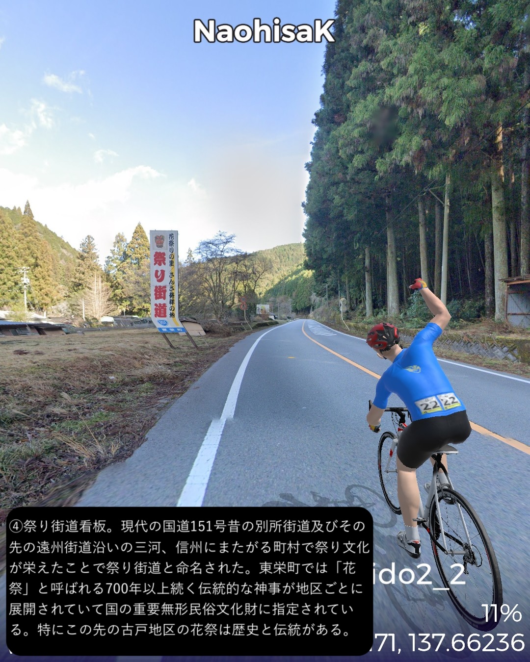 VRサイクリング 奥三河から南信州へひたすら山の道を進むの巻。奥三河の温泉郷湯谷をスタートし別所街道をまず北東へJR飯田線に沿って進み、東栄駅付近より北西へ針路を変えさらに山へ入ってゆく。街道名となった別所、現在の東栄町の中心部を過ぎ針路も北北東から北に変えつつ、東栄町から豊根村へ入りいくつかの集落を経て三河と信州の国境となる新野峠を越える。ここからは遠州街道という名称に変わりちょっと下った所に広がる高原地帯の町新野をへて、その先は天竜川の深い谷の西側の段丘上の眺望の良い道を北へ進ん行き下條からは街道を外れて北西へ進み阿智村の奥、南信州最大の温泉郷昼神温泉をゴールとする90kmの長丁場。距離は長いがひたすら山の中で史跡や絶景ポイントも少ないのでハイライトとなるような場所には乏しかった。ただこのルートを特徴づけるネーミングとして「祭り街道」という名称で奥三河から南信州のネームバリューのない町村を束ねてプロモーションをしている。東栄町の各集落毎に特徴づけられた花祭、鳴物を排した静かな新野の盆踊り、街道を少し外れた和合の念仏踊りなどいくつもの無形文化財にも指定された文化遺産が点在している地域なのだが、残念ながら通りすぎるだけではこれらは体感できないんだよなあ。でも調べるとそれぞれ山里で独自に研ぎ澄まされた民俗芸能は非常に魅力的。祭り当日にこの僻地に足を運ぶしか体感することはできないが、そうした知られざる田舎の文化は山ほど日本中に隠されているんでしょうな。次回は飯田から伊那谷へと街道旅を進めてゆく。