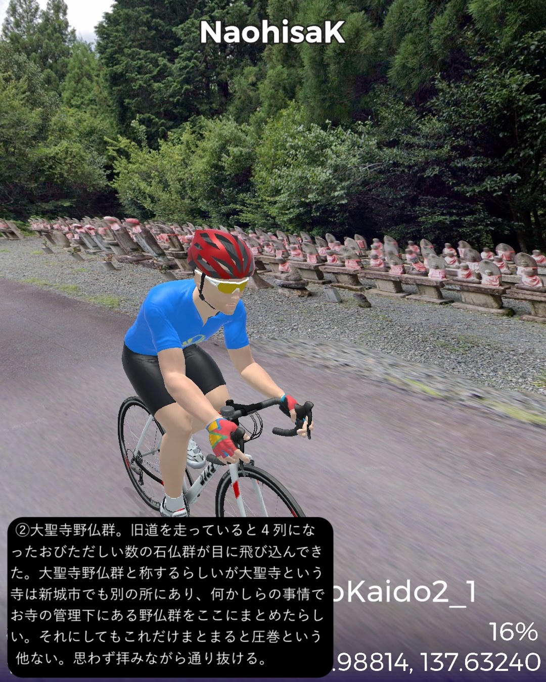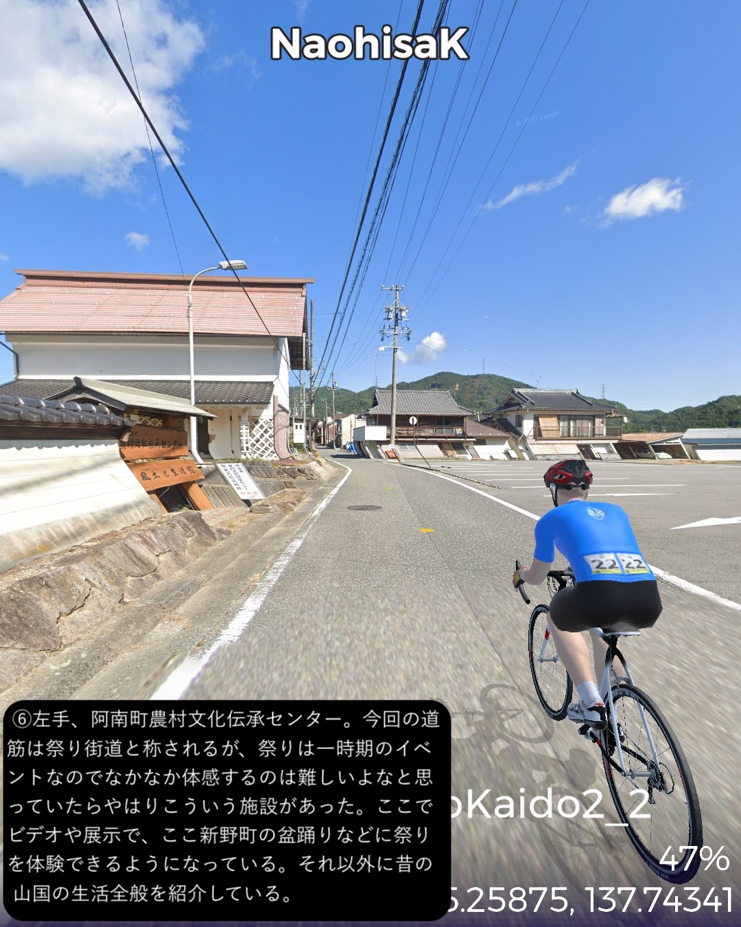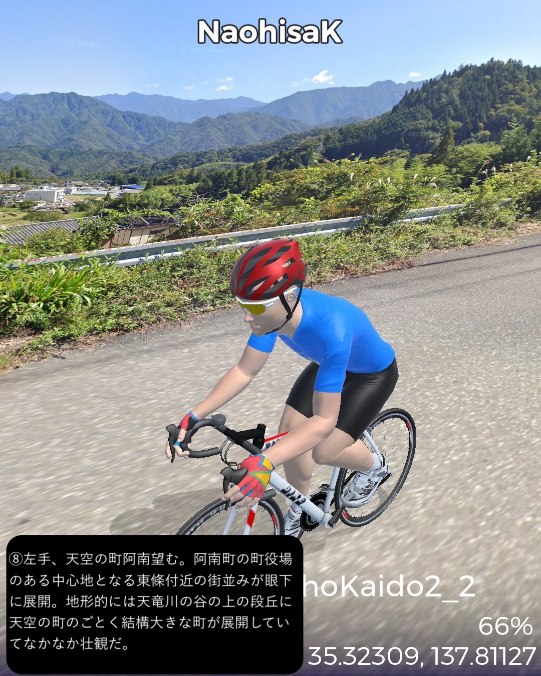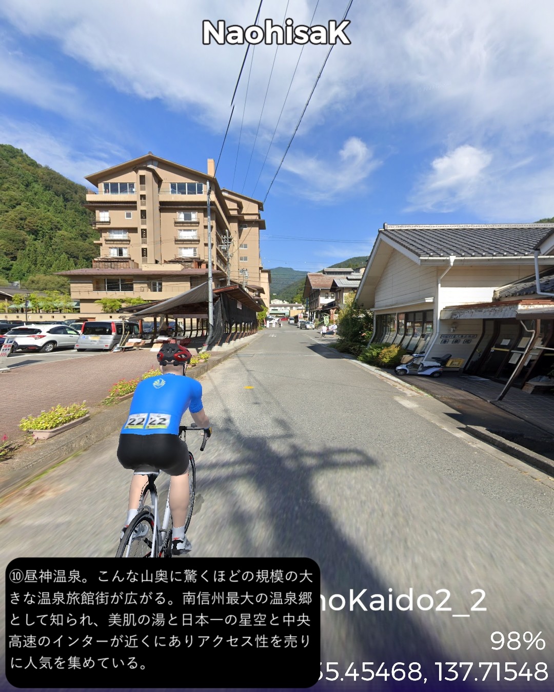 VRサイクリング 奥三河から南信州へひたすら山の道を進むの巻。奥三河の温泉郷湯谷をスタートし別所街道をまず北東へJR飯田線に沿って進み、東栄駅付近より北西へ針路を変えさらに山へ入ってゆく。街道名となった別所、現在の東栄町の中心部を過ぎ針路も北北東から北に変えつつ、東栄町から豊根村へ入りいくつかの集落を経て三河と信州の国境となる新野峠を越える。ここからは遠州街道という名称に変わりちょっと下った所に広がる高原地帯の町新野をへて、その先は天竜川の深い谷の西側の段丘上の眺望の良い道を北へ進ん行き下條からは街道を外れて北西へ進み阿智村の奥、南信州最大の温泉郷昼神温泉をゴールとする90kmの長丁場。距離は長いがひたすら山の中で史跡や絶景ポイントも少ないのでハイライトとなるような場所には乏しかった。ただこのルートを特徴づけるネーミングとして「祭り街道」という名称で奥三河から南信州のネームバリューのない町村を束ねてプロモーションをしている。東栄町の各集落毎に特徴づけられた花祭、鳴物を排した静かな新野の盆踊り、街道を少し外れた和合の念仏踊りなどいくつもの無形文化財にも指定された文化遺産が点在している地域なのだが、残念ながら通りすぎるだけではこれらは体感できないんだよなあ。でも調べるとそれぞれ山里で独自に研ぎ澄まされた民俗芸能は非常に魅力的。祭り当日にこの僻地に足を運ぶしか体感することはできないが、そうした知られざる田舎の文化は山ほど日本中に隠されているんでしょうな。次回は飯田から伊那谷へと街道旅を進めてゆく。