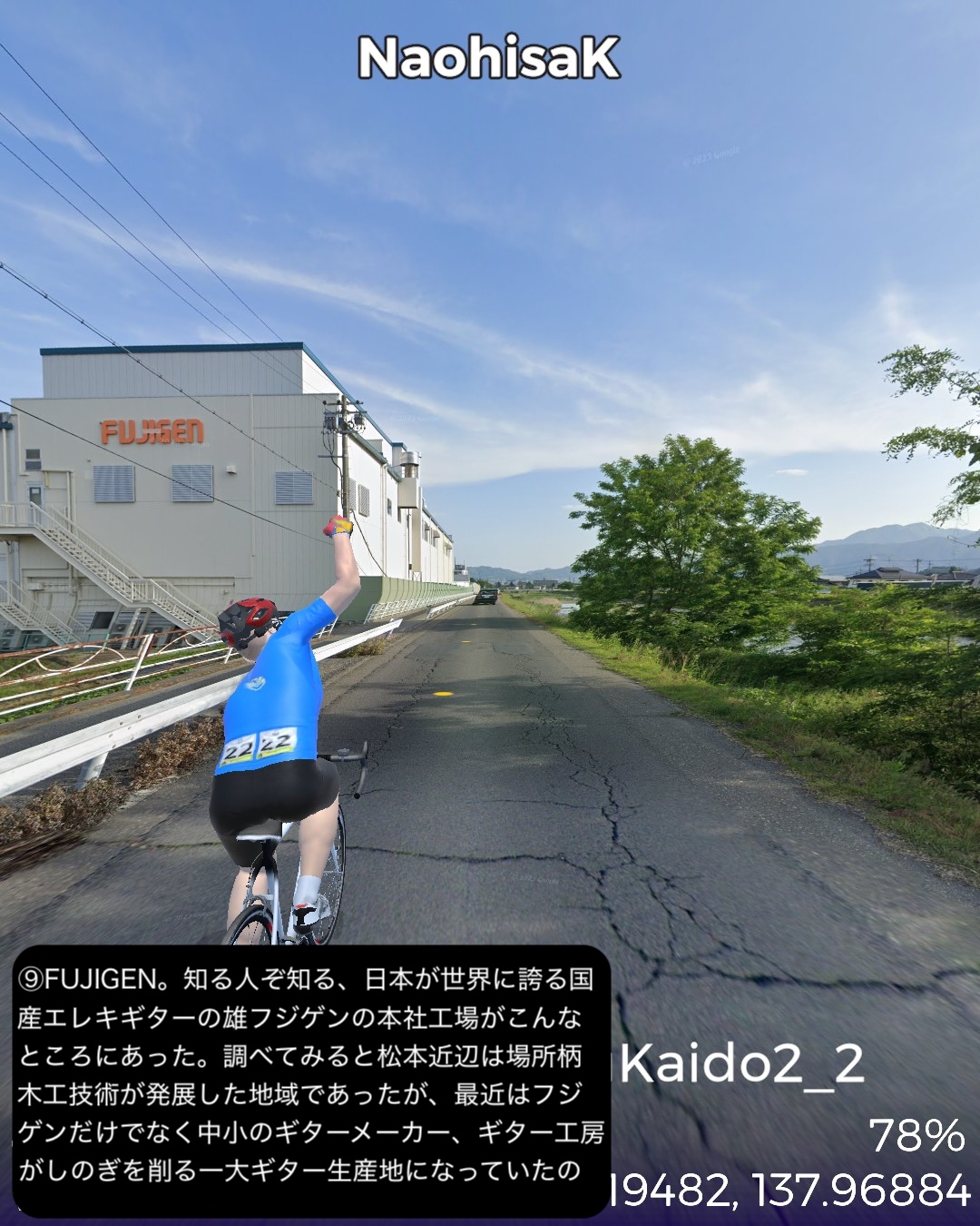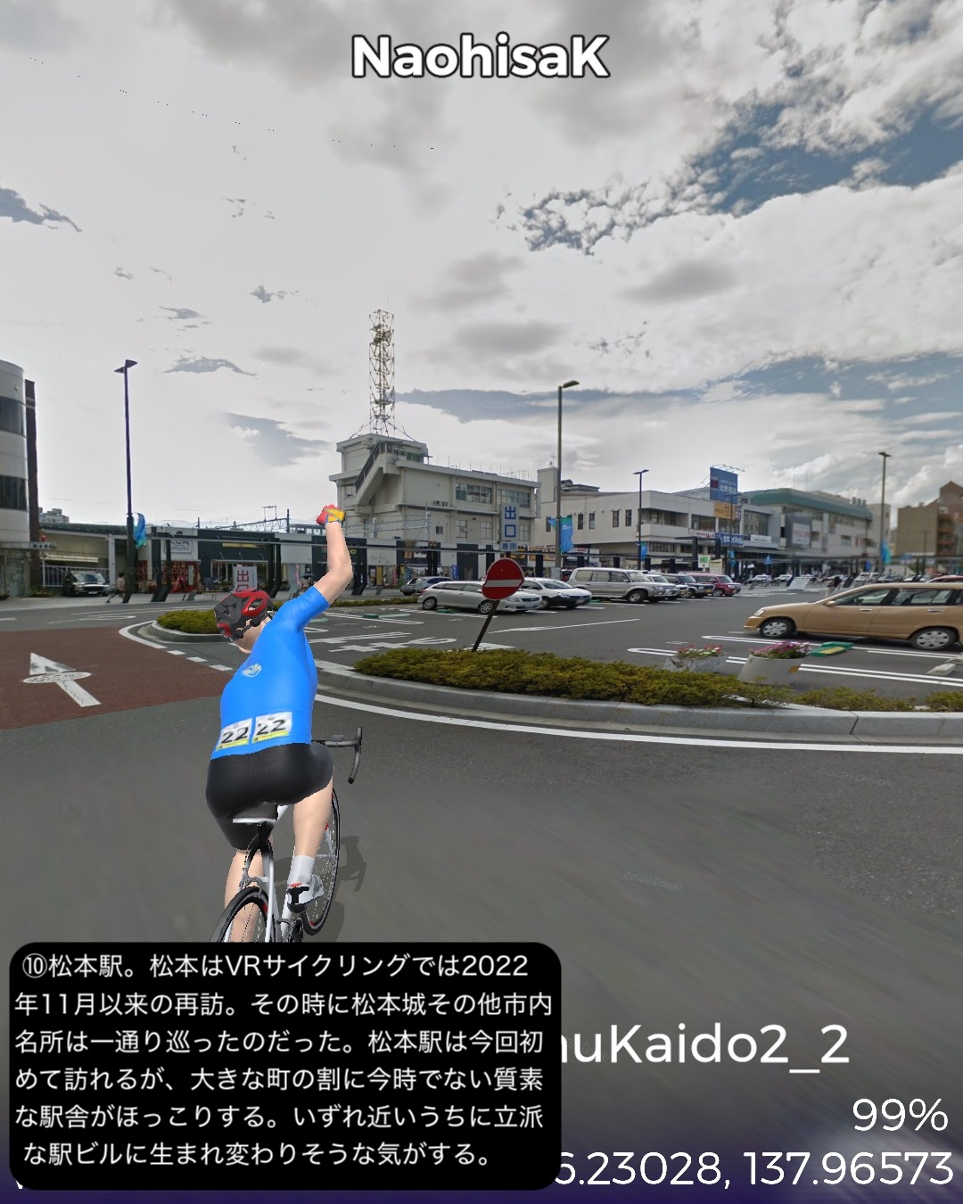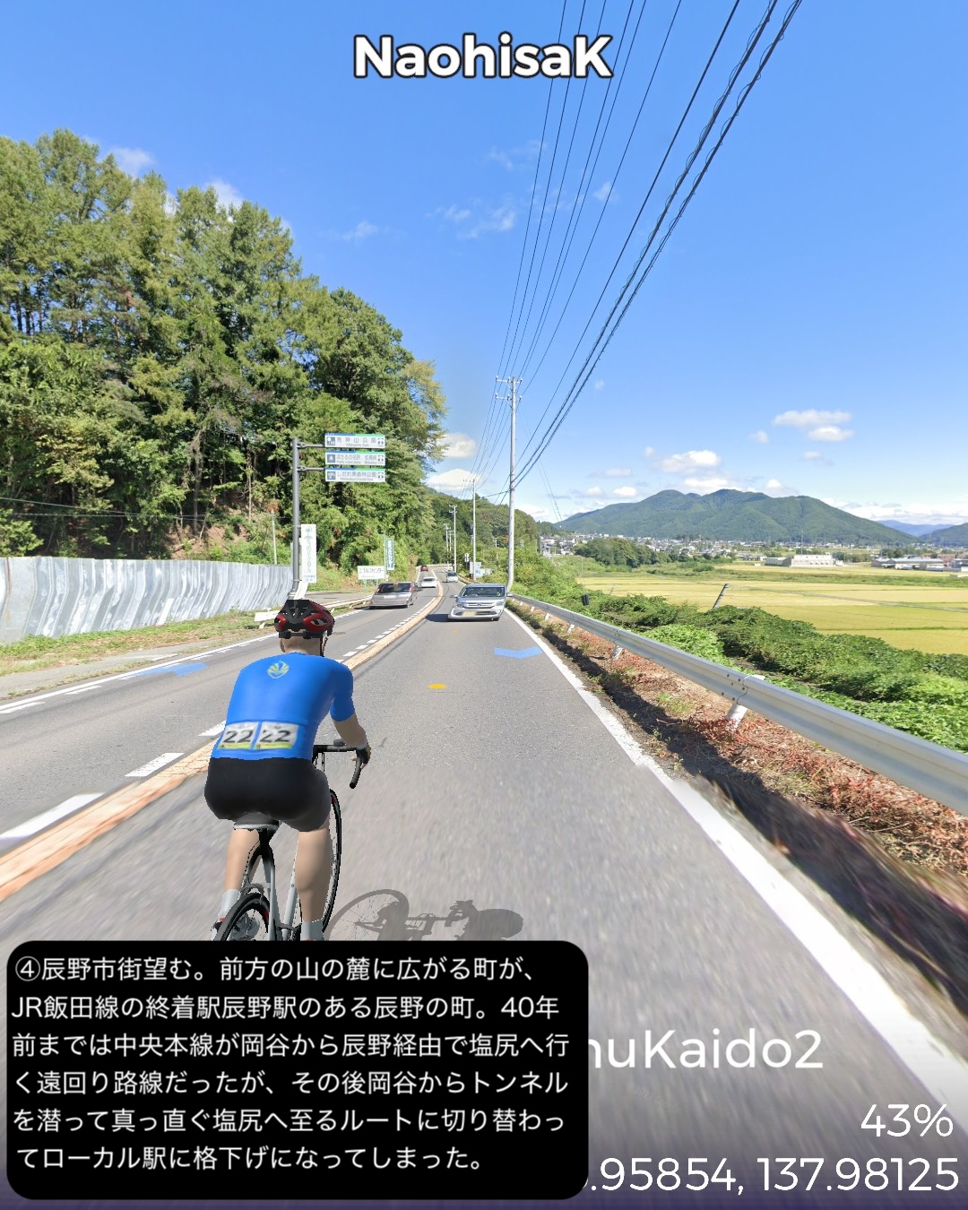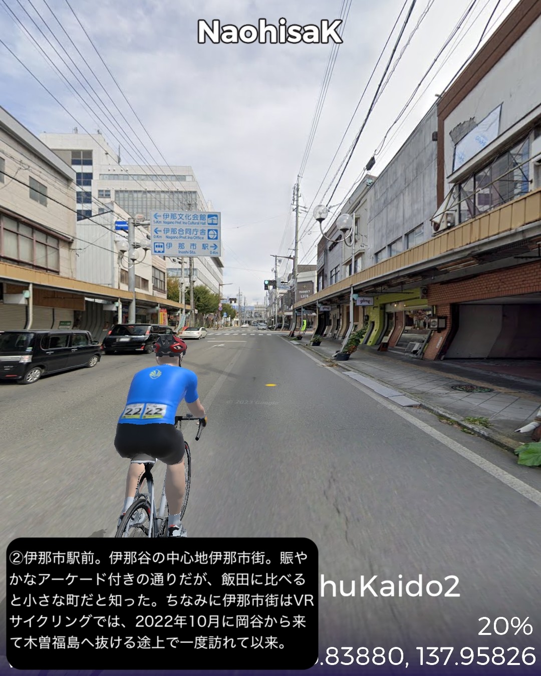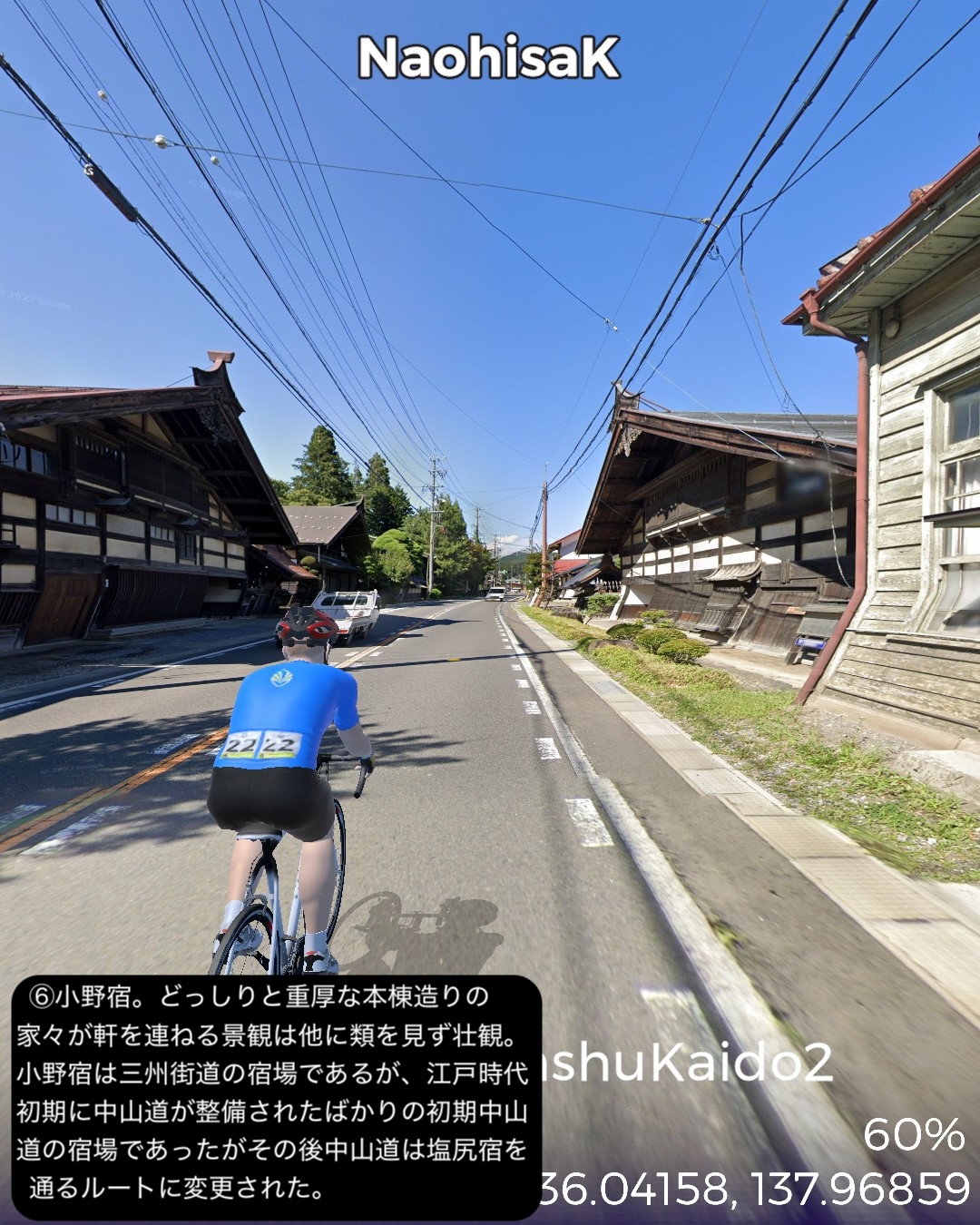 VRサイクリング 三州街道にて伊那谷を北へ抜けて松本へ進むの巻。中央アルプスと南アルプスの峰々が映える町駒ヶ根を出発し、三州街道をさらに北へ進む。伊那谷の中心伊那市街を抜けると伊那谷も広さを増して平原を主に国道で進む道筋。右手に辰野市街を眺めつつ山間に入ってゆき小野宿を通りぬけて大して登らないが分水嶺となる善知鳥峠を越えるとまもなく三州街道の終点で中山道の宿場の塩尻宿、そこからは北アルプスを左手に望みつつ広い松本盆地を広い国道で進み松本市街に入るとまもなくゴールとした松本駅に到着となる63kmの行程。今回は前半は広めの伊那谷の北側、後半も広い松本盆地を主に国道で走ることになったので今一つ面白みには欠けていたが、中盤に思いがけず出会った、重厚な本棟造りの家並みが続く景観が素晴らしい小野宿が今回のハイライト。次回は松本から安曇野を経て白馬方面へ千国街道で向かう。