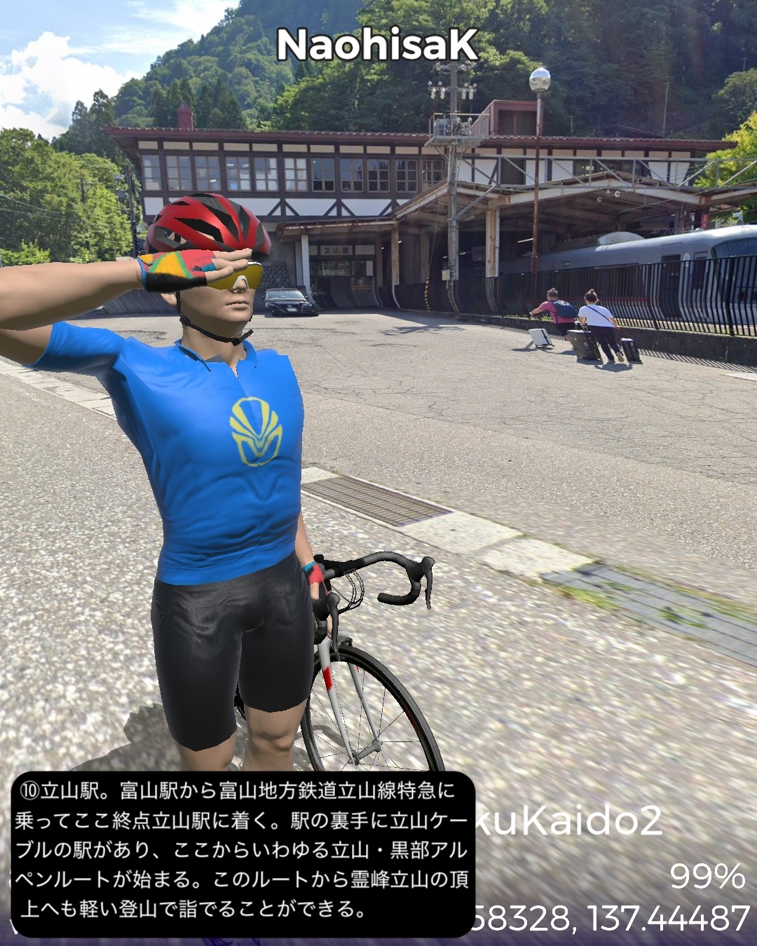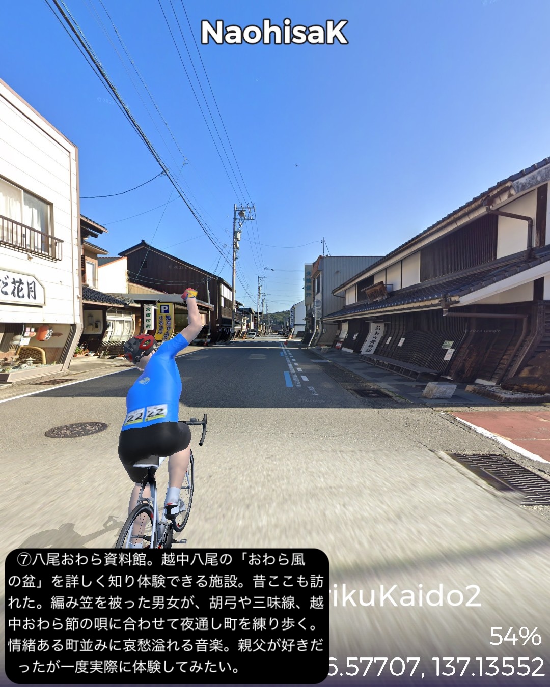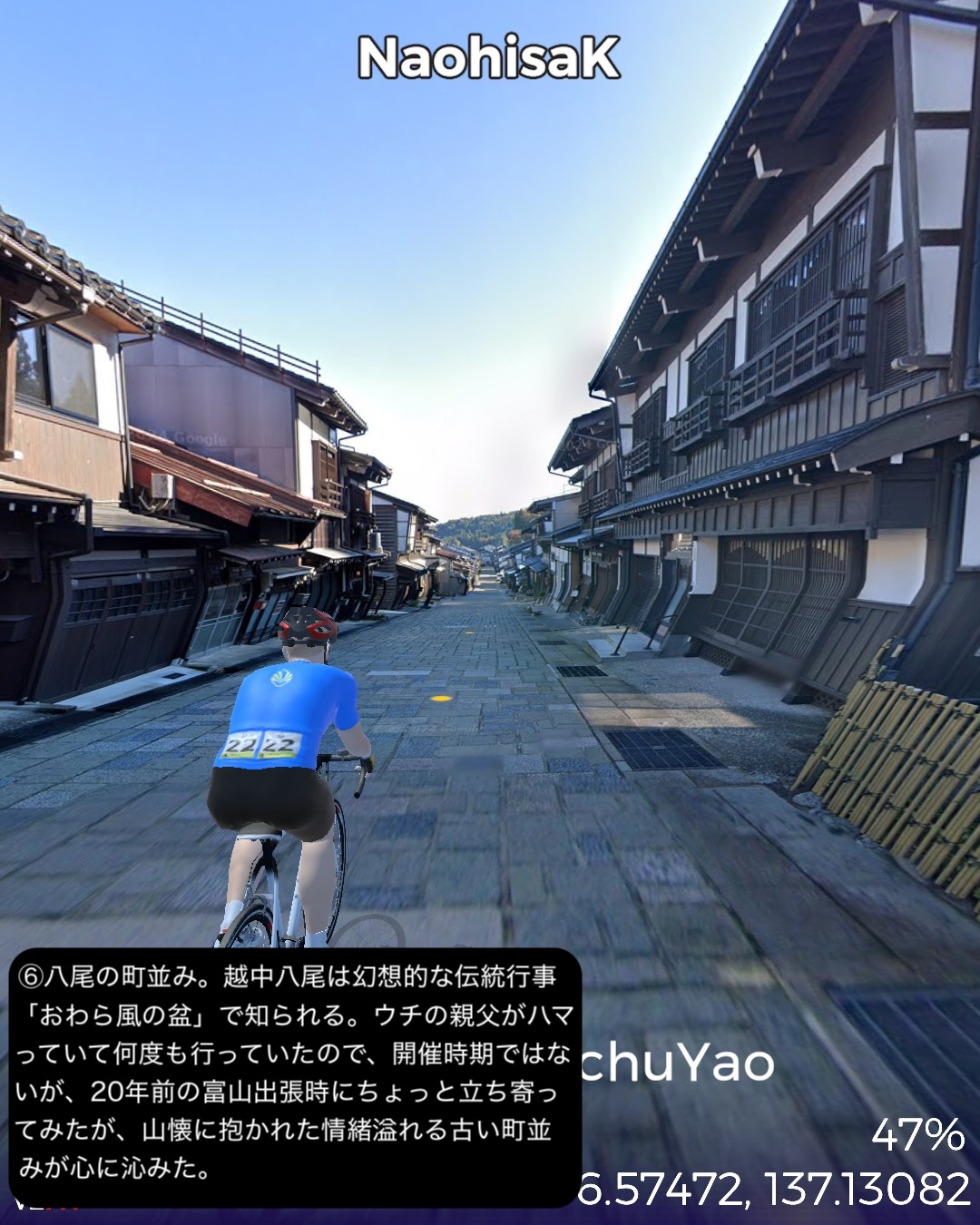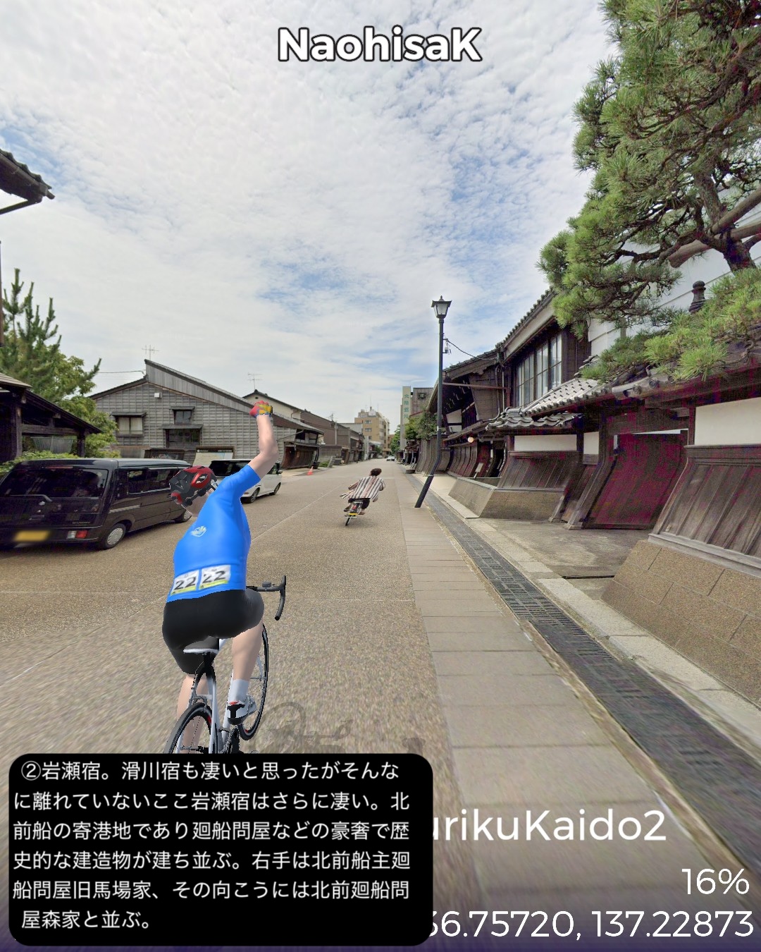 VRサイクリング 富山周辺をぐるっと一巡りの巻。前回のゴール地点滑川のほたるいかミュージアム前を出発し海沿いを進む。程なく滑川宿、そして水橋宿、さらに岩瀬宿。ここで早くも街道を離れ、南へ進路を変えて運河沿いの道を進むと富山市街。富山駅から富山城址と市街地を縦断してその後南西に向かい、越中八尾の古い町並みを一巡り。さらに今度は東へ向かい立山・黒部ルートの拠点、立山駅をゴールとする74kmの行程。北陸街道2日目と称しつつ街道を走るのは最初の海沿いの道筋だけであるが、その間の滑川宿と岩瀬宿はどちらも超弩級の宿場町であった。つまり国の有形文化財レベルの伝統的商家や屋敷がふんだんに点在し歴史的な街道景観を見事に残す町だったのだ。この2つの宿場は10kmの距離でしかも間に水橋宿という別の宿場もあり、古い家並がほぼ途絶えない道筋。ここまで密に街道の家並みの風景を残す地帯はここまでほぼ日本中回ってきたが他になかった見たことがない。特に富山港に隣接する岩瀬宿は北前船で賑わった町で大きな廻船問屋の建物が今もその栄華を伝えている。街道歩きストとしては是非歩いてみたい道だ。富山市街は20年ほど前に出張中にレンタカーで走り回った記憶があり町の地理も馴染みがあった。八尾は編み笠を被った男女が、胡弓や三味線、越中おわら節の唄に合わせて夜通し町を練り歩く「おわら風の盆」の伝統行事で知られる。親父が好きで何度も見に行っていたので、行事の時期ではないが富山出張の際にちょっと立ち寄ってみたが、山懐に抱かれた古い町並みが情緒あって心惹かれるものがあった。今回はその魅力を再確認した次第。それにしても幻想的と言われる「風の盆」行ってみたいなあ。さてゴール地点の立山町。全く知らなかったが、北アルプスの立山は日本三霊山の1つとして古くから信仰の対象となっており、独特の世界観を有する立山信仰が人々の心を捉え立山詣でが盛んだったという。この立山町の芦峅寺集落には信仰の中心となる雄山神社の里宮もあり、詣で登山のベースキャンプとしてして多くの宿坊が軒を連ねていたという。今回はなかなか濃い旅であった。ニューヨークタイムズの2025年に行くべき52箇所の1つに富山が選出されたというが、それも納得。富山深し!