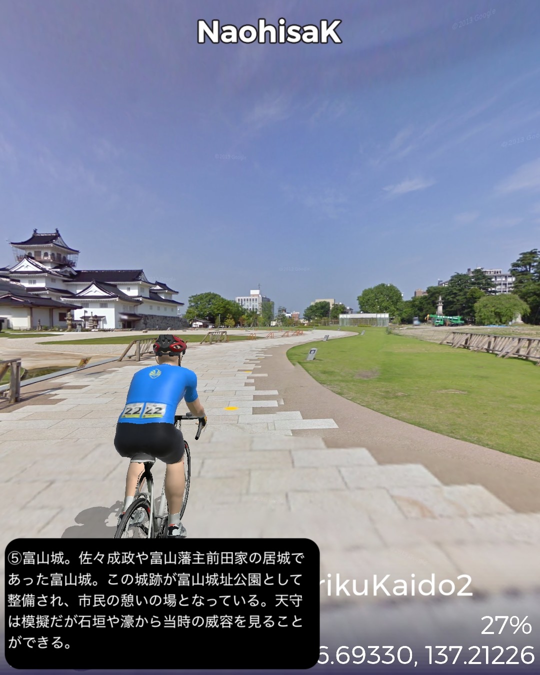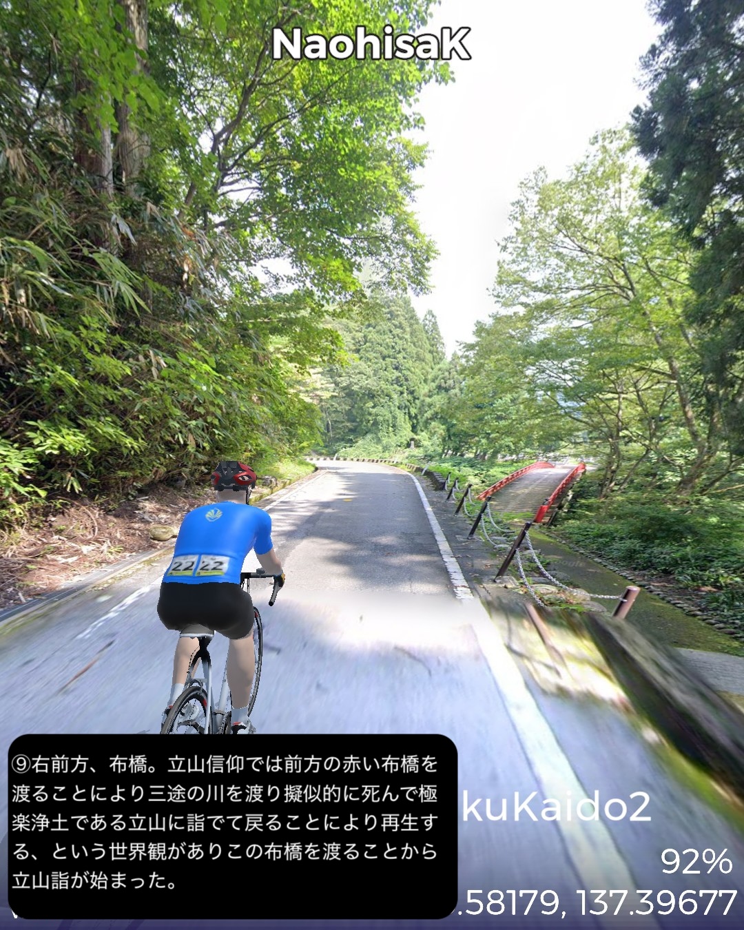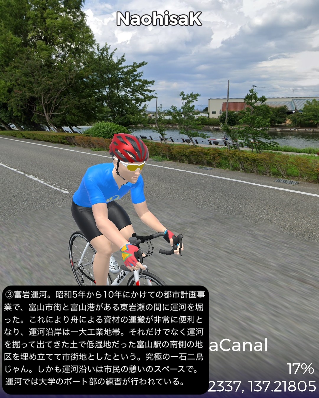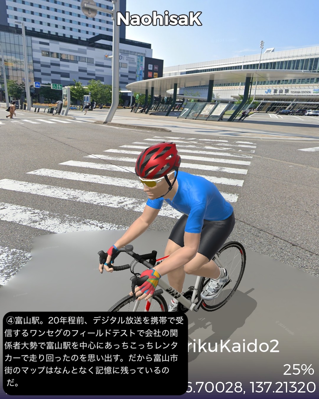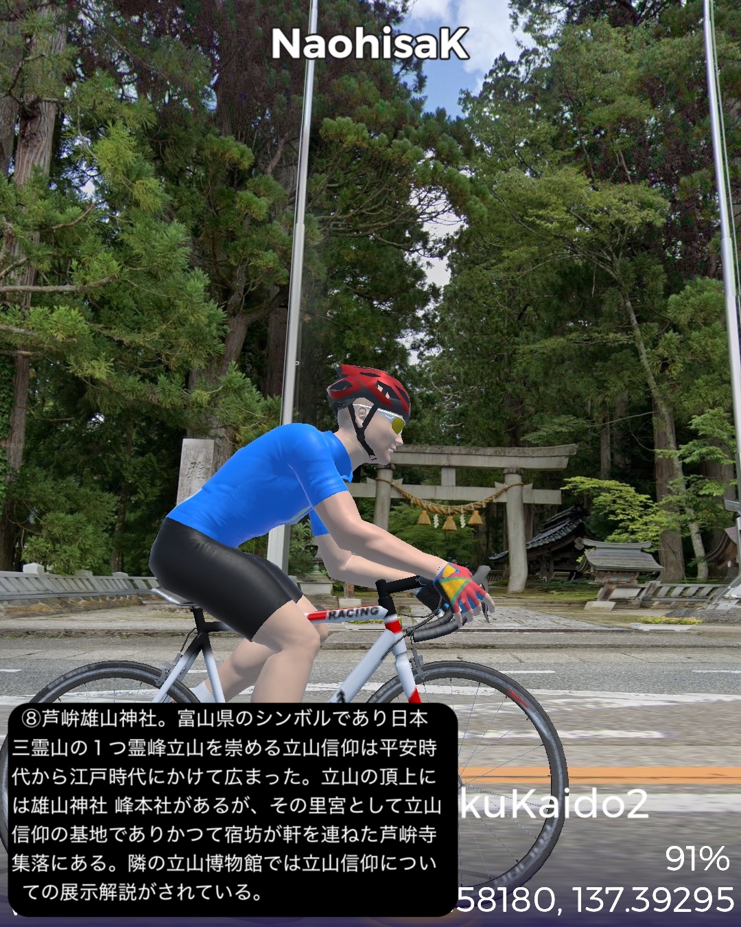 VRサイクリング 富山周辺をぐるっと一巡りの巻。前回のゴール地点滑川のほたるいかミュージアム前を出発し海沿いを進む。程なく滑川宿、そして水橋宿、さらに岩瀬宿。ここで早くも街道を離れ、南へ進路を変えて運河沿いの道を進むと富山市街。富山駅から富山城址と市街地を縦断してその後南西に向かい、越中八尾の古い町並みを一巡り。さらに今度は東へ向かい立山・黒部ルートの拠点、立山駅をゴールとする74kmの行程。北陸街道2日目と称しつつ街道を走るのは最初の海沿いの道筋だけであるが、その間の滑川宿と岩瀬宿はどちらも超弩級の宿場町であった。つまり国の有形文化財レベルの伝統的商家や屋敷がふんだんに点在し歴史的な街道景観を見事に残す町だったのだ。この2つの宿場は10kmの距離でしかも間に水橋宿という別の宿場もあり、古い家並がほぼ途絶えない道筋。ここまで密に街道の家並みの風景を残す地帯はここまでほぼ日本中回ってきたが他になかった見たことがない。特に富山港に隣接する岩瀬宿は北前船で賑わった町で大きな廻船問屋の建物が今もその栄華を伝えている。街道歩きストとしては是非歩いてみたい道だ。富山市街は20年ほど前に出張中にレンタカーで走り回った記憶があり町の地理も馴染みがあった。八尾は編み笠を被った男女が、胡弓や三味線、越中おわら節の唄に合わせて夜通し町を練り歩く「おわら風の盆」の伝統行事で知られる。親父が好きで何度も見に行っていたので、行事の時期ではないが富山出張の際にちょっと立ち寄ってみたが、山懐に抱かれた古い町並みが情緒あって心惹かれるものがあった。今回はその魅力を再確認した次第。それにしても幻想的と言われる「風の盆」行ってみたいなあ。さてゴール地点の立山町。全く知らなかったが、北アルプスの立山は日本三霊山の1つとして古くから信仰の対象となっており、独特の世界観を有する立山信仰が人々の心を捉え立山詣でが盛んだったという。この立山町の芦峅寺集落には信仰の中心となる雄山神社の里宮もあり、詣で登山のベースキャンプとしてして多くの宿坊が軒を連ねていたという。今回はなかなか濃い旅であった。ニューヨークタイムズの2025年に行くべき52箇所の1つに富山が選出されたというが、それも納得。富山深し!