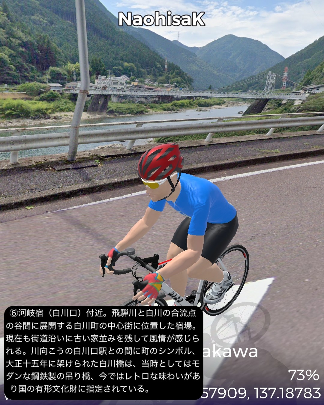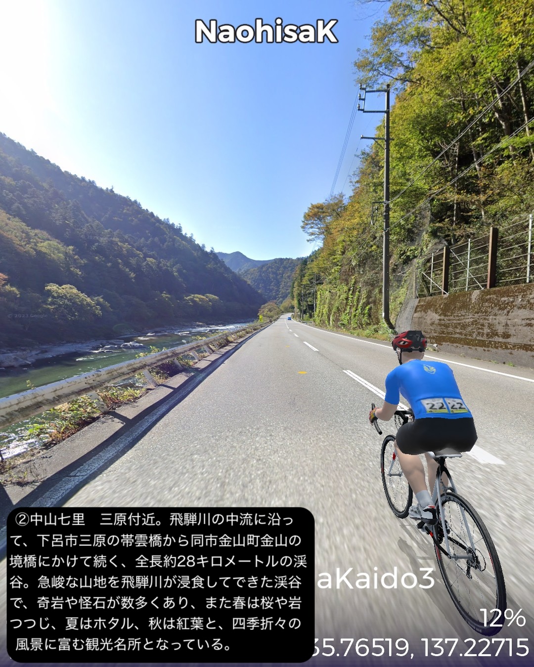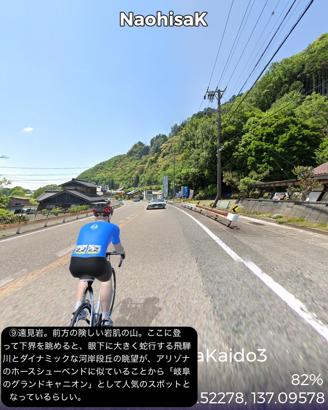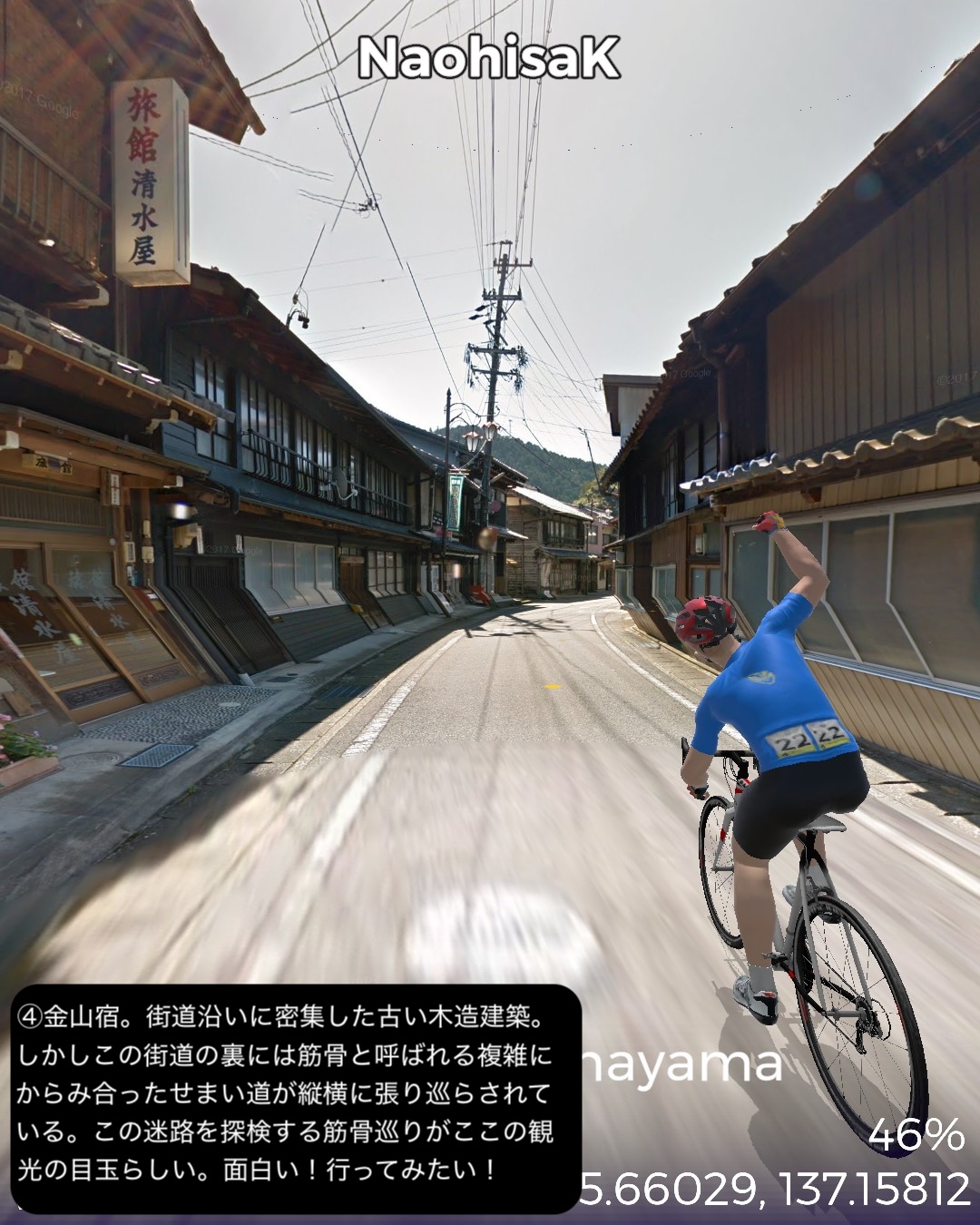 VRサイクリング 飛騨街道最終日。飛騨路から美濃路へ。延々と南へ続いた谷の回廊を走り切るの巻。名湯下呂温泉を擁する下呂宿を出発し、飛騨街道をさらに南へ、より深い峡谷へ分け入る。その険しい自然環境の中でも宿場らしい金山宿、美濃国に入って現代は白川町の中心となる河岐宿を通り、飛騨川でも最も険しい峡谷を成す飛水峡を通り抜けるとようやく広めの谷に出て長閑な田舎道を楽しみ、ラスト2マイルはほぼ直線状の古い家並みが残る旧道を進み、中山道の太田宿の街道終点をゴールとする74kmの行程。それにしても飛騨街道、古川、高山、下呂を除くと嫌というほど延々と狭い谷間の道が続き、実際の距離以上に長く感じられた。今回のルートも険しい山中をのたうち回るような蛇行を繰り返す飛騨川を、トンネルや橋でショートカットしないでできる限り旧道の川に沿った道を辿って行った。険しい谷はその昔集中豪雨による飛騨川バス転落事故という104名もの死亡者の出た日本バス事故史上最悪の悲劇を起こした。しかしこのような険しい旅路の合間に現れる宿場町がまたいいのだ。特に金山宿。街道沿いに密集した古い木造建築群。これだけでも宿場の情緒溢れる街並みと言えるが、ここが凄いのはこの街道の裏に「筋骨」と呼ばれる複雑にからみ合った狭い道が縦横に張り巡らされていて、この迷路を探検する「筋骨巡り」がここの観光の目玉ということなのだ。何か奥行きの知れない凄みのある街ではないか。さてようやく重苦しいとも言える谷間を脱して2022年10月以来の中山道太田宿へ辿り着いたところで次は大都会名古屋へ向かう。