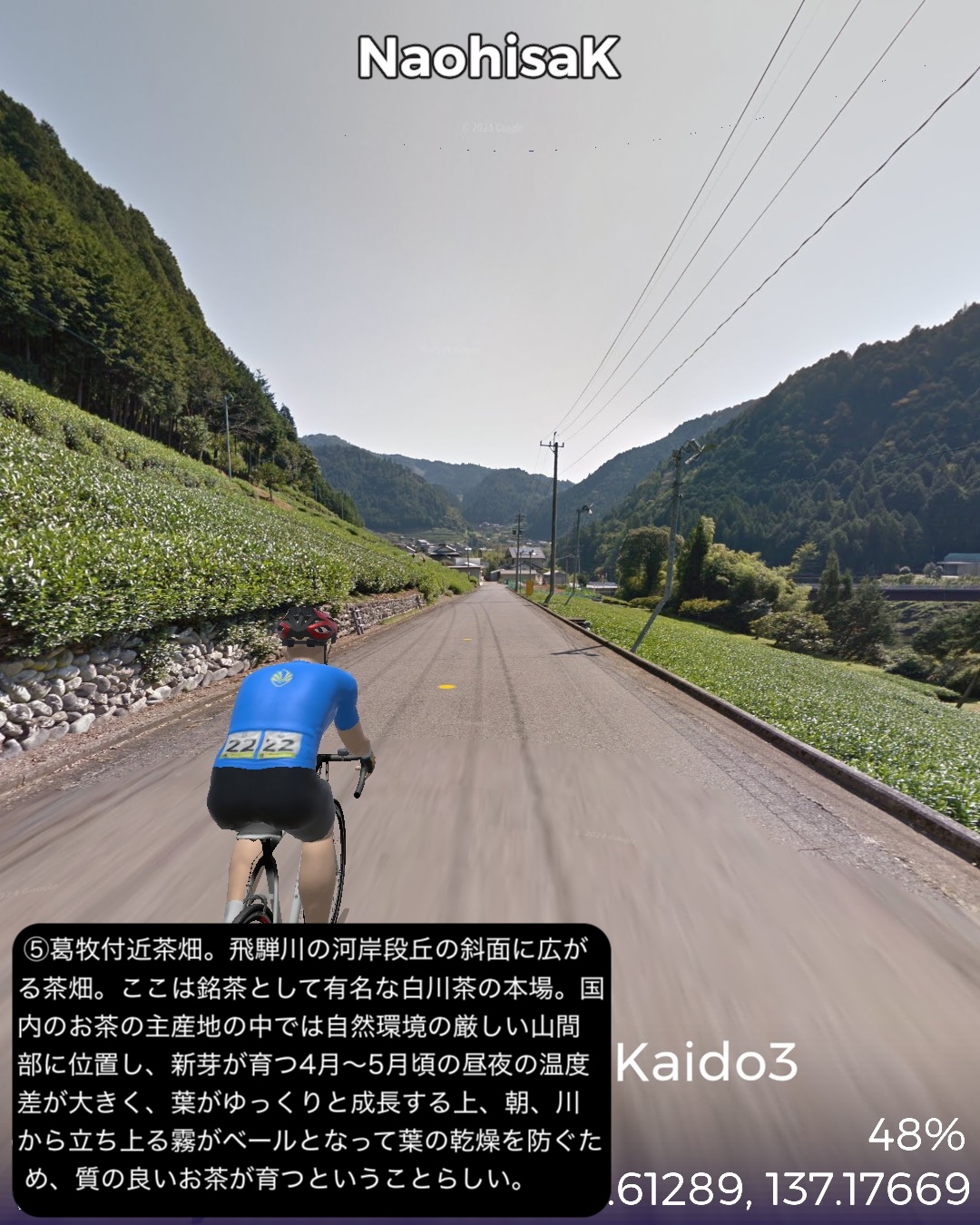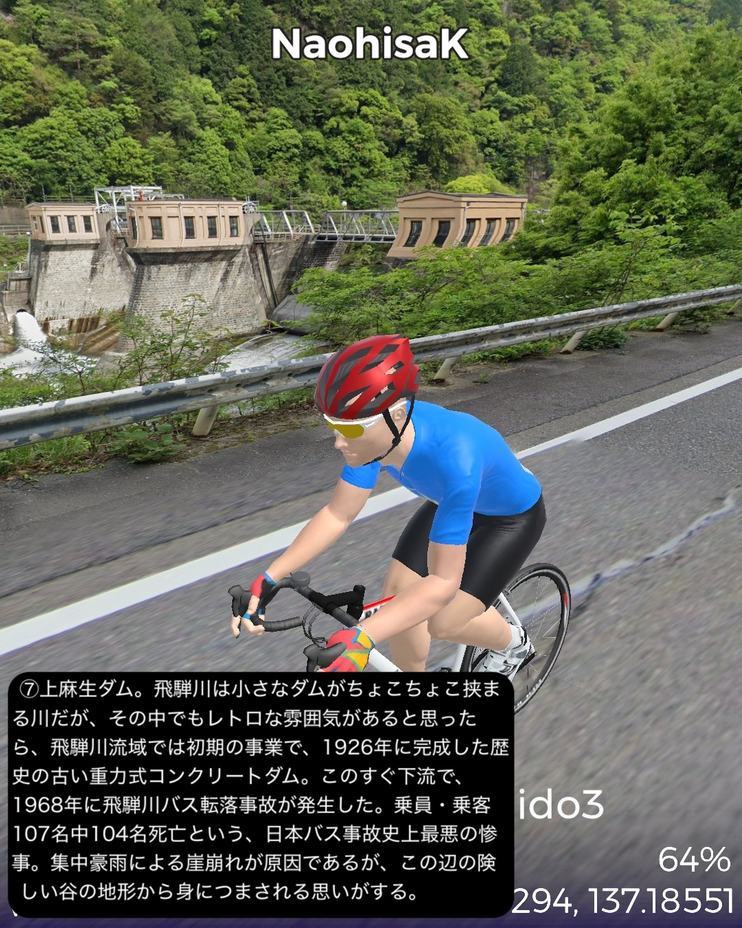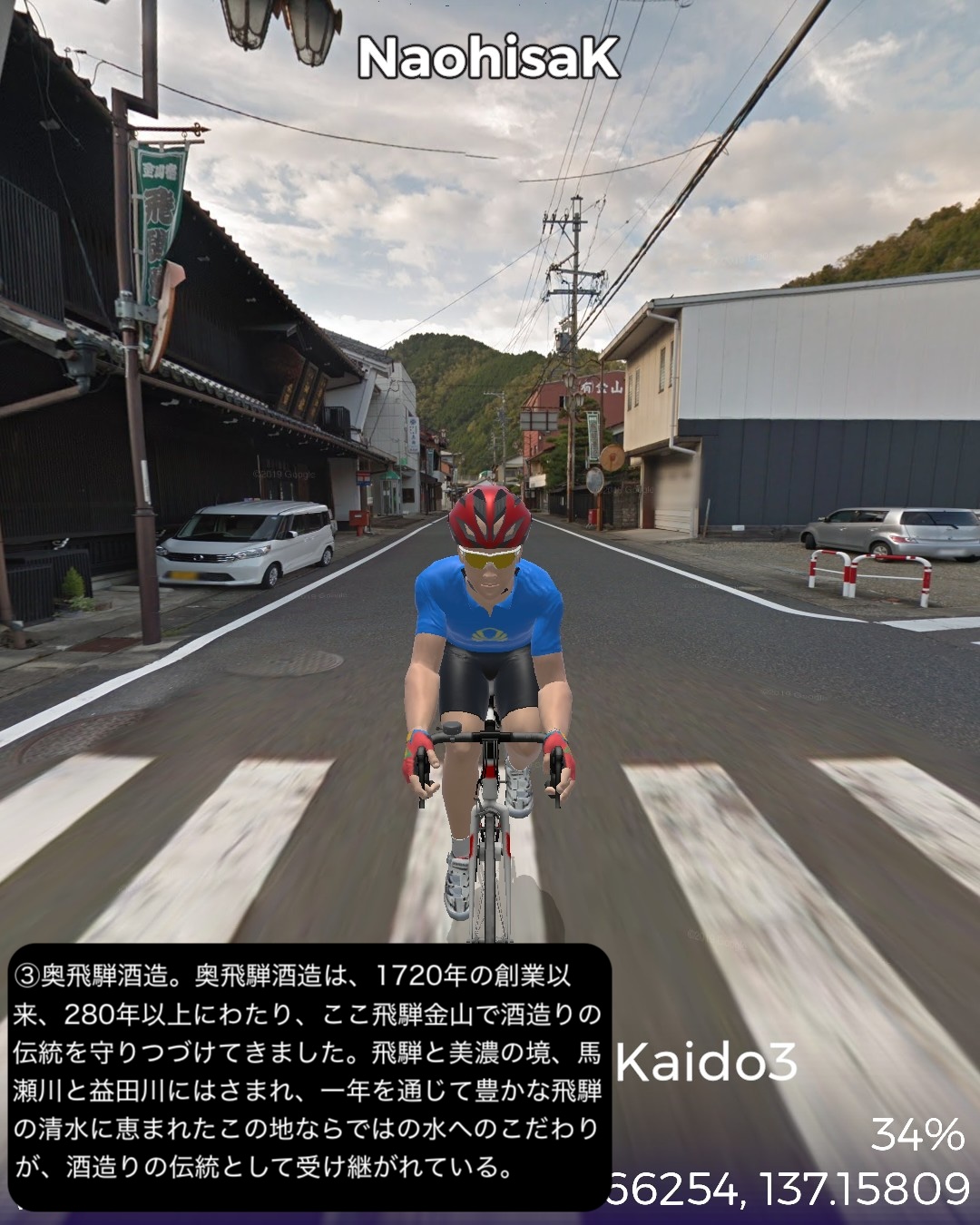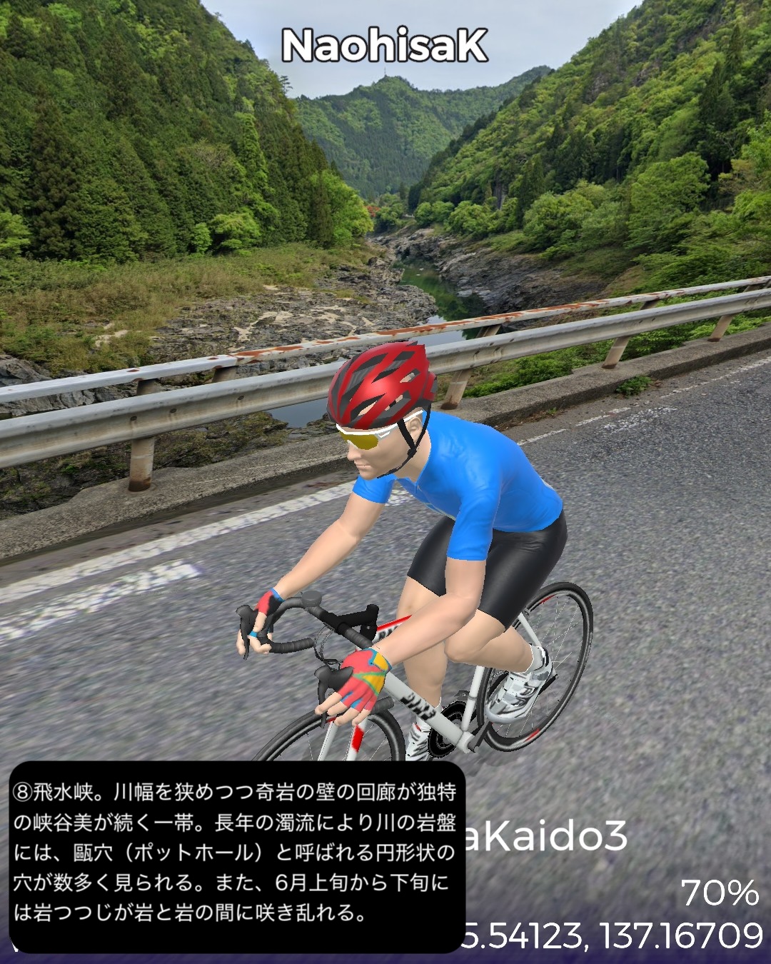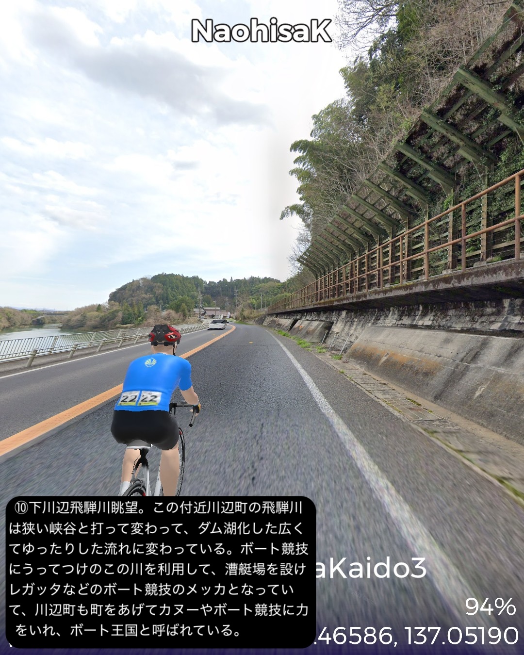 VRサイクリング 飛騨街道最終日。飛騨路から美濃路へ。延々と南へ続いた谷の回廊を走り切るの巻。名湯下呂温泉を擁する下呂宿を出発し、飛騨街道をさらに南へ、より深い峡谷へ分け入る。その険しい自然環境の中でも宿場らしい金山宿、美濃国に入って現代は白川町の中心となる河岐宿を通り、飛騨川でも最も険しい峡谷を成す飛水峡を通り抜けるとようやく広めの谷に出て長閑な田舎道を楽しみ、ラスト2マイルはほぼ直線状の古い家並みが残る旧道を進み、中山道の太田宿の街道終点をゴールとする74kmの行程。それにしても飛騨街道、古川、高山、下呂を除くと嫌というほど延々と狭い谷間の道が続き、実際の距離以上に長く感じられた。今回のルートも険しい山中をのたうち回るような蛇行を繰り返す飛騨川を、トンネルや橋でショートカットしないでできる限り旧道の川に沿った道を辿って行った。険しい谷はその昔集中豪雨による飛騨川バス転落事故という104名もの死亡者の出た日本バス事故史上最悪の悲劇を起こした。しかしこのような険しい旅路の合間に現れる宿場町がまたいいのだ。特に金山宿。街道沿いに密集した古い木造建築群。これだけでも宿場の情緒溢れる街並みと言えるが、ここが凄いのはこの街道の裏に「筋骨」と呼ばれる複雑にからみ合った狭い道が縦横に張り巡らされていて、この迷路を探検する「筋骨巡り」がここの観光の目玉ということなのだ。何か奥行きの知れない凄みのある街ではないか。さてようやく重苦しいとも言える谷間を脱して2022年10月以来の中山道太田宿へ辿り着いたところで次は大都会名古屋へ向かう。
