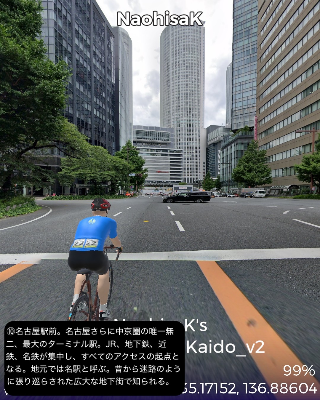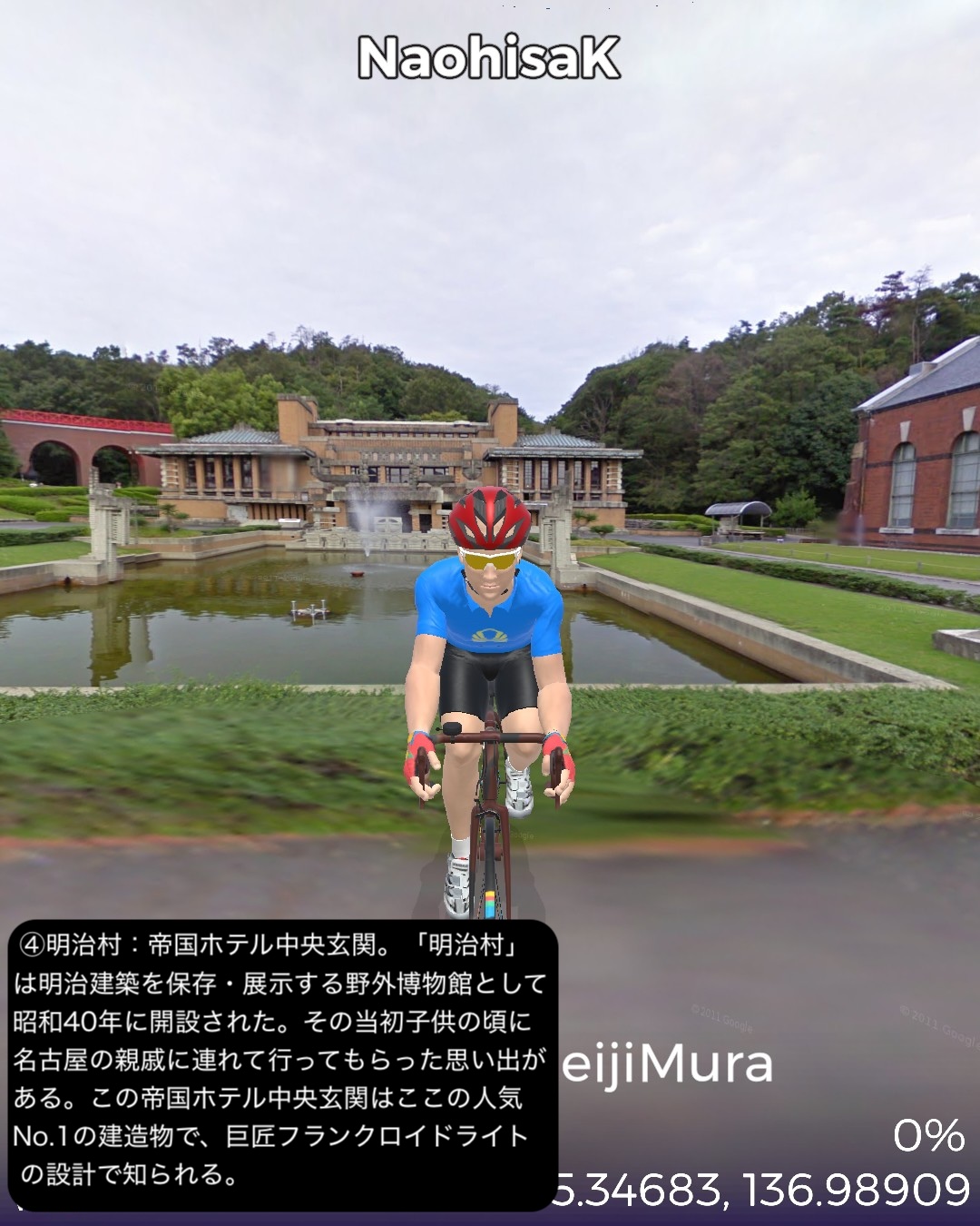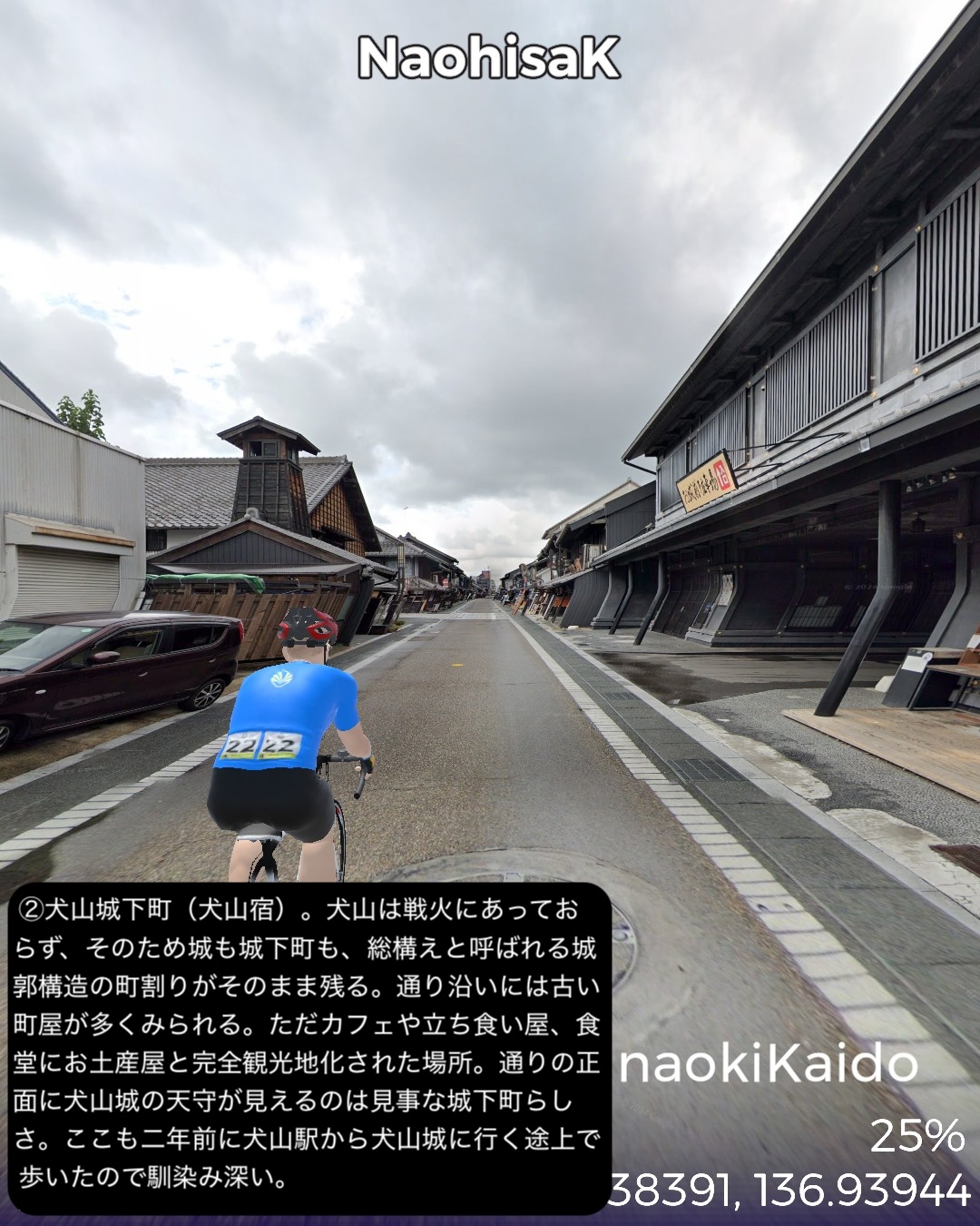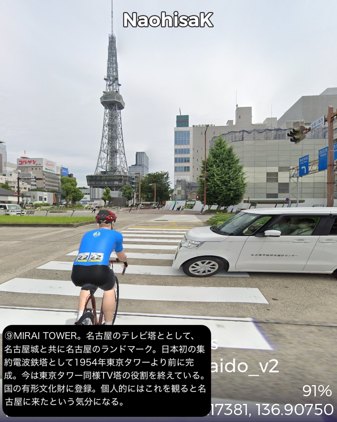 VRサイクリング 大都市名古屋へ到着の巻。飛騨街道終点でもある中山道太田宿を出発し、国道41号を通って城下町犬山へ。ここから犬山稲置街道に入り犬山城下町として観光地化された犬山宿を通りぬける。ここで早くも街道を外れて犬山近郊の明治村へ寄り道。また街道へ戻り南下すると次第に名古屋の都市圏の街並みに変わってゆく。小牧宿を通り名古屋空港や航空自衛隊基地の脇を抜け、春日井市から庄内川を渡ると名古屋市街。ランドマークの名古屋城、栄のテレビ塔をぐるっと表敬訪問してからゴールの名古屋駅に辿り着く58kmの行程。犬山は2年前にリアルに訪れたばかりだが、現存する日本最古の天守を持つ犬山城のプレゼンスが凄い。木曽川沿いの小高い丘の上に聳える天守はThe城という風格が漂う。天守からの眺めは多分日本の全ての城でもBestであろう。犬山宿は伝統的な商家が建ち並び正面に犬山城が見える街並みが、まさに犬山城下町という名称そのままの雰囲気で、ちょっと観光地化されすぎているきらいはあるが唯一無二の情緒があって良い。明治村は今年で60周年となるがまだ開園したばかりの子供の頃に名古屋の親戚に連れて行ってもらったのが思い出深い。昨年リアルに訪れた札幌の開拓村が似たようなコンセプトだが、さすが本家だけあって明治村の方が規模が大きい。フランクロイドライトの設計による帝国ホテルの正面玄関や北里柴三郎が設立した北里研究所本館など見どころも多い。また訪れてみたい場所だ。そして久々の大都会名古屋。ずっと中部地方の田舎を転々としてきた流れなので、都会に出てきた田舎者のように目まぐるしい景色に映る。母方の親戚が多く住んでいて子供の頃から訪れてお世話になってきた懐かしい街でもある。次回は番外編で名古屋市街と郊外の懐かしい場所や行ってみたかった場所を一巡りする。