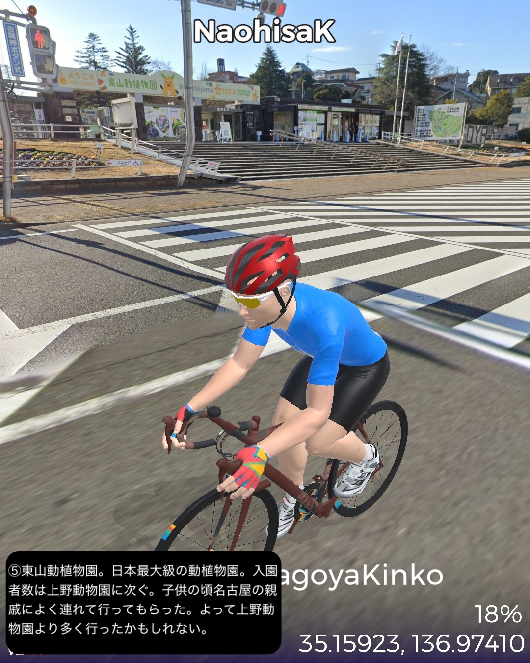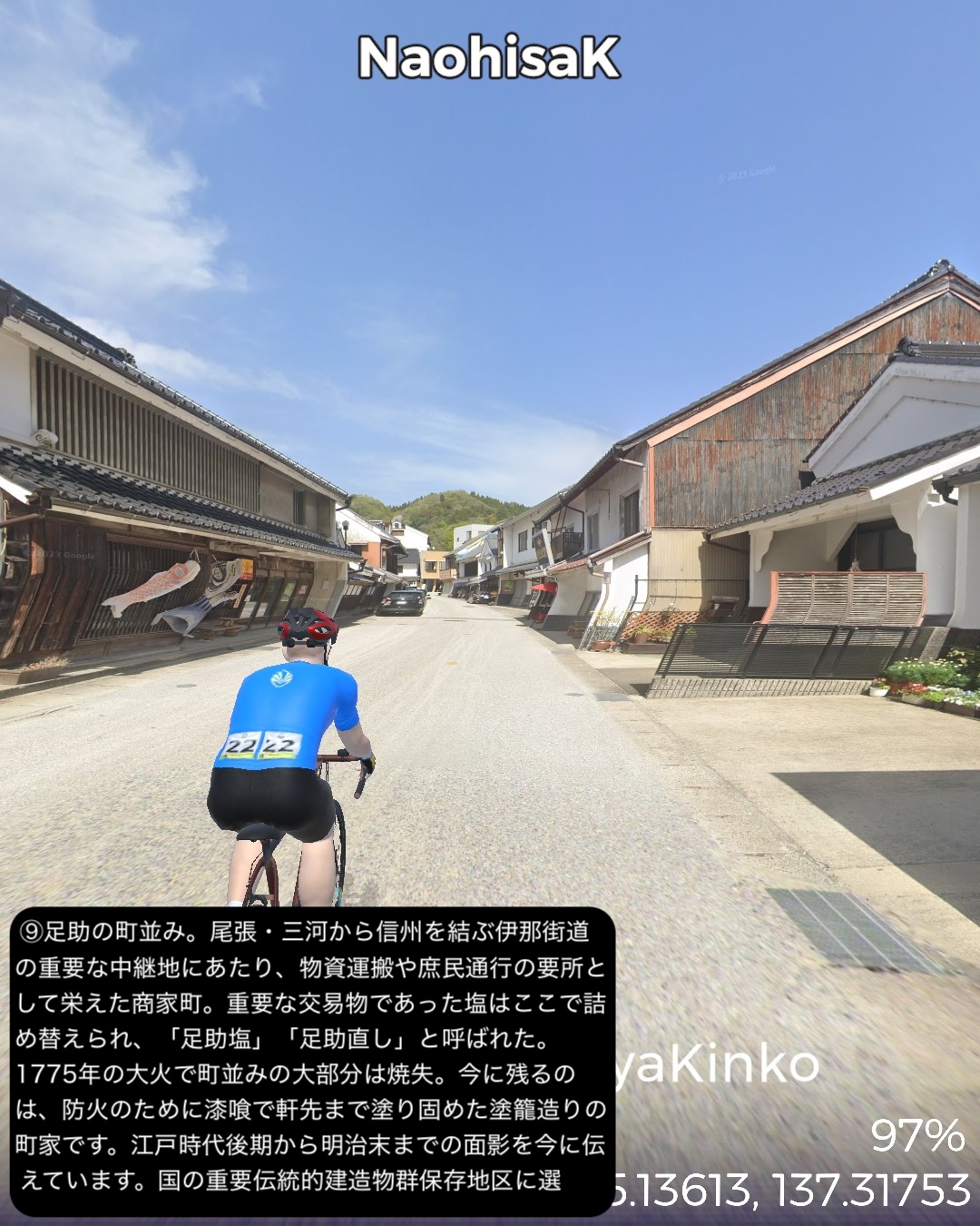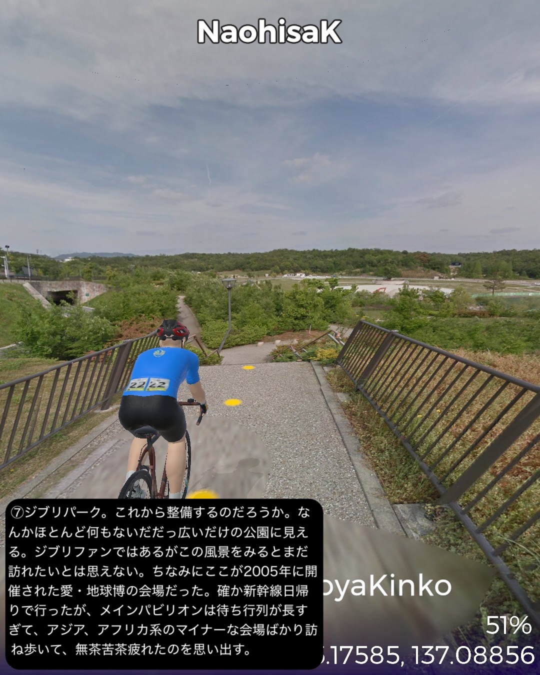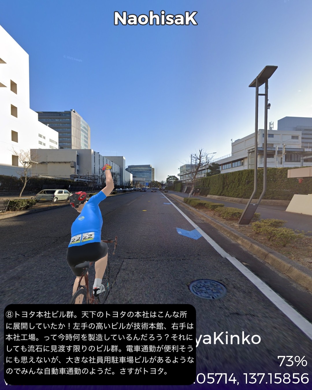 VRサイクリング 今回は番外編として名古屋市内の懐かしい場所や行って見たかった場所、そして名古屋近郊の行ってみたかった場所を網羅してみましたの巻。名古屋市内は以下の順。名古屋駅→名古屋市科学館(子供の頃親戚によく連れて行ってもらって私の理科系が萠えた場所)→大須観音(モダンな名古屋中心部には珍しいレトロな一角)→矢場町(親戚が住んでいてひたすら懐かしい一角)→徳川園(中には入れないが行ってみたい庭園)→東山公園(子供の頃、上野動物園以上によく連れていってもらった動物園)それから北東へ進み瀬戸物の語源となった陶磁器の生産地瀬戸では窯が集まっている一角を巡った。名古屋近辺の焼物の町ではちょっと前に訪れた常滑の方がより情緒があったかな。次に隣町長久手の愛・地球博が昔開催された跡地で記念公園となり一部は最近ジブリパークとして人気を集めているようなのだが、ちょっと覗いただけの感じでは単なるだだっ広いピクニック公園にしか思えずどこがジブリなの?という印象。それから南南東へ大都市圏とは思えないような殺風景な丘陵地を進むと急にトヨタ自動車の城下町豊田市街に出る。トヨタの本社や本社工場が延々と建ち並ぶのはその郊外。さすが世界のトヨタの中心だけあってさすがのスケール感。周囲にはダイハツやスズキの販売店はあっても日産、ホンダは見当たらず。走ってる車もトヨタしか目につかずの王国でありました。そこから最後に北東の山の中へ進み、豊田市内ではあるが結構深い谷の中に終点とした国の重要伝統的建造物保存地区の足助と有名な紅葉の名所香嵐渓に到着。ここは写真などで見て行ってみたかった場所だが、足助という古い街並み散策と紅葉の渓谷散策両方が楽しめるところとは知らなかった。名古屋市内からはかなりの距離ではあるが一度足を運んでみたい場所だ。次回は名古屋から岐阜へと進む。