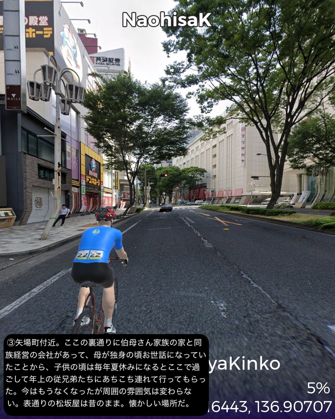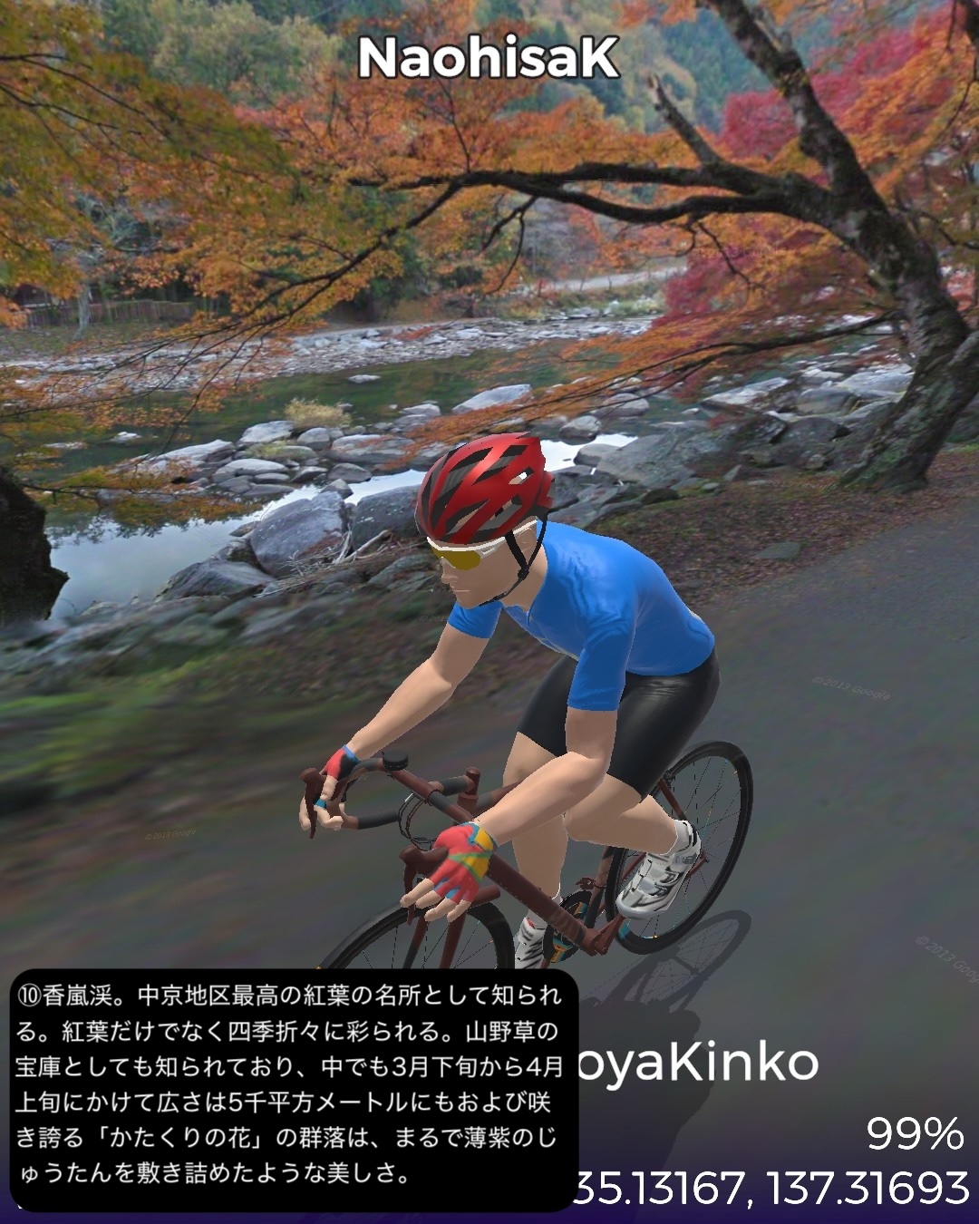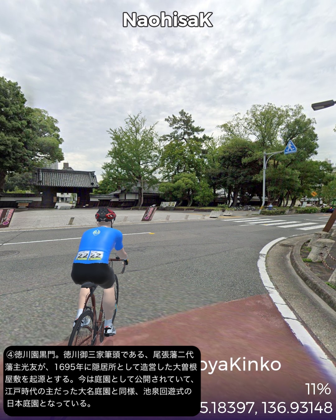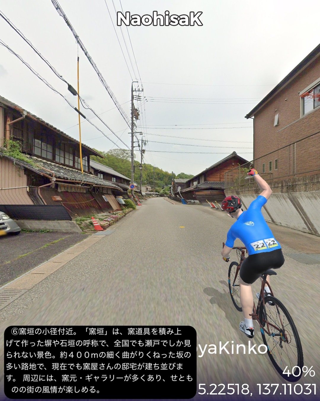 VRサイクリング 今回は番外編として名古屋市内の懐かしい場所や行って見たかった場所、そして名古屋近郊の行ってみたかった場所を網羅してみましたの巻。名古屋市内は以下の順。名古屋駅→名古屋市科学館(子供の頃親戚によく連れて行ってもらって私の理科系が萠えた場所)→大須観音(モダンな名古屋中心部には珍しいレトロな一角)→矢場町(親戚が住んでいてひたすら懐かしい一角)→徳川園(中には入れないが行ってみたい庭園)→東山公園(子供の頃、上野動物園以上によく連れていってもらった動物園)それから北東へ進み瀬戸物の語源となった陶磁器の生産地瀬戸では窯が集まっている一角を巡った。名古屋近辺の焼物の町ではちょっと前に訪れた常滑の方がより情緒があったかな。次に隣町長久手の愛・地球博が昔開催された跡地で記念公園となり一部は最近ジブリパークとして人気を集めているようなのだが、ちょっと覗いただけの感じでは単なるだだっ広いピクニック公園にしか思えずどこがジブリなの?という印象。それから南南東へ大都市圏とは思えないような殺風景な丘陵地を進むと急にトヨタ自動車の城下町豊田市街に出る。トヨタの本社や本社工場が延々と建ち並ぶのはその郊外。さすが世界のトヨタの中心だけあってさすがのスケール感。周囲にはダイハツやスズキの販売店はあっても日産、ホンダは見当たらず。走ってる車もトヨタしか目につかずの王国でありました。そこから最後に北東の山の中へ進み、豊田市内ではあるが結構深い谷の中に終点とした国の重要伝統的建造物保存地区の足助と有名な紅葉の名所香嵐渓に到着。ここは写真などで見て行ってみたかった場所だが、足助という古い街並み散策と紅葉の渓谷散策両方が楽しめるところとは知らなかった。名古屋市内からはかなりの距離ではあるが一度足を運んでみたい場所だ。次回は名古屋から岐阜へと進む。