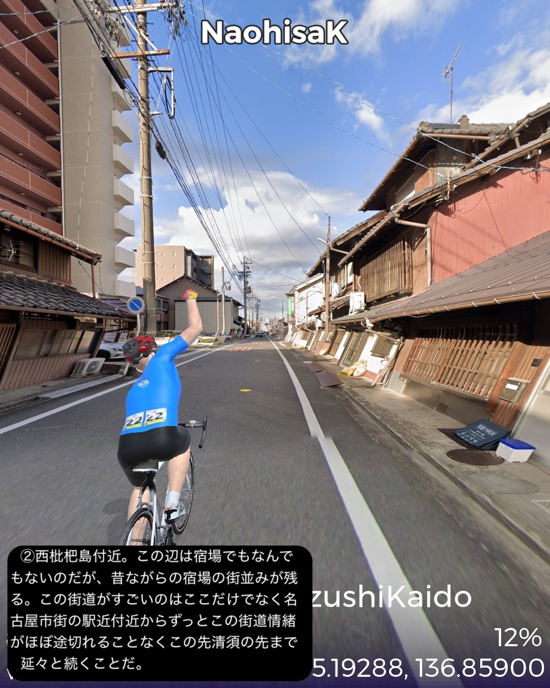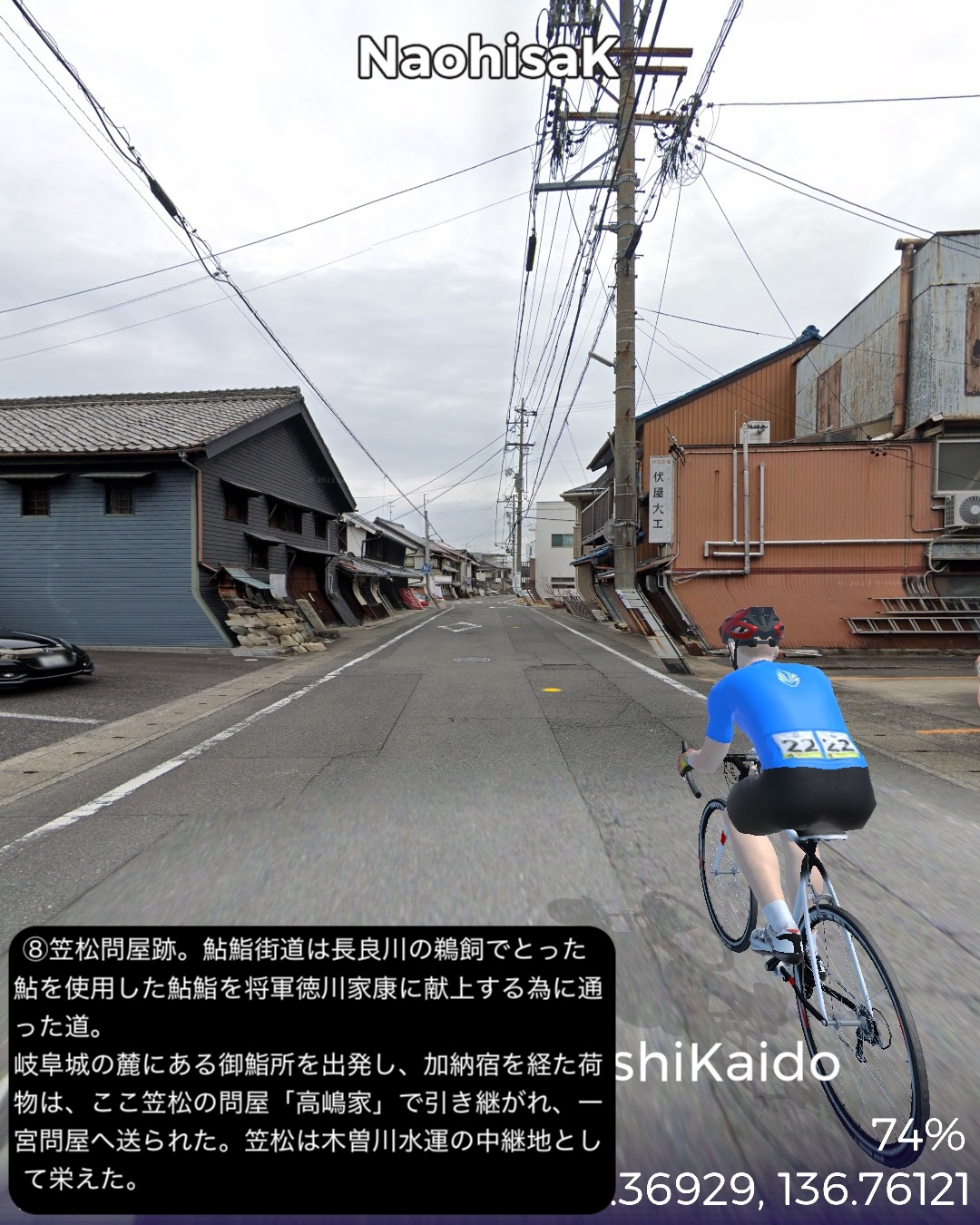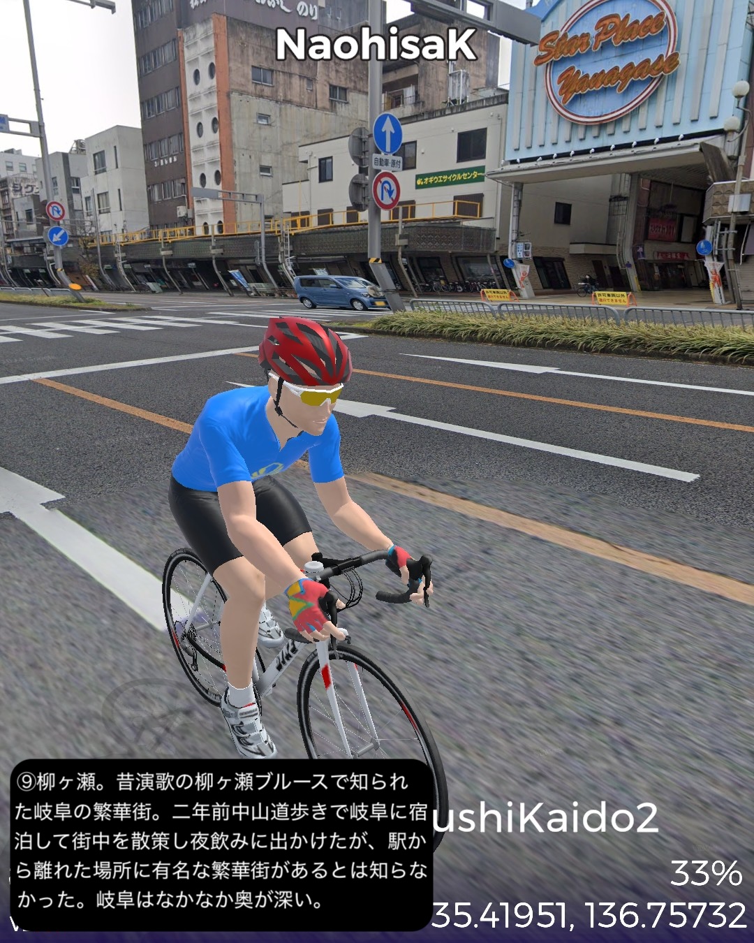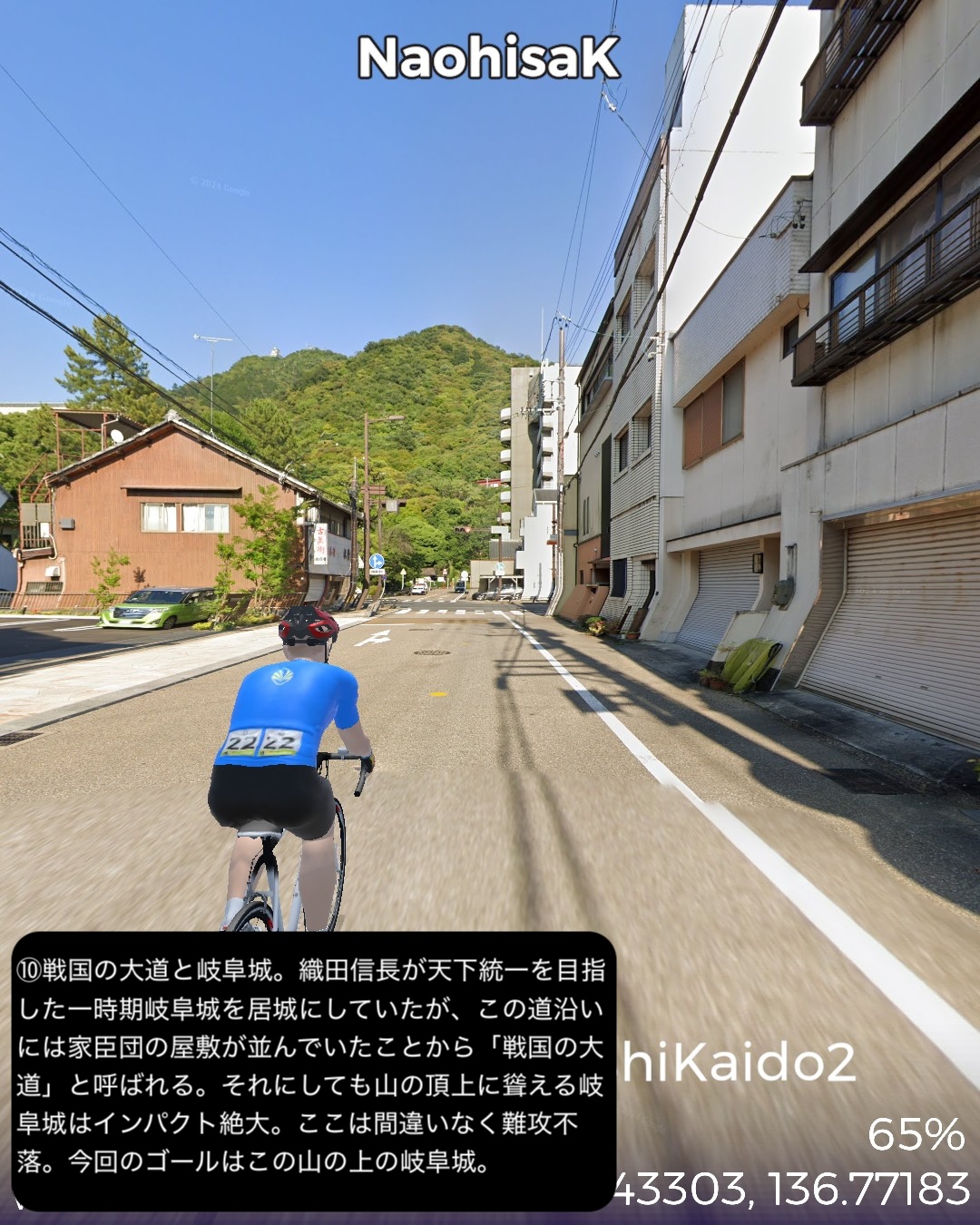 VRサイクリング 由緒ある街道を辿って名古屋から岐阜へ至るの巻。名古屋は名古屋駅近の四間道をスタートしまず美濃路を進み織田信長の居城で知られる清洲城のあった清洲宿を過ぎ、その先四ツ家追分から鮎鮨街道(岐阜街道)に入り、一宮宿を過ぎ、古い街並みの残る黒田を過ぎるとまもなく木曽川。その先には笠松を通り、しばらく進むと早くも岐阜市街に入り中山道の加納宿にぶつかるが、これも抜けて岐阜駅、柳ヶ瀬と繁華街を冷やかして岐阜市街の北端に位置する岐阜公園から金華山への登山道に入り頂上に建つ岐阜城をゴールとする43kmの久々の短距離の行程。前半の美濃路は名古屋と中山道垂井宿を結ぶ街道で、関ヶ原の合戦で勝利した徳川軍が凱旋した道筋であるが、江戸時代は、上方への難所の少ないルートとして広く利用されて賑やかな街道だったらしい。そのせいか名古屋駅近付近で美濃路に入ってから清洲の先の四ツ家追分までほぼ街道情緒を継続して感じさせる道筋で、渋い木造建築の住居や商家が頻繁に出現して飽きさせなかった。ここは歩いても楽しめそうだなあと街道歩きストは感じたのでありました。そう言えば清洲って地名として聞いたことはあり尾張にあることは知っていても具体的な場所を認知していなかったが、本当に名古屋から2駅ぐらいの近い場所で、模擬ではあるが立派な天守の清洲城が再現されていた。街並みも観光地化されていない落ち着いた古い街並みが和む。四ツ家追分から名古屋の大きな衛星都市一宮までは街道らしさは一旦消滅したが、一宮の先、山内一豊の出身地でもあり江戸時代以前に宿場として栄えた黒田や木曽川を渡った先の川湊として栄え街道の中継機能を担う問屋場のあった笠松など鮎鮨街道もなかなかいいじゃないかという街道らしさが見えてきたのだった。岐阜はVRでも2022年8月に中山道の宿場加納宿を通過しているが、その後リアルでも中山道歩きで2023年に訪れて馴染み深かった。今回は今まで訪れていなかった、岐阜のNo.1観光スポットとして知られる岐阜城までVRで山道も進んで足を運んでみたが、VR的には麓から山の頂上に鎮座する岐阜城がインパクトあって良かった。さて次回はまた飽きもせず岐阜から長良川に沿って山の中へ分け入ってゆく。