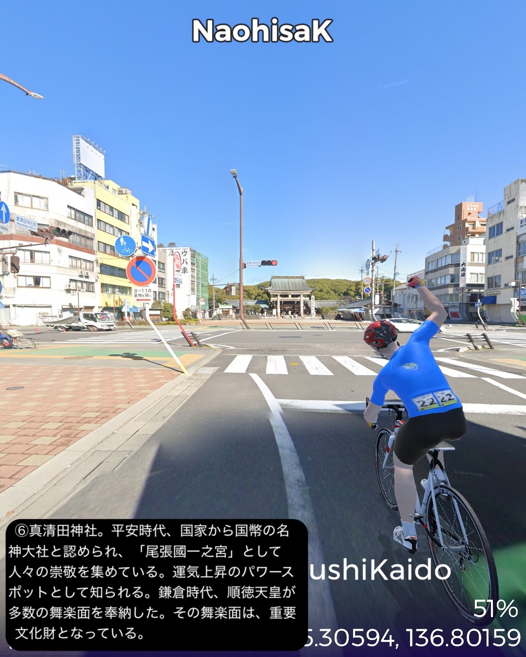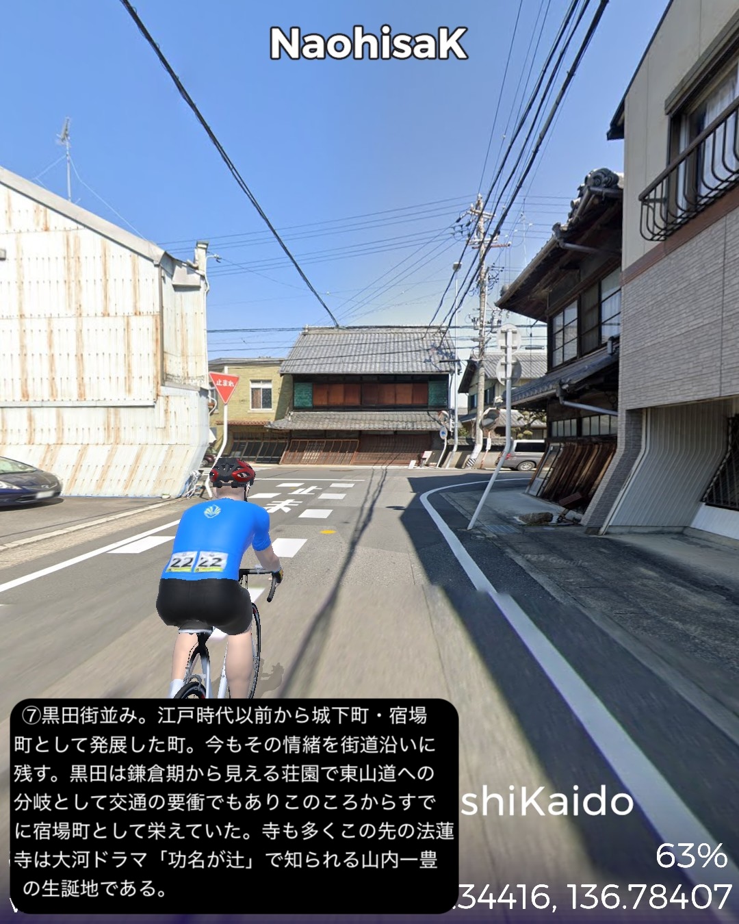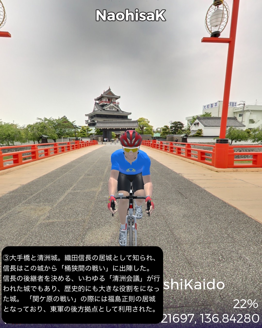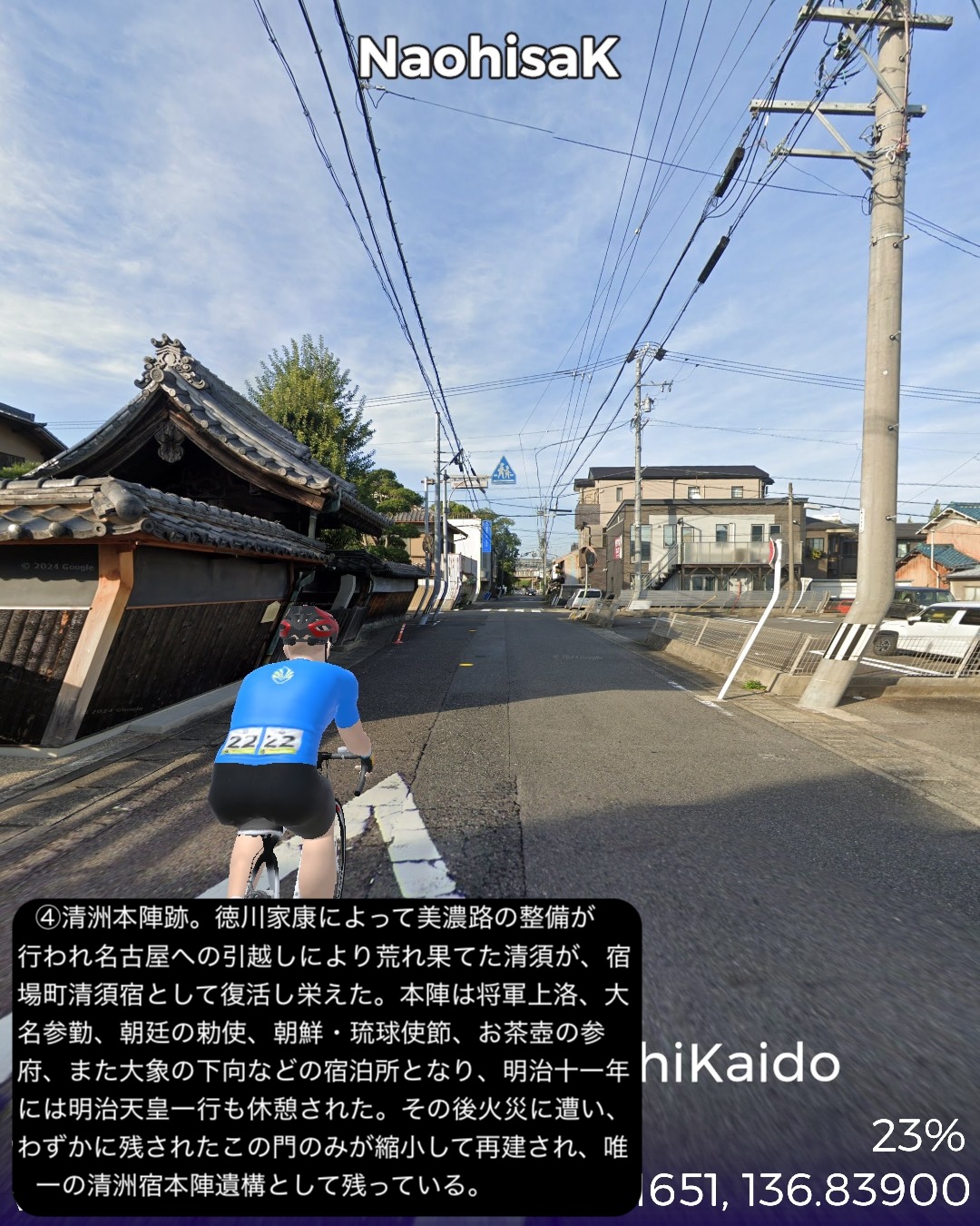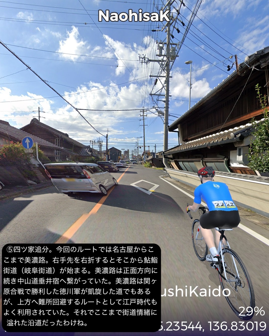 VRサイクリング 由緒ある街道を辿って名古屋から岐阜へ至るの巻。名古屋は名古屋駅近の四間道をスタートしまず美濃路を進み織田信長の居城で知られる清洲城のあった清洲宿を過ぎ、その先四ツ家追分から鮎鮨街道(岐阜街道)に入り、一宮宿を過ぎ、古い街並みの残る黒田を過ぎるとまもなく木曽川。その先には笠松を通り、しばらく進むと早くも岐阜市街に入り中山道の加納宿にぶつかるが、これも抜けて岐阜駅、柳ヶ瀬と繁華街を冷やかして岐阜市街の北端に位置する岐阜公園から金華山への登山道に入り頂上に建つ岐阜城をゴールとする43kmの久々の短距離の行程。前半の美濃路は名古屋と中山道垂井宿を結ぶ街道で、関ヶ原の合戦で勝利した徳川軍が凱旋した道筋であるが、江戸時代は、上方への難所の少ないルートとして広く利用されて賑やかな街道だったらしい。そのせいか名古屋駅近付近で美濃路に入ってから清洲の先の四ツ家追分までほぼ街道情緒を継続して感じさせる道筋で、渋い木造建築の住居や商家が頻繁に出現して飽きさせなかった。ここは歩いても楽しめそうだなあと街道歩きストは感じたのでありました。そう言えば清洲って地名として聞いたことはあり尾張にあることは知っていても具体的な場所を認知していなかったが、本当に名古屋から2駅ぐらいの近い場所で、模擬ではあるが立派な天守の清洲城が再現されていた。街並みも観光地化されていない落ち着いた古い街並みが和む。四ツ家追分から名古屋の大きな衛星都市一宮までは街道らしさは一旦消滅したが、一宮の先、山内一豊の出身地でもあり江戸時代以前に宿場として栄えた黒田や木曽川を渡った先の川湊として栄え街道の中継機能を担う問屋場のあった笠松など鮎鮨街道もなかなかいいじゃないかという街道らしさが見えてきたのだった。岐阜はVRでも2022年8月に中山道の宿場加納宿を通過しているが、その後リアルでも中山道歩きで2023年に訪れて馴染み深かった。今回は今まで訪れていなかった、岐阜のNo.1観光スポットとして知られる岐阜城までVRで山道も進んで足を運んでみたが、VR的には麓から山の頂上に鎮座する岐阜城がインパクトあって良かった。さて次回はまた飽きもせず岐阜から長良川に沿って山の中へ分け入ってゆく。