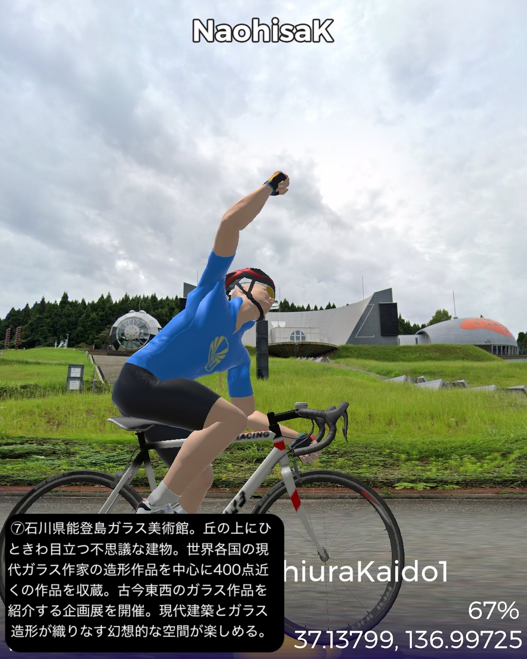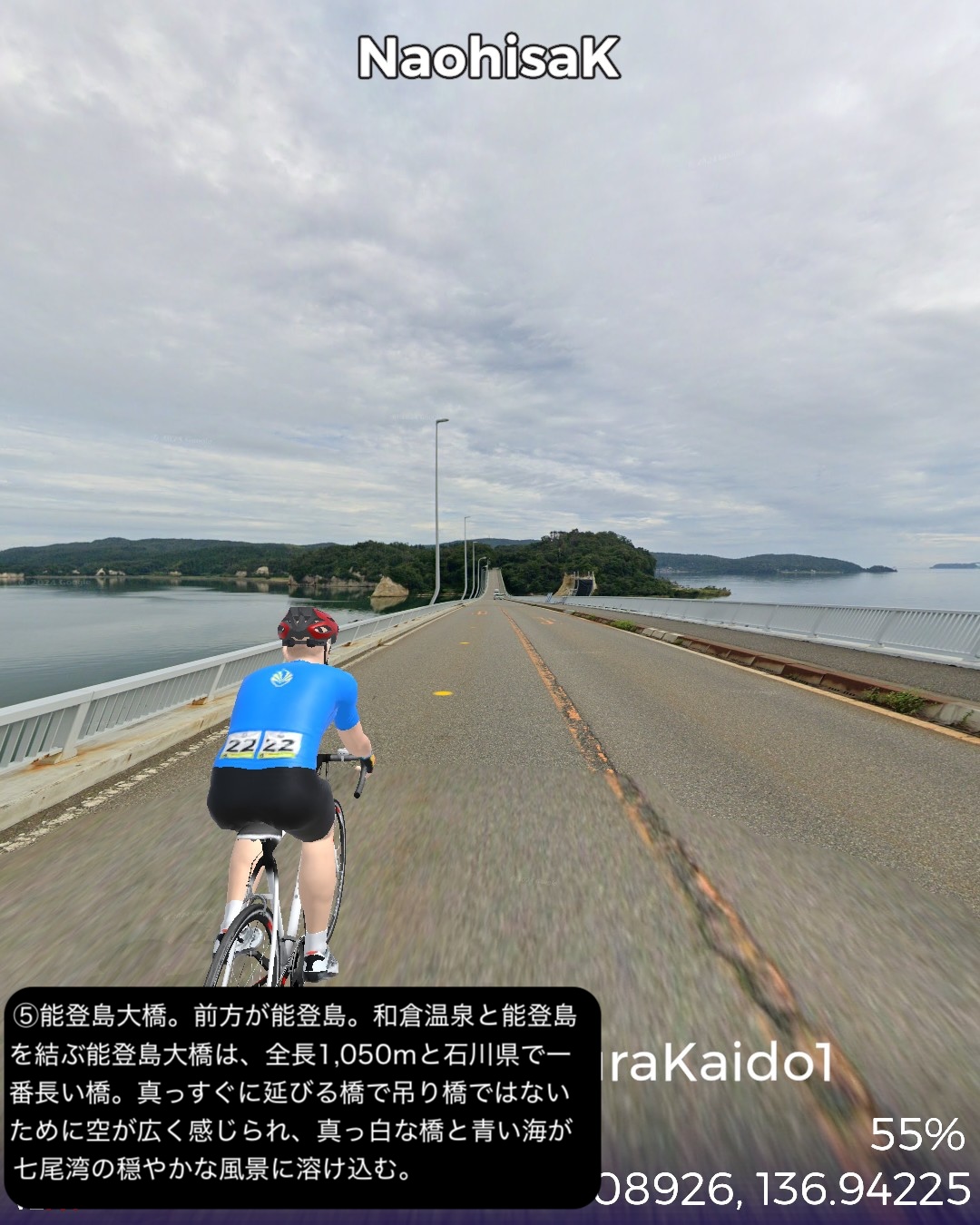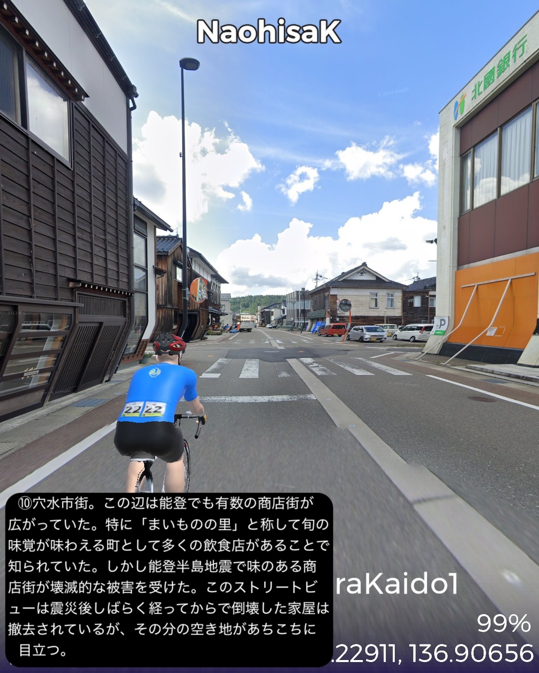 VRサイクリング 能登半島南東部を北上する。氷見のひみ番屋街をスタートし、内浦街道に入る。富山湾沿いに北上、石川県に入り能登南部の中心都市七尾市街を通り抜けその先の有名な温泉地和倉温泉街を一巡りした後、一旦街道から抜けて能登島大橋を渡り能登島へ入る。能登島西部をぐるっと回って島の西端に架かるもう一つの橋ツインブリッジのとを渡って再度内浦街道に入る。能登半島東海岸内浦の海岸の道を北上し能登半島中部のターミナル的な町穴水の駅前付近をゴールとする81kmの行程。昨年の正月を襲った能登半島地震は報道的には北部の珠洲市や輪島市の被害が取り上げられることが多かったが、今回走ってみると中南部もかなりの被害に見舞われたことを体感した。南部の七尾市街も古い町並みの一部で半壊した建物やブルーシートが覆われて改修中の建物が散見されたが、中部の穴水まで来ると被害は大きく商店街の中の全壊した建物は撤去されて所々空き地になっていた。どちらの町も残っている町並みからも古き良き町並みが保存されていたのに、どうやら味のある古い木造家屋がやられているので残念な状況になってしまったようだ。地震がなければ心洗われる旅が期待された能登だったが、今後はさらに災害の爪痕が生々しく残る土地を巡る重苦しい旅になりそうな予感。そんな中でも七尾から能登島そして穴水に至る内浦の穏やかな海岸風景は美しく癒された。次回は能登半島先端に向けてさらに内浦の海岸線沿いに進む。