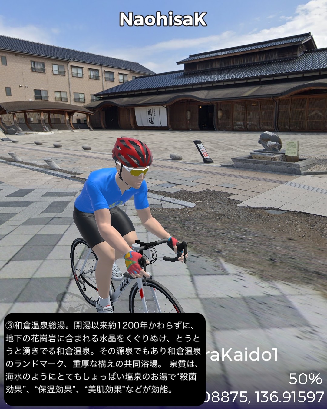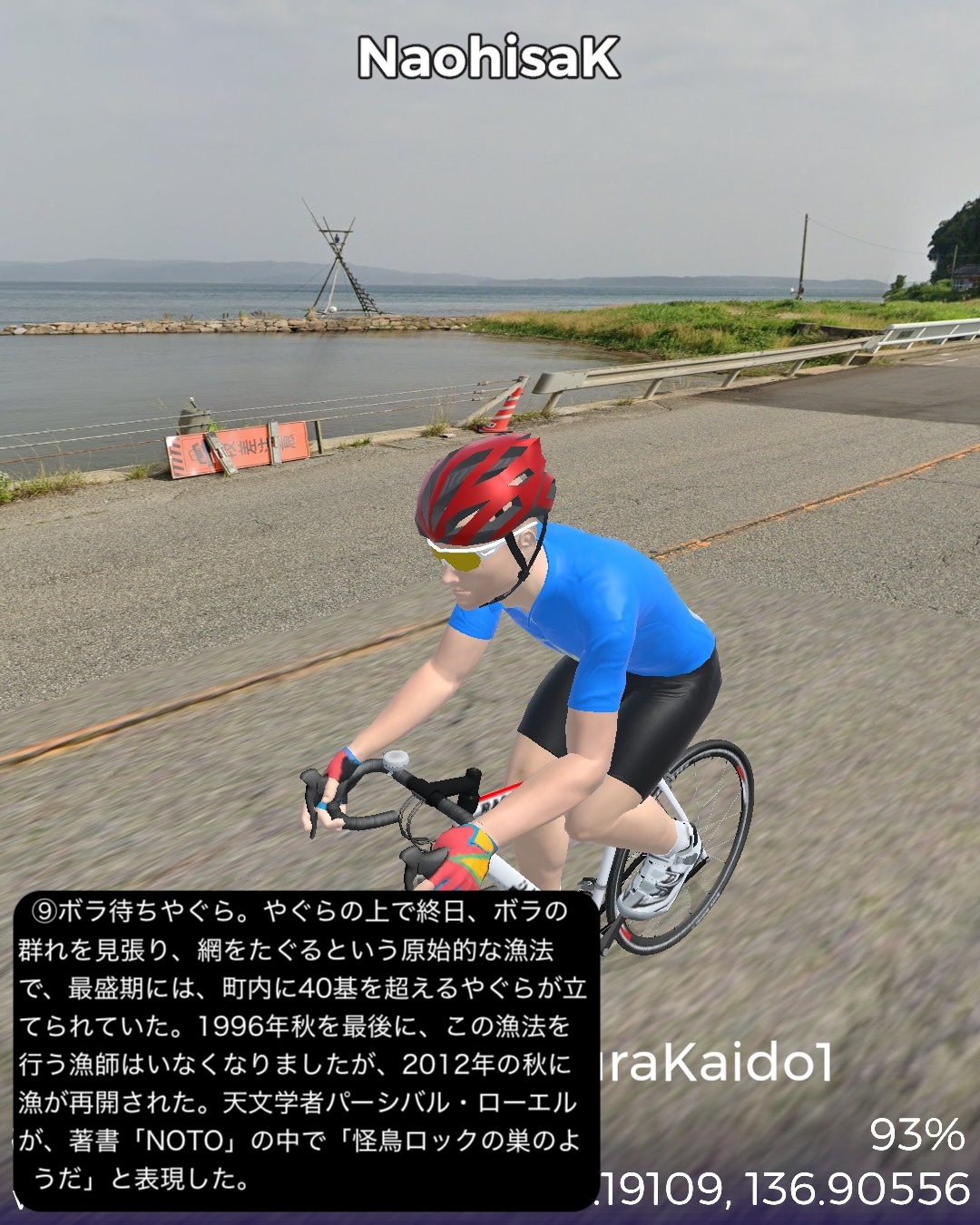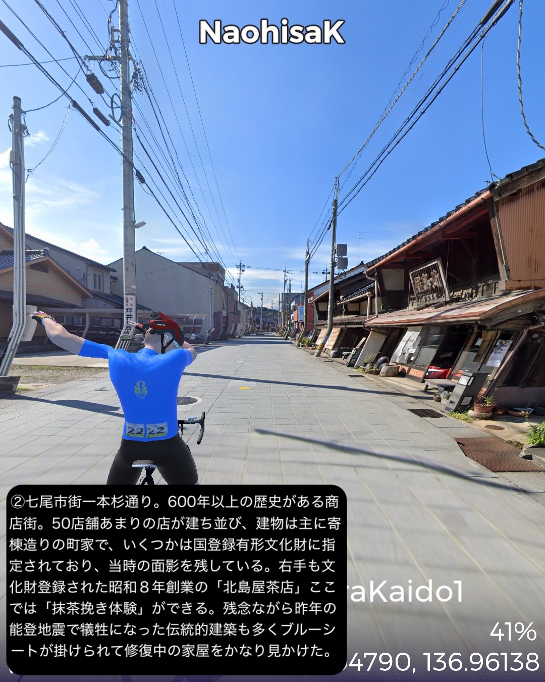 VRサイクリング 能登半島南東部を北上する。氷見のひみ番屋街をスタートし、内浦街道に入る。富山湾沿いに北上、石川県に入り能登南部の中心都市七尾市街を通り抜けその先の有名な温泉地和倉温泉街を一巡りした後、一旦街道から抜けて能登島大橋を渡り能登島へ入る。能登島西部をぐるっと回って島の西端に架かるもう一つの橋ツインブリッジのとを渡って再度内浦街道に入る。能登半島東海岸内浦の海岸の道を北上し能登半島中部のターミナル的な町穴水の駅前付近をゴールとする81kmの行程。昨年の正月を襲った能登半島地震は報道的には北部の珠洲市や輪島市の被害が取り上げられることが多かったが、今回走ってみると中南部もかなりの被害に見舞われたことを体感した。南部の七尾市街も古い町並みの一部で半壊した建物やブルーシートが覆われて改修中の建物が散見されたが、中部の穴水まで来ると被害は大きく商店街の中の全壊した建物は撤去されて所々空き地になっていた。どちらの町も残っている町並みからも古き良き町並みが保存されていたのに、どうやら味のある古い木造家屋がやられているので残念な状況になってしまったようだ。地震がなければ心洗われる旅が期待された能登だったが、今後はさらに災害の爪痕が生々しく残る土地を巡る重苦しい旅になりそうな予感。そんな中でも七尾から能登島そして穴水に至る内浦の穏やかな海岸風景は美しく癒された。次回は能登半島先端に向けてさらに内浦の海岸線沿いに進む。