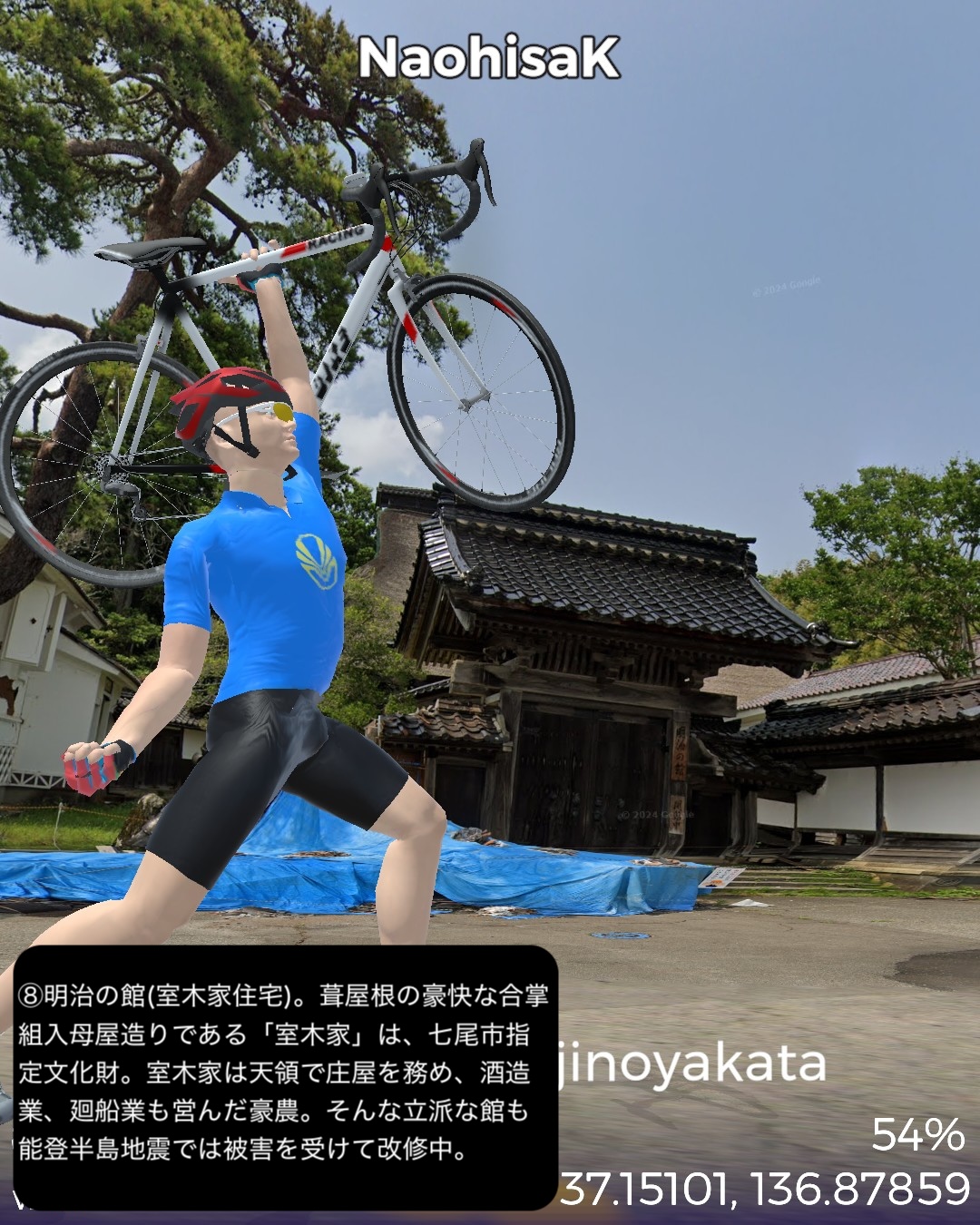 VRサイクリング 能登半島南東部を北上する。氷見のひみ番屋街をスタートし、内浦街道に入る。富山湾沿いに北上、石川県に入り能登南部の中心都市七尾市街を通り抜けその先の有名な温泉地和倉温泉街を一巡りした後、一旦街道から抜けて能登島大橋を渡り能登島へ入る。能登島西部をぐるっと回って島の西端に架かるもう一つの橋ツインブリッジのとを渡って再度内浦街道に入る。能登半島東海岸内浦の海岸の道を北上し能登半島中部のターミナル的な町穴水の駅前付近をゴールとする81kmの行程。昨年の正月を襲った能登半島地震は報道的には北部の珠洲市や輪島市の被害が取り上げられることが多かったが、今回走ってみると中南部もかなりの被害に見舞われたことを体感した。南部の七尾市街も古い町並みの一部で半壊した建物やブルーシートが覆われて改修中の建物が散見されたが、中部の穴水まで来ると被害は大きく商店街の中の全壊した建物は撤去されて所々空き地になっていた。どちらの町も残っている町並みからも古き良き町並みが保存されていたのに、どうやら味のある古い木造家屋がやられているので残念な状況になってしまったようだ。地震がなければ心洗われる旅が期待された能登だったが、今後はさらに災害の爪痕が生々しく残る土地を巡る重苦しい旅になりそうな予感。そんな中でも七尾から能登島そして穴水に至る内浦の穏やかな海岸風景は美しく癒された。次回は能登半島先端に向けてさらに内浦の海岸線沿いに進む。