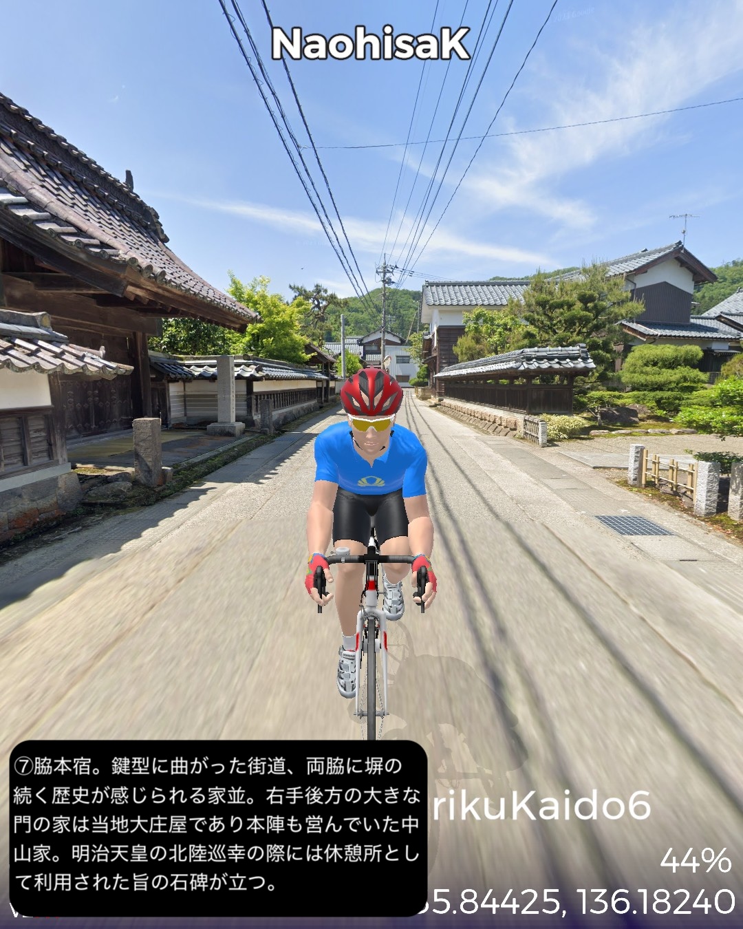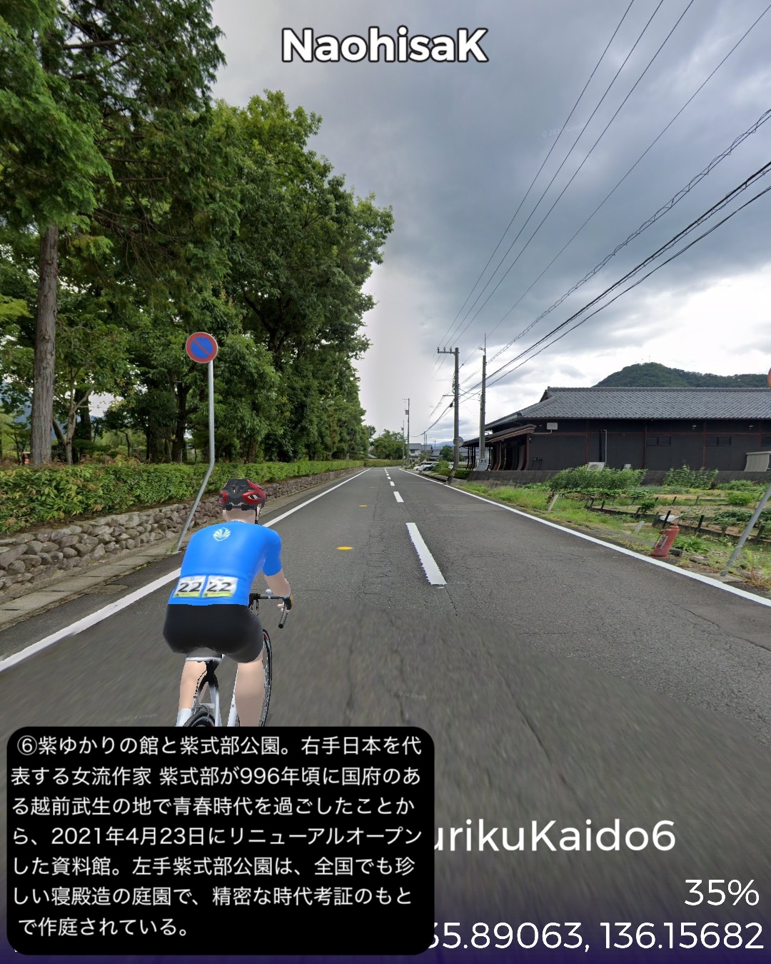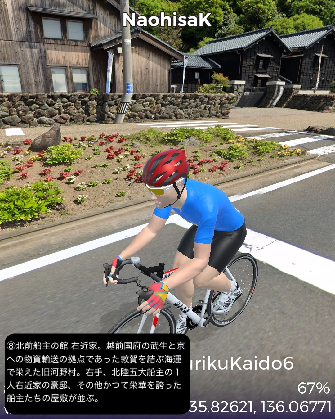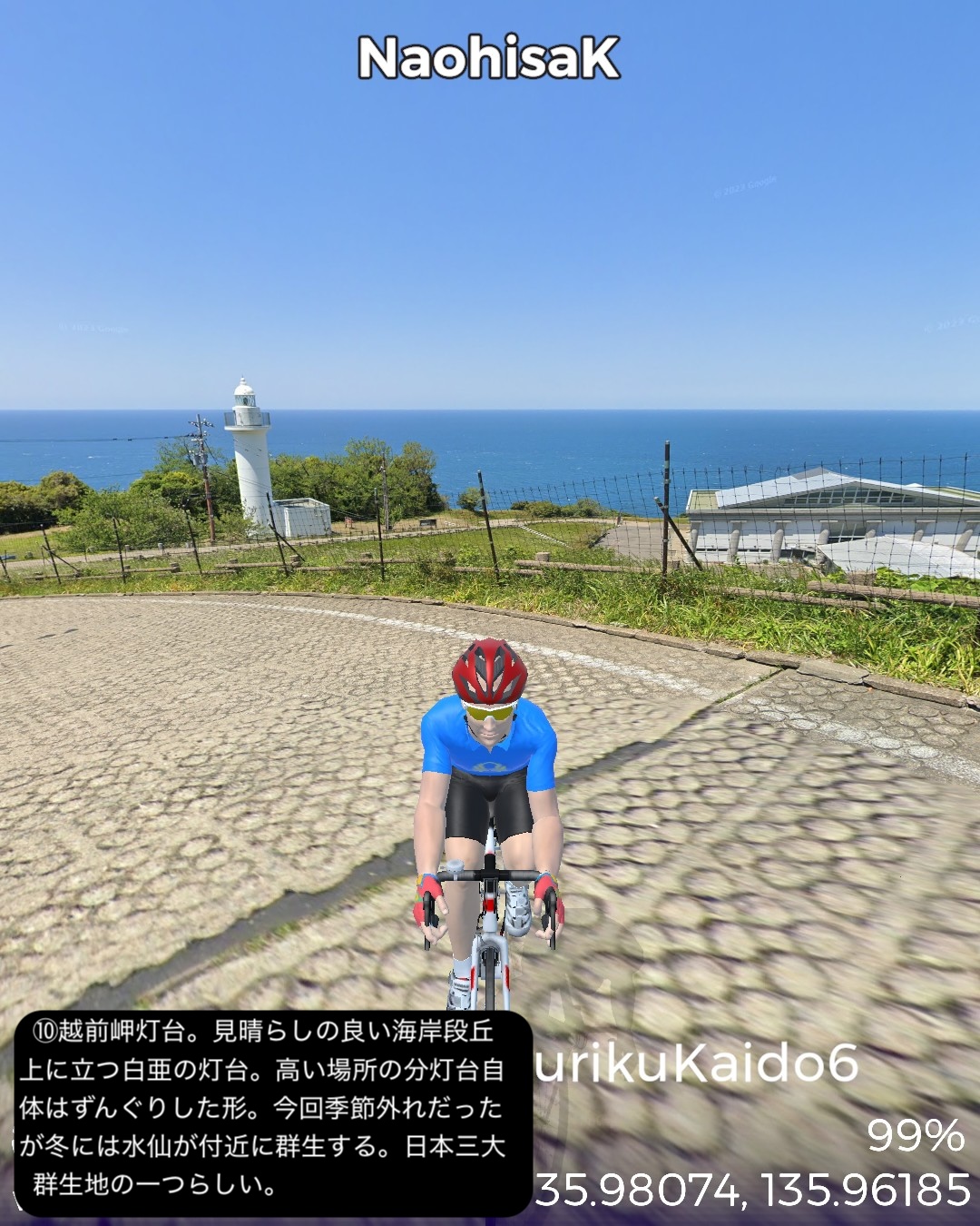 VRサイクリング 福井から南へ、越前国(福井県)中部の旅。またしても恐竜だらけの福井駅をスタートし、今回はほぼ北陸街道の旧道を南へ進み、メガネの町鯖江、越前国府のあった古式ゆかしい町武生を通り過ぎ、その先山が迫ってきた鯖波宿で街道を外れ、残りは寄り道モードで日本海岸へ出て越前海岸に沿って今度は北へ進み越前岬をゴールとする73kmの行程。前半の北陸街道はうねうねしてどこまでも続く旧道がいい味を醸していて楽しい旅であった。福井は比較的近代的な都市と言えるが、その衛星都市的な武生は昔の越前国の中心だけあって、情緒溢れる伝統的街並みが見事に残されていた。街道沿いもいい感じなのだがそこに交わる寺町通りは石畳に石灯籠で両側に20を越える格式高い寺社が建ち並び、もう一つ別の通りその名もタンス通りは、桐ダンスでその名を轟かせる武生のタンス工房が軒を並べる特色のある家並。この町はそぞろ歩きしたいなあ。盛大な寄り道となった越前海岸は海岸線は単調で風光明媚というほどではないがその分どーんと視界に広がる日本海が望めて開放的。多分VRでは魅力半分以下で、何といっても越前海岸と言えばの越前ガニを売りにする料理旅館や食堂が途切れることなく点在するグルメ街道のようだ。カニも、群生地として有名な水仙もシーズンは冬なので、きっと荒海の日本海を愛でつつ冬に訪れるべき場所なのかな。さて次回は北陸街道の完結編となる。