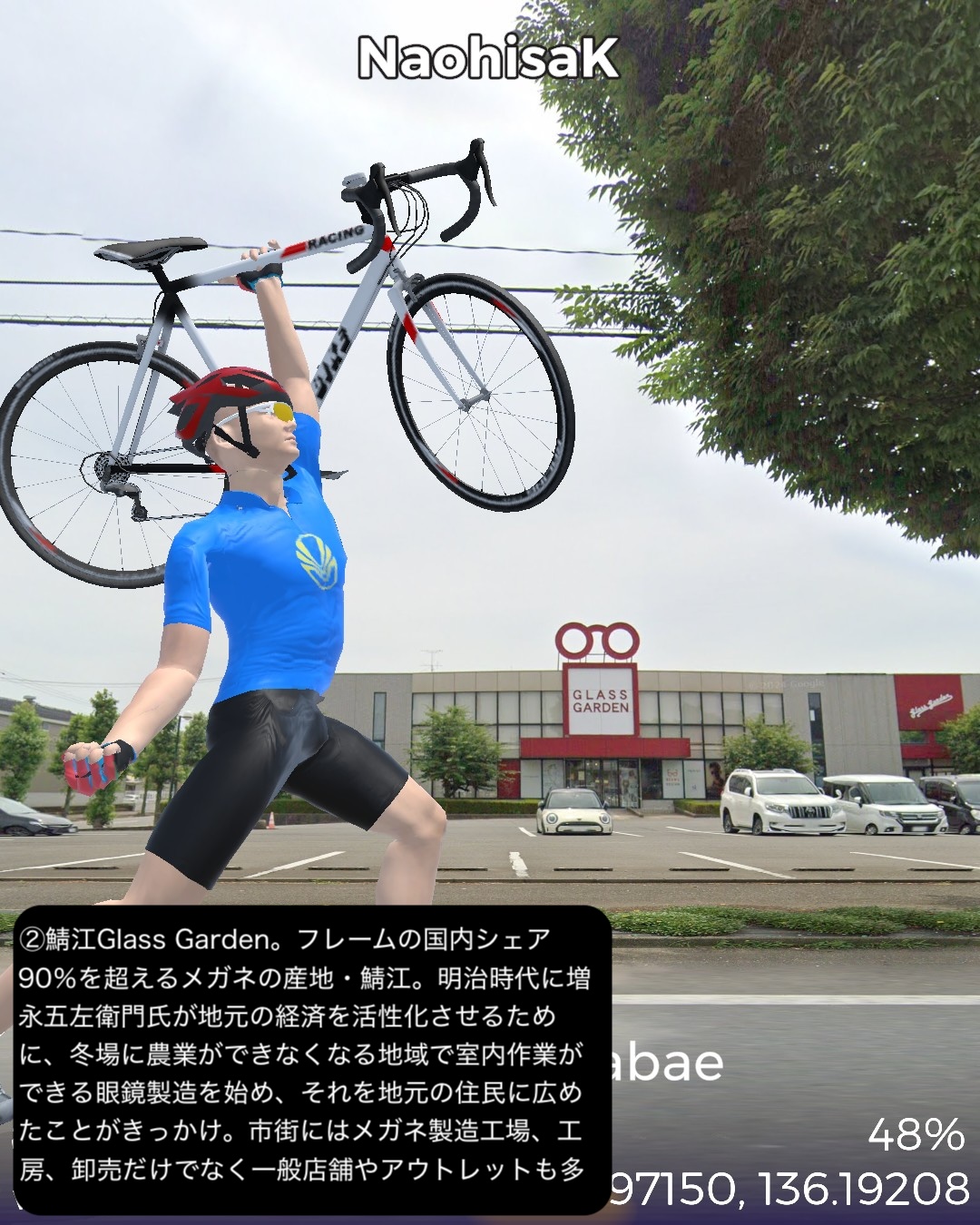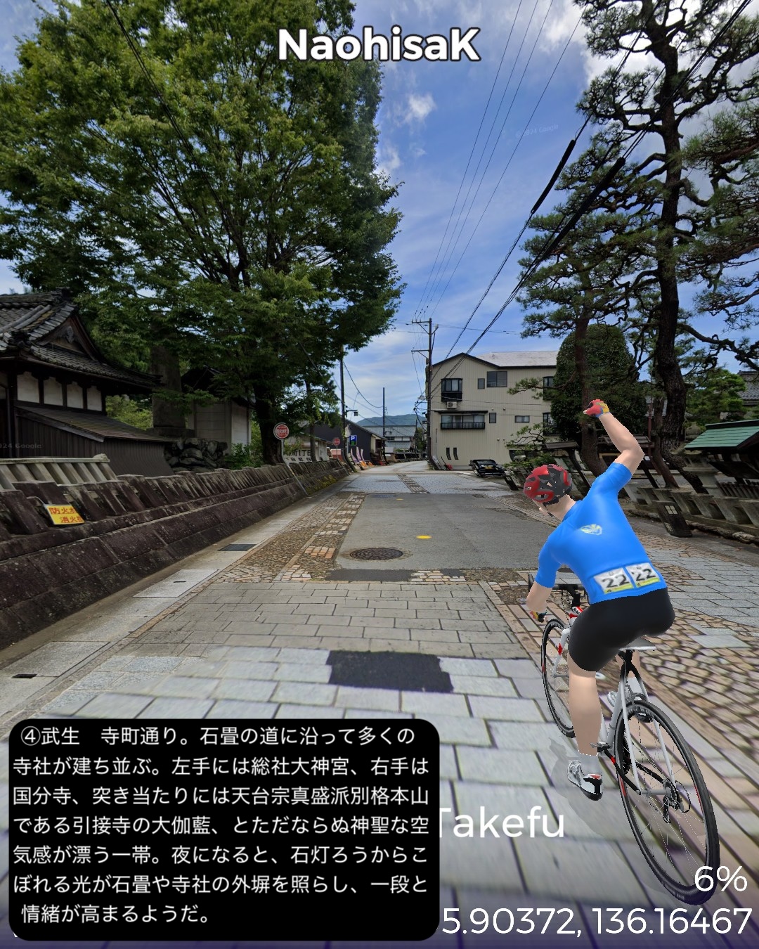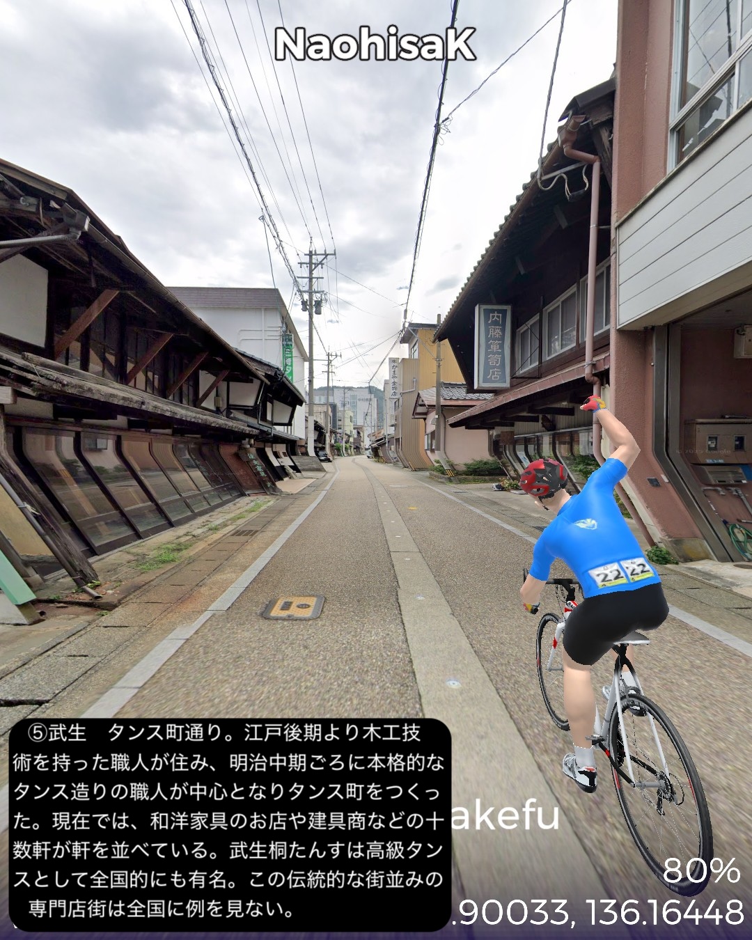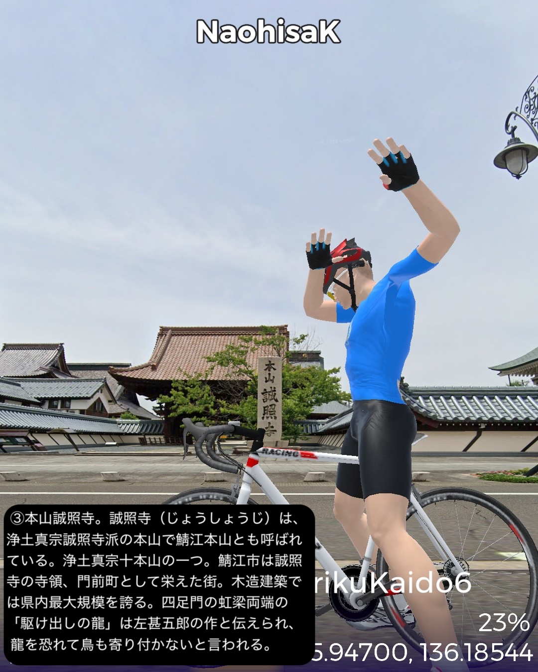 VRサイクリング 福井から南へ、越前国(福井県)中部の旅。またしても恐竜だらけの福井駅をスタートし、今回はほぼ北陸街道の旧道を南へ進み、メガネの町鯖江、越前国府のあった古式ゆかしい町武生を通り過ぎ、その先山が迫ってきた鯖波宿で街道を外れ、残りは寄り道モードで日本海岸へ出て越前海岸に沿って今度は北へ進み越前岬をゴールとする73kmの行程。前半の北陸街道はうねうねしてどこまでも続く旧道がいい味を醸していて楽しい旅であった。福井は比較的近代的な都市と言えるが、その衛星都市的な武生は昔の越前国の中心だけあって、情緒溢れる伝統的街並みが見事に残されていた。街道沿いもいい感じなのだがそこに交わる寺町通りは石畳に石灯籠で両側に20を越える格式高い寺社が建ち並び、もう一つ別の通りその名もタンス通りは、桐ダンスでその名を轟かせる武生のタンス工房が軒を並べる特色のある家並。この町はそぞろ歩きしたいなあ。盛大な寄り道となった越前海岸は海岸線は単調で風光明媚というほどではないがその分どーんと視界に広がる日本海が望めて開放的。多分VRでは魅力半分以下で、何といっても越前海岸と言えばの越前ガニを売りにする料理旅館や食堂が途切れることなく点在するグルメ街道のようだ。カニも、群生地として有名な水仙もシーズンは冬なので、きっと荒海の日本海を愛でつつ冬に訪れるべき場所なのかな。さて次回は北陸街道の完結編となる。