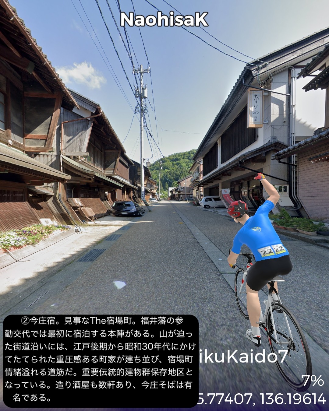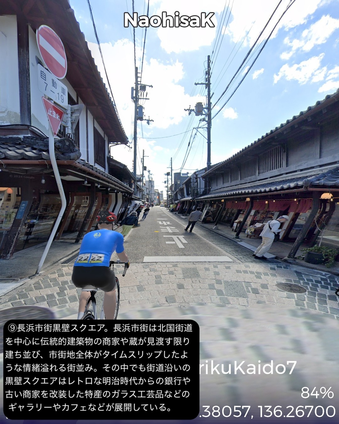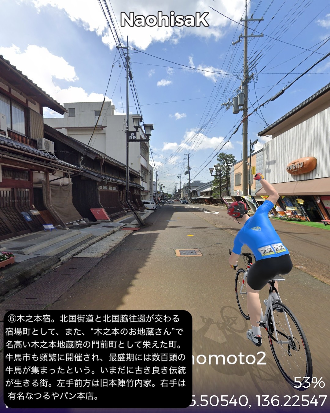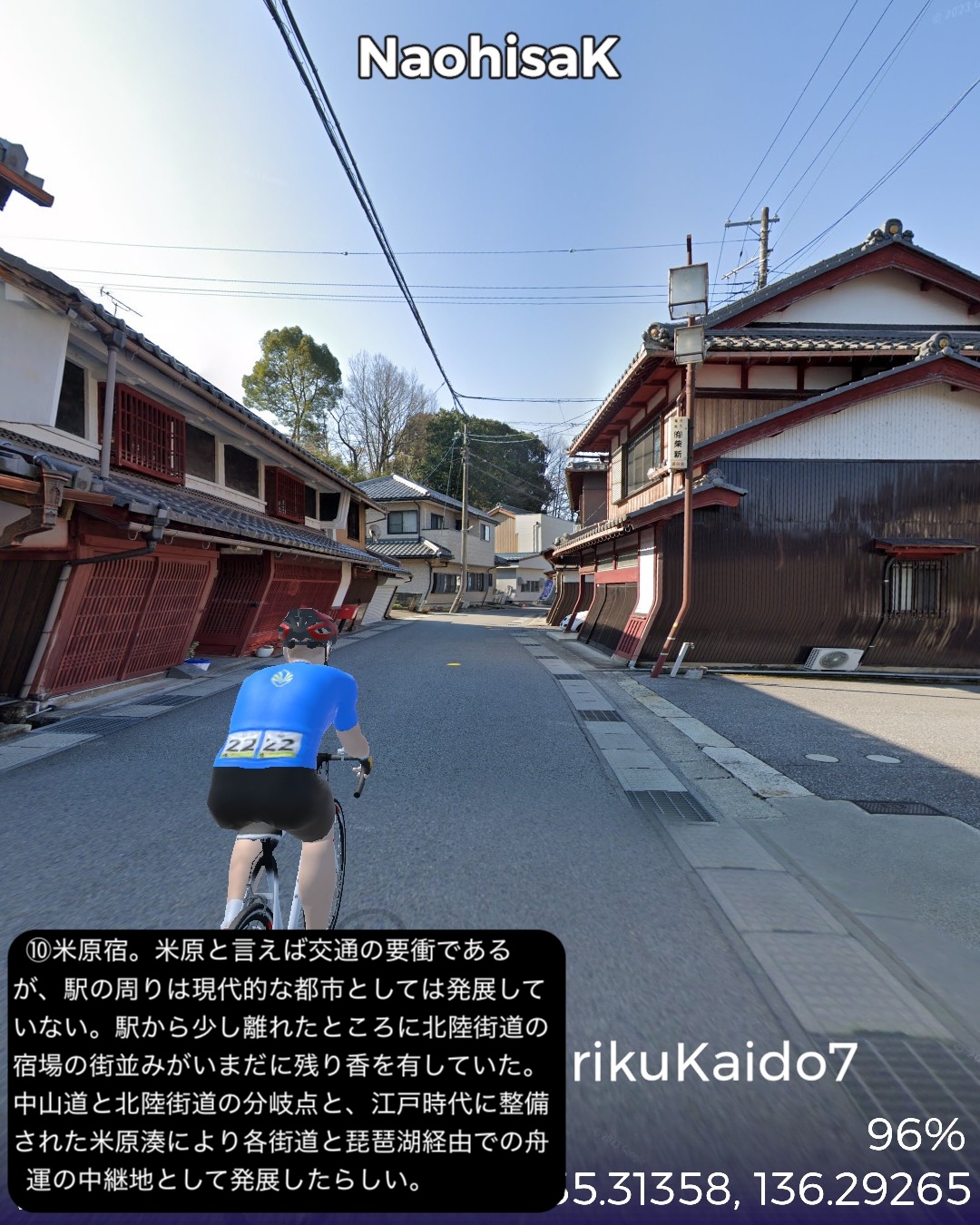 VRサイクリング 北陸街道最終日。越前国(福井県)から近江国(滋賀県)に入り中山道との分岐点に至るの巻。前回越前海岸へ向かう前の北陸街道の到達点、鯖波宿をスタートし、山へ分け入って行く。その途上で今庄宿、板取宿を通り、栃ノ木峠を越えると近江国。余呉高原、さらに椿坂峠を越えて山を下ってゆくと琵琶湖北端に近い木之本宿に辿り着く。さらに南下すると秀吉が作った町、長浜宿。ここの名所史跡をぐるりと廻り、さらに街道を進むと交通の要衝、米原宿、そのちょっと先がゴールの中山道との分岐という74kmの行程。前回までもそういう印象があったが、北陸街道という街道は道中はそれほどめぼしい名所史跡、ビューポイントはないが宿場が圧倒的に良い。今まで通った街道の中でもその評価基準ではベストかもしれない。まずは越前の外れに位置する今庄宿。山懐をバックに街道沿いにいい味の古い商家が建ち並ぶ。酒蔵やご当地のおろし蕎麦で知られる蕎麦屋などが点在する。近江国側、山を下り切ったところの木之本宿も良い。人気の木之本地蔵院の門前町で栄え、牛馬市が盛んでいまだに街道そいに伝統的建築の商家が延々と建ち並ぶ。サラダパンで全国的に有名なつるやパンの本店もその中にあった。そして長浜は町中が江戸時代から昭和のレトロのごった煮な町。北陸街道沿いも含め狭めな街路にぎっしりと商家造りの家屋がぎっしり。模擬天守ではあるが秀吉の建てた長浜城があり、大通寺や長浜八幡宮といった由緒正しき寺社がデンと座り、城下町、門前町でもある昔ながらの賑わいのある宿場町、ここに至れりなのだ。ここはホントにいずれ散策したい町だ。そしてゴールの中山道との分岐は2022/8/27に通った鳥居本宿の外れに位置する。ここはむしろリアルの中山道歩きで一年前に通ったので記憶に新しい。考えてみると三年ぶりの近畿地方に帰ってきたわけだ。次回は踏破した中山道に近いが、より琵琶湖沿岸に近い道筋で琵琶湖の南岸方面へ進む。