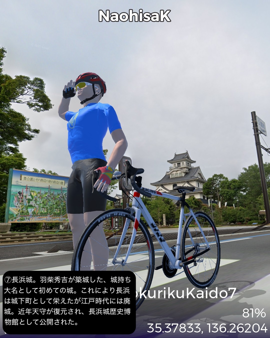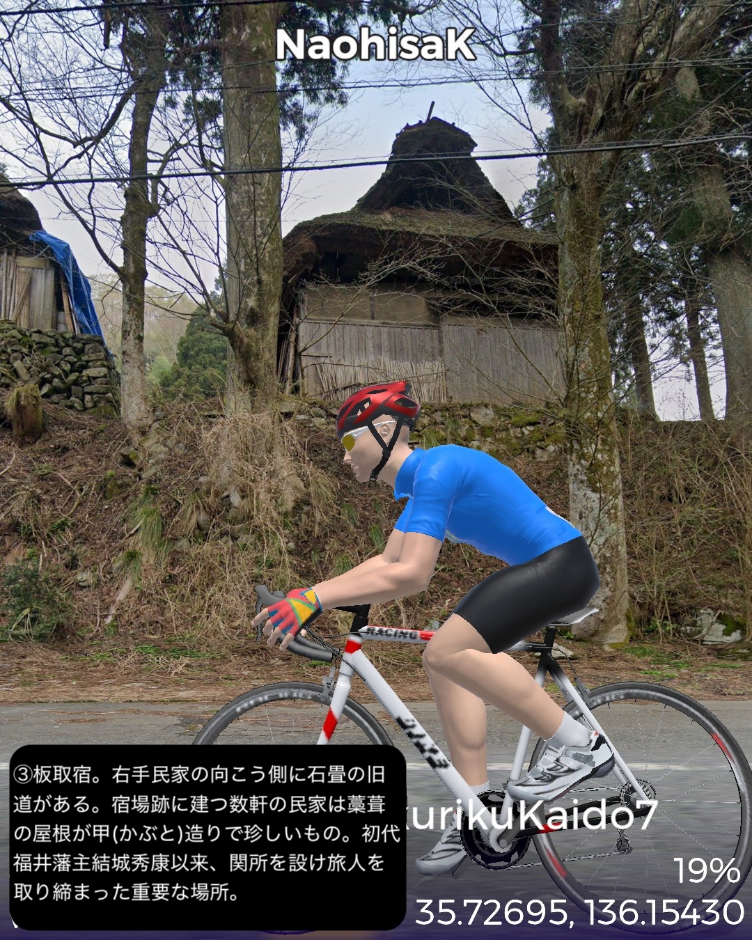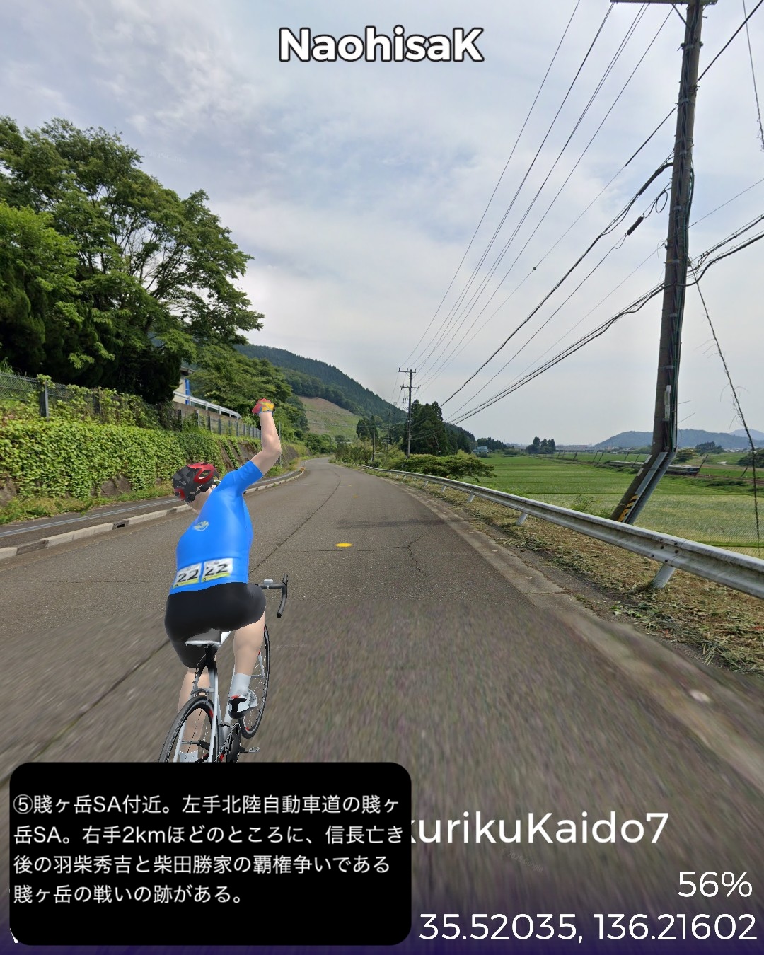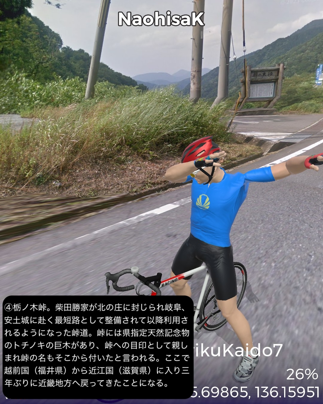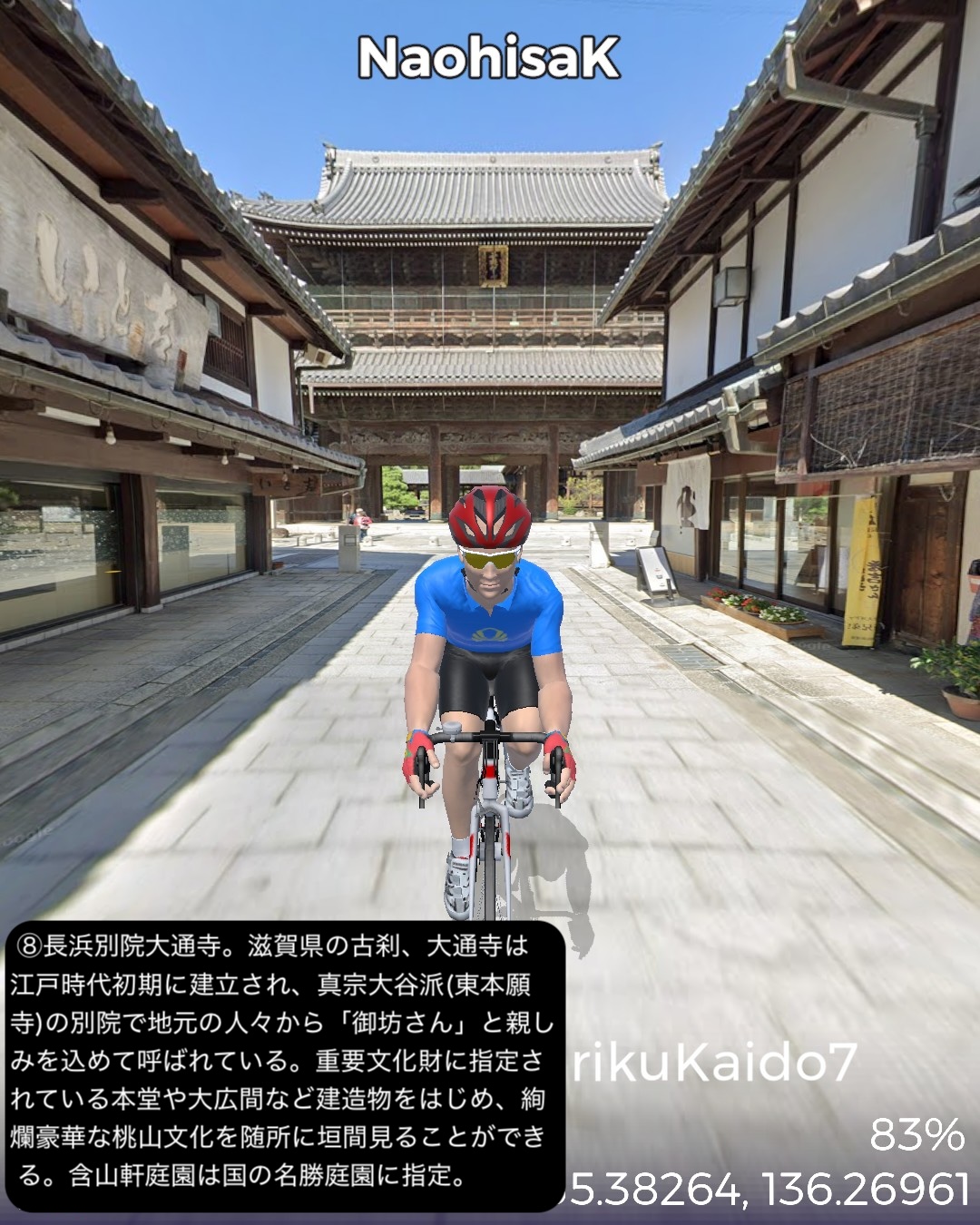 VRサイクリング 北陸街道最終日。越前国(福井県)から近江国(滋賀県)に入り中山道との分岐点に至るの巻。前回越前海岸へ向かう前の北陸街道の到達点、鯖波宿をスタートし、山へ分け入って行く。その途上で今庄宿、板取宿を通り、栃ノ木峠を越えると近江国。余呉高原、さらに椿坂峠を越えて山を下ってゆくと琵琶湖北端に近い木之本宿に辿り着く。さらに南下すると秀吉が作った町、長浜宿。ここの名所史跡をぐるりと廻り、さらに街道を進むと交通の要衝、米原宿、そのちょっと先がゴールの中山道との分岐という74kmの行程。前回までもそういう印象があったが、北陸街道という街道は道中はそれほどめぼしい名所史跡、ビューポイントはないが宿場が圧倒的に良い。今まで通った街道の中でもその評価基準ではベストかもしれない。まずは越前の外れに位置する今庄宿。山懐をバックに街道沿いにいい味の古い商家が建ち並ぶ。酒蔵やご当地のおろし蕎麦で知られる蕎麦屋などが点在する。近江国側、山を下り切ったところの木之本宿も良い。人気の木之本地蔵院の門前町で栄え、牛馬市が盛んでいまだに街道そいに伝統的建築の商家が延々と建ち並ぶ。サラダパンで全国的に有名なつるやパンの本店もその中にあった。そして長浜は町中が江戸時代から昭和のレトロのごった煮な町。北陸街道沿いも含め狭めな街路にぎっしりと商家造りの家屋がぎっしり。模擬天守ではあるが秀吉の建てた長浜城があり、大通寺や長浜八幡宮といった由緒正しき寺社がデンと座り、城下町、門前町でもある昔ながらの賑わいのある宿場町、ここに至れりなのだ。ここはホントにいずれ散策したい町だ。そしてゴールの中山道との分岐は2022/8/27に通った鳥居本宿の外れに位置する。ここはむしろリアルの中山道歩きで一年前に通ったので記憶に新しい。考えてみると三年ぶりの近畿地方に帰ってきたわけだ。次回は踏破した中山道に近いが、より琵琶湖沿岸に近い道筋で琵琶湖の南岸方面へ進む。