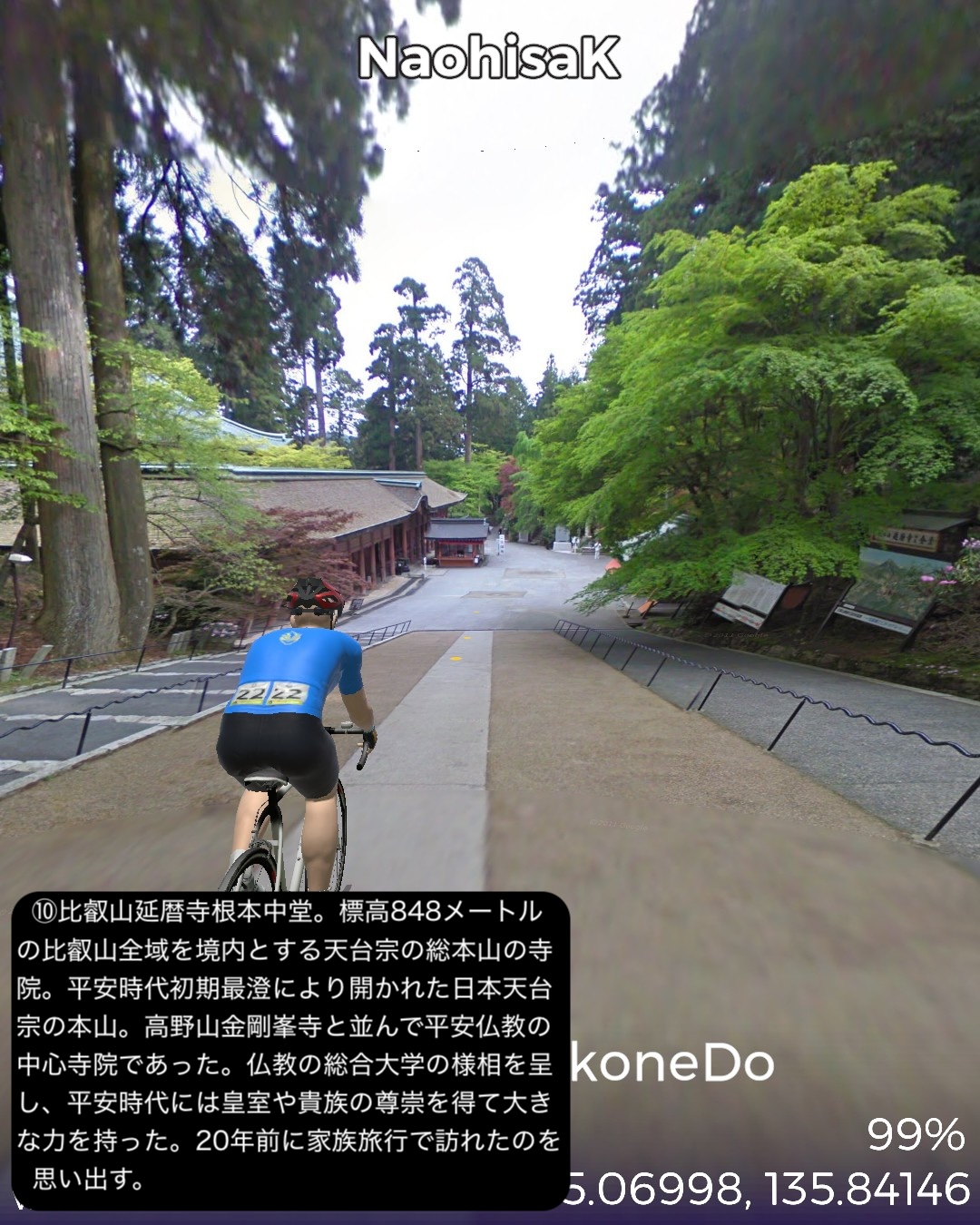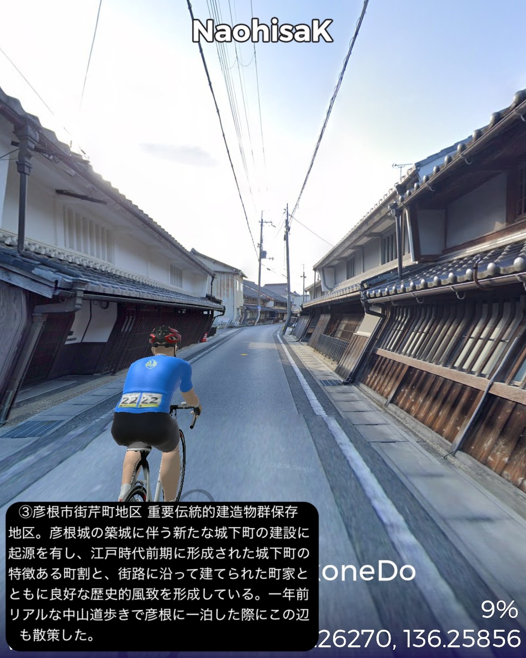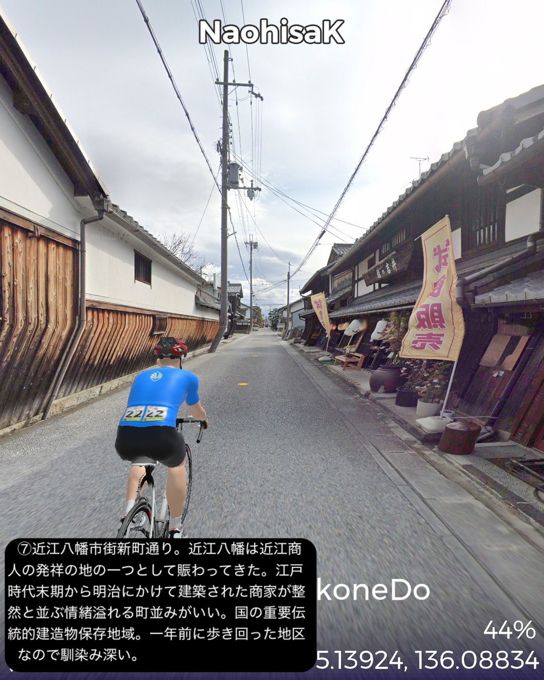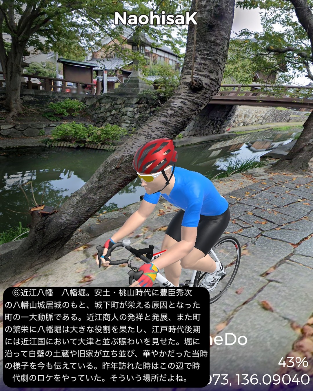 VRサイクリング 琵琶湖の東岸に沿った彦根道で近江国(滋賀県)を横断の巻。前回到達した北陸道の終点である中山道鳥居本宿をスタートし、そこを起点とする彦根道を行くとまもなく城下町の見本のような彦根城下に入る。彦根城や町人街などを一巡りしてからさらに彦根道を進み、信長の夢の楼閣、安土城跡を過ぎ田園地帯を突っ切ると近江商人の根城近江八幡。ここも一巡りしてその先で街道を外れ琵琶湖岸に出て琵琶湖大橋を渡り琵琶湖西岸に出る。堅田の名所、浮御堂に立ち寄った後、坂本から比叡山の山道に入り名刹中の名刹延暦寺をゴールとする75kmの行程。今回は結構馴染みのある場所を舐めて通るルートで、また来ちゃった感が凄い。彦根と近江八幡は一年前中山道を終結させる旅でどちらも宿を取った場所で街道歩き前の朝の散歩で歩き回った土地だ。要は今回の彦根道は中山道と数キロでほぼ並行して通っているが、中山道沿いは鄙びて宿泊する施設がないので近くの街中に宿泊したわけだ。ちょっとした朝の散歩だったが、彦根も近江八幡もそれぞれ異なる情緒に溢れ、魅力的な伝統が生きる街でついつい長居をして、その後の中山道歩きが逼迫したのを思い出す。前回の長浜も含め京都の近くなのでマスキングされてるが、もし京都から遠い地方であれば小京都としてもっと人気を博していたのではなかろうか。後半の琵琶湖畔では20年前に宿泊したホテルの前やホテルから小学生だった娘とサイクリングしたルートも走り、そしてその時訪れた延暦寺と懐かしい景色だった。さて京はすぐそこだが、次回はまた離れる方向へ進む。